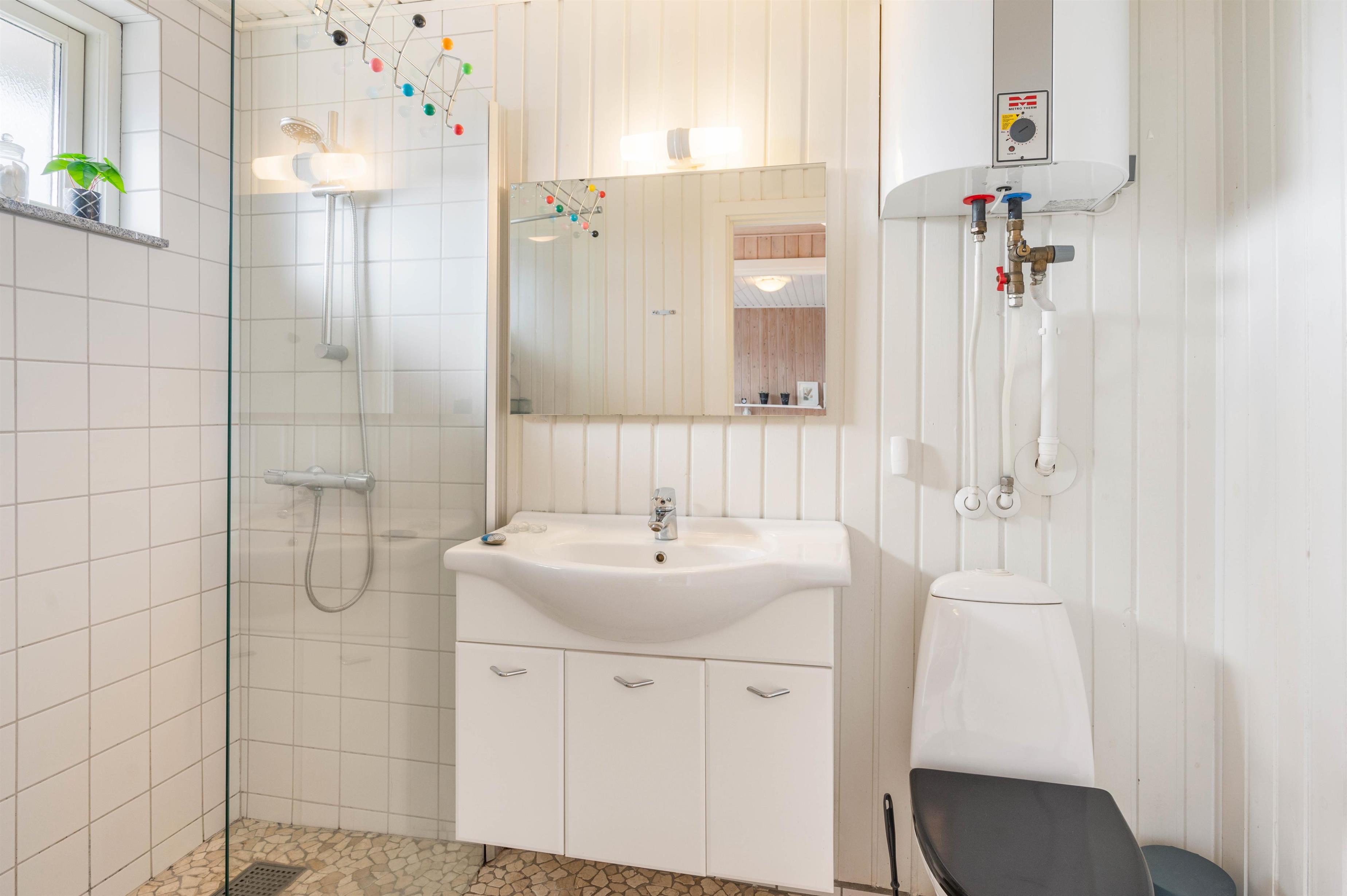 Badeværelset er rigtigt dejligt med brusekabine og gulvvarme. Derudover er der også vaskemaskine i sommerhuset.