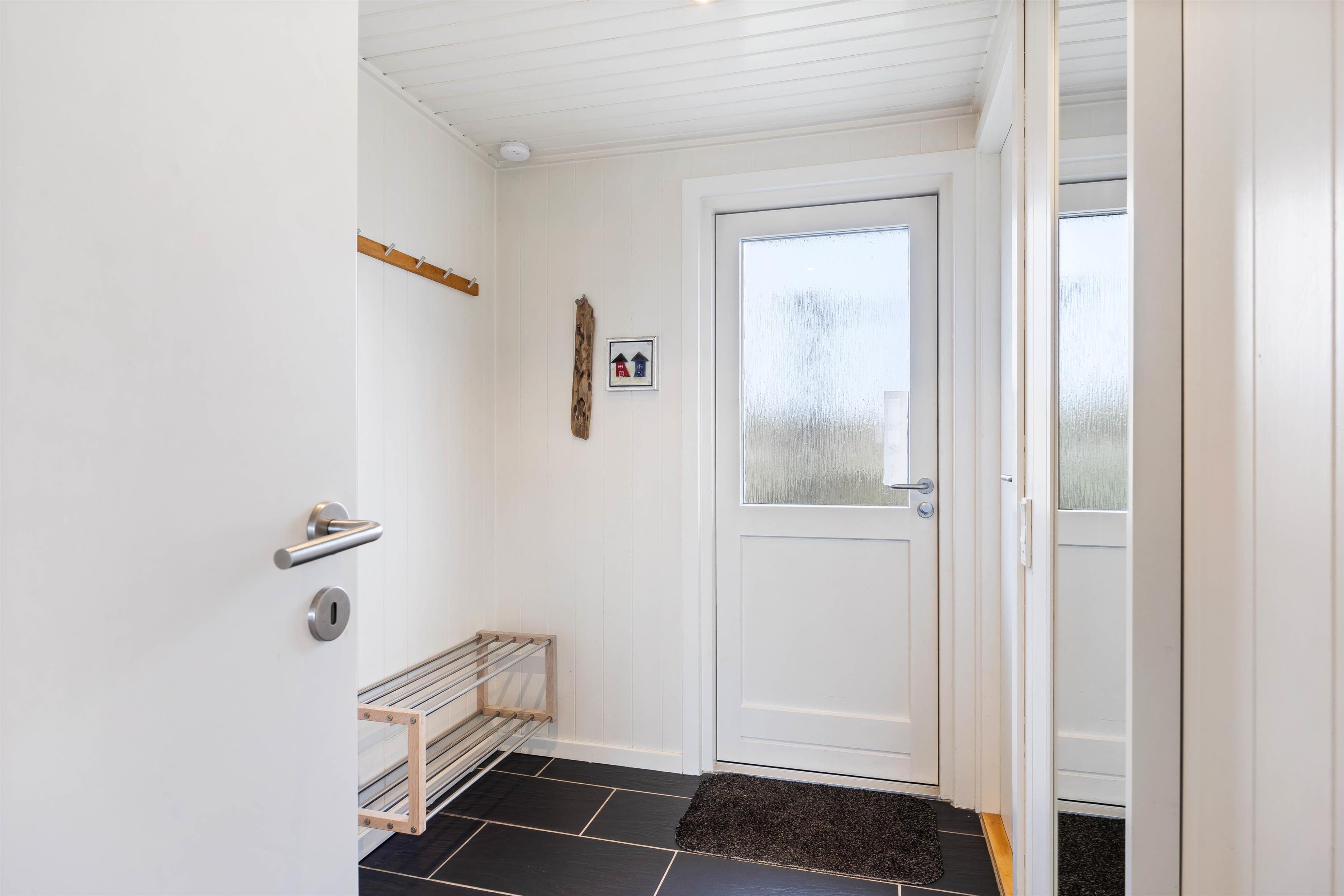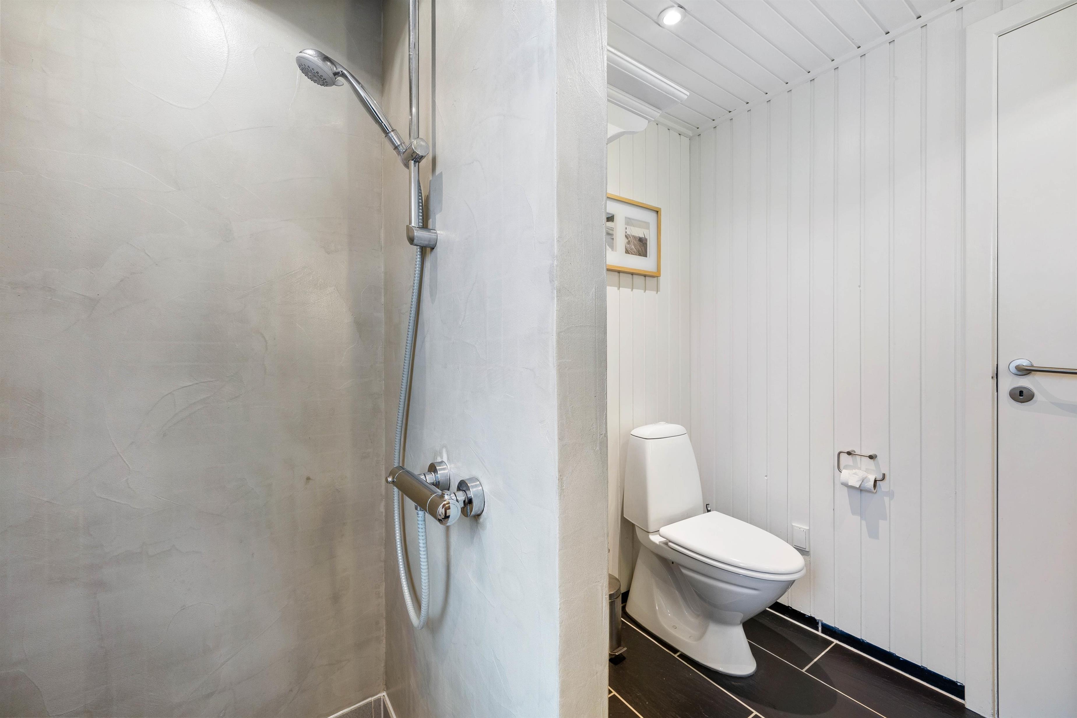 Her er et flot badeværelse med gulvvarme, og der er desuden en kombineret vaskemaskine og tørretumbler i sommerhuset.