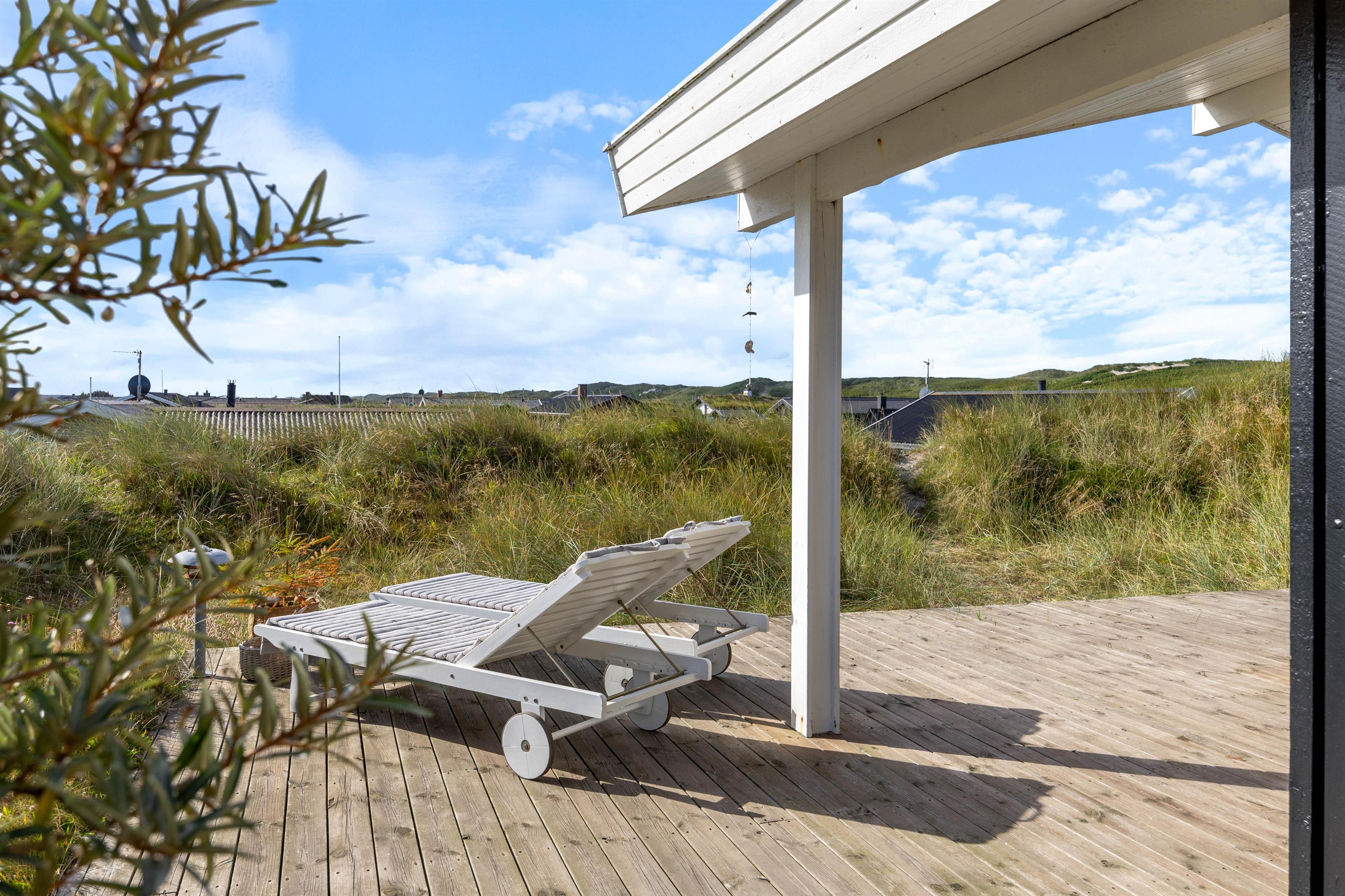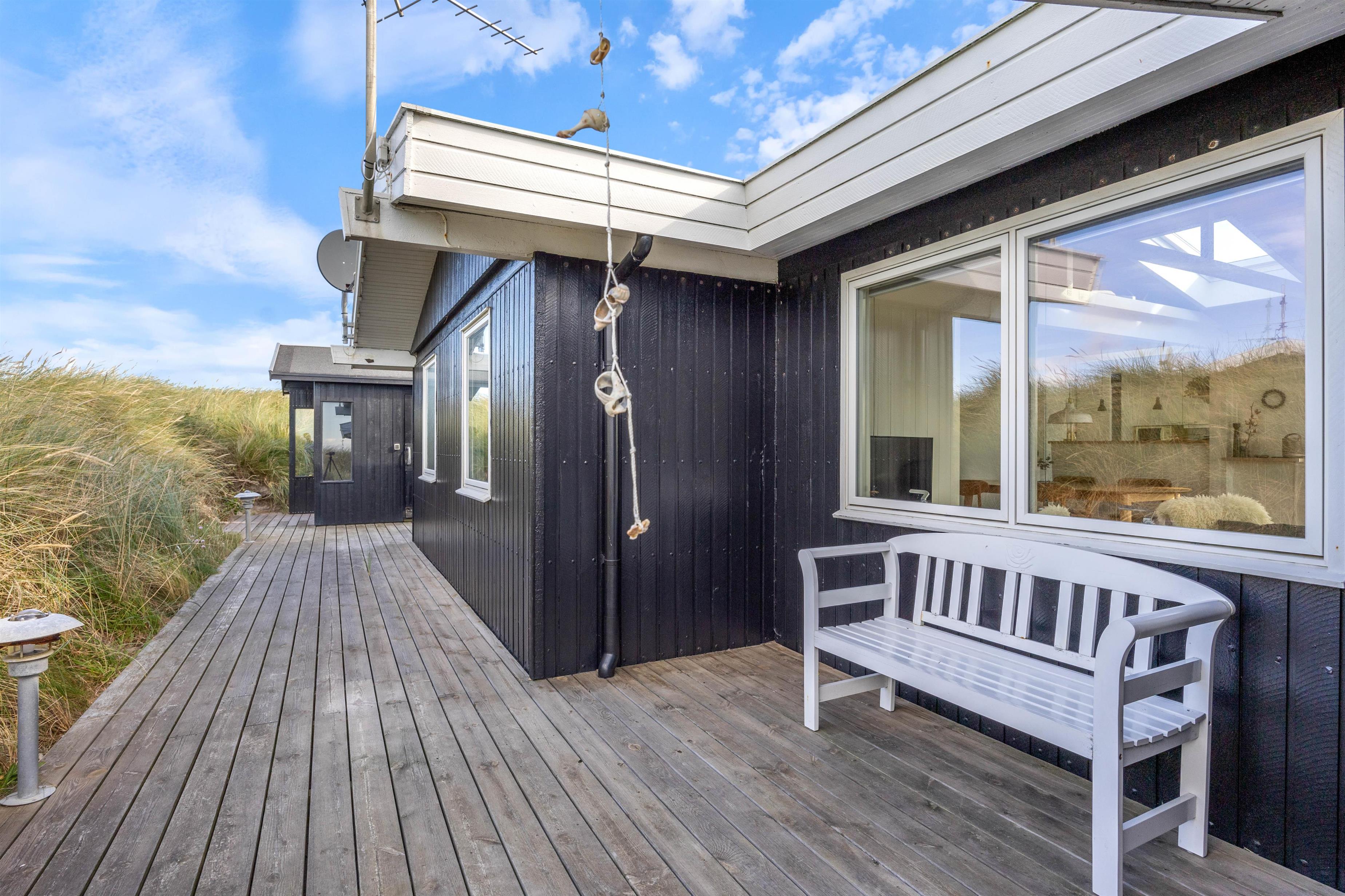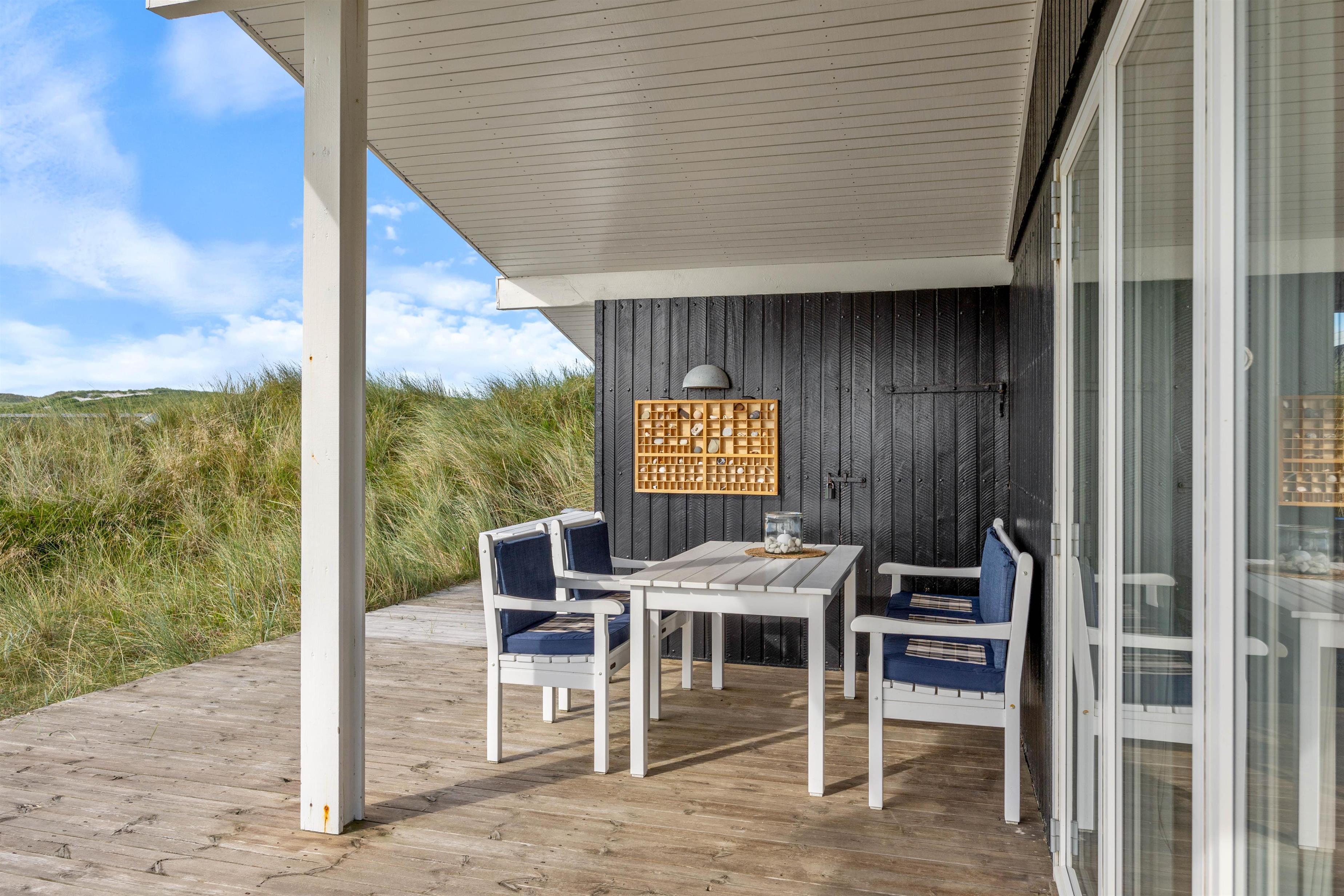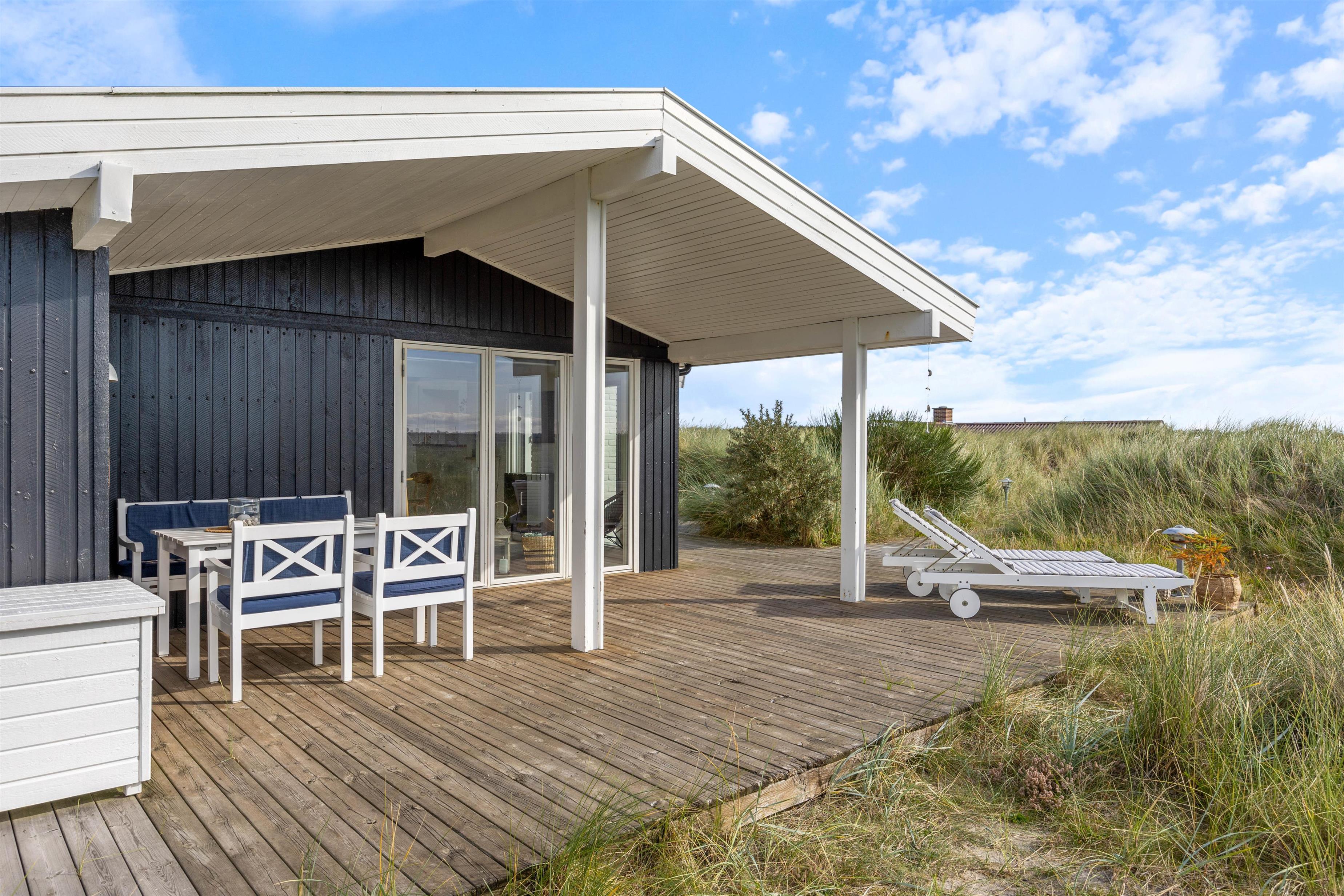 Fra sommerhusets stue har I direkte udgang til terrassen, som er delvist overdækket og afskærmet. Her kan I nyde den skønne udsigt over klitlandskabet, mens Vesterhavet bruser i det fjerne.