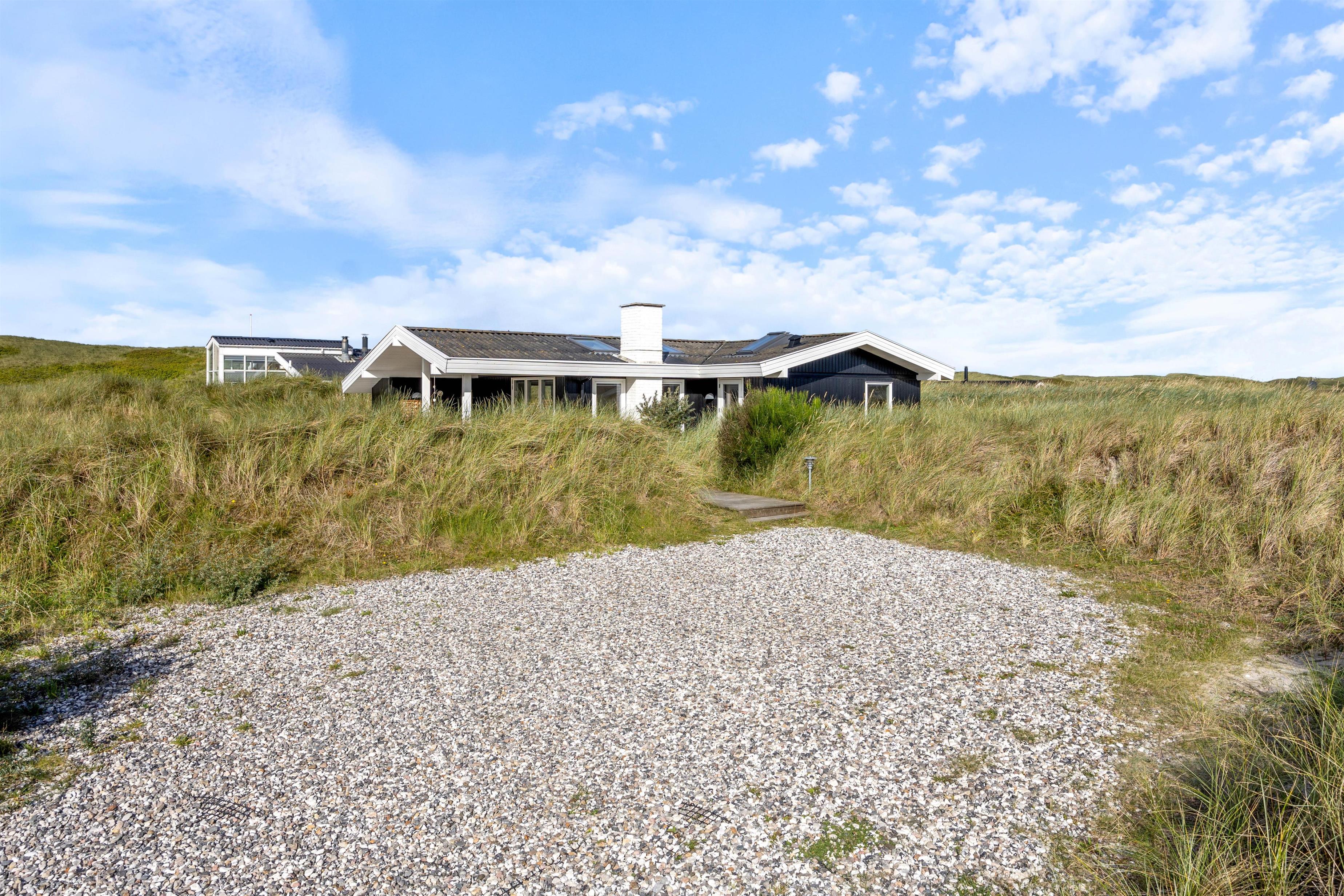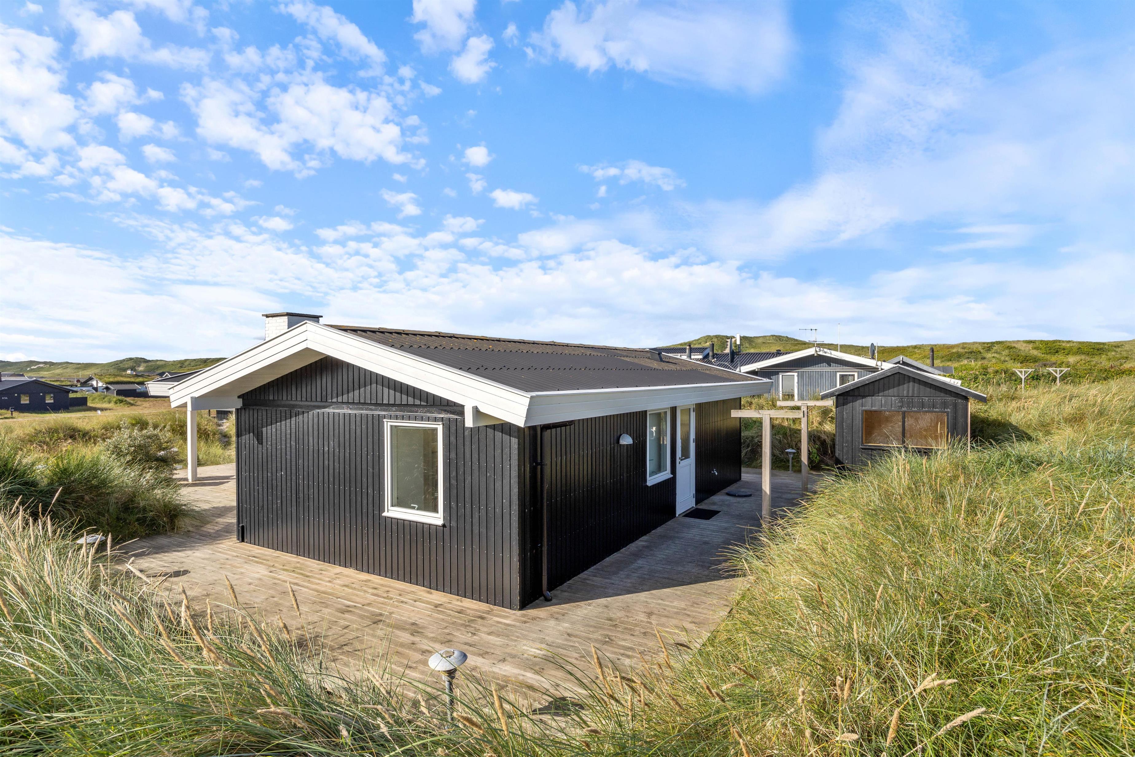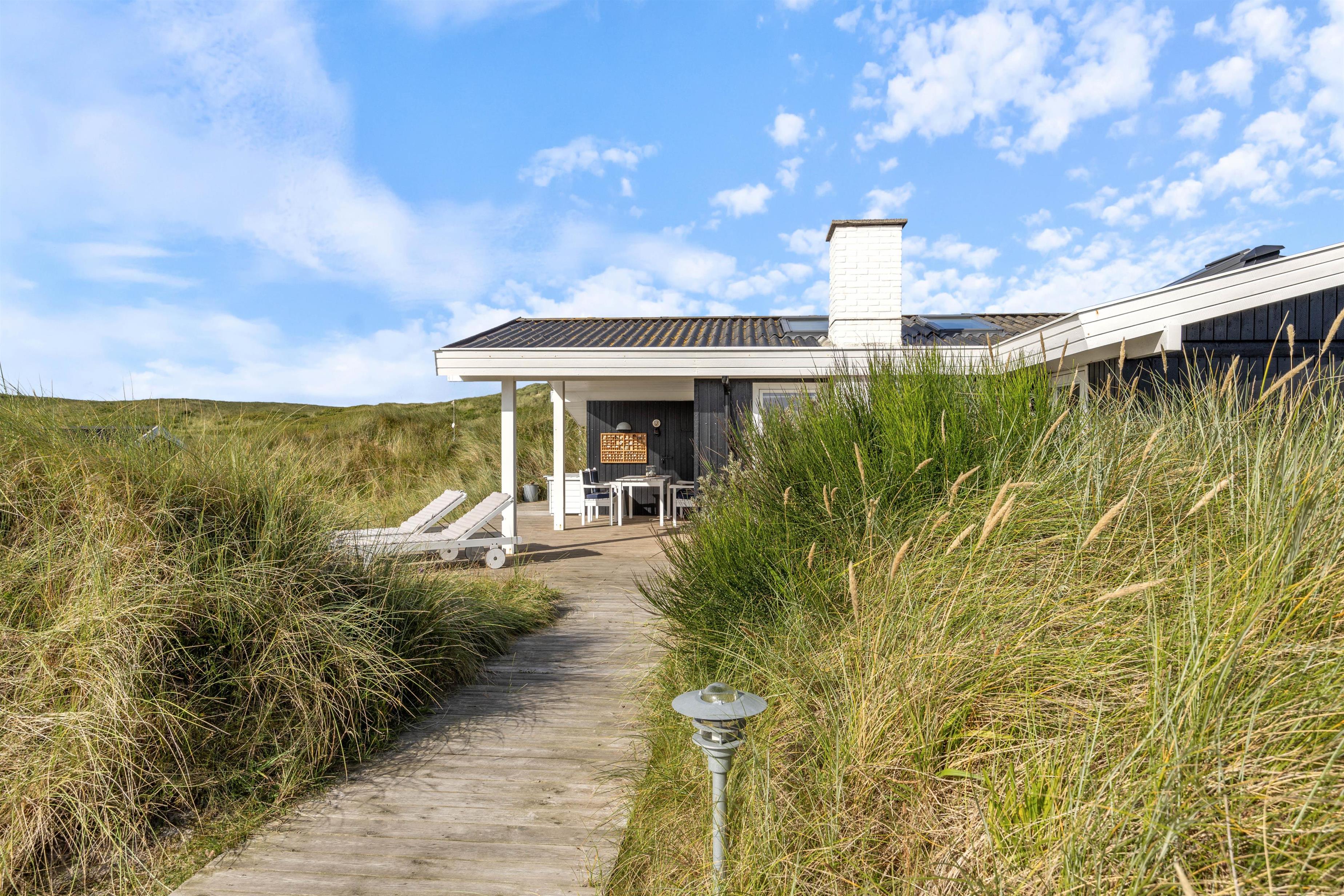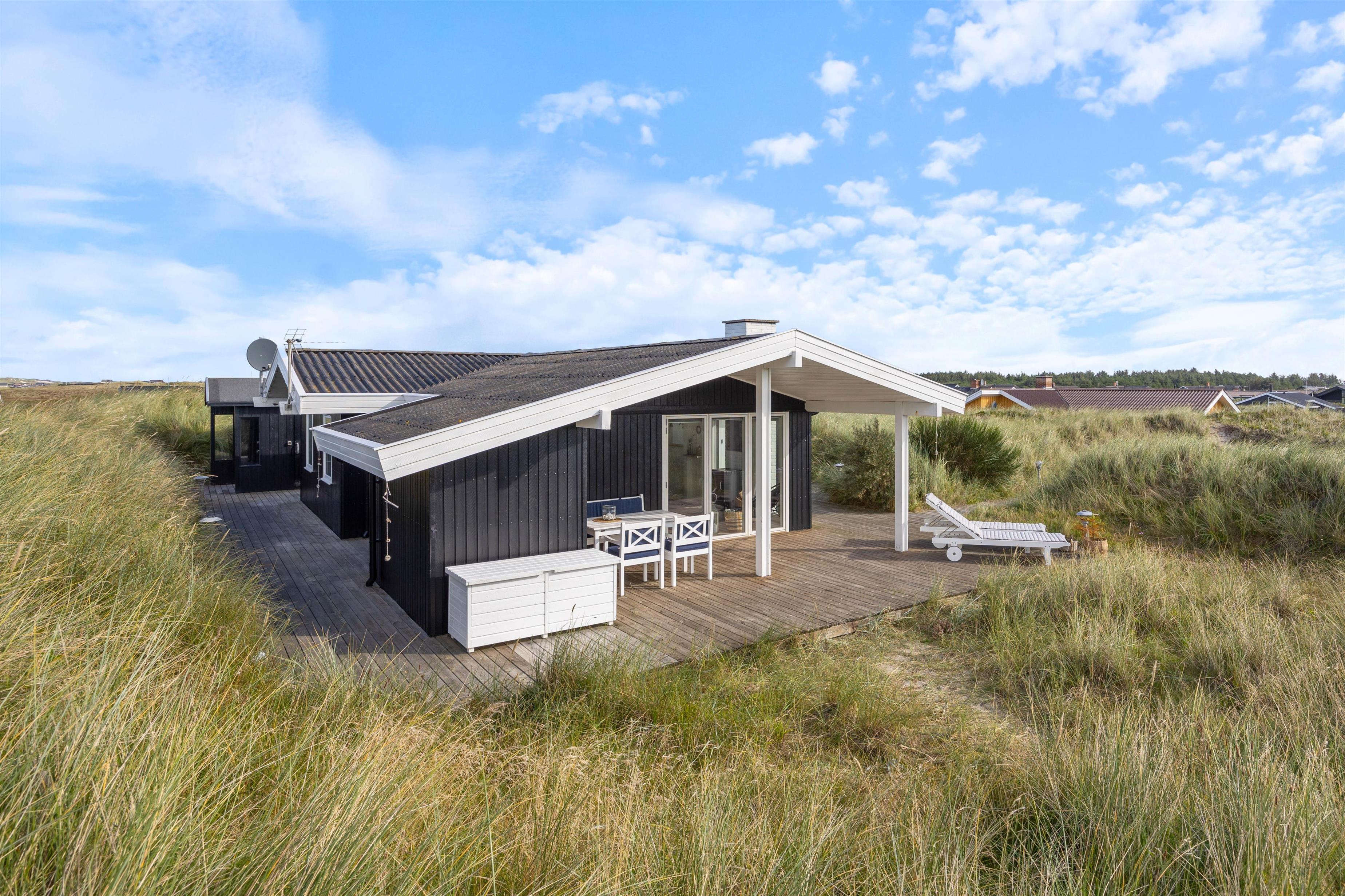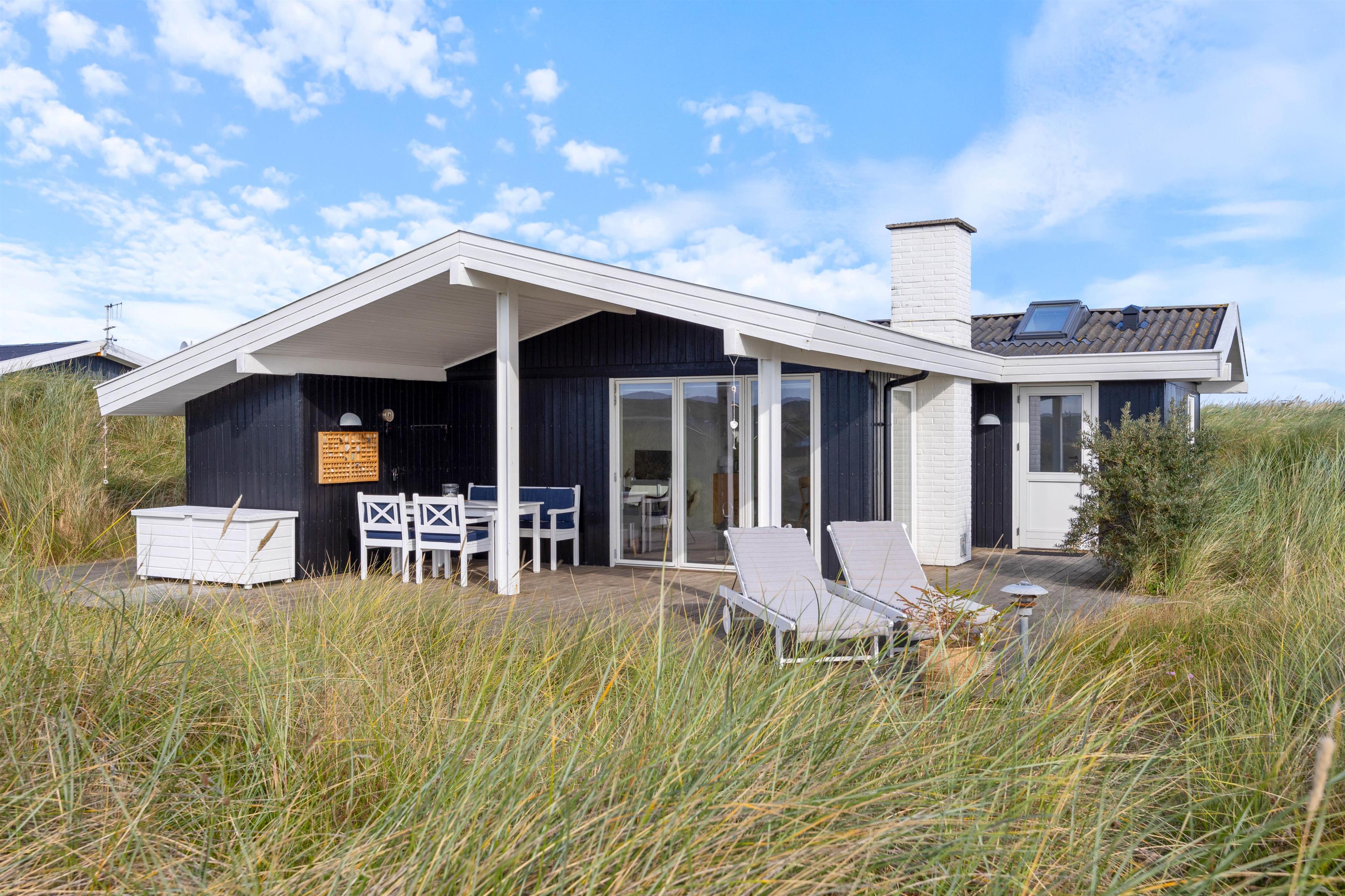 Fra sommerhusets stue har I direkte udgang til terrassen, som er delvist overdækket og afskærmet. Her kan I nyde den skønne udsigt over klitlandskabet, mens Vesterhavet bruser i det fjerne.