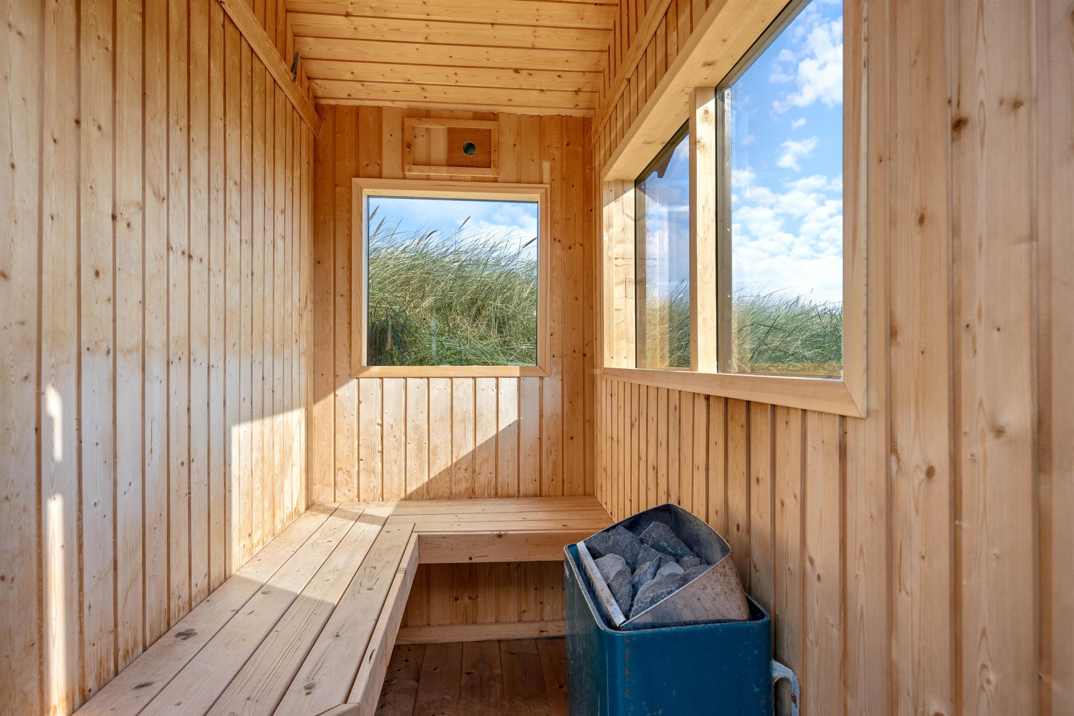 Efter en oplevelsesrig dag med aktiviteter kan I på en blæsende efterårsdag nyde varmen i udesaunaen, som også er dejlig efter en soppetur i Vesterhavet.