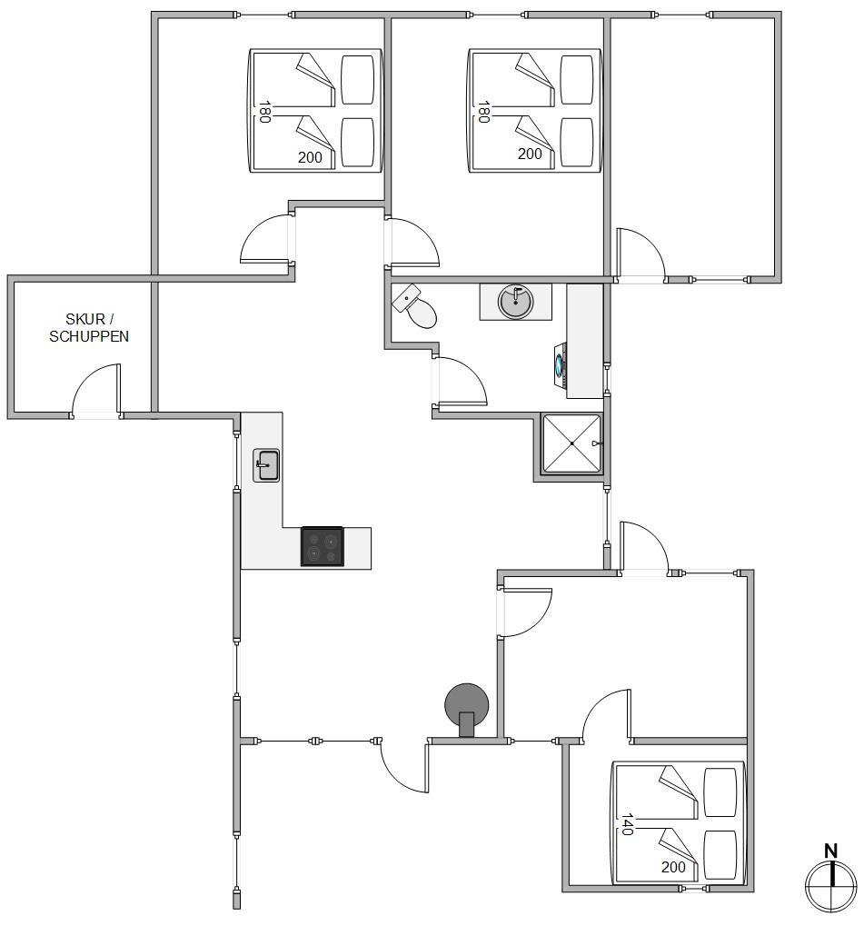 Badeværelset er enkelt indrettet og med både vaskemaskine og tørretumbler, kan I nemt friske tøjet op under jeres ophold. På feriehusets velindrettede 82m2 finder I 3 rummelige soverum, hvor I kan slappe af og nyde en god nattesøvn i de komfortable senge.