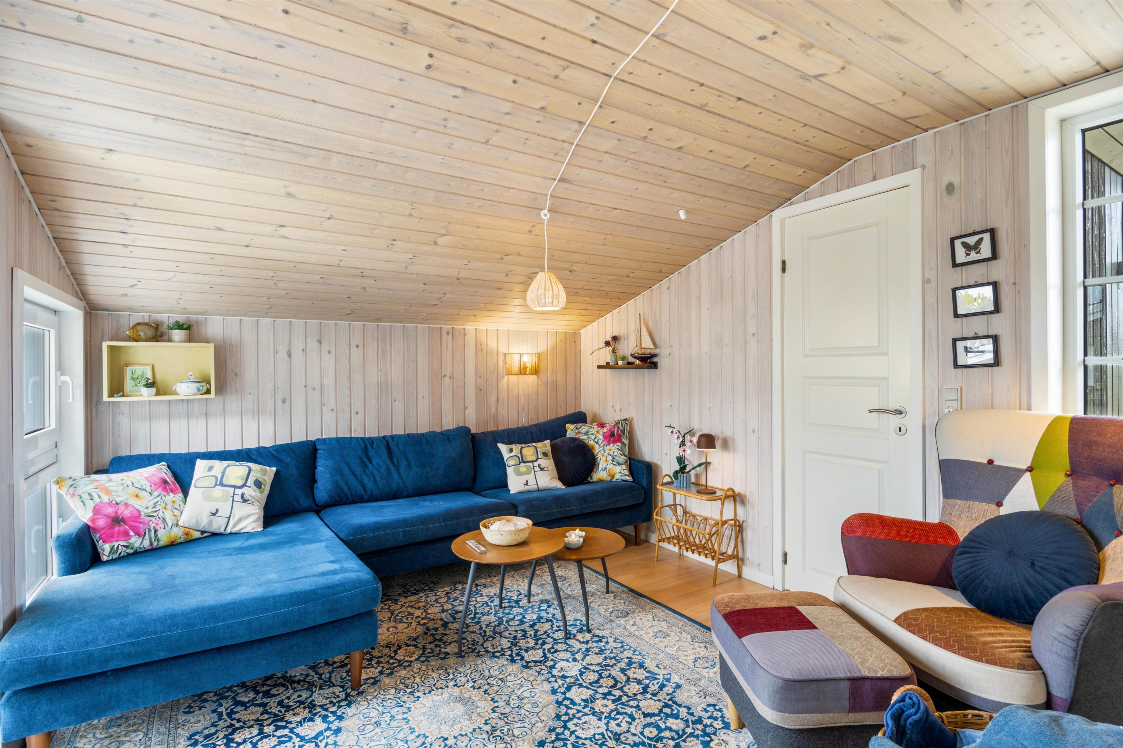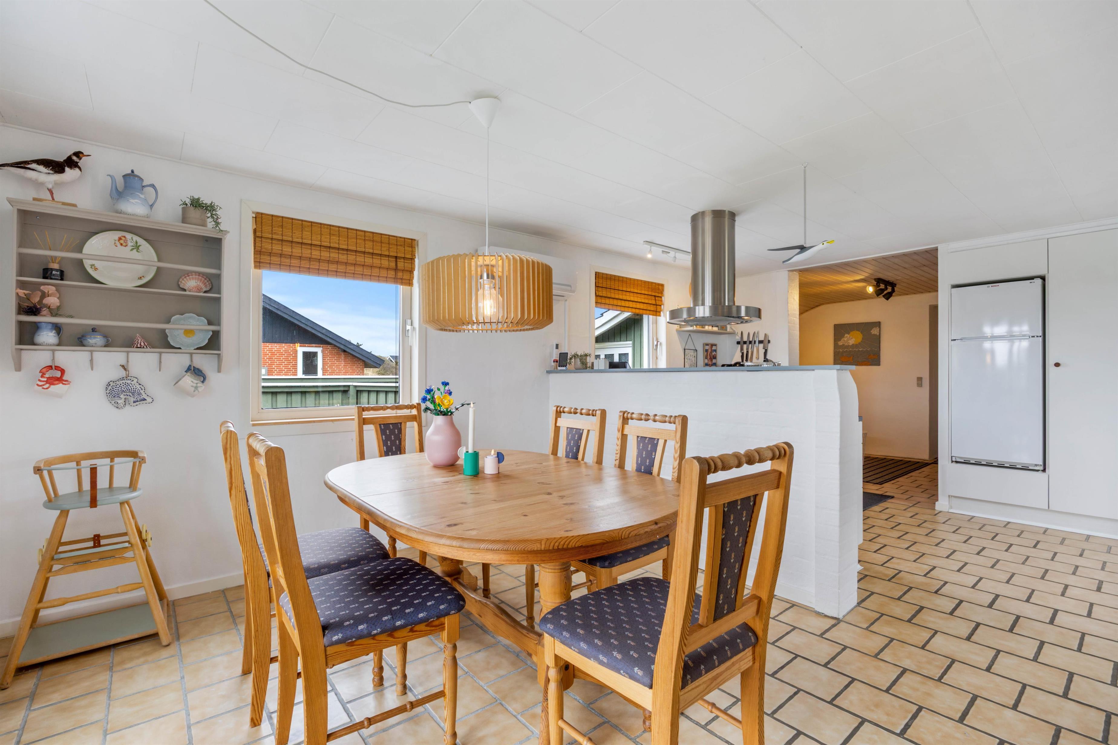 Den lyse og venlige indretning byder velkommen så snart, du træder ind over dørtrinnet. I stuen er brændeovnen, der sørger for varme og hyggestemning på de køligere aftener, samt en energibesparende luft-til-luft varmepumpe, der sikrer en behagelig temperatur hele året. Det åbne køkken med klinker er udstyret med alt, hvad I behøver for at forkæle hinanden med lækre hjemmelavede måltider, herunder opvaskemaskine.
