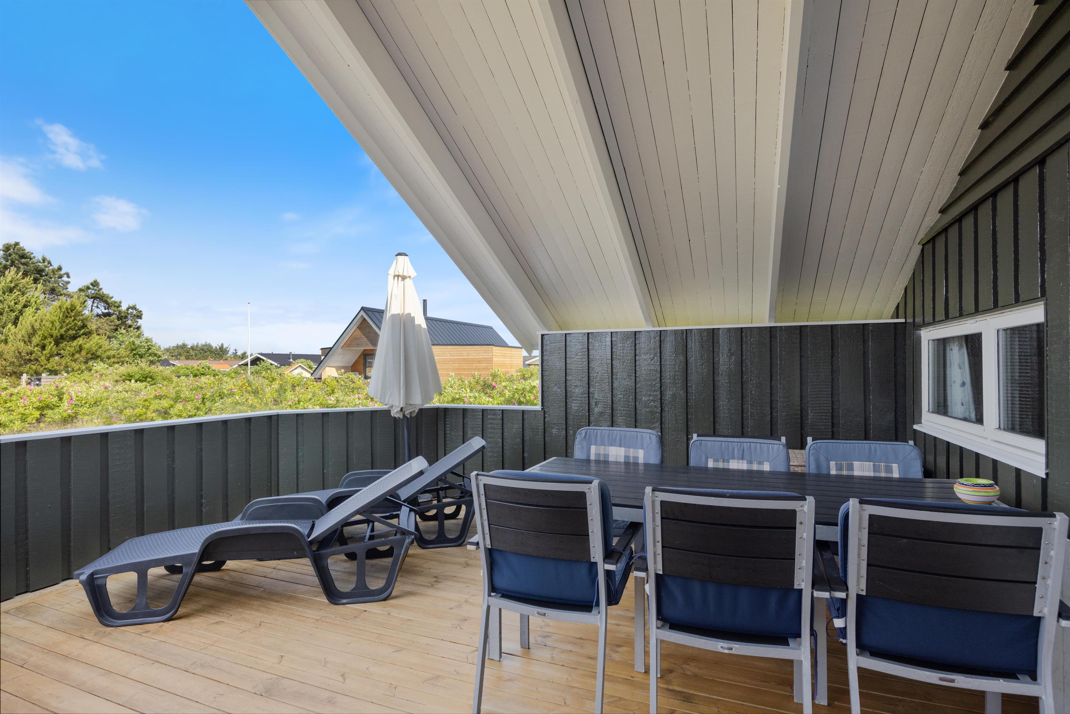 Sommerhuset har 2 gode terrasser. Mod vest er den store terrasse helt lukket, ligesom den er delvist overdækket og delvist afskærmet mod nord og mod syd. Mod øst er der en lidt mindre terrasse, og her er sommerhusets indgang også placeret. Den er delvist overdækket og ideel til brug om morgenen og i formiddagstimerne.