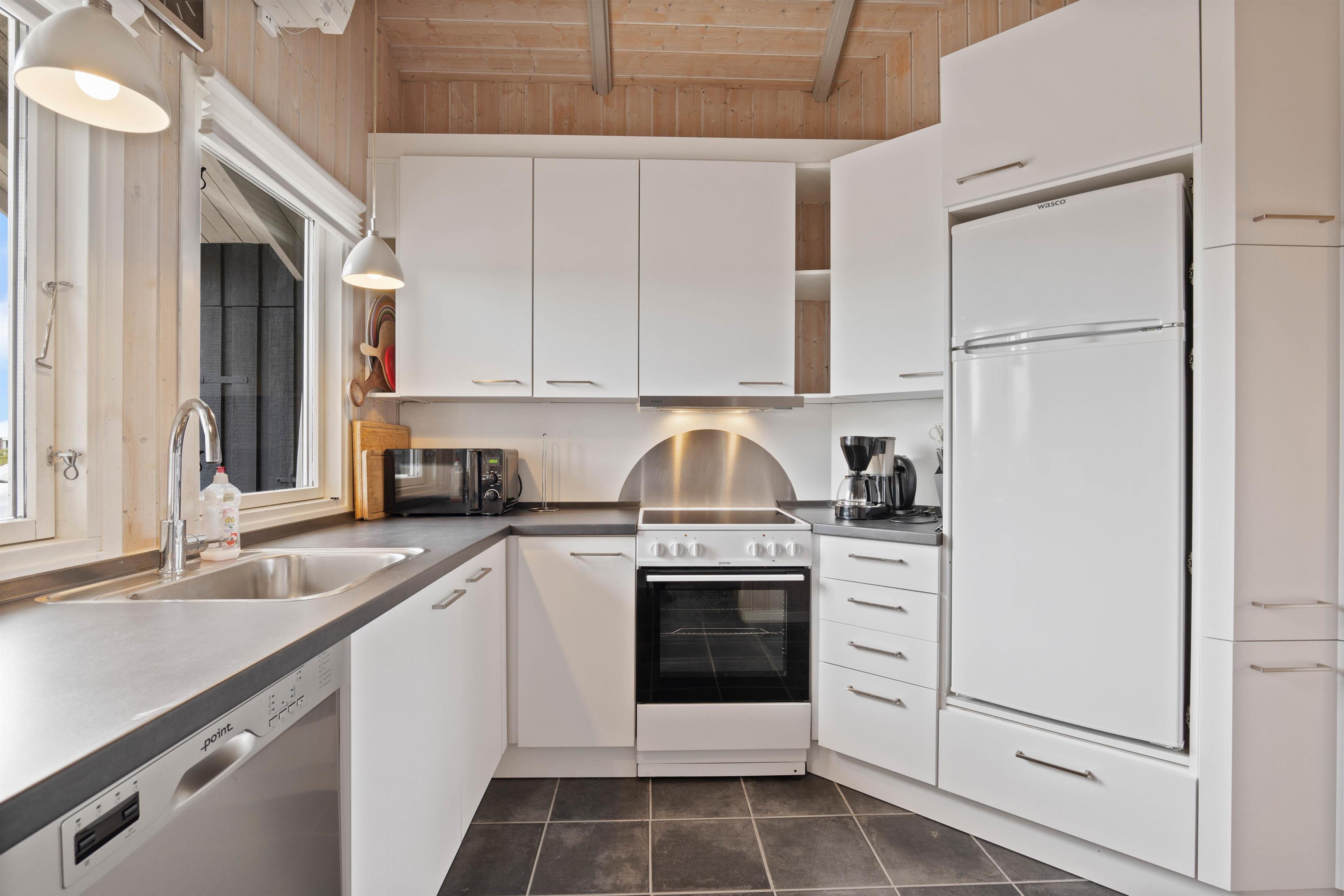 I køkkenet er der laminatgulv, opvaskemaskine, mikroovn og køleskab med frostboks. I stuen er der også trægulv samt træloft til kip, en charmerende brændeovn, et fladskærms-TV og Chromecast.
