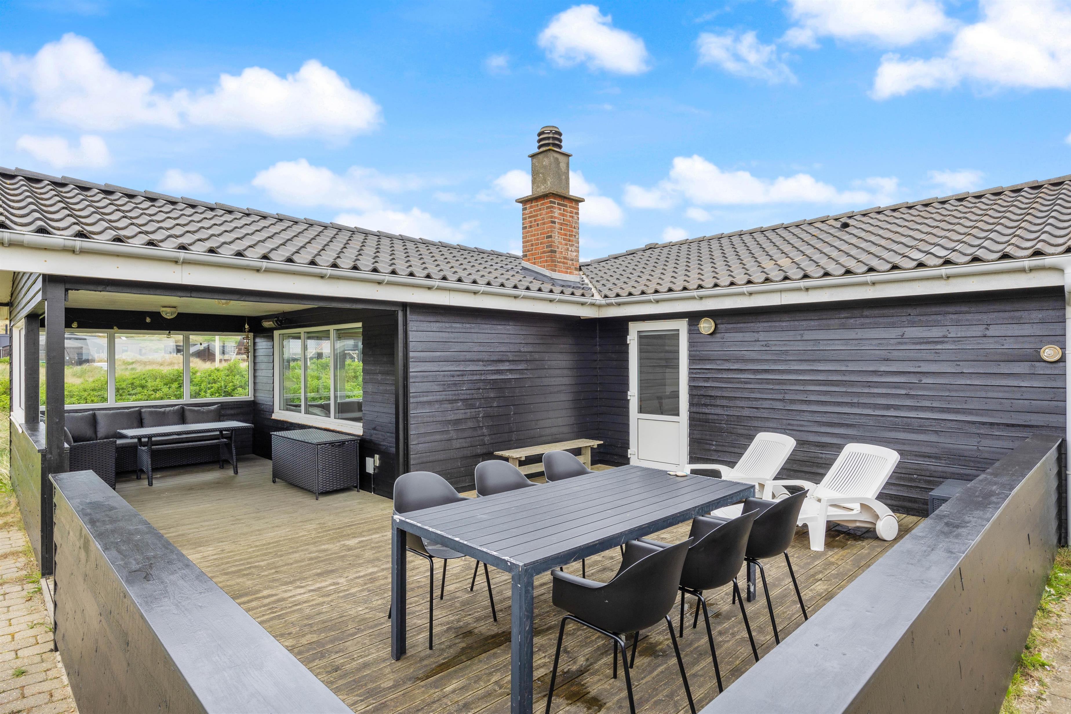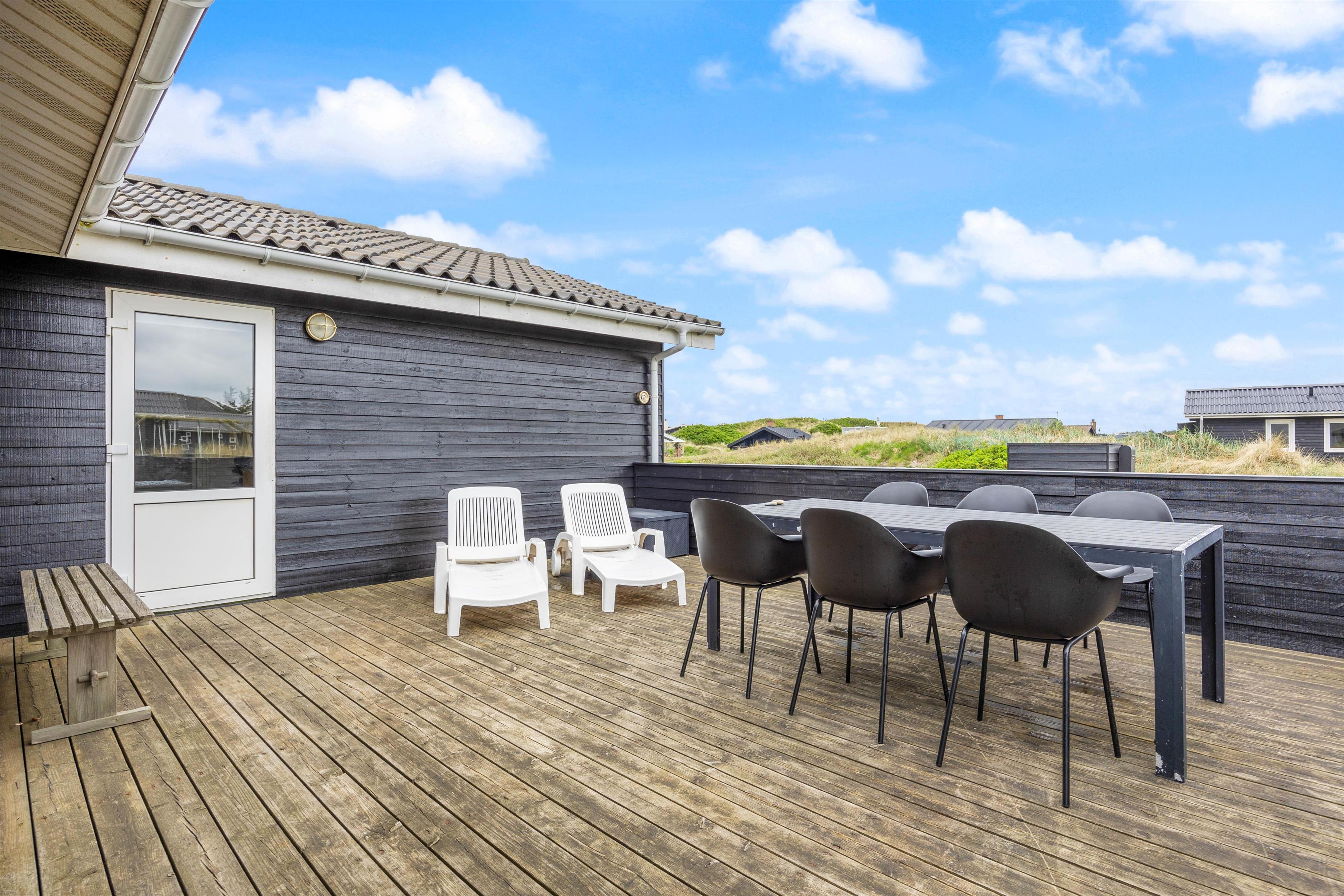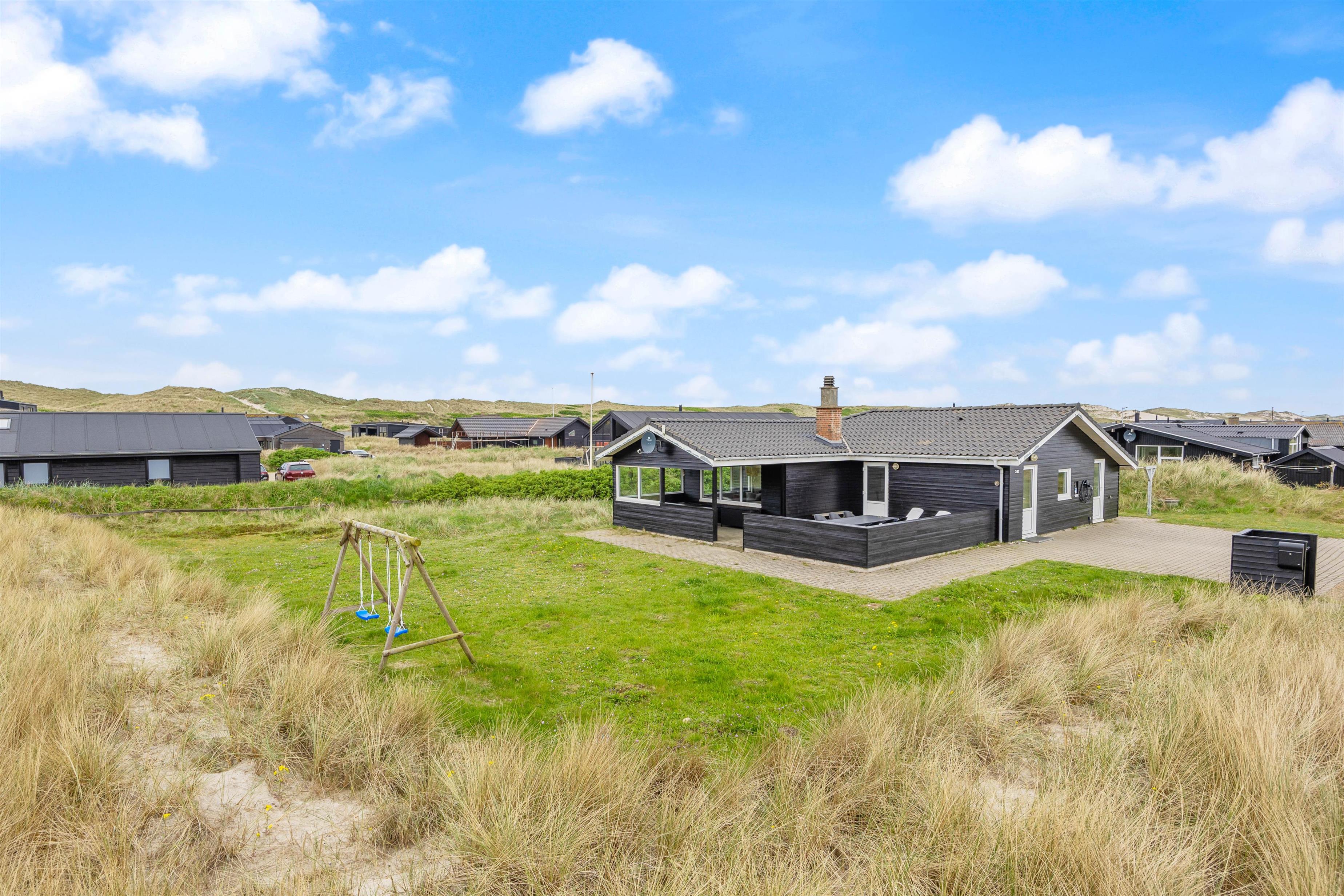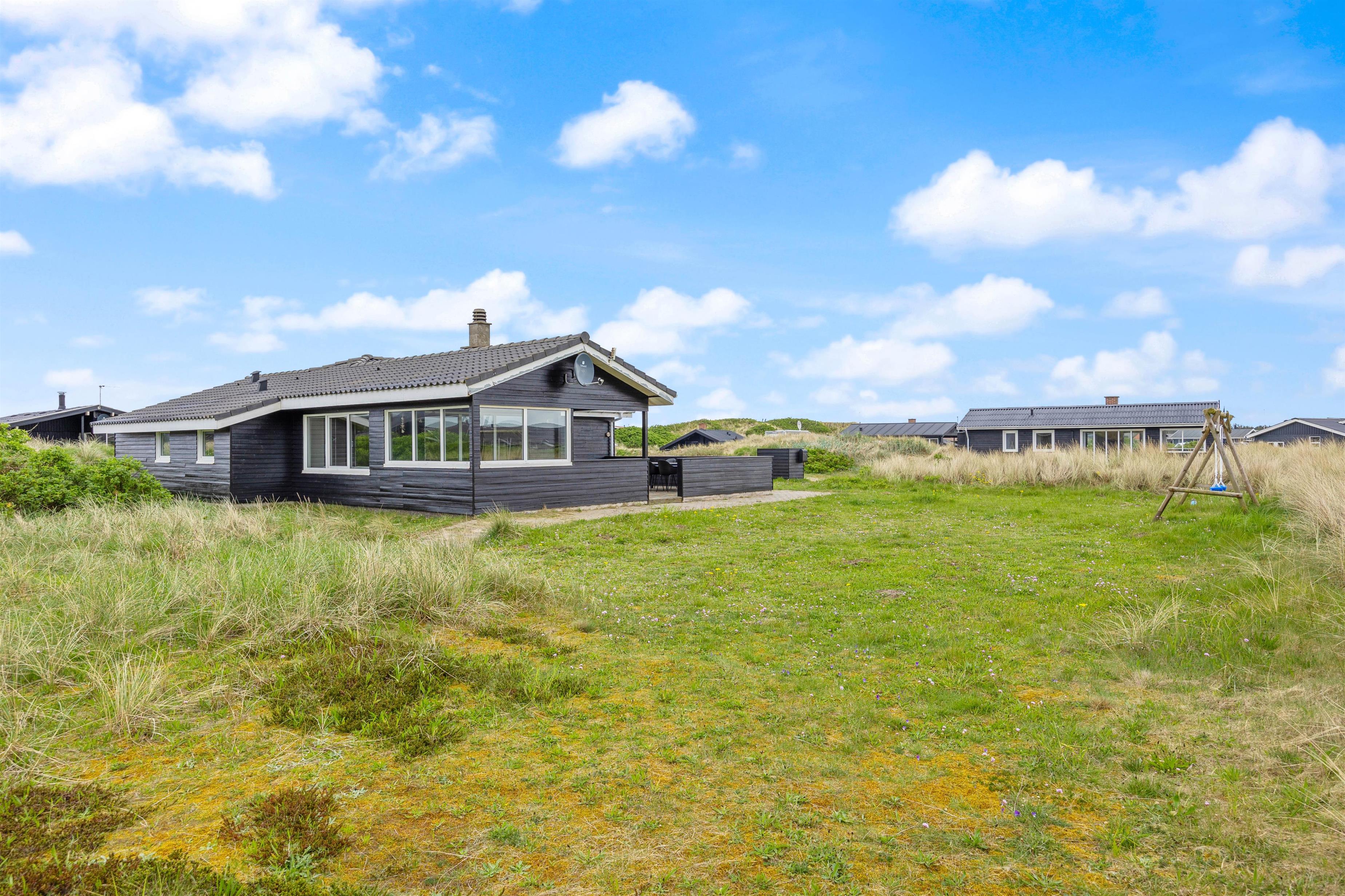 Beliggenheden er fin på en stor naturgrund med gynger til familiens mindste. Den store afskærmede terrasse er møbleret med gode havemøbler, liggestole og grill til de udendørs kulinariske udfoldelser. Her kan man virkelig nyde, at der er højt til himlen i den vestjyske natur. Desuden er terrassen lukket, så hundene kan gå frit.