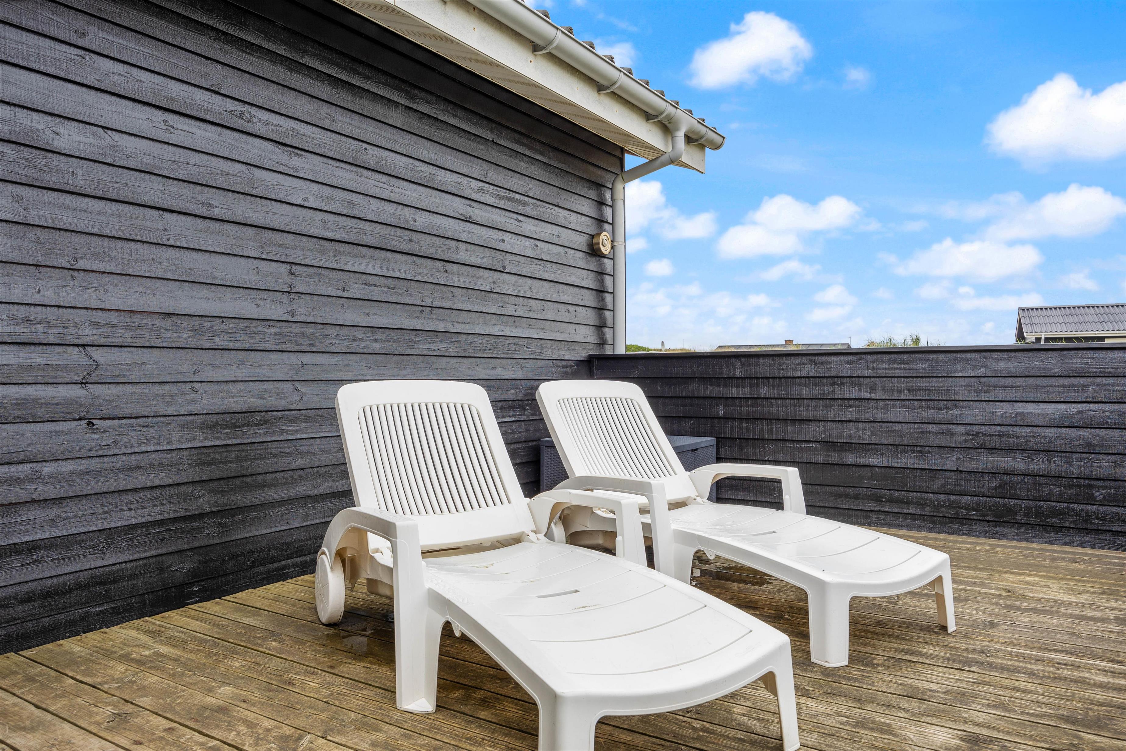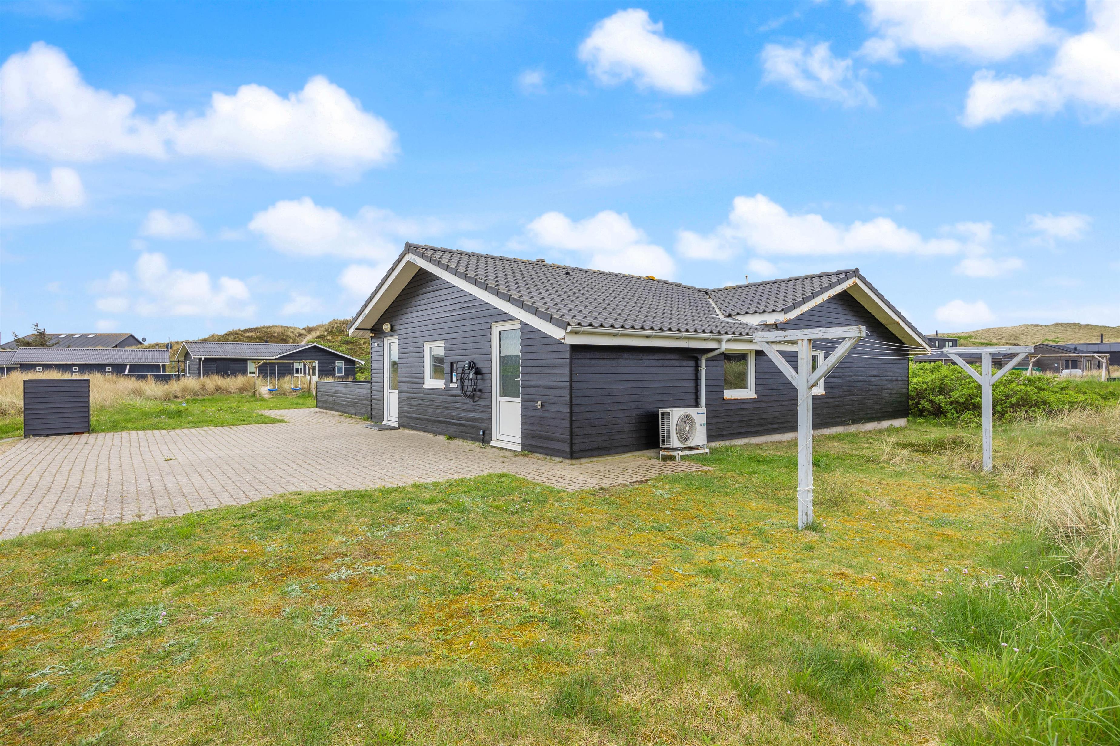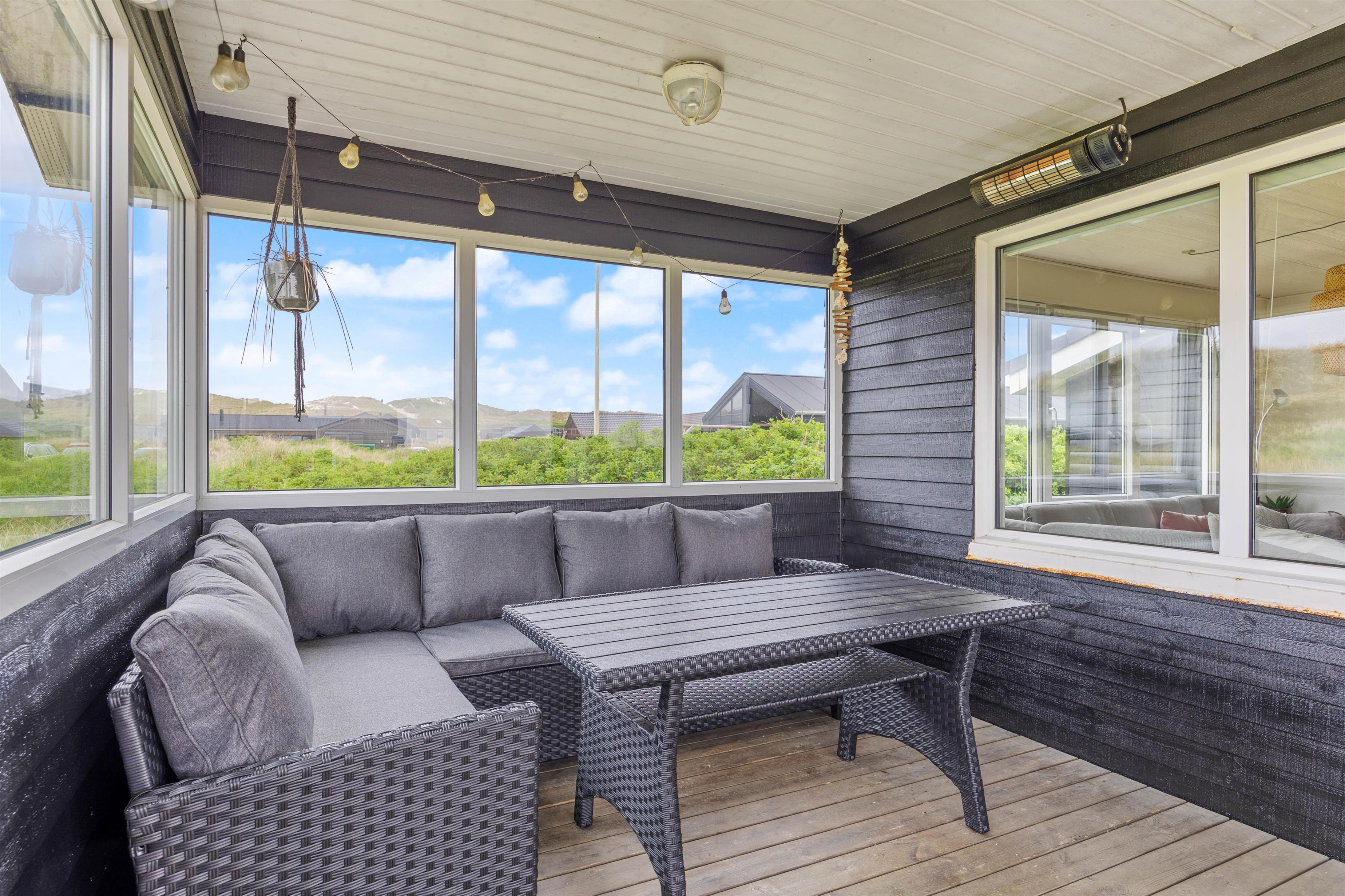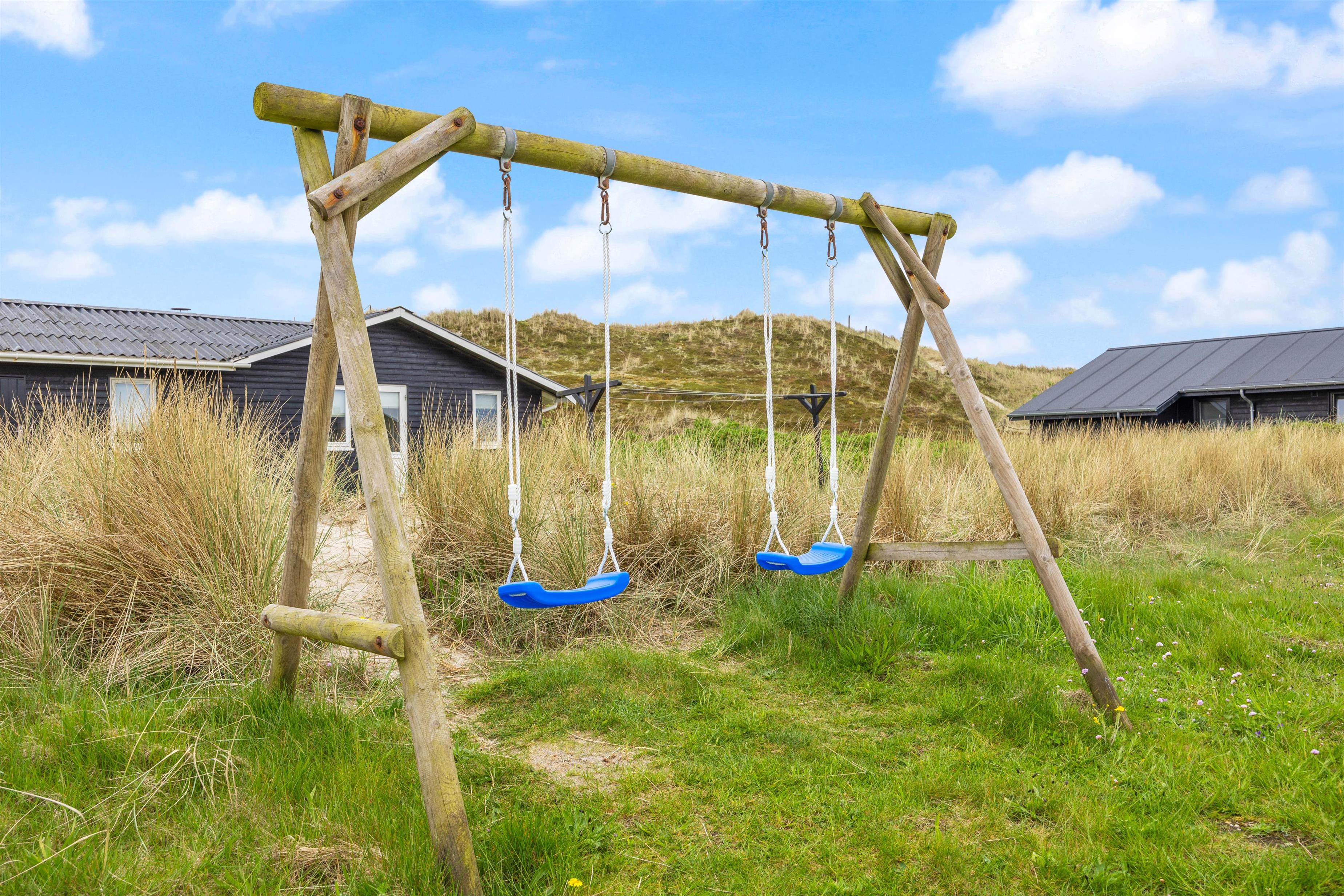 Beliggenheden er fin på en stor naturgrund med gynger til familiens mindste. Den store afskærmede terrasse er møbleret med gode havemøbler, liggestole og grill til de udendørs kulinariske udfoldelser. Her kan man virkelig nyde, at der er højt til himlen i den vestjyske natur. Desuden er terrassen lukket, så hundene kan gå frit.