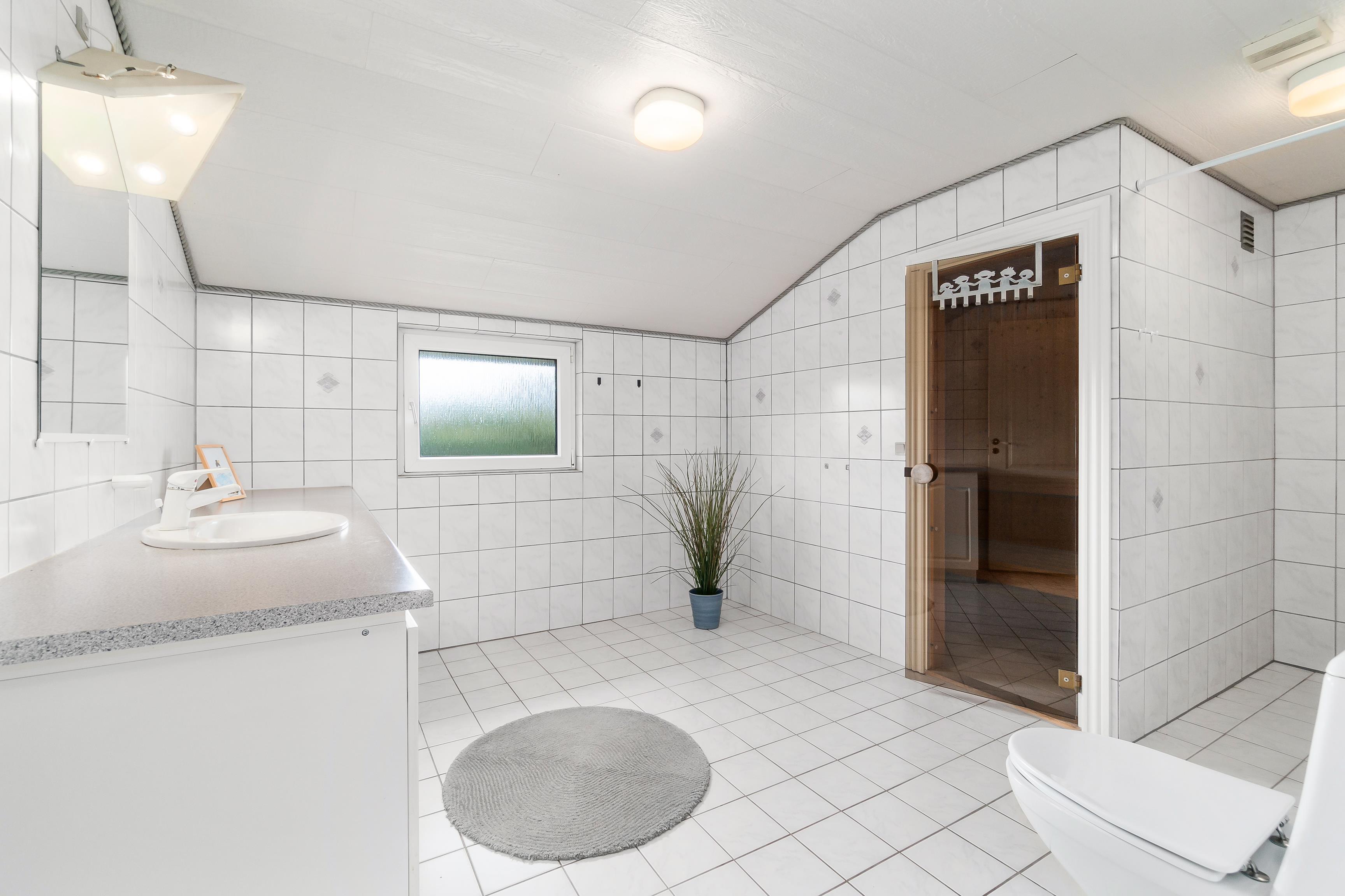 Overalt i sommerhuset er der god plads, både i stue, soveværelser og det store badeværelse med bruser samt gulvvarme og adgang til den rummelige sauna. Der er desuden gratis trådløst internet, vaskemaskine og tørretumbler i dette sommerhus.