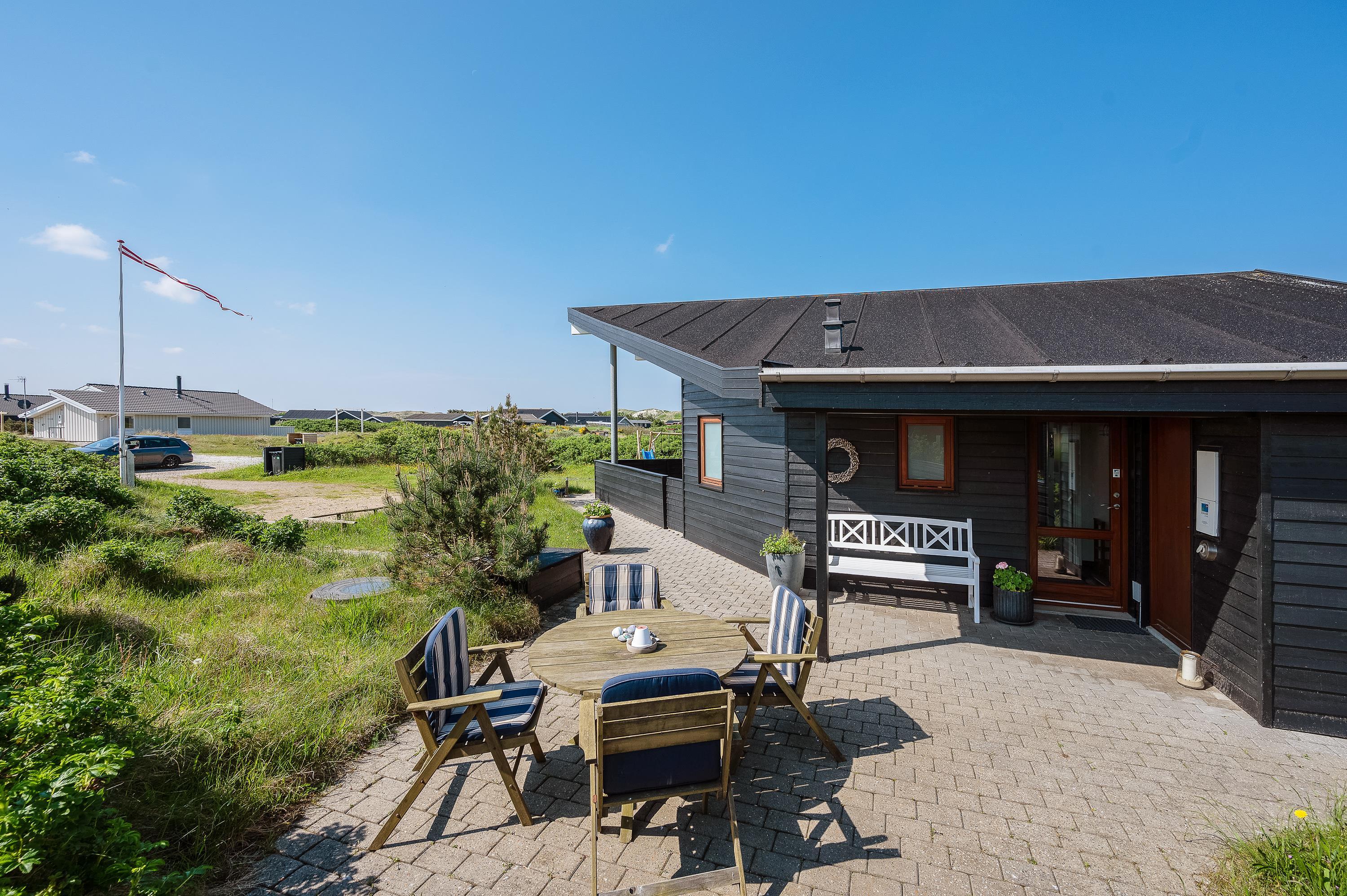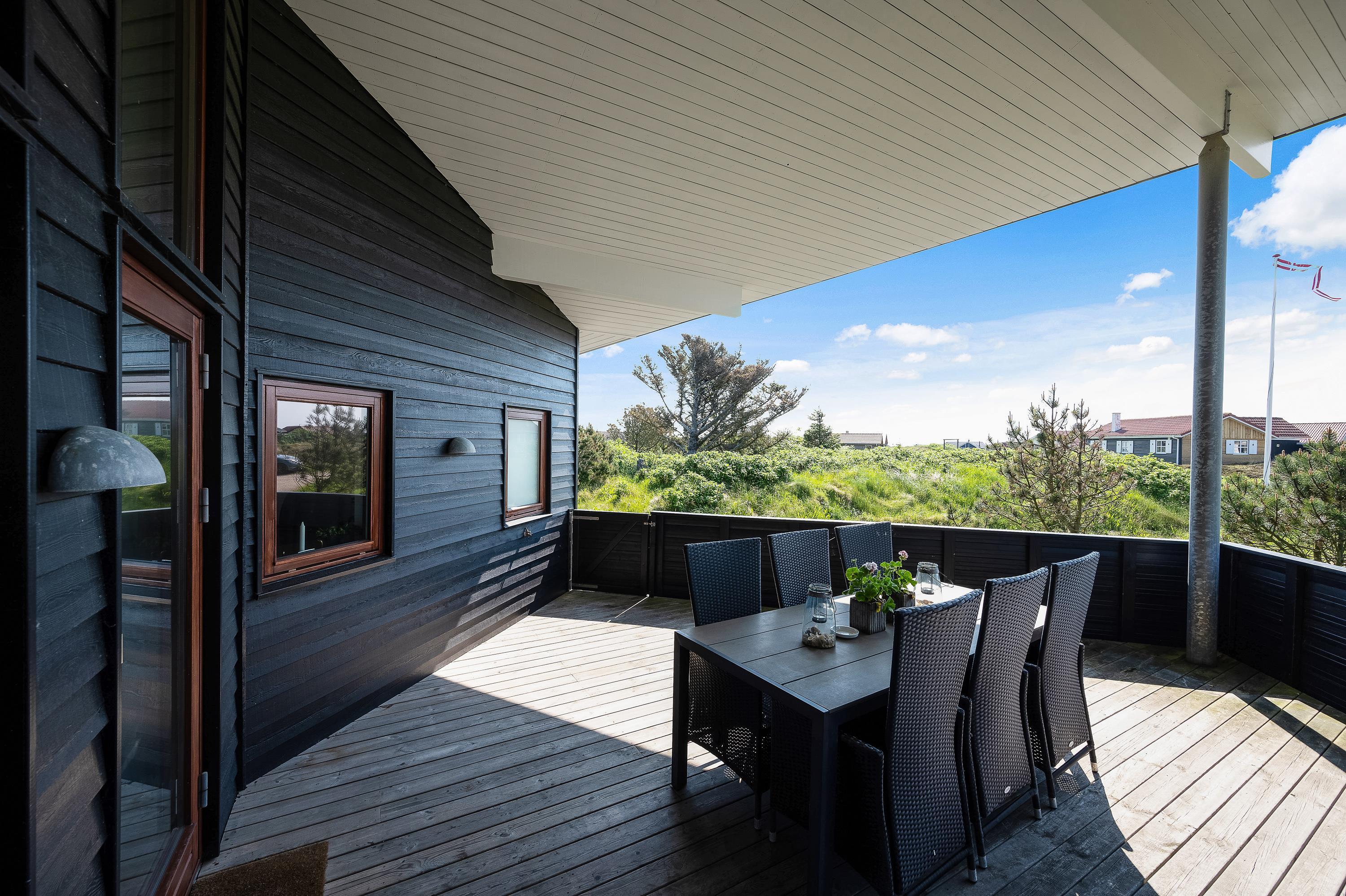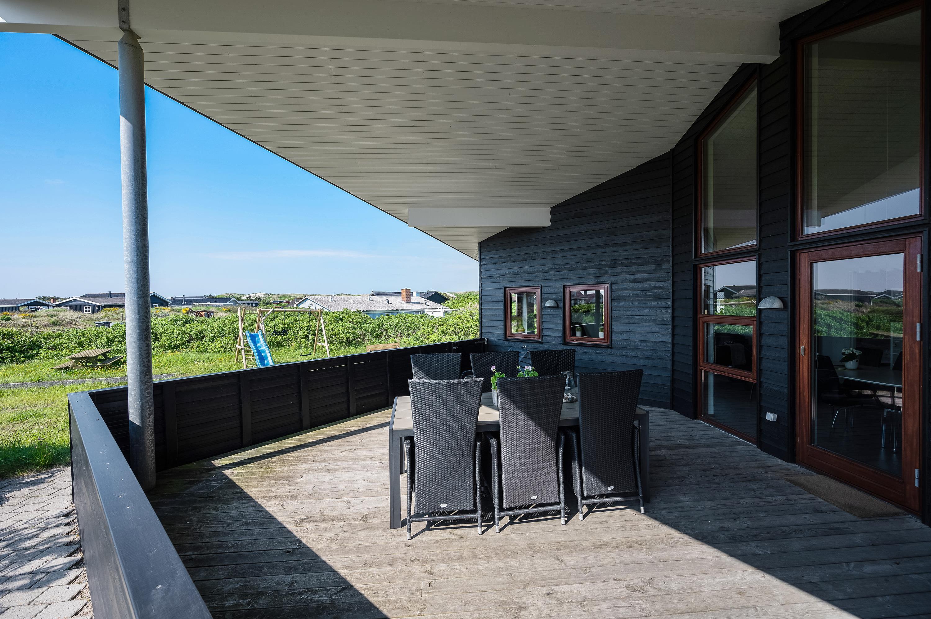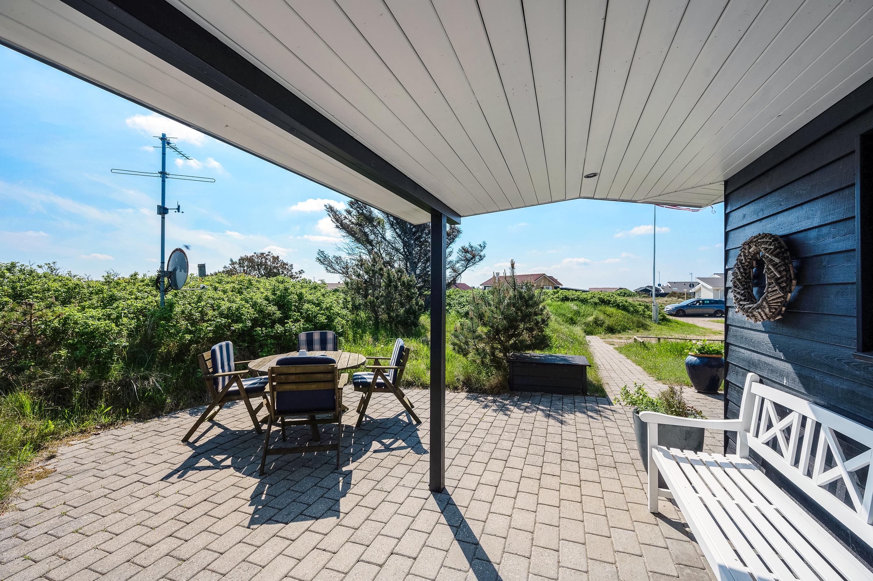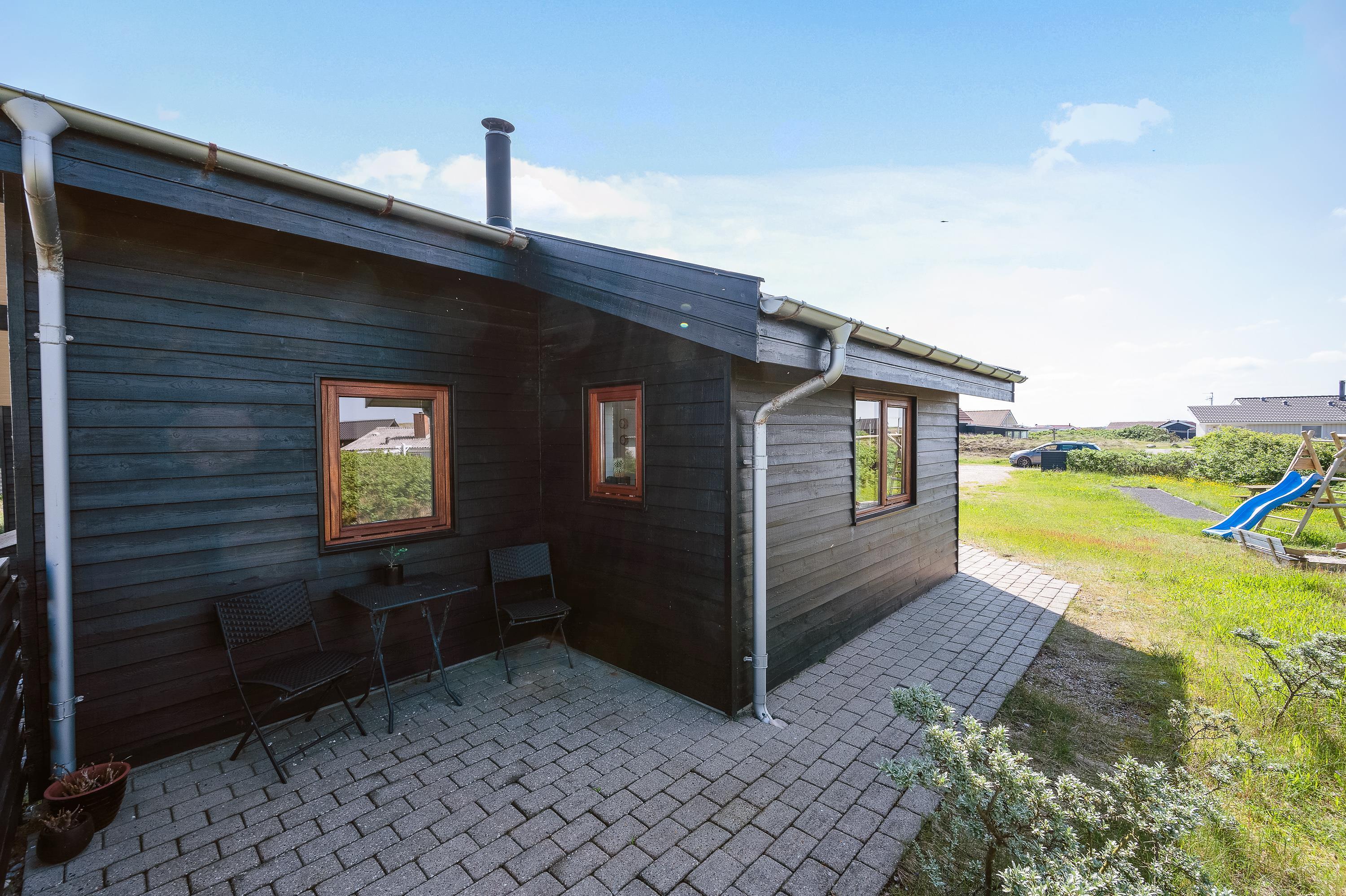 Det flotte og utraditionelle feriehus er beliggende på en naturgrund og har en stor afskærmet og næsten helt overdækket terrasse med havemøbler, liggestole og grill, der kan levere et ægte sommermåltid. Terrassen er også indhegnet, så hundene kan gå frit rundt. Skråt overfor terrassen er der mulighed for leg – både for børn og voksne. Her er nemlig sandkasse, gyngestativ og en petanquebane.