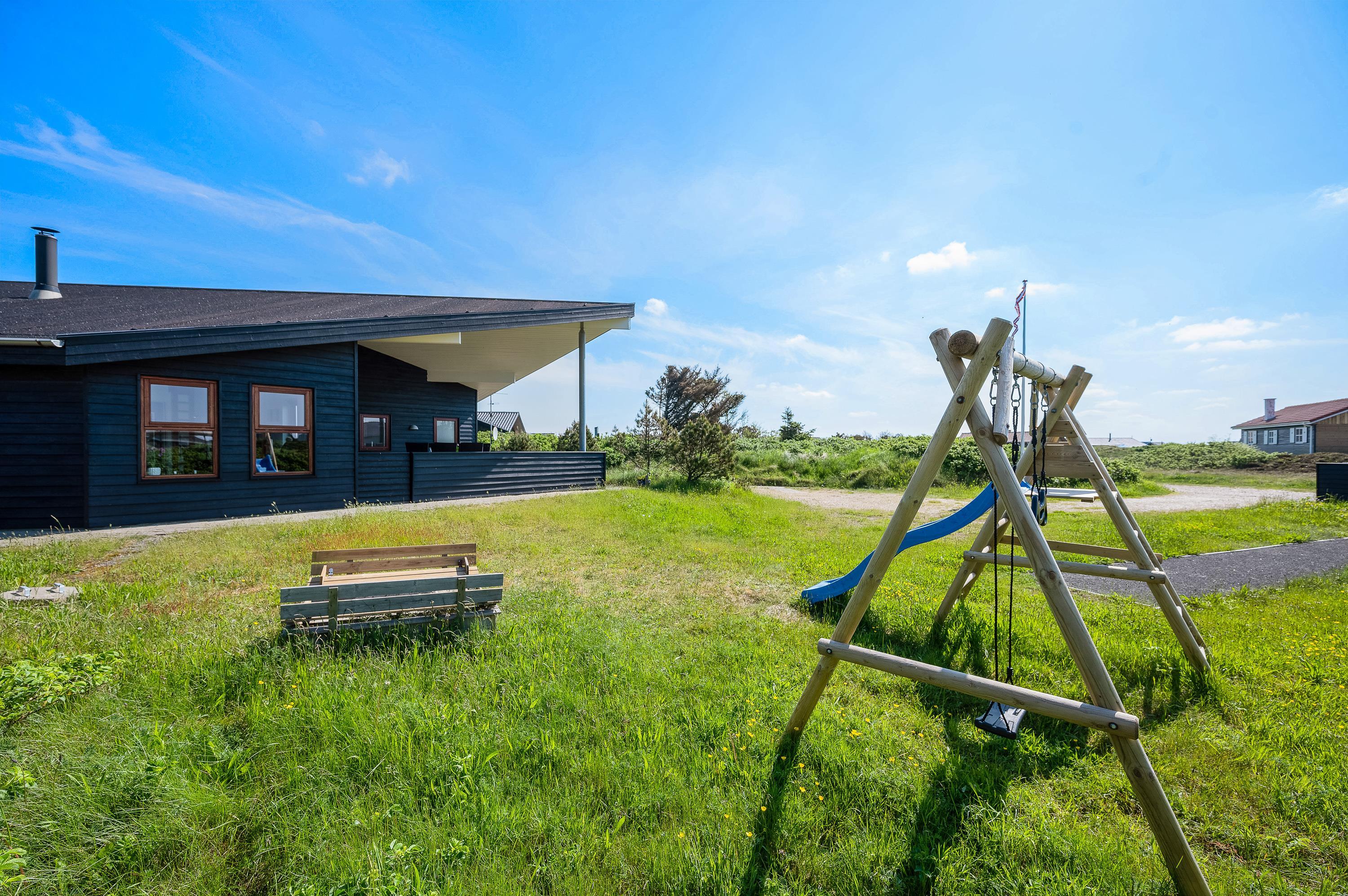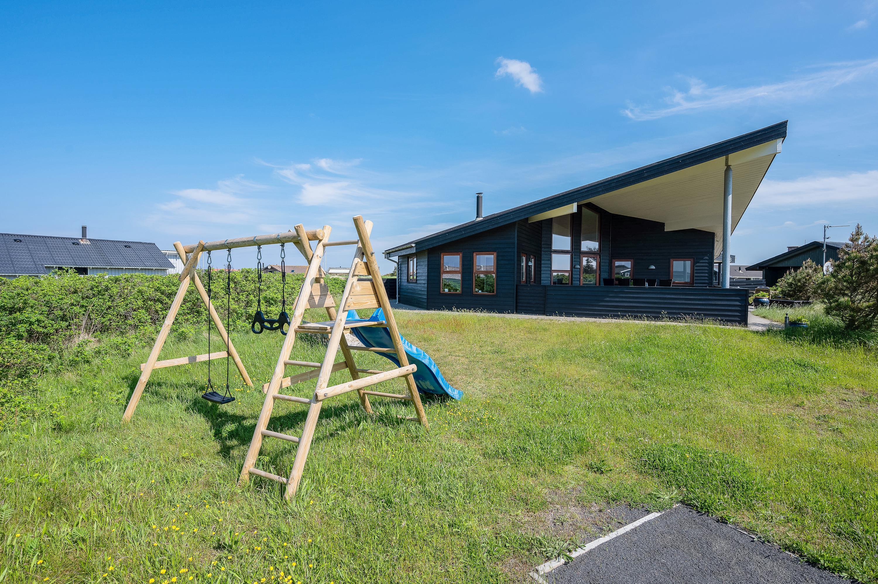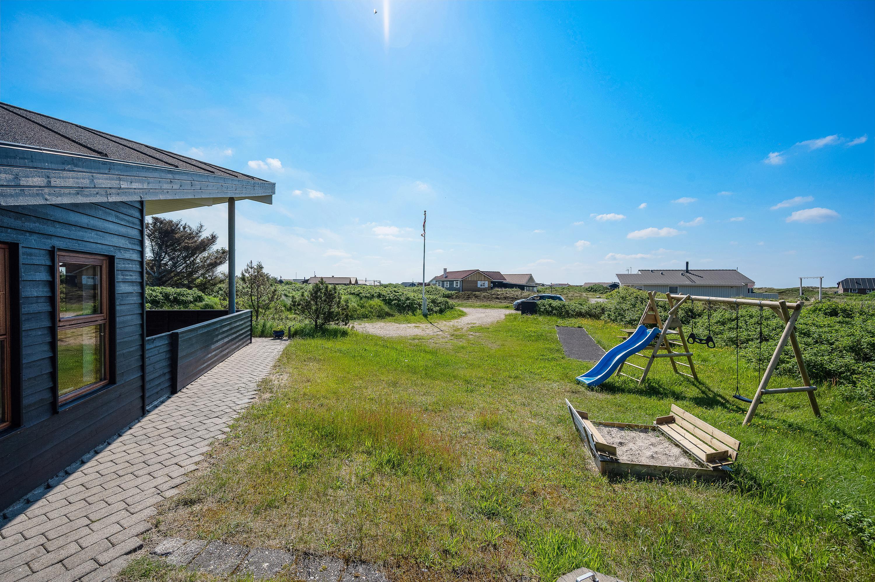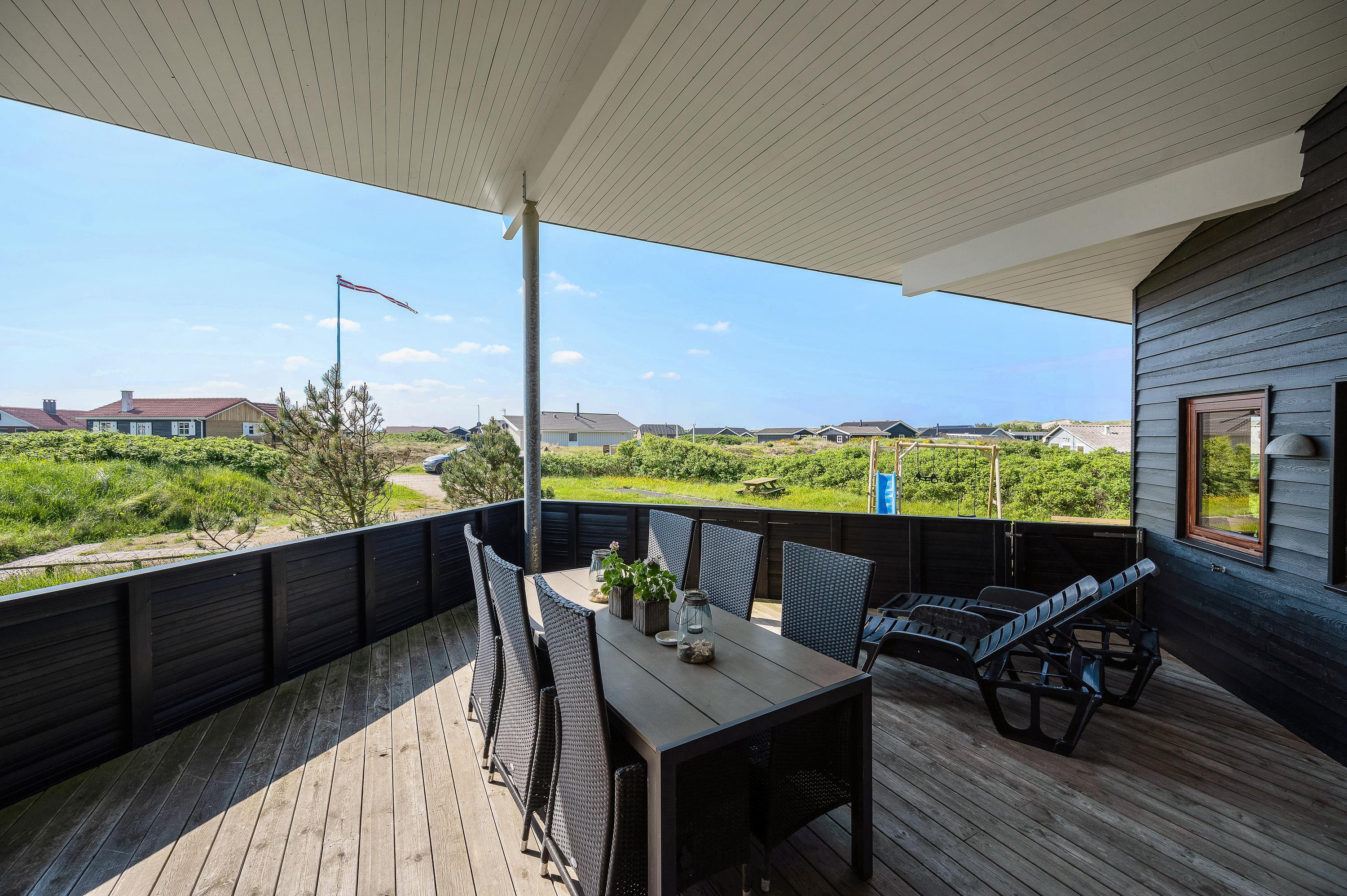 Det flotte og utraditionelle feriehus er beliggende på en naturgrund og har en stor afskærmet og næsten helt overdækket terrasse med havemøbler, liggestole og grill, der kan levere et ægte sommermåltid. Terrassen er også indhegnet, så hundene kan gå frit rundt. Skråt overfor terrassen er der mulighed for leg – både for børn og voksne. Her er nemlig sandkasse, gyngestativ og en petanquebane.