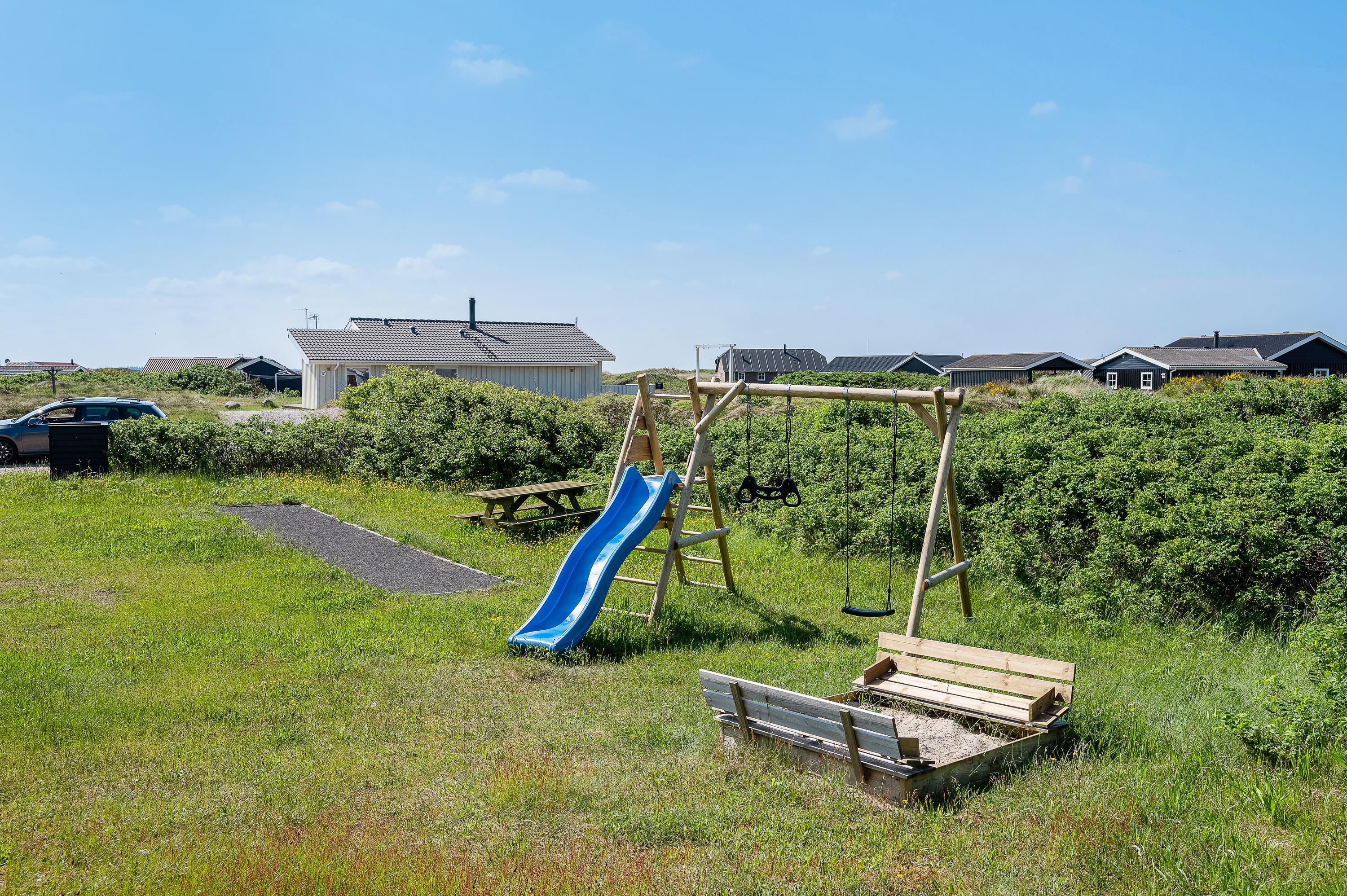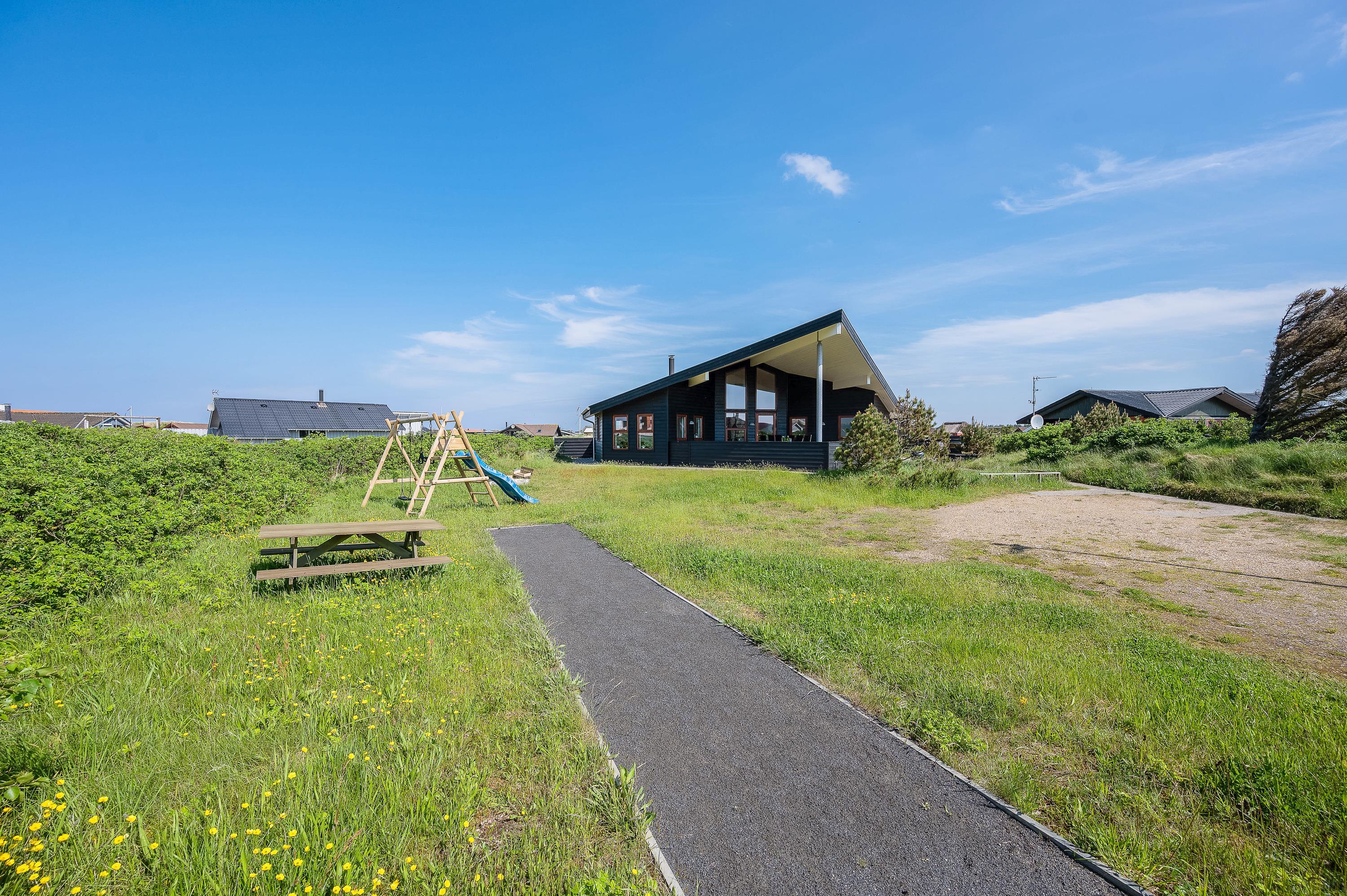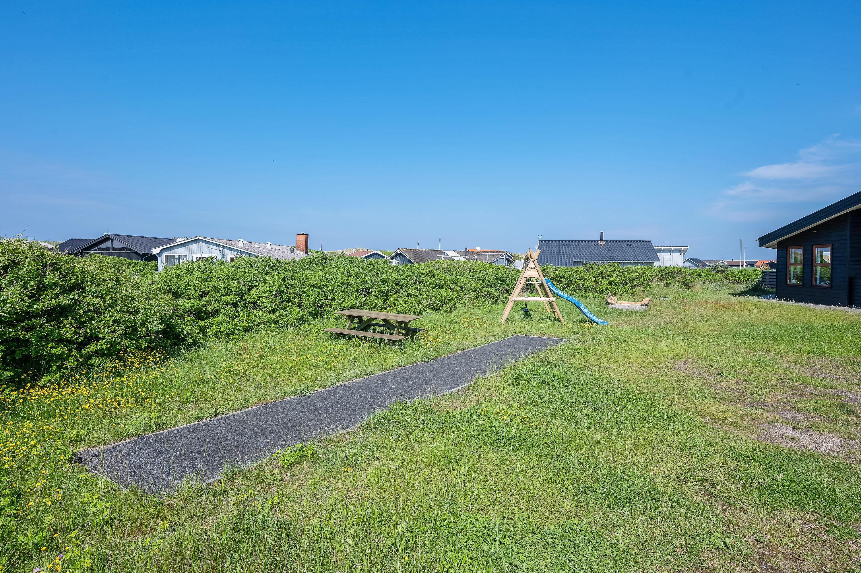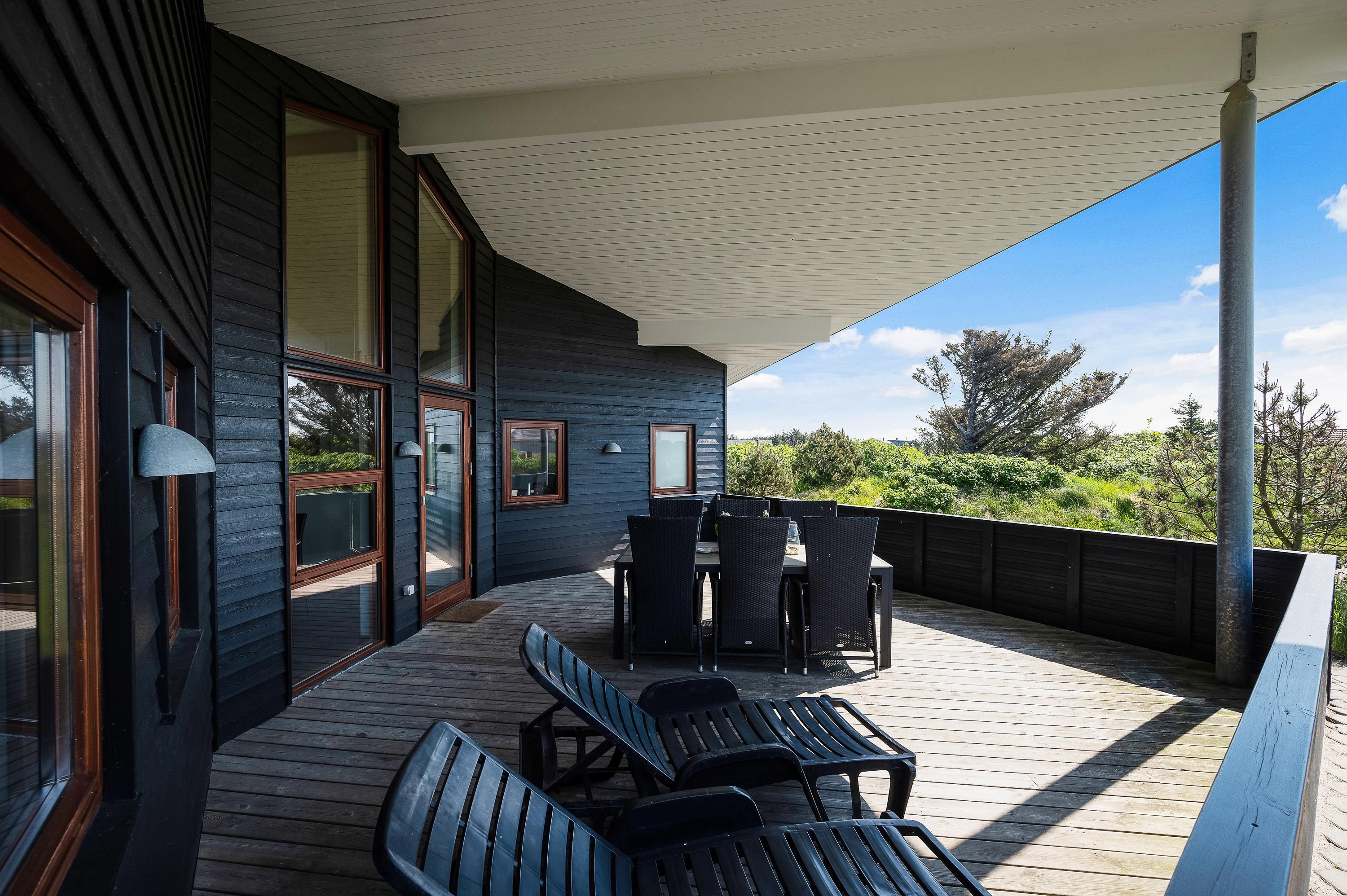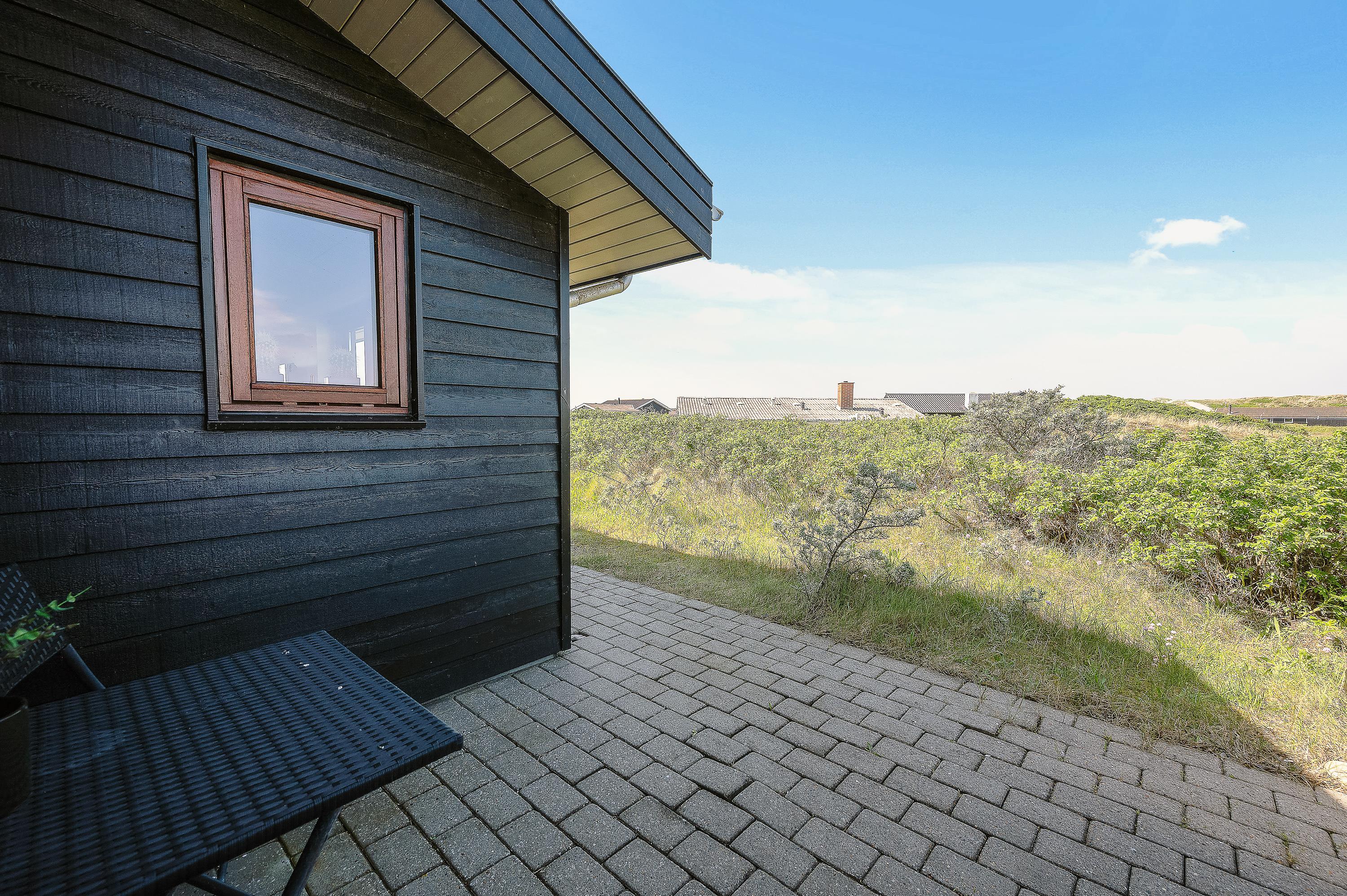 Det flotte og utraditionelle feriehus er beliggende på en naturgrund og har en stor afskærmet og næsten helt overdækket terrasse med havemøbler, liggestole og grill, der kan levere et ægte sommermåltid. Terrassen er også indhegnet, så hundene kan gå frit rundt. Skråt overfor terrassen er der mulighed for leg – både for børn og voksne. Her er nemlig sandkasse, gyngestativ og en petanquebane.