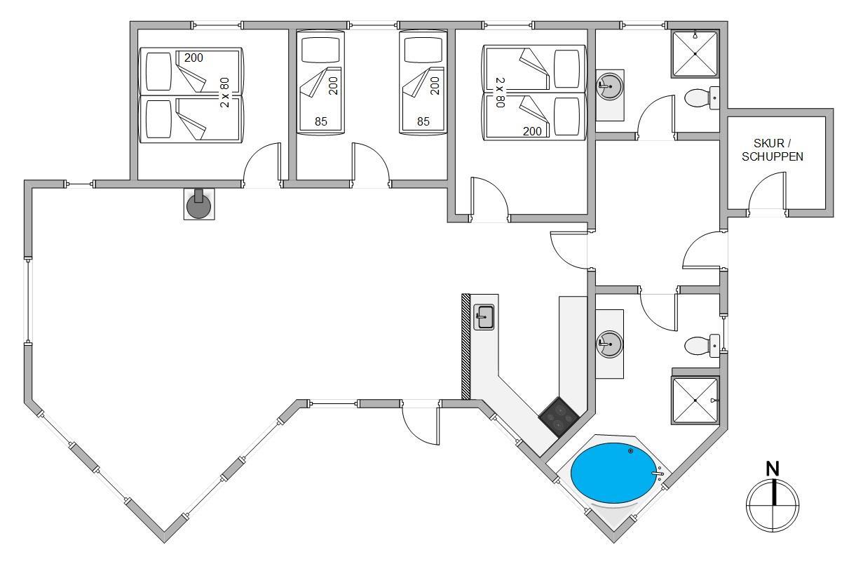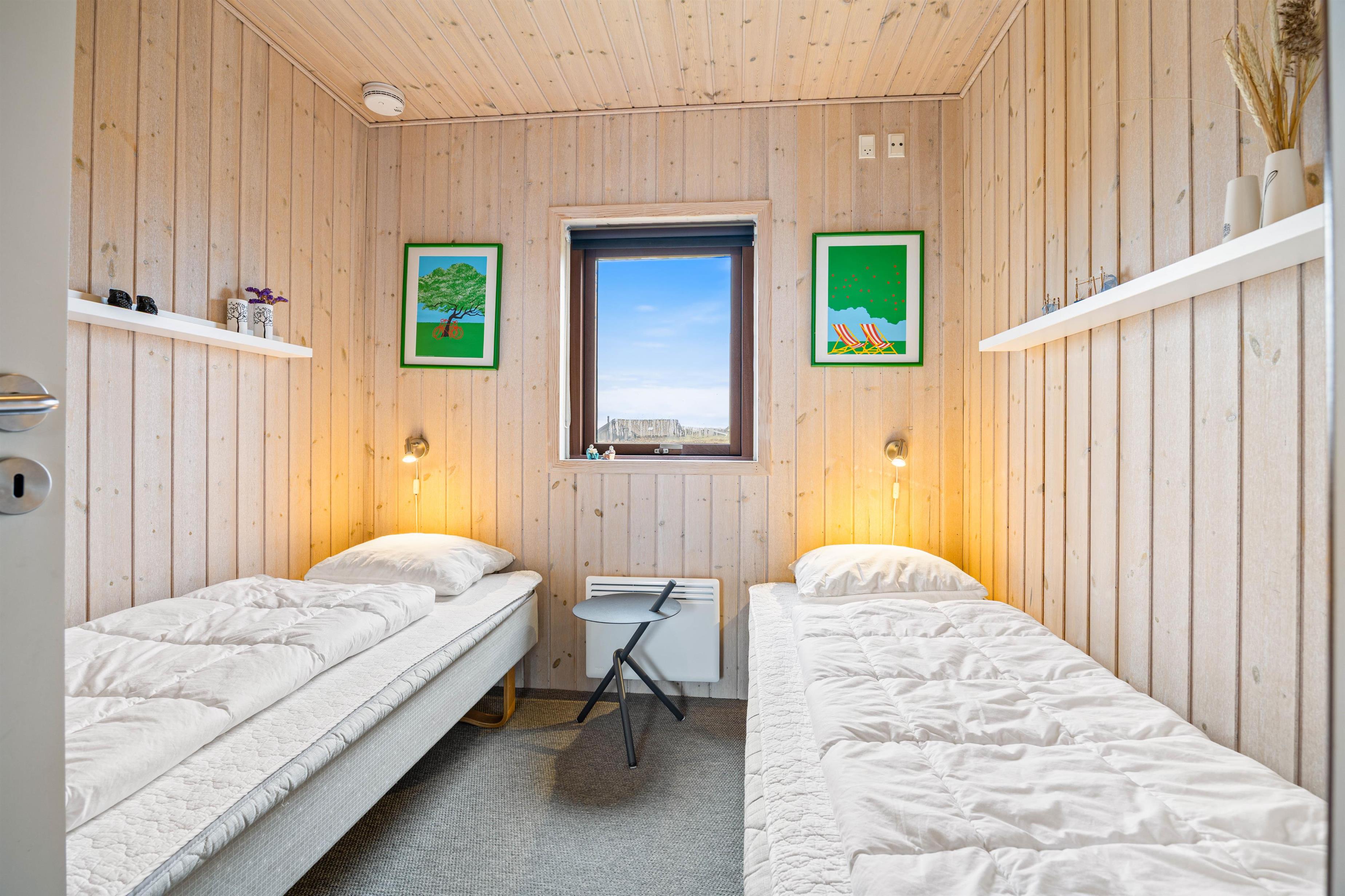 Her er 3 gode soveværelser, to af dem er med dobbeltseng, mens det sidste værelse er med to enkeltsenge. I sommerhuset finder I også 2 flotte badeværelser med gulvvarme, hvoraf det ene indbyder til afslapning i boblebadet. Der er mulighed for at benytte sig af vaskemaskine og tørretumbler i feriehuset.