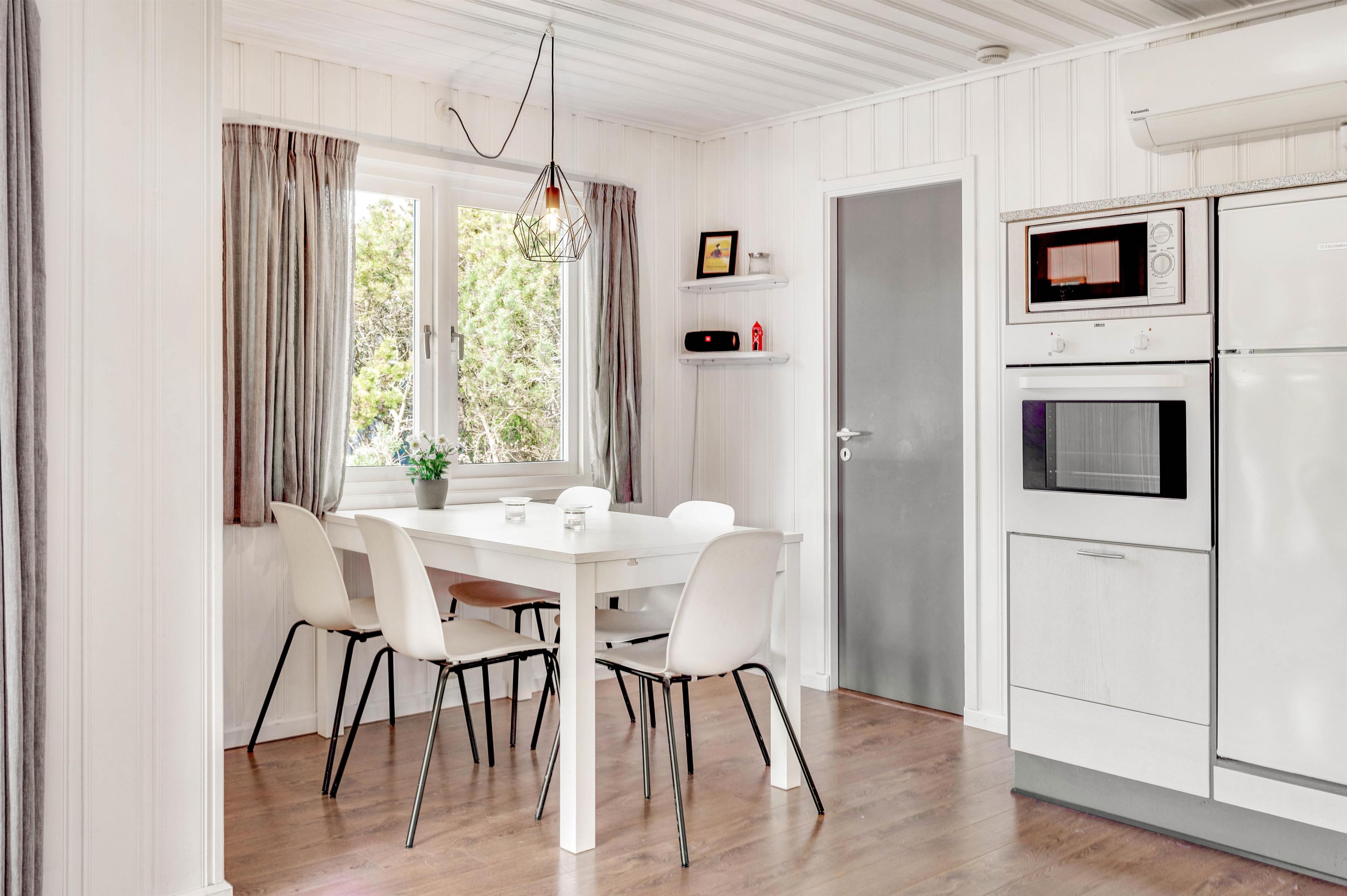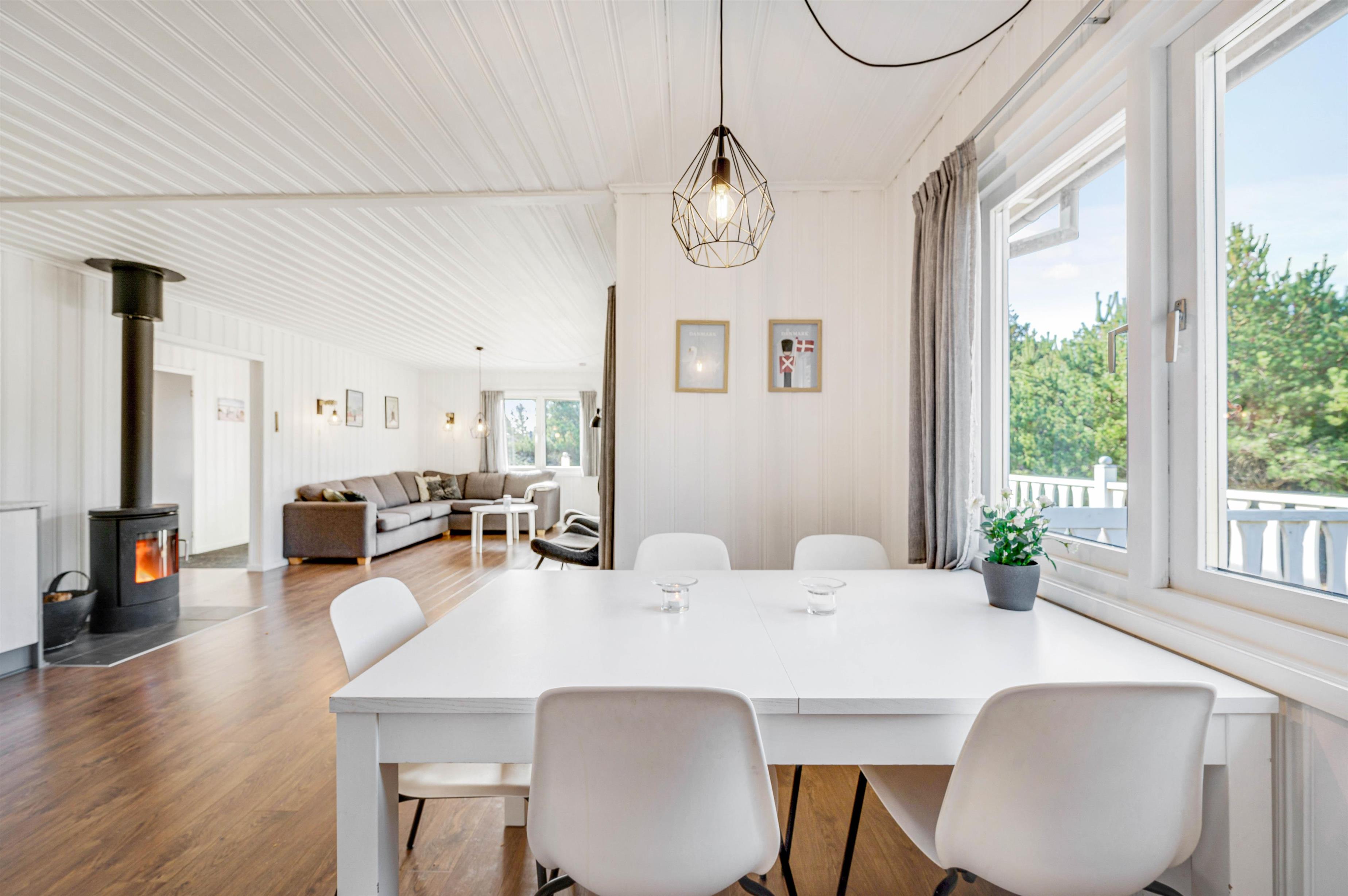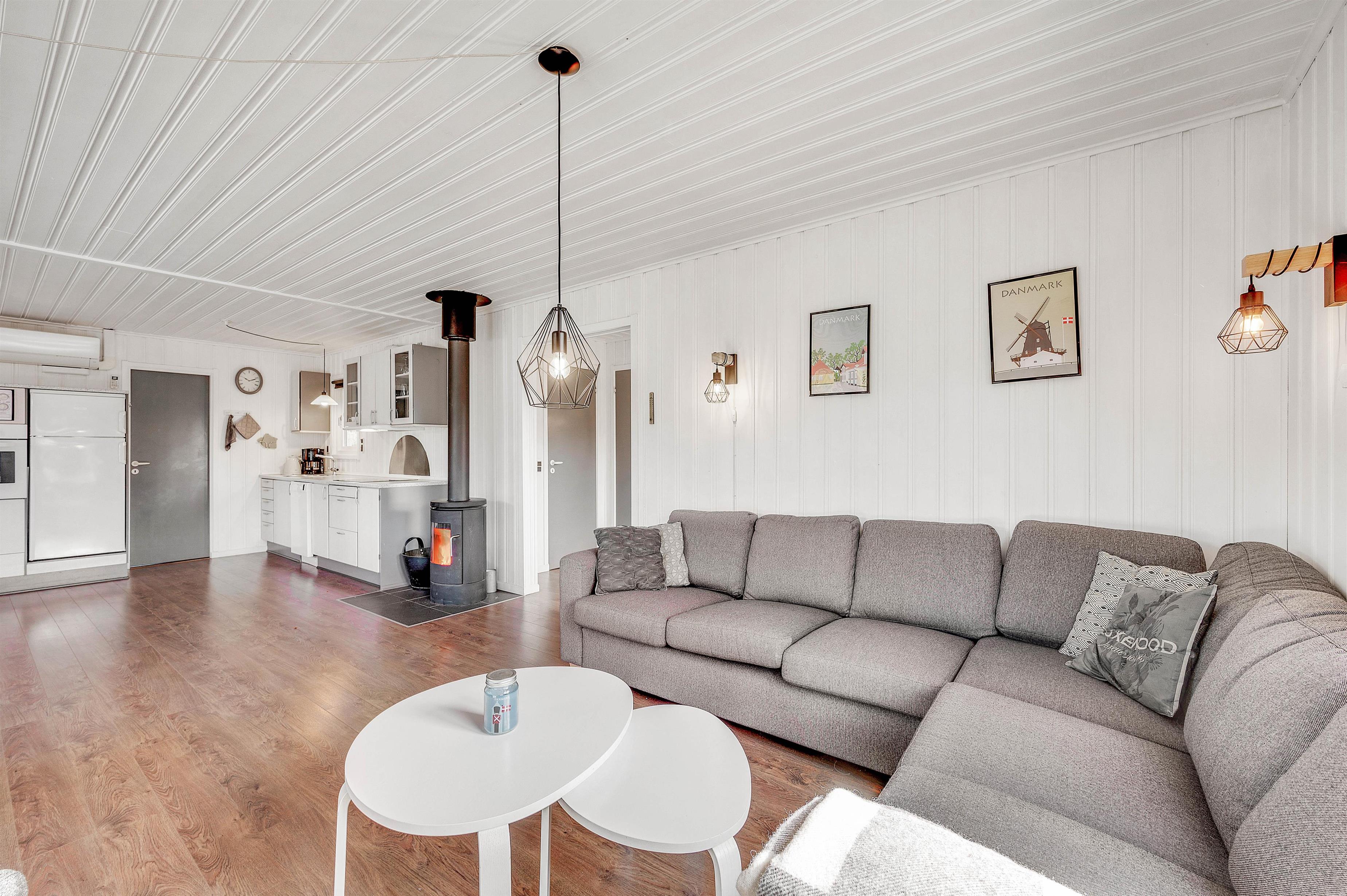Der er plads til op til 6 feriegæster i dette sommerhus, som emmer af hygge og feriestemning. Her er et fint køkken, der er åbent forbundet med den lyse og rummelige stue. Her kan du tilbringe lidt kvalitetstid med familien omkring fælles madlavning, sjove spil eller en god film – og på de køligere dage kan du tænde op i brændeovnen, der giver en ekstra hyggelig atmosfære. Desuden er der en varmepumpe i sommerhuset.
