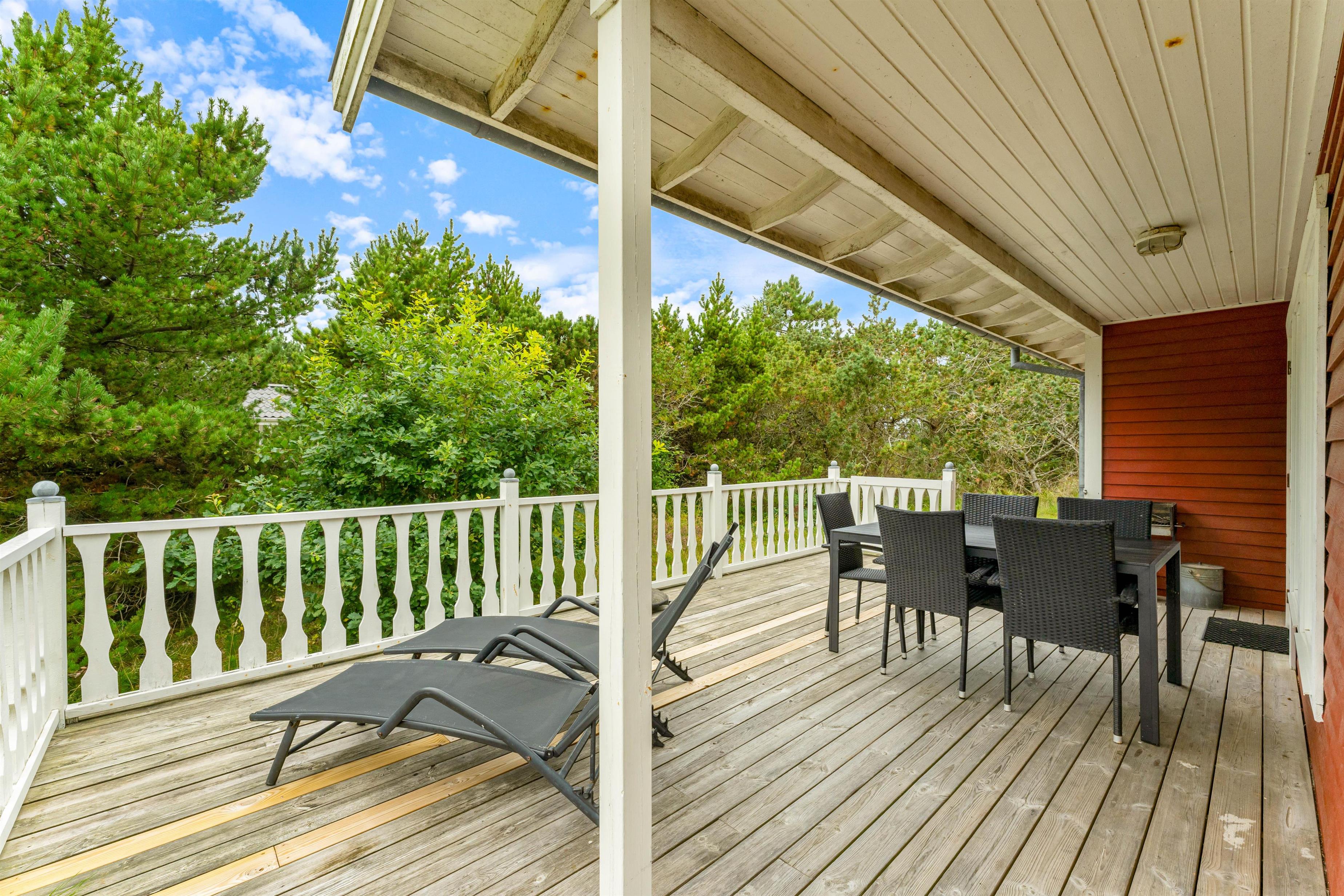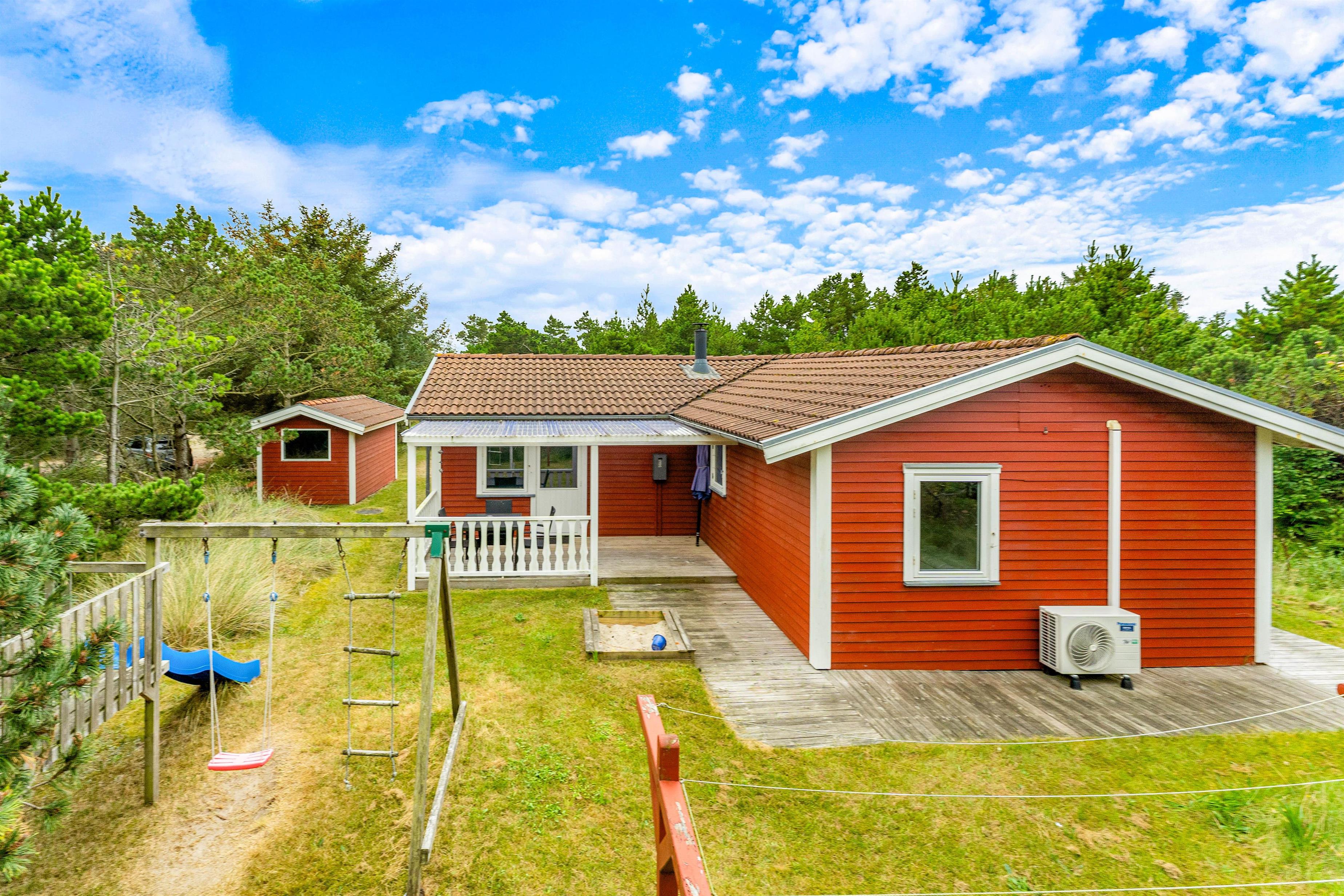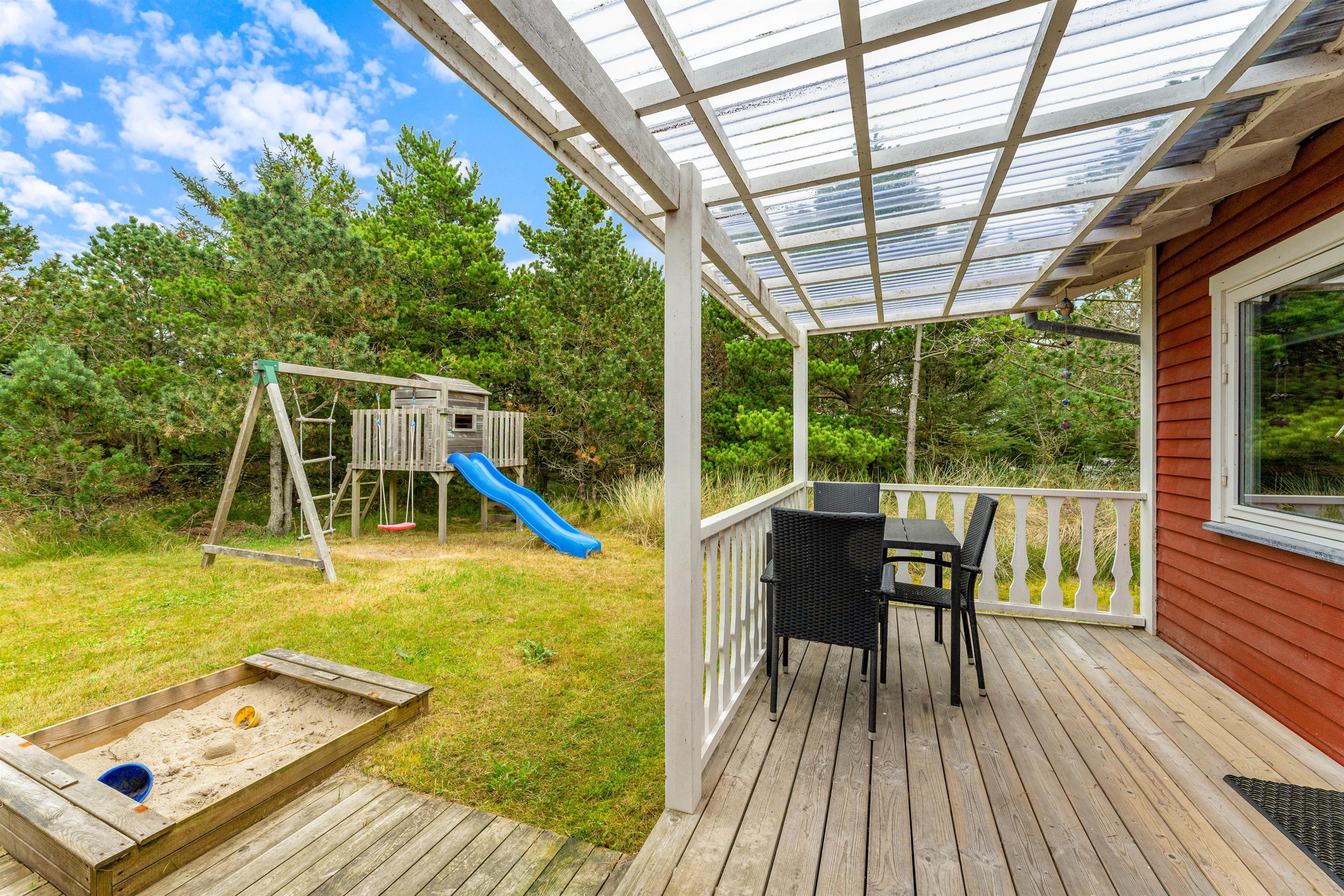 Omkring feriehuset er der flere terrasser, så du ofte kan finde en plads i læ. Der er intet som at ligge i liggestolen med en god bog og høre børnene lege i baggrunden. På grunden er der nemlig god plads til, at børnene kan lege og spille bold. Og for de mindre børn er der både gynger og en sandkasse.