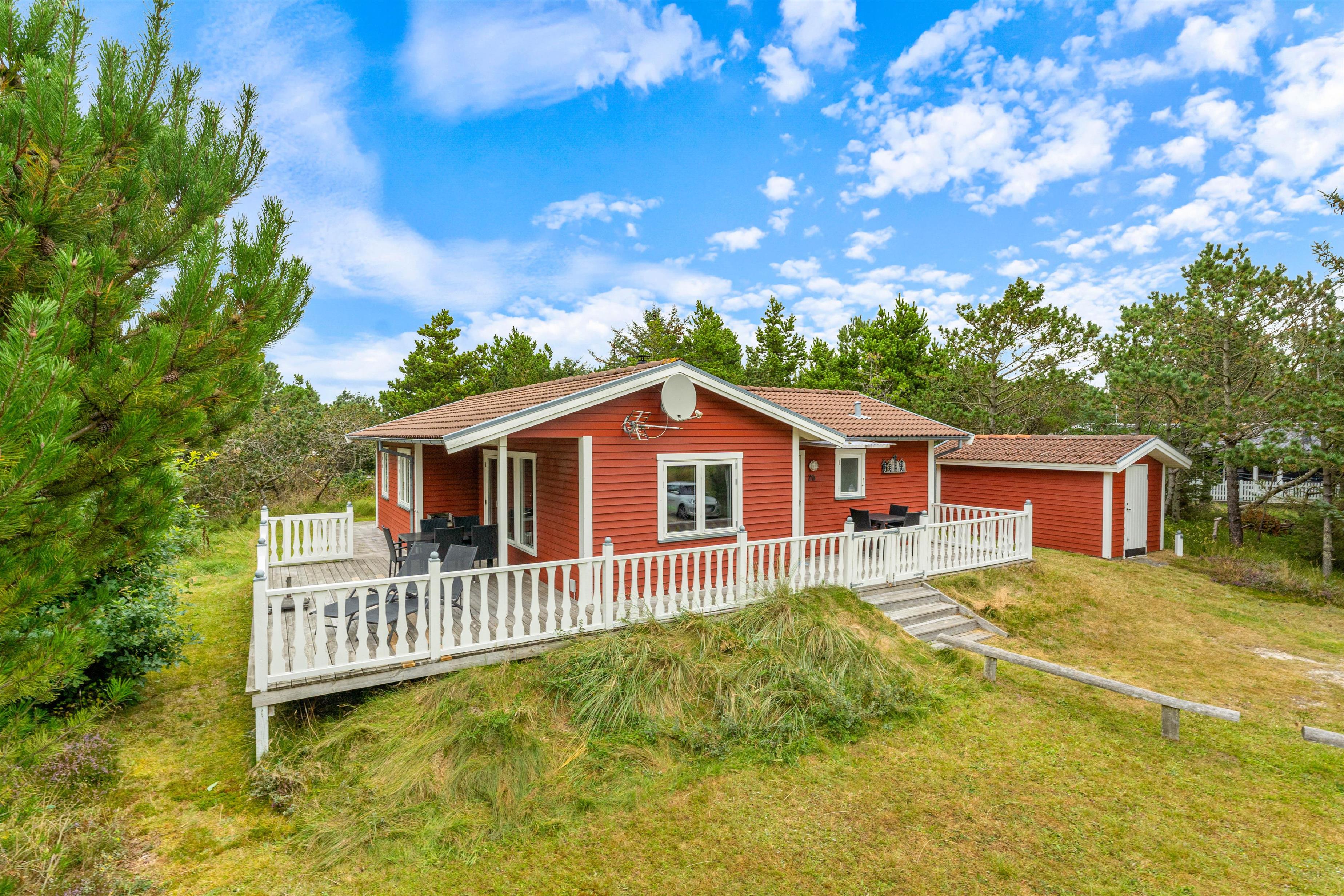 På Humlegårdsvej 26 ligger dette hyggelige feriehus med rolig beliggenhed på en naturgrund afskærmet af små buske og fyrretræer. Feriehuset ligger i gåafstand fra købmanden og store skønne naturområder; både hede og strand. En stor lukket terrasse giver masser af ro og tryghed, når du ferierer med små børn - desuden er grunden perfekt til leg med både gynger og sandkasse.