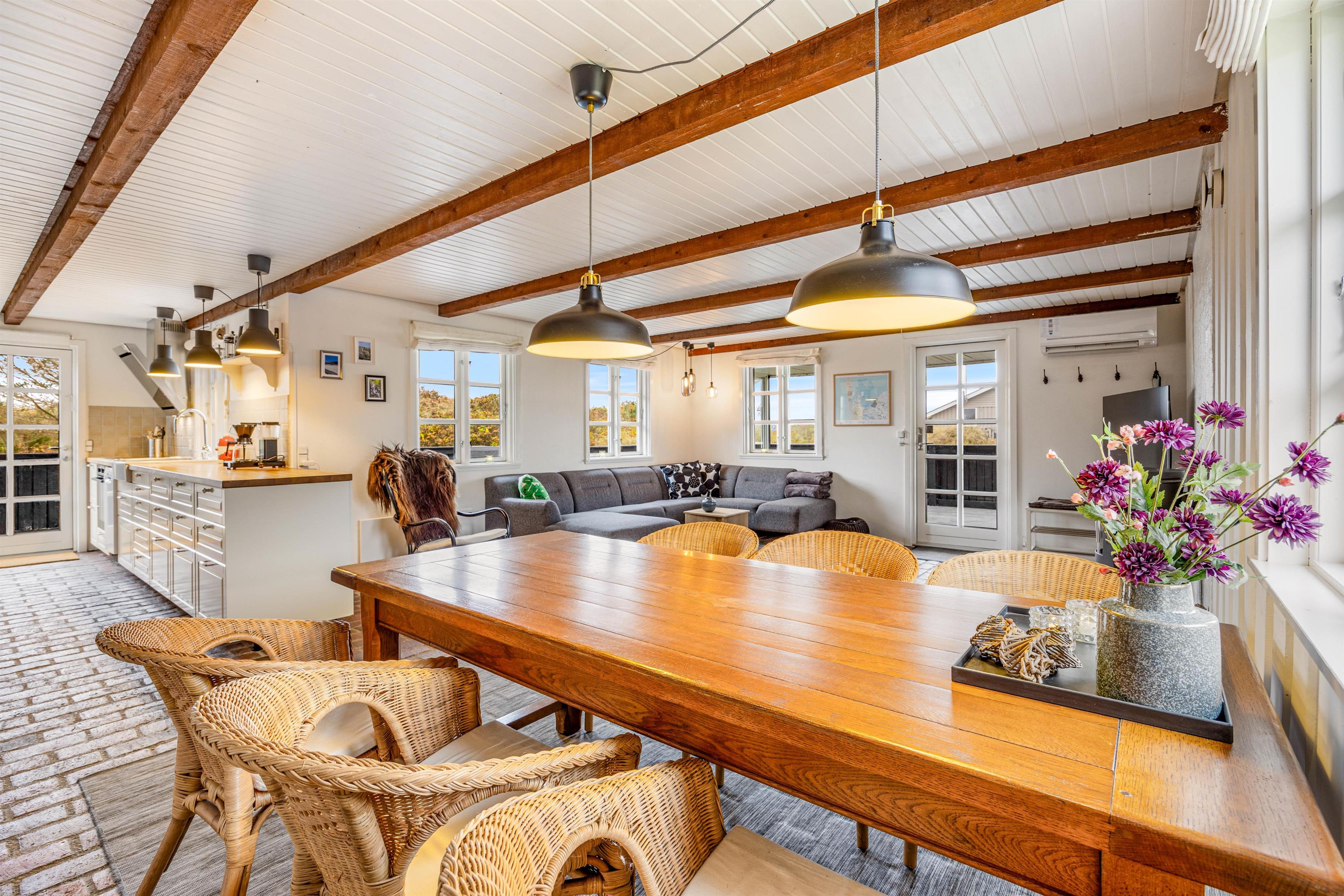 Kun 350 meter skiller jer fra den brede sandstrand, som byder på imponerende naturoplevelser hele året rundt – heriblandt de smukkeste solnedgange. Den lokale købmand i Bjerregård ligger 10 minutters gang fra ferieadressen, og her kan I hver morgen hente nybagte rundstykker til morgenbordet, eller lidt lækkert til en hyggelig aften på sofaen.