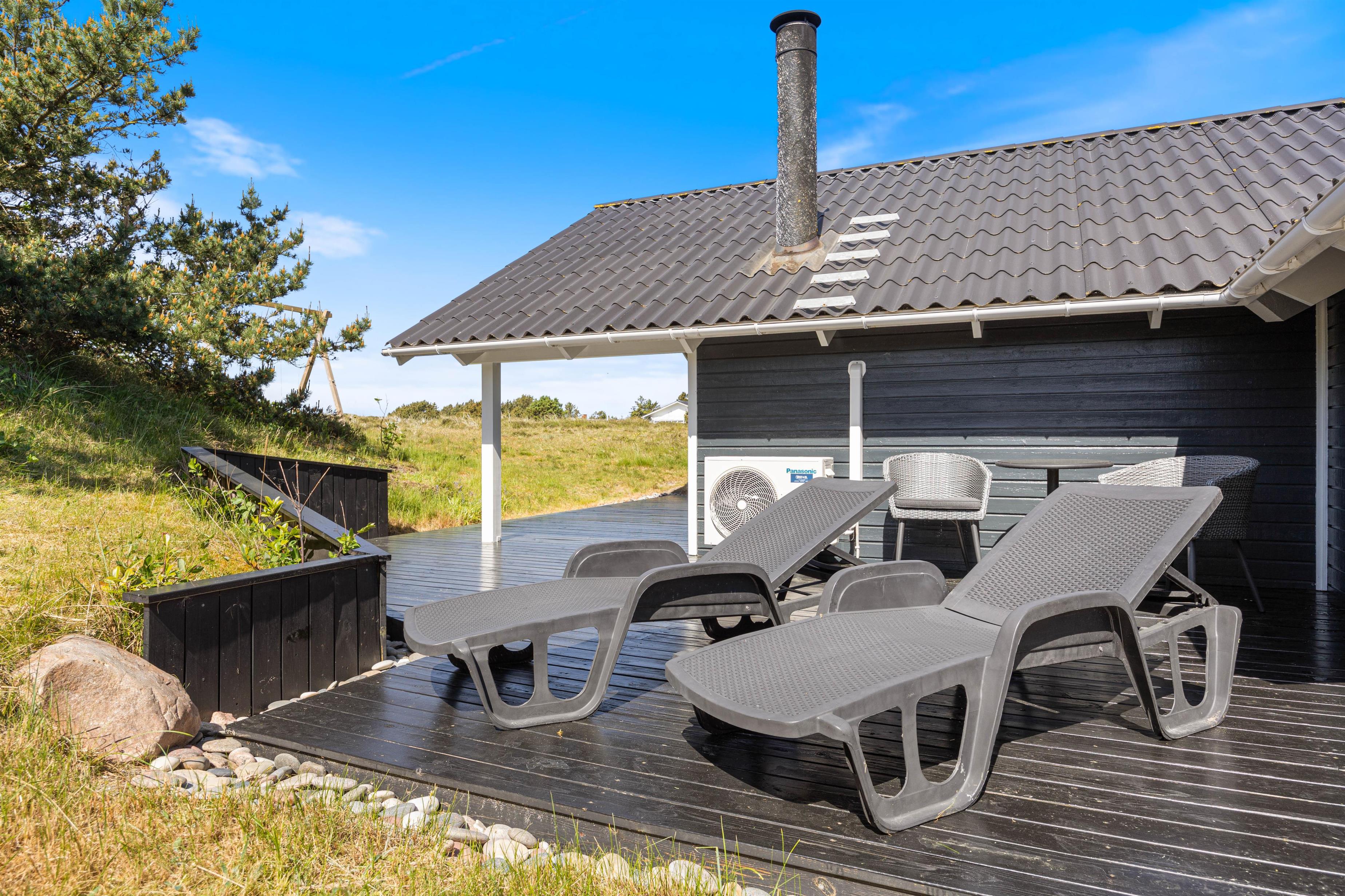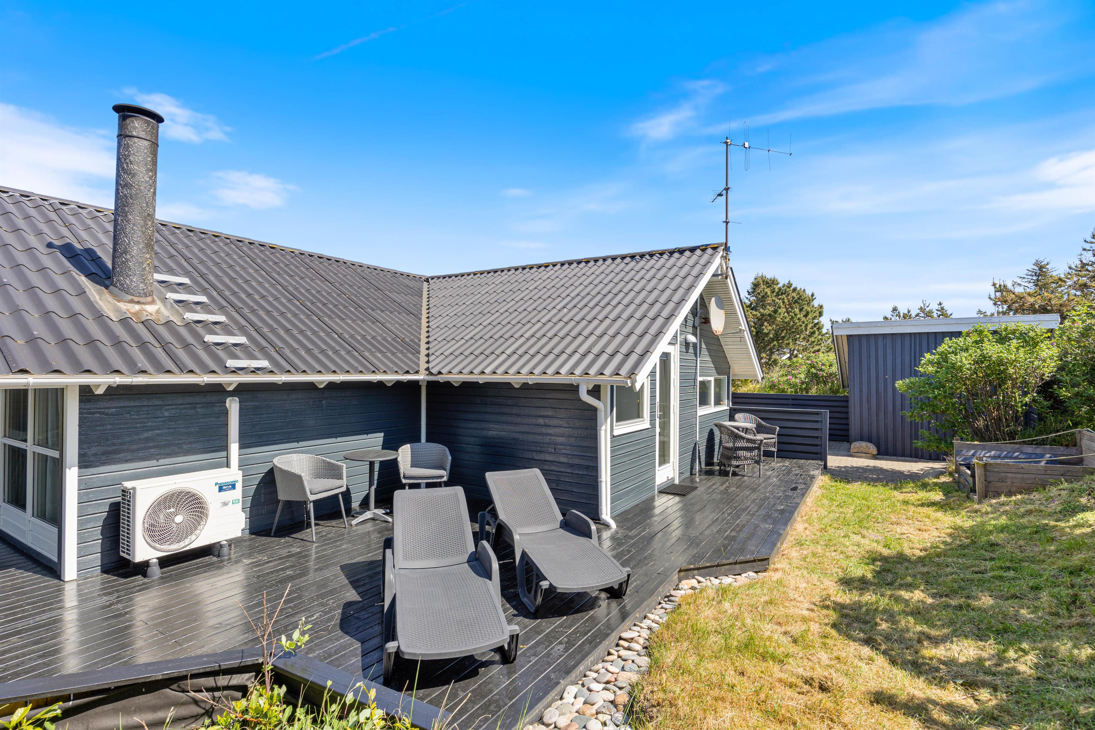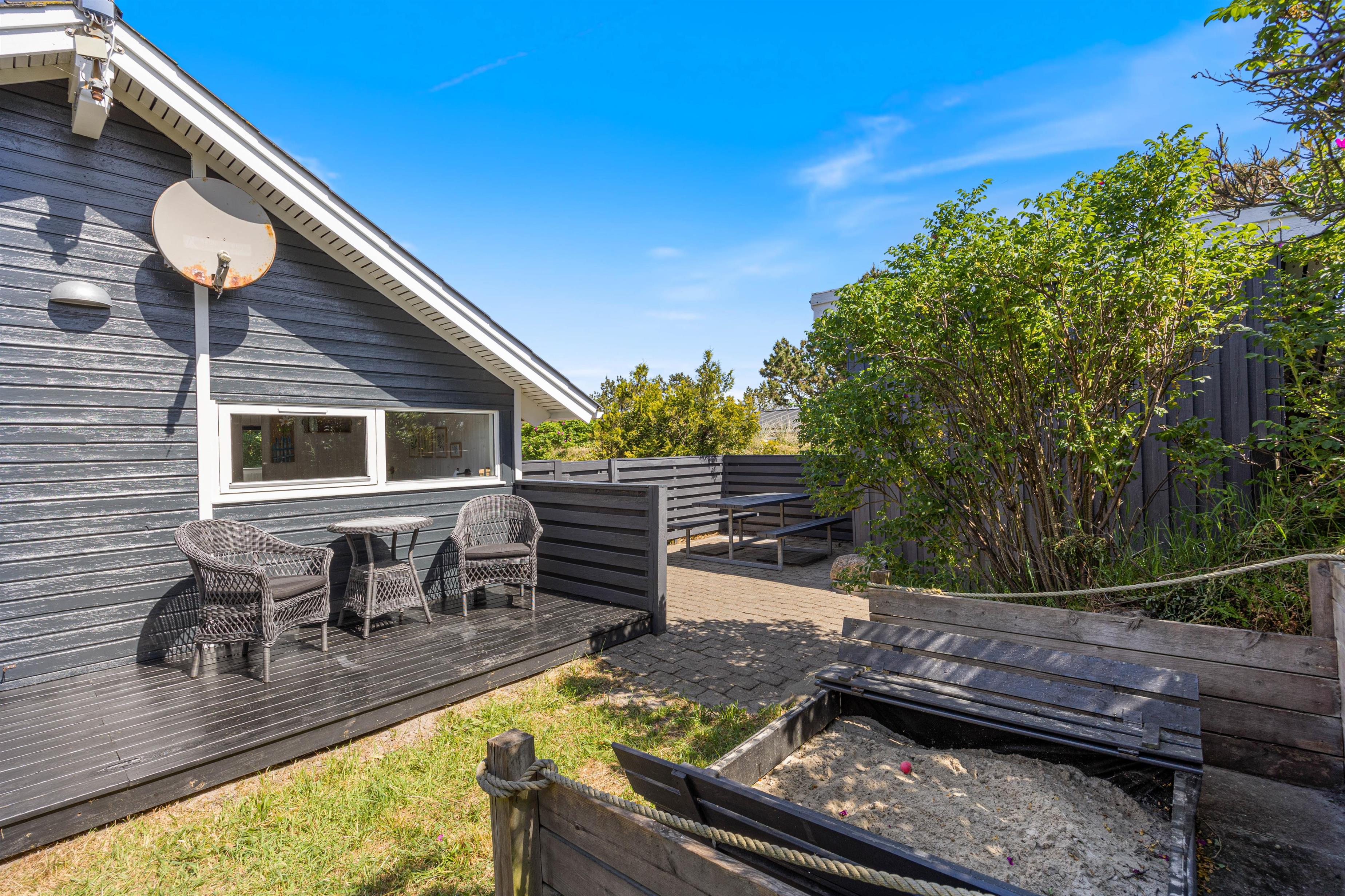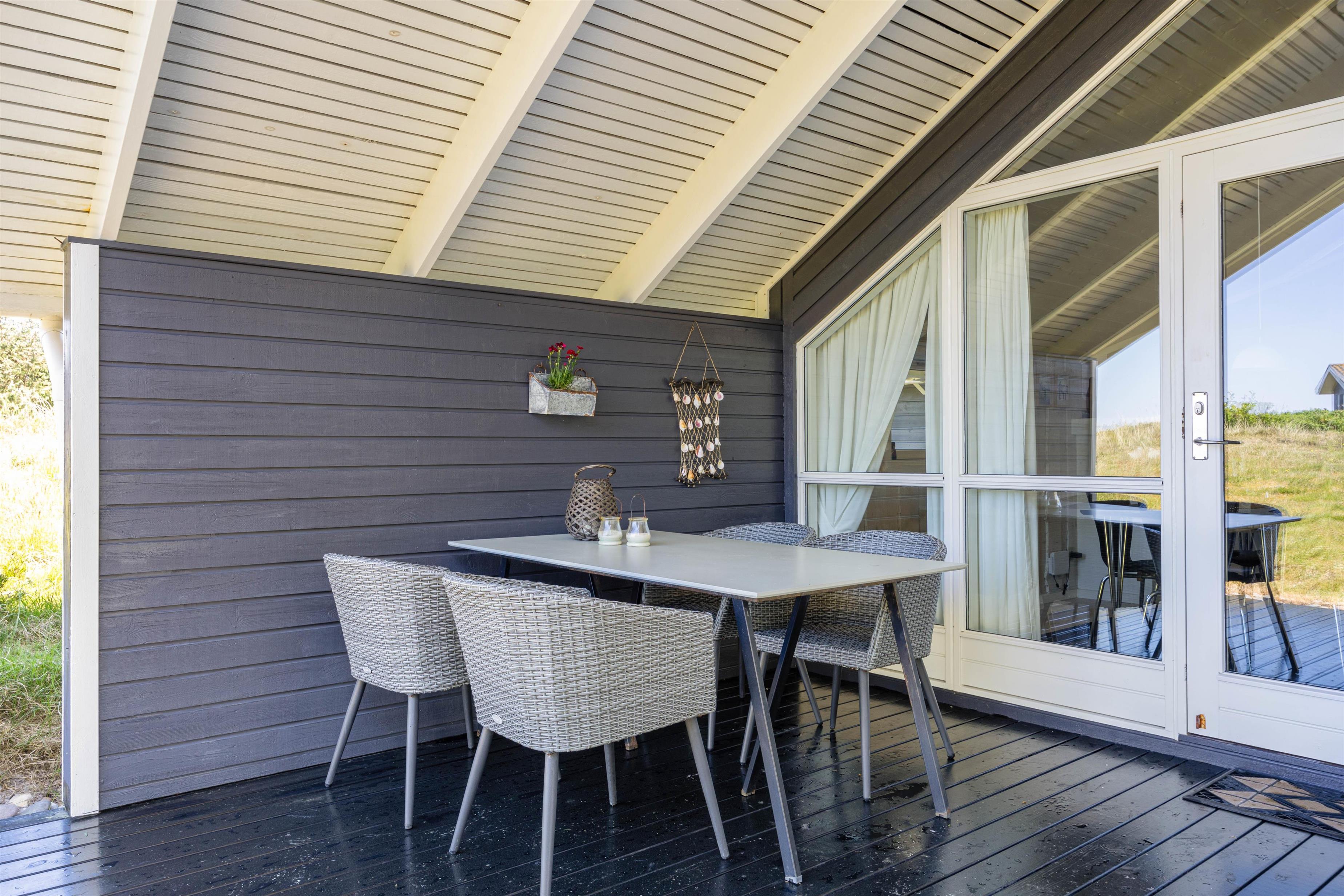 For enden af gavlen er en stor del af træterrassen desuden overdækket, så I har mulighed for at trække ind i skyggen eller blot sidde ud, når vejret er mindre godt i læ. Her er også perfekt at sidde med et glas vin og ét lækkert måltid fra grillen. Efterfølgende kan I evt. gå en aftentur langs den brede sandstrand.