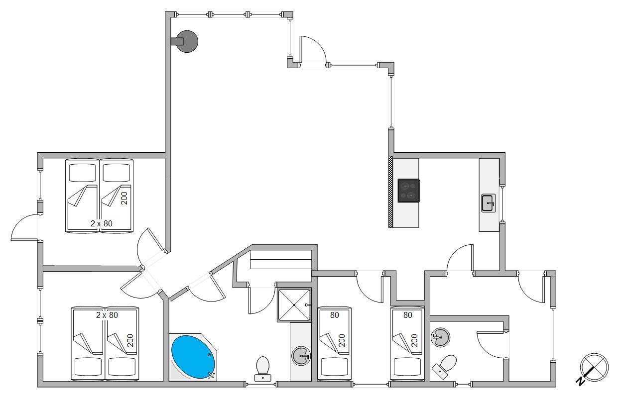 Planløsningen byder bl.a. på tre gode soverum. 1 af værelserne er udstyret med to enkeltsenge, mens de andre to byder på en dobbeltseng. Superpraktisk har feriehuset ét lille fint gæstetoilet samt et stort badeværelse, så I ikke skal stå i kø om morgenen. På det store badeværelse er her lagt op til afslapning med både spa og sauna. Tænd op i saunaen eller start boblerne i spaen – her kan man lade tid og sted forsvinde og få fornyet energi til hverdagen.