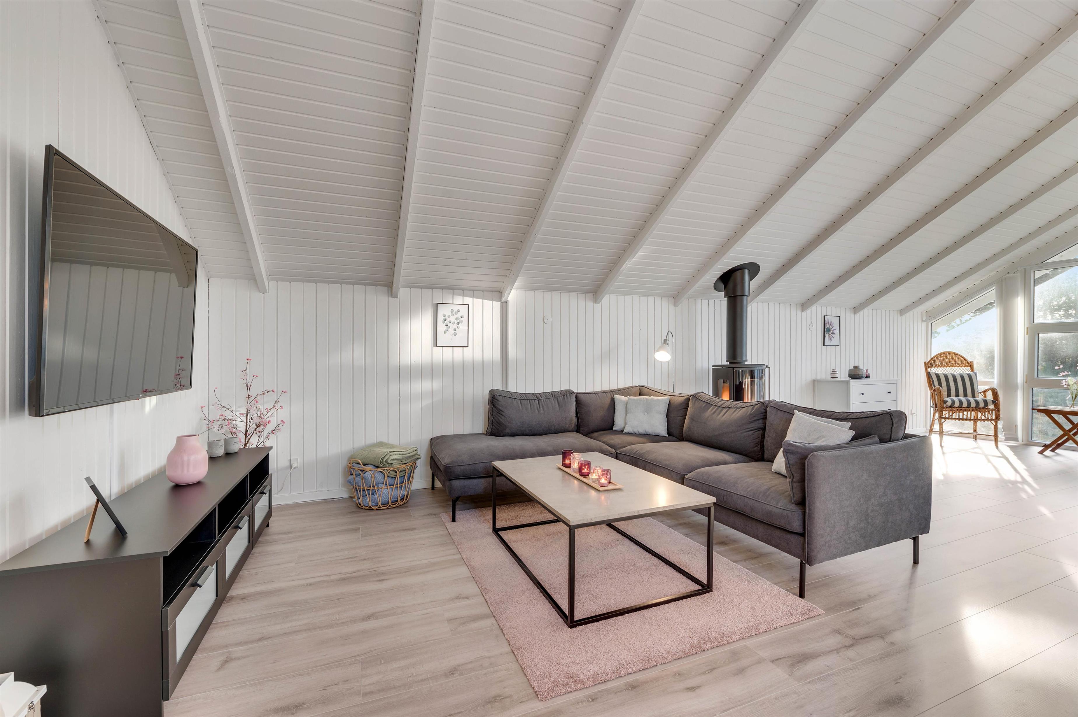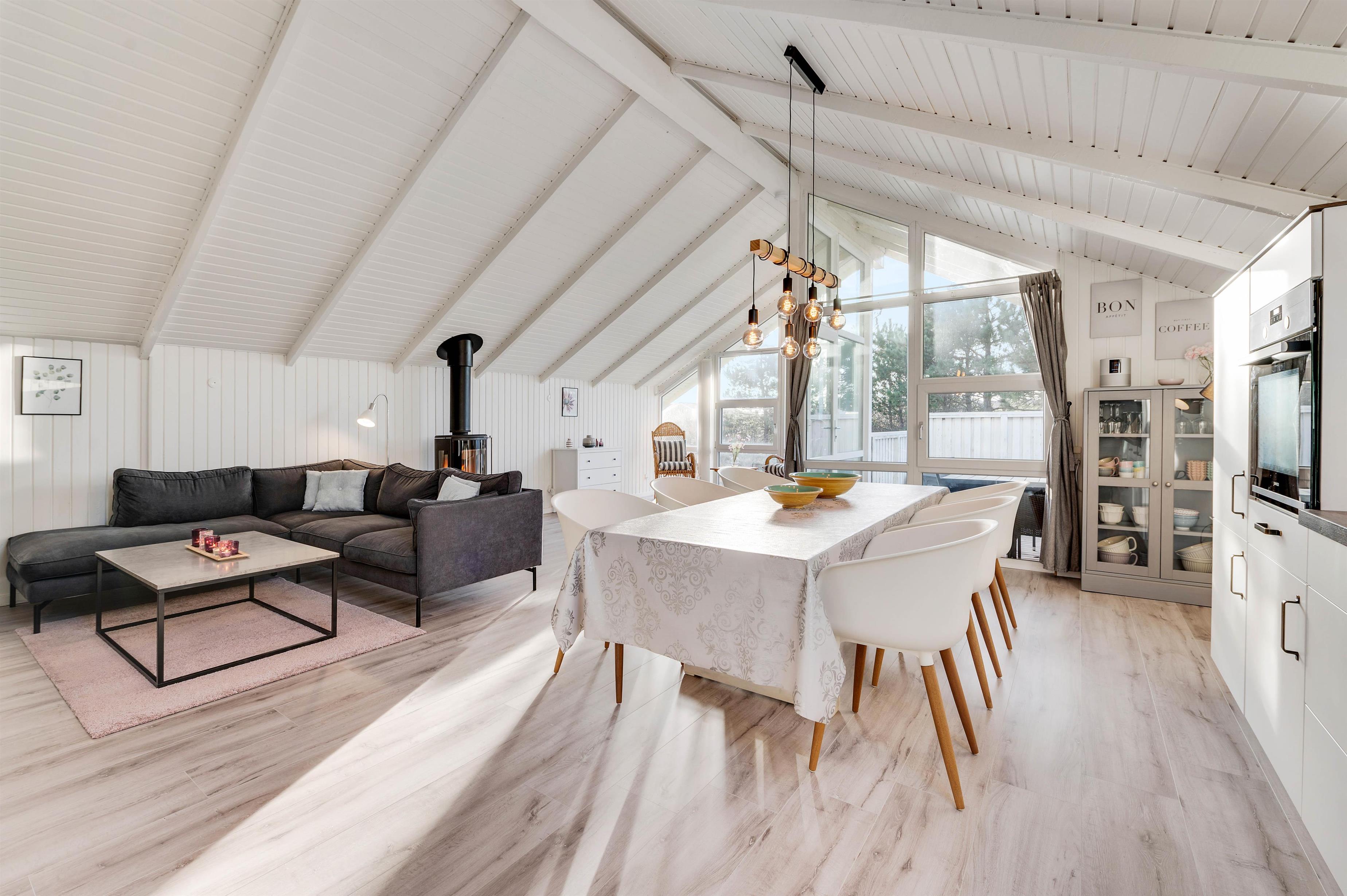 Stuen ligger i åben forbindelse med det veludstyrede køkken, så I sammen kan få mest muligt ud af ferien – også når der skal laves mad. Her er lagt op til hyggeligt samvær, og som prikken over i'et er der en brændeovn. Den spreder ikke blot varme, men også ekstra feriestemning.