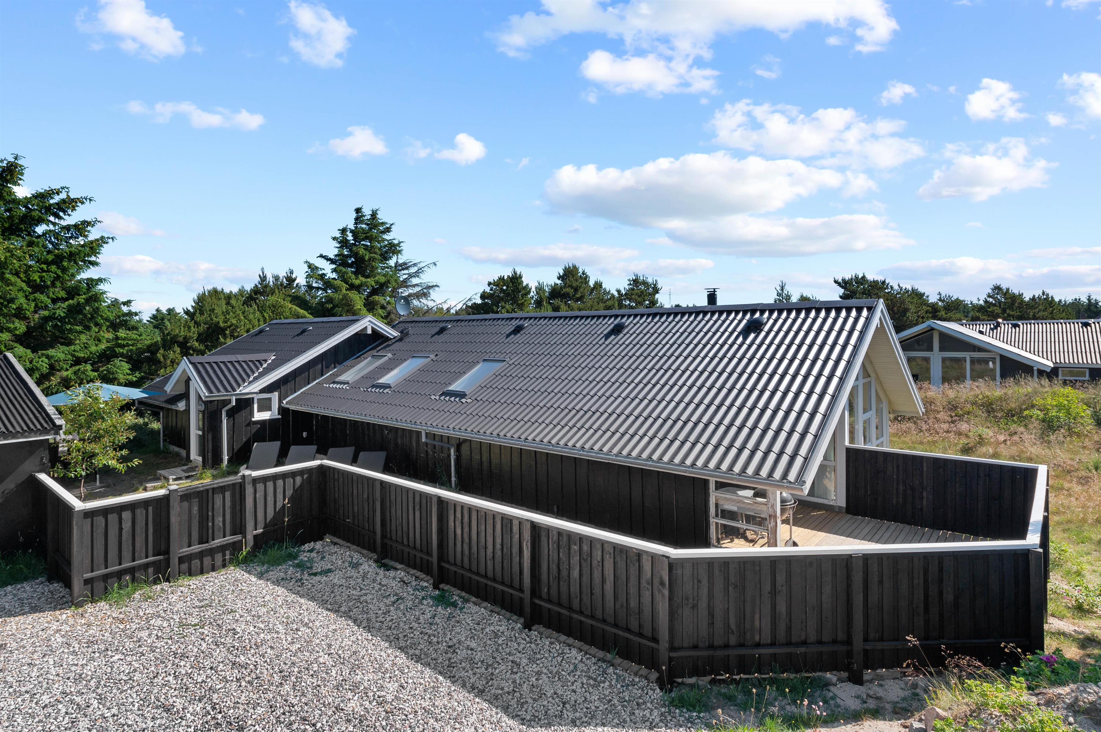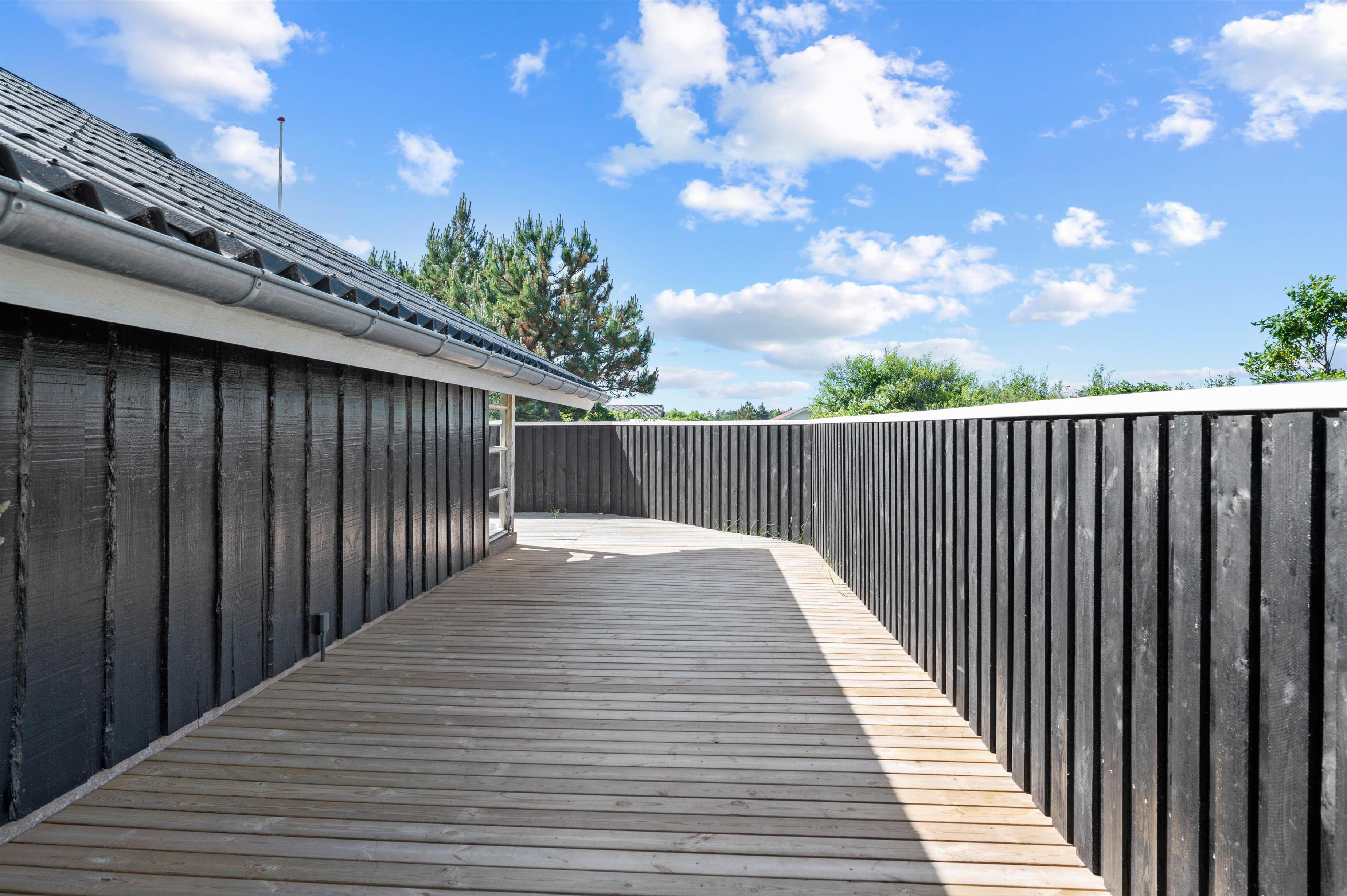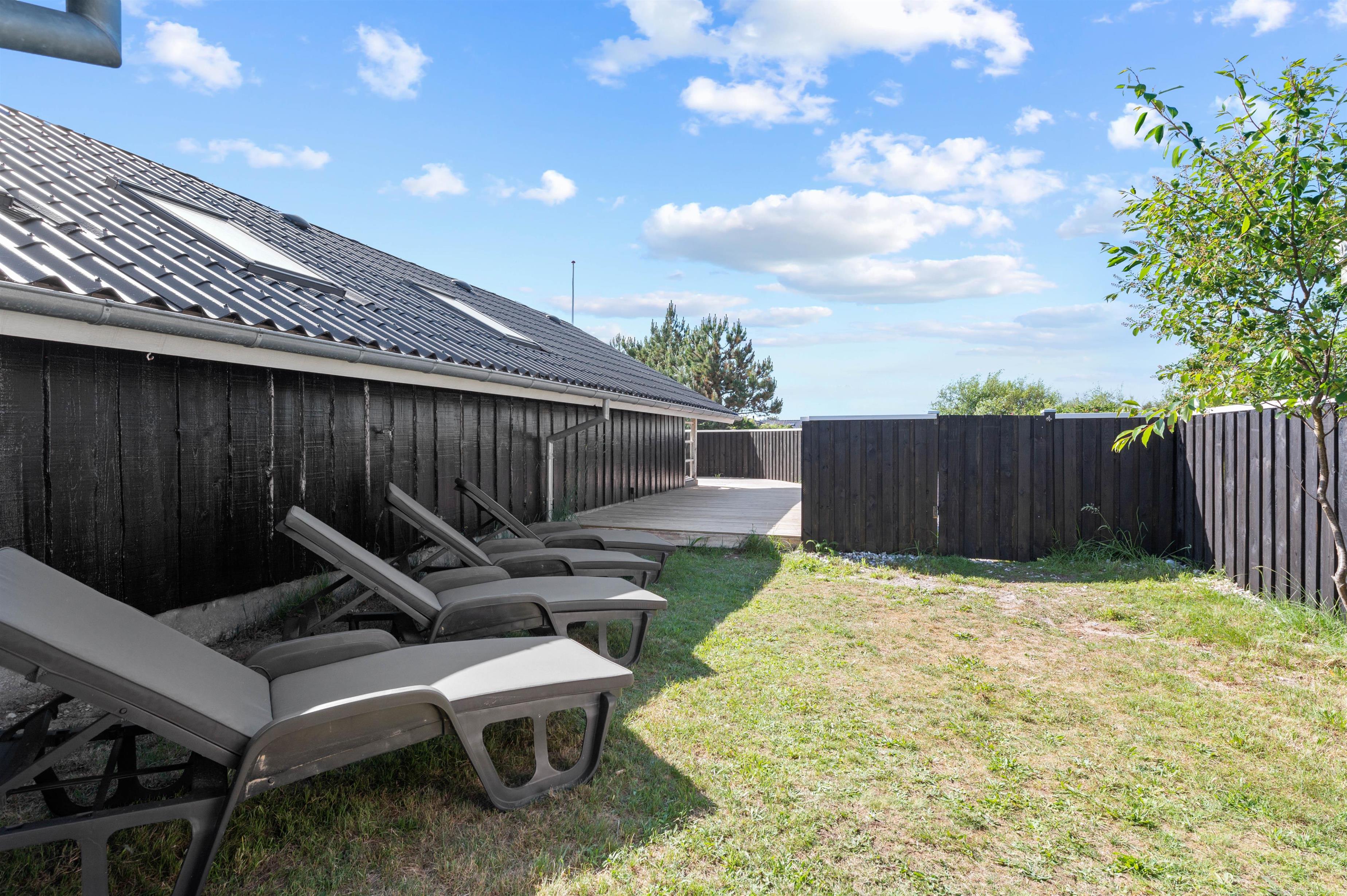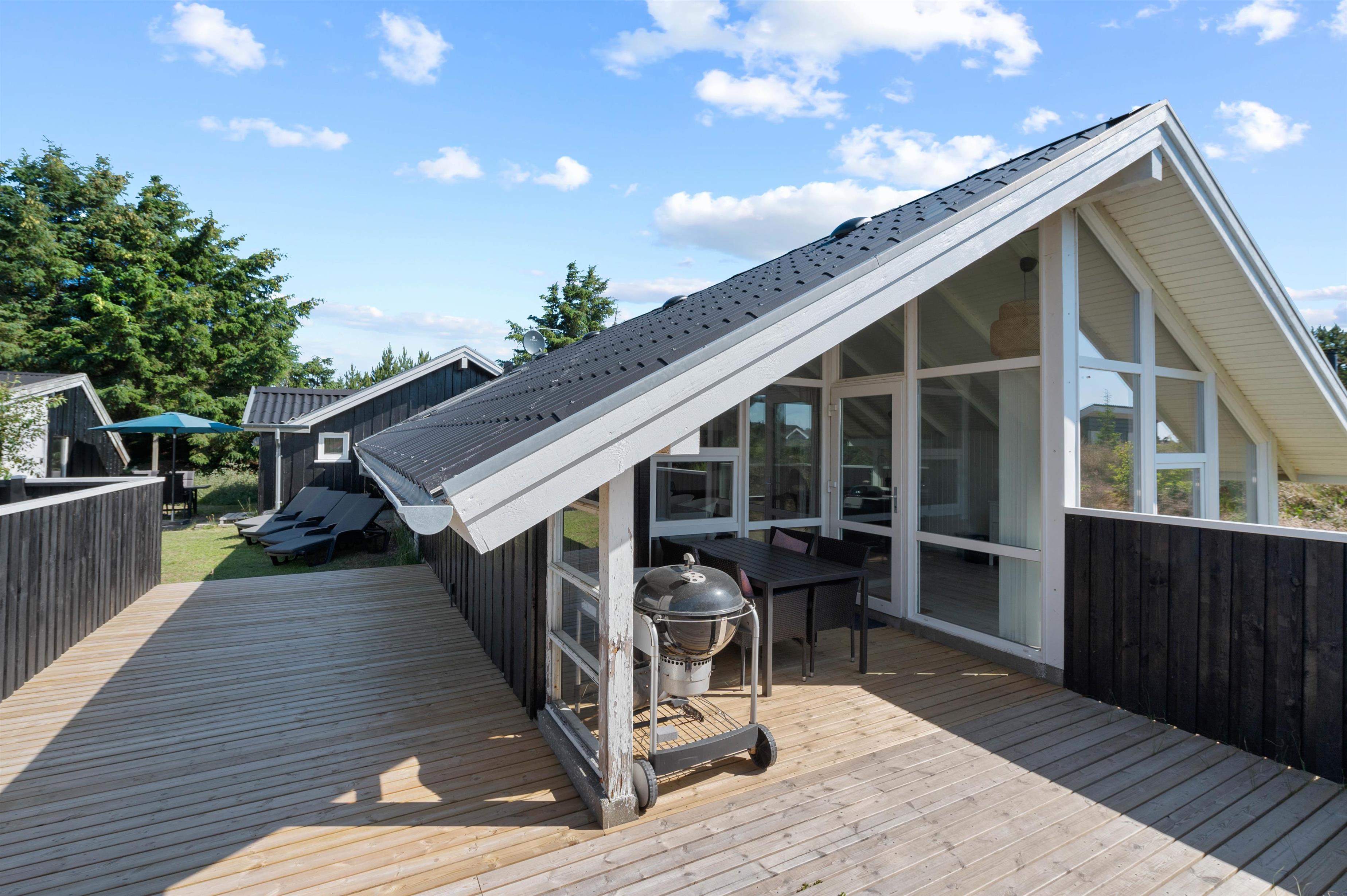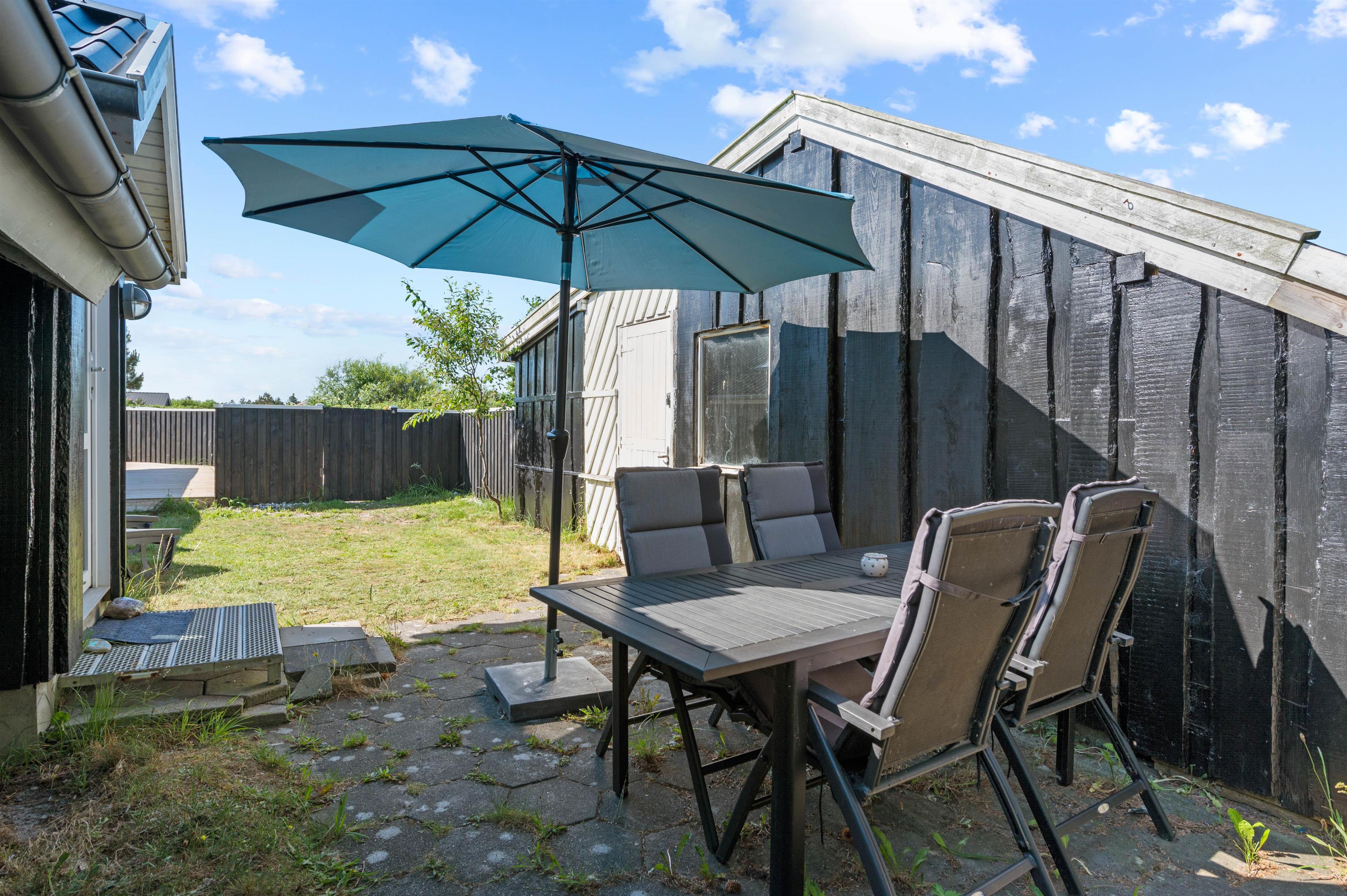 Den afskærmede terrasse er det perfekte sted at nyde solen, den friske havluft og et lækkert grillmåltid. Terrassen er desuden delvist overdækket, så I kan sidde i ly for en lille regnbyge på en ellers lun sommeraften. Terrassen er sydvendt, men den strækker sig til vestsiden af sommerhuset, hvor I har mulighed for at nyde den sidste aftensol, inden sengen kalder.