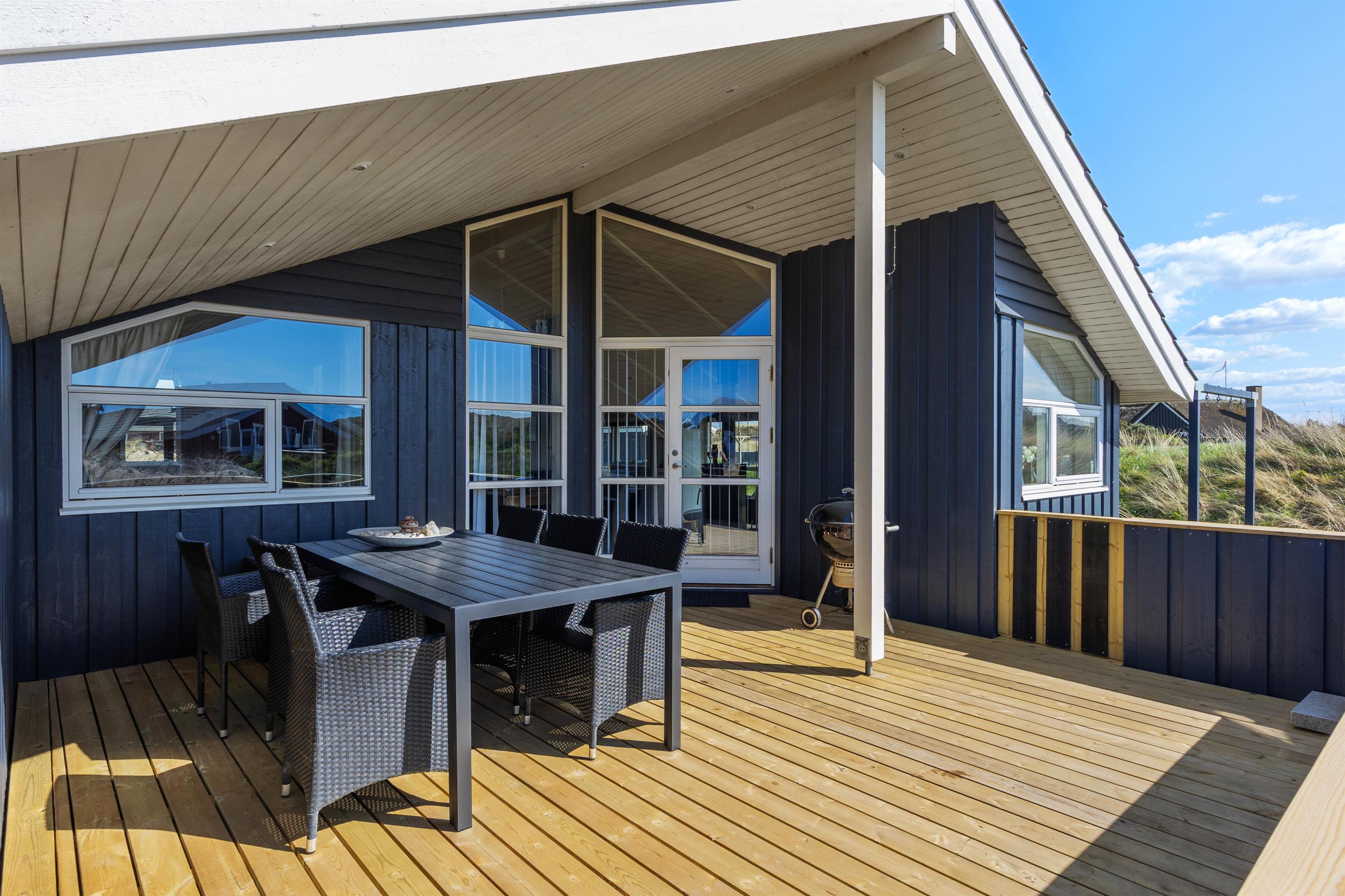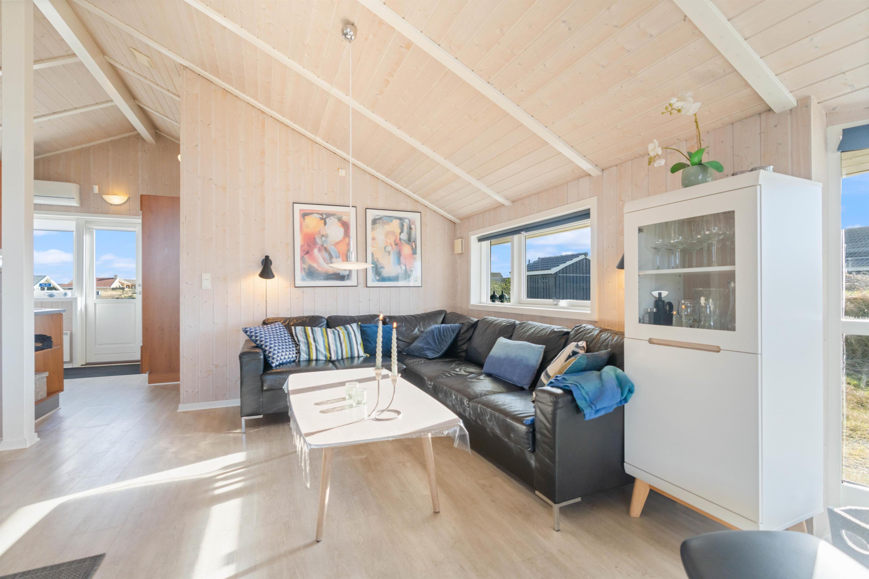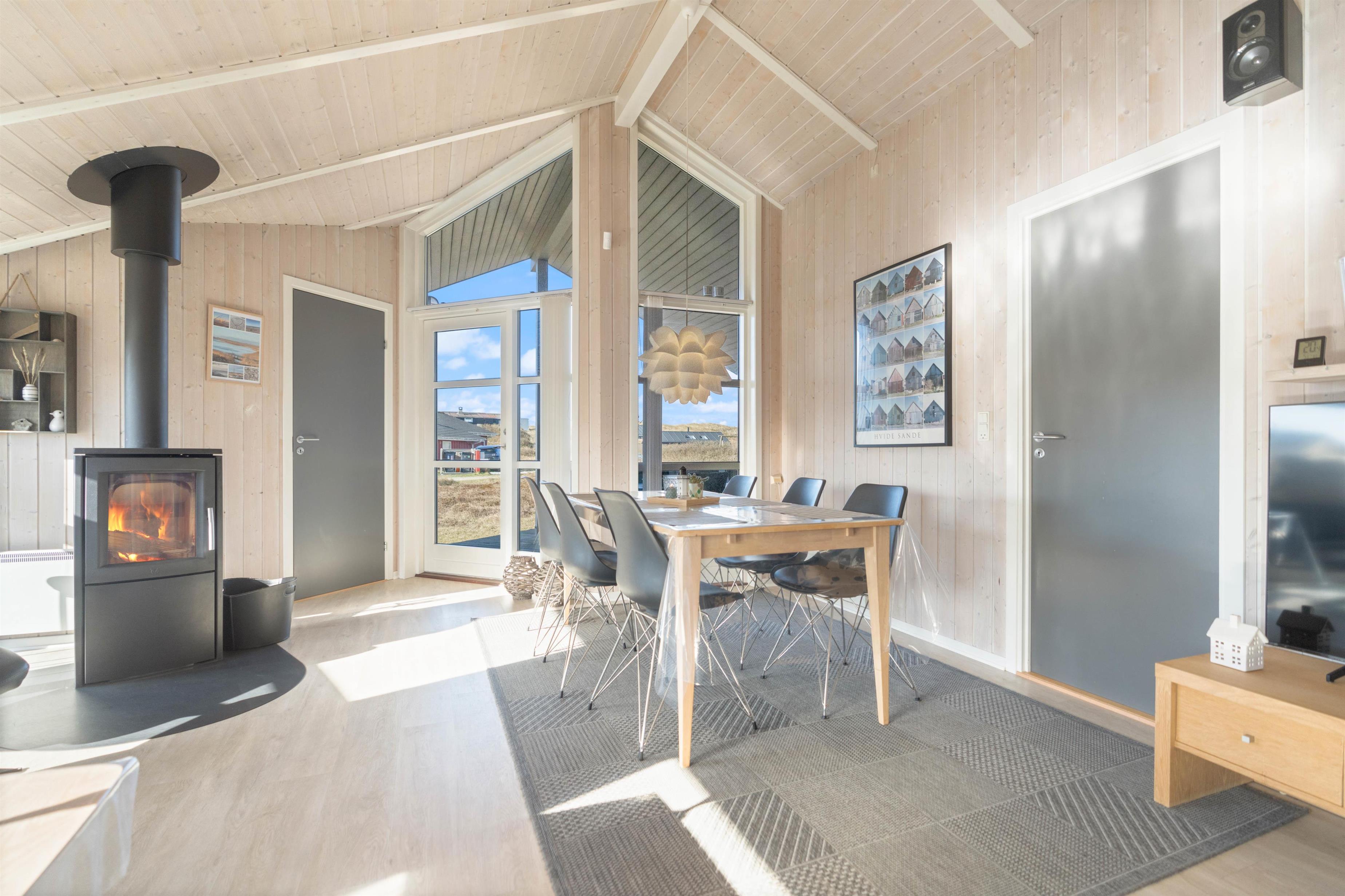 På de kølige dage kan I endda betragte den smukke natur inde fra sofaen gennem de store vinduespartier i stuen – og de knitrende flammer fra brændeovnen kan fylde rummet med varme og hyggelig stemning, mens vinden suser forbi udenfor.