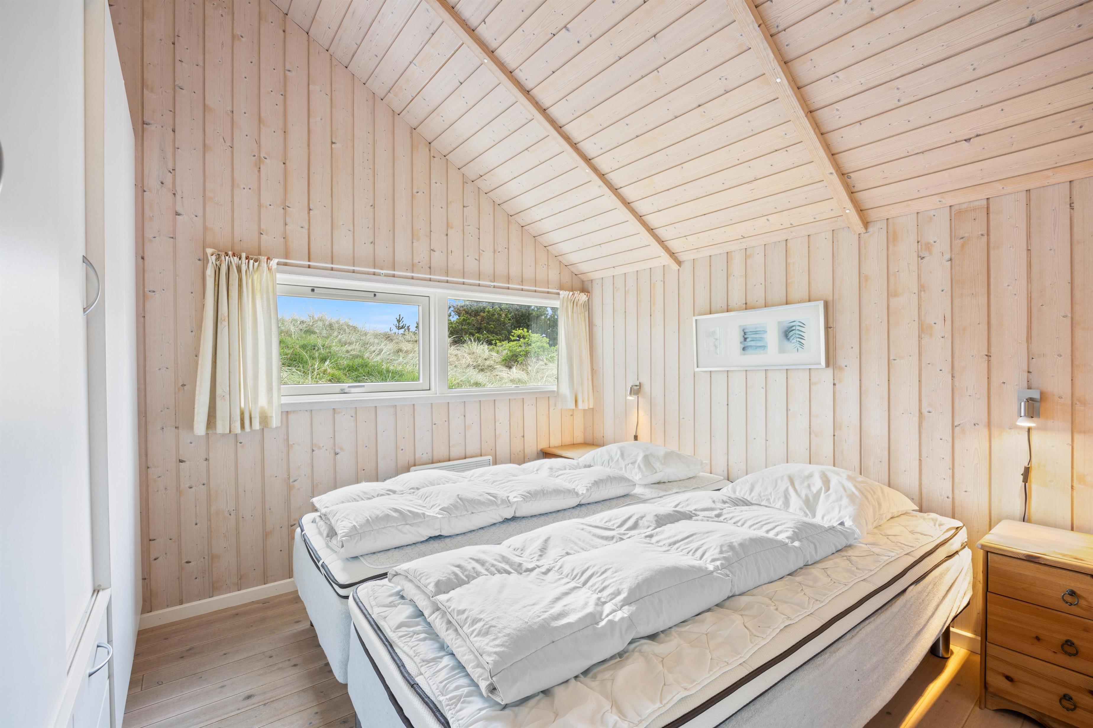 Sommerhusets 7 sovepladser er fordelt på 3 værelser. Det første værelse er indrettet med en komfortabel dobbeltseng, det andet soveværelse også en dobbeltseng, mens det tredje soveværelse er perfekt til børnene med en enkeltseng og en fin køjeseng.