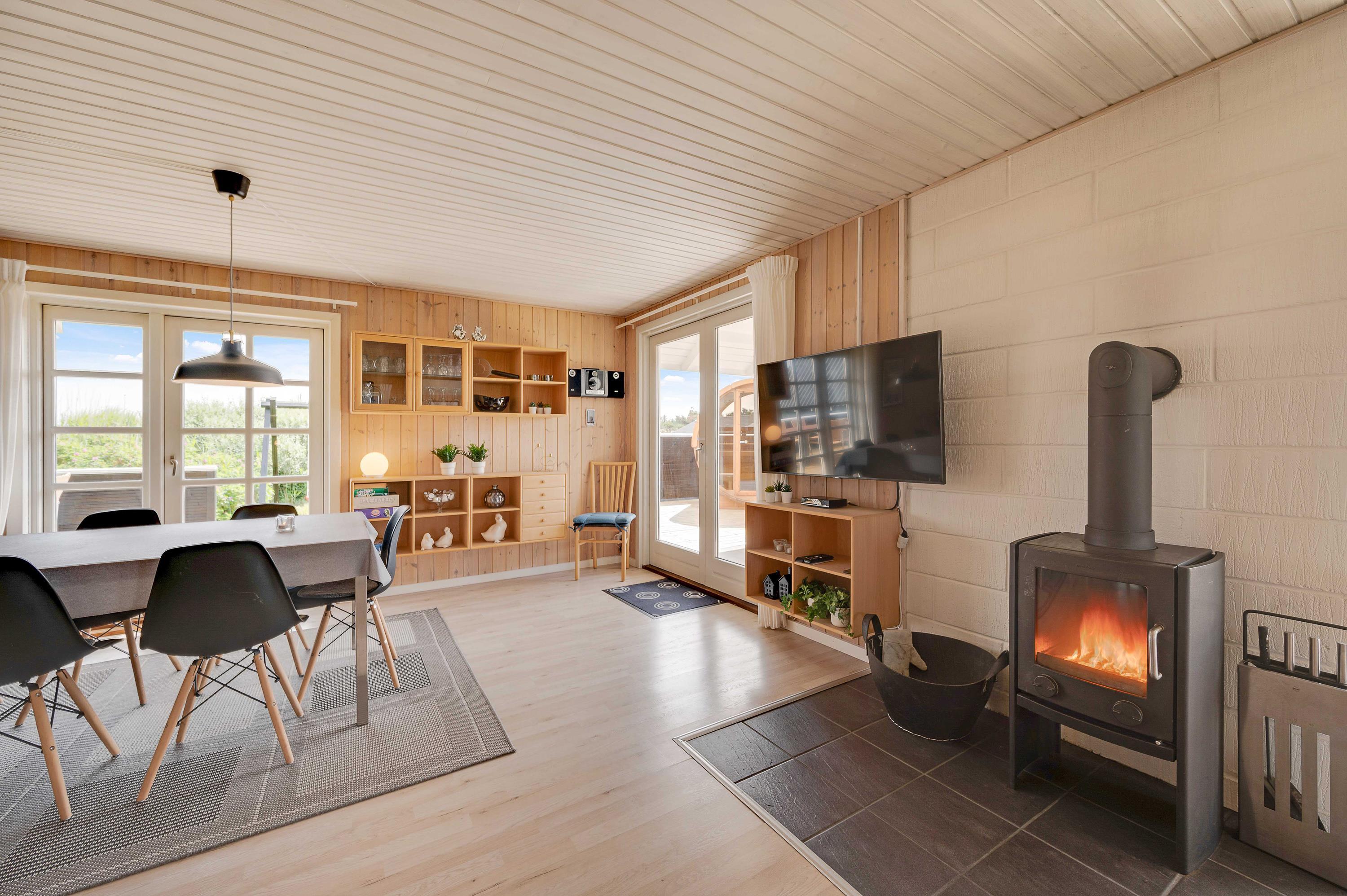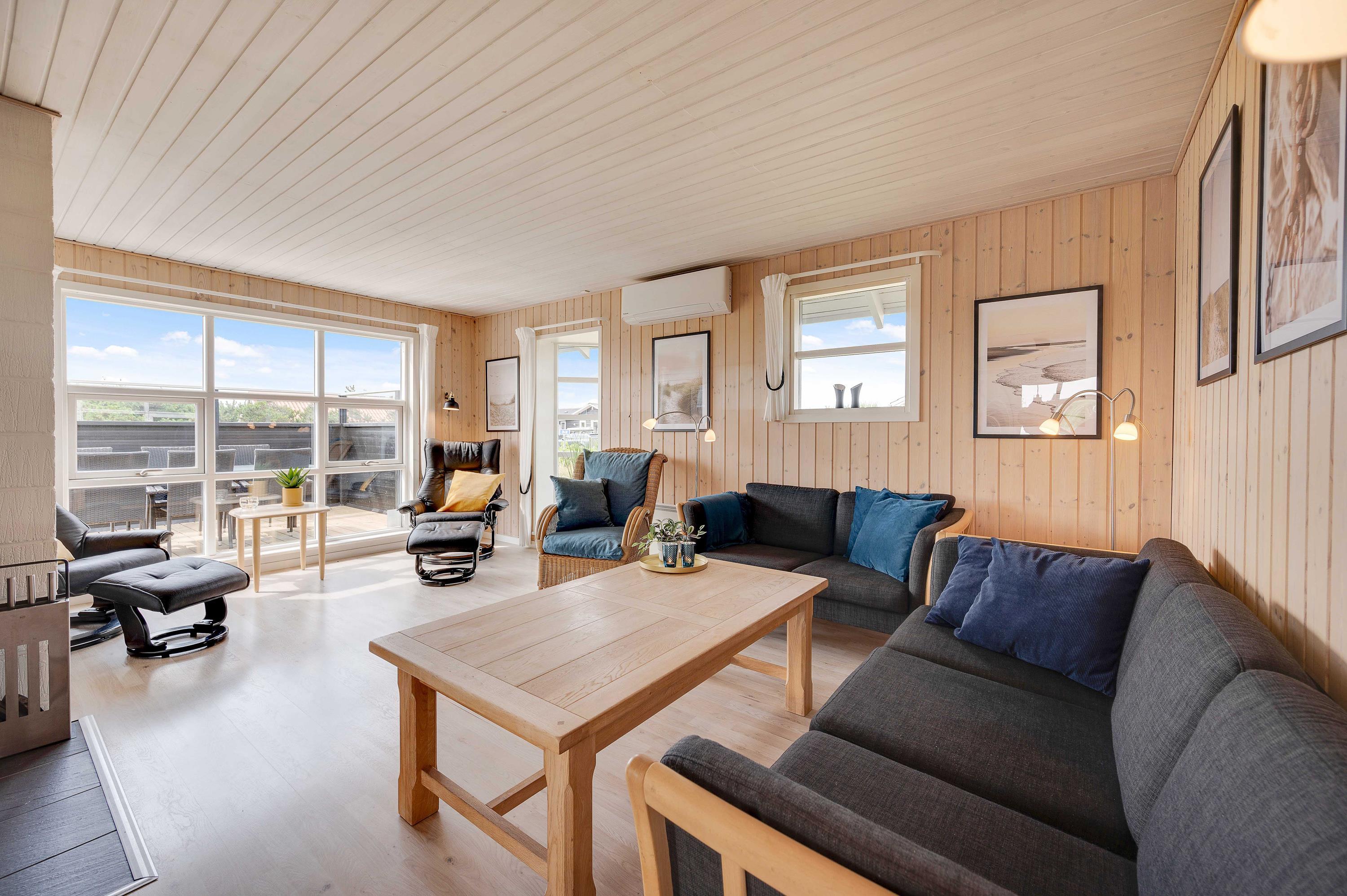I det hyggelige og moderne indrettet sommerhus venter jer et rummeligt og indbydende opholdsrum, hvor et stort vinduesparti skaber et fantastisk lysindfald.