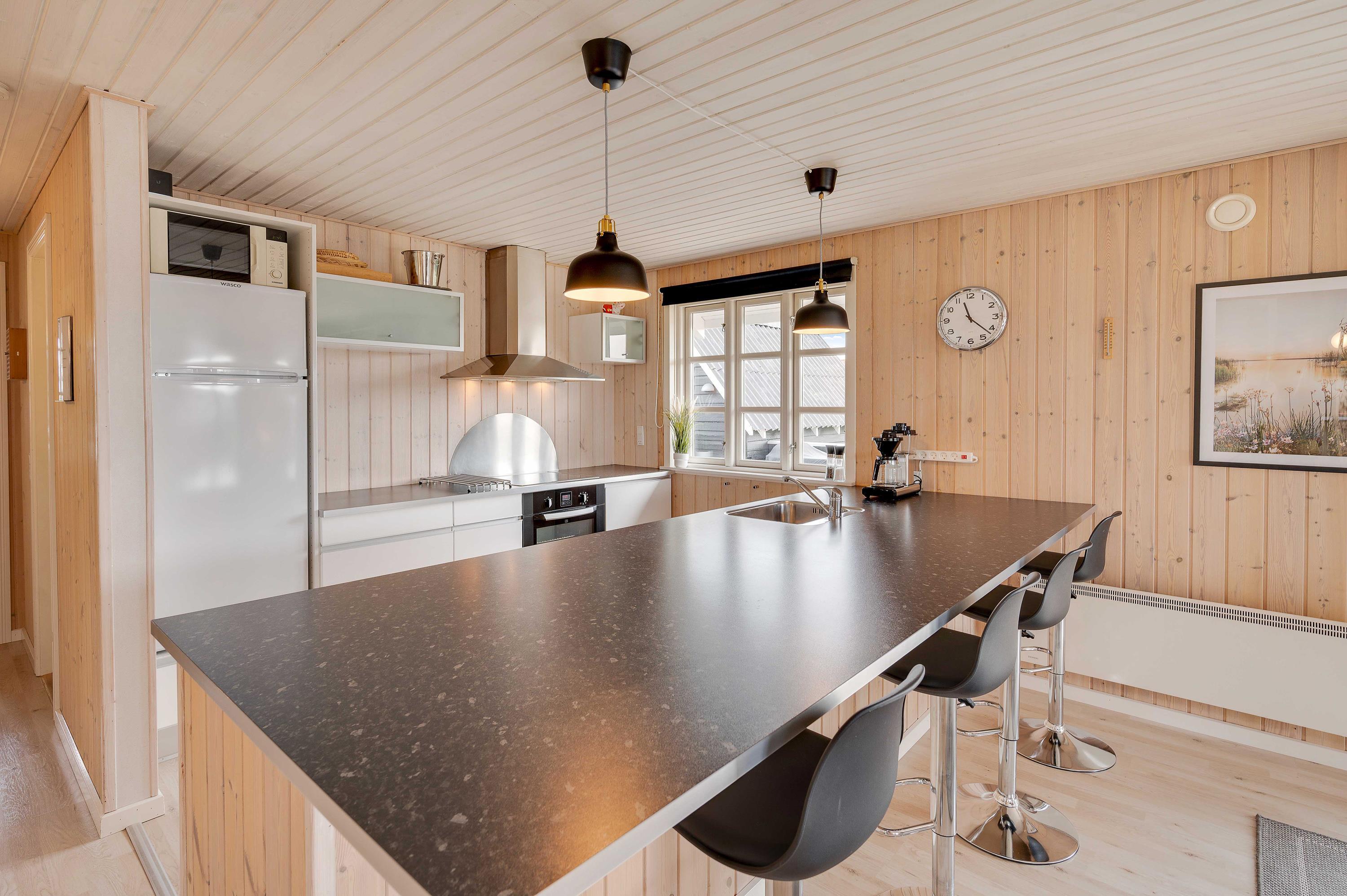 Stuen ligger i åben forbindelse med køkkenet, så familien kan være samlet mest muligt under ferien – også når der skal laves mad. Køkkenet er veludstyret og i redskabsrummet finder I en ekstra fryser.