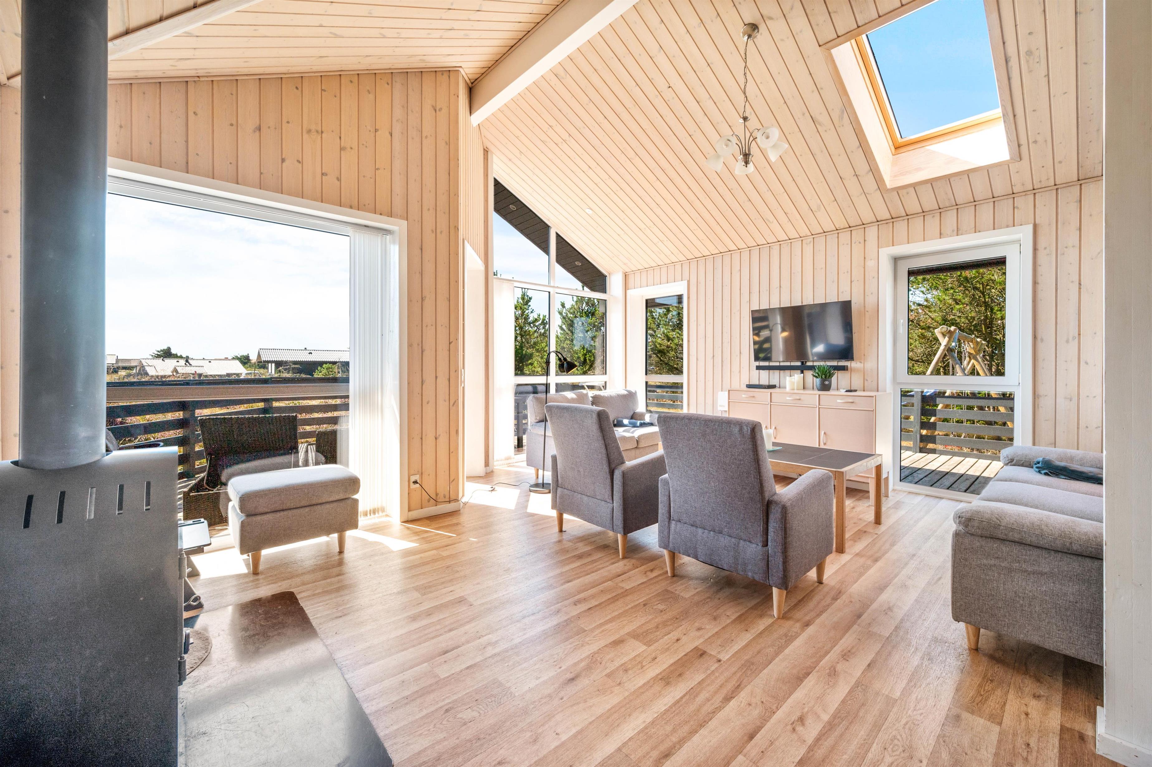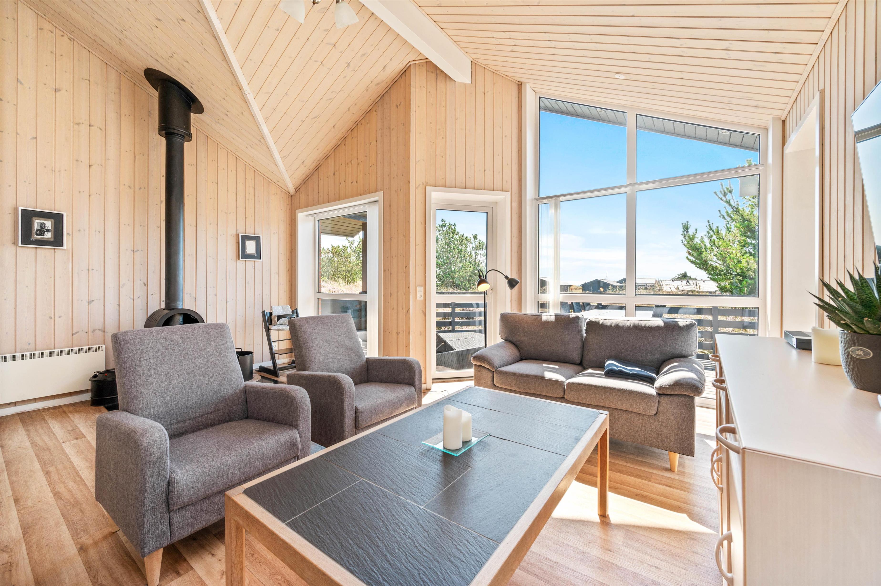 Den hyggelige opholdsstue indbyder til mange gode stunder med hele familien. Her kan I samles i sofaerne, mens brændeovnen spreder varme og sætter prikken over i'et til den helt rigtige feriestemning. Sommerhuset har desuden en energibesparende varmepumpe, som I med fordel kan benytte jer af til at holde en behagelig temperatur i rummet.