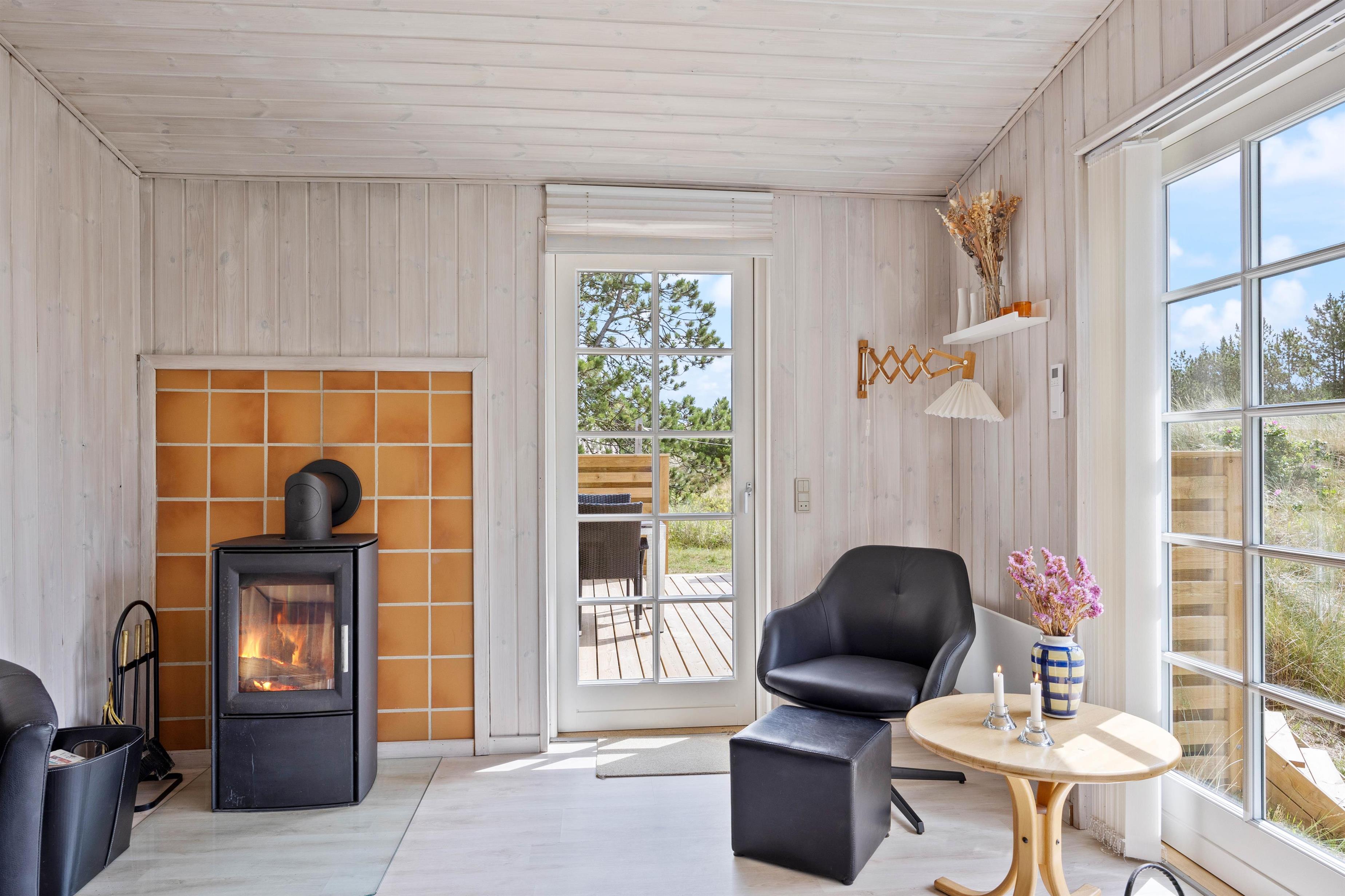 Vinduerne fra gulv til loft skaber et naturligt lysindfald og den centralt placerede brændeovn giver en behagelig varme og lader jer virkelig slappe af til træets knitren.