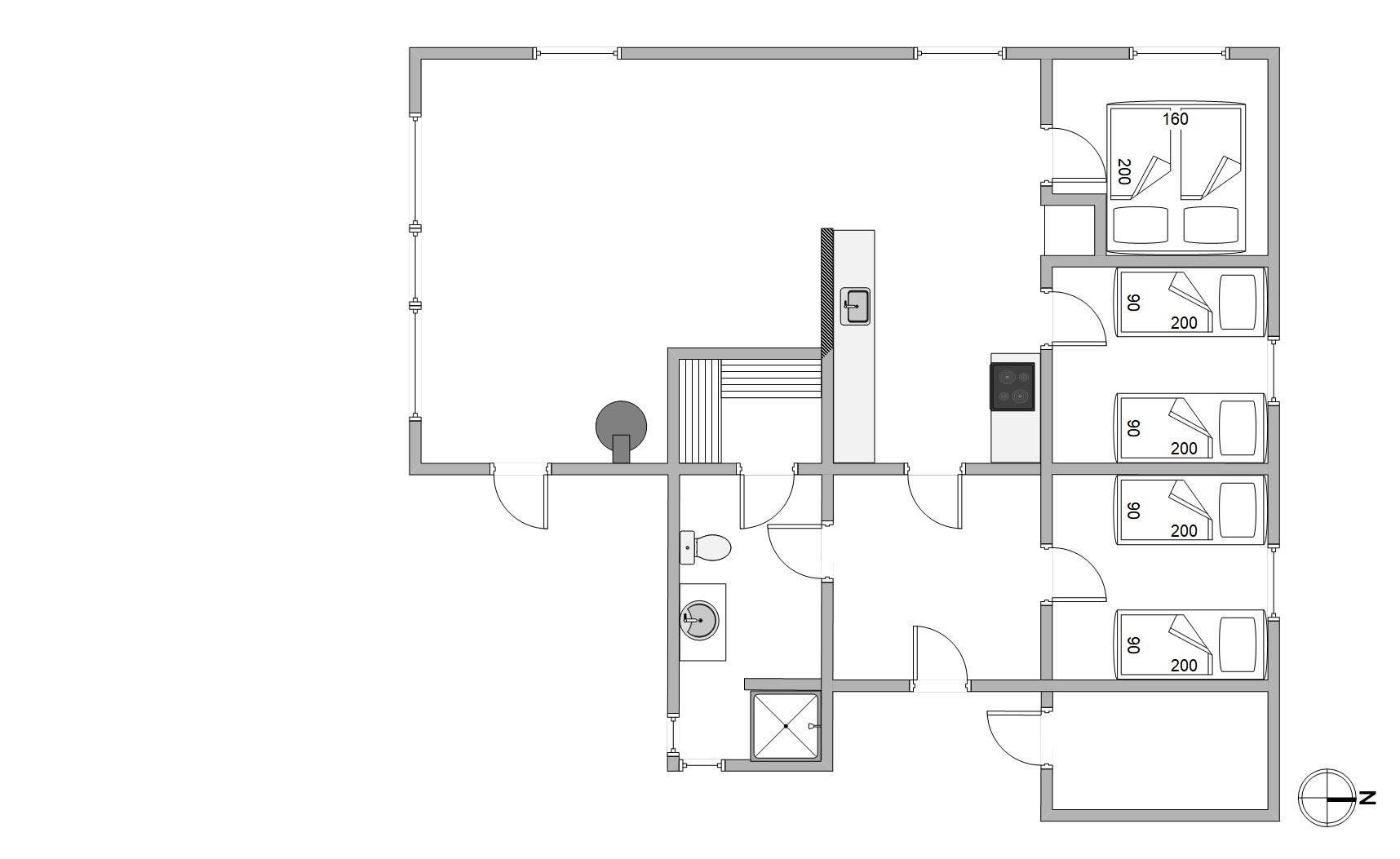 Det åbne alrum med køkken, spiseplads og stue byder på rigelig plads til mange timer sammen med familien. Mens feriekokken tilbereder børnenes yndlingsretter, kan de lege ved spisebordet, og det store opholdsområde indbyder til hyggelige filmaftener med hele familien efter en begivenhedsrig feriedag.