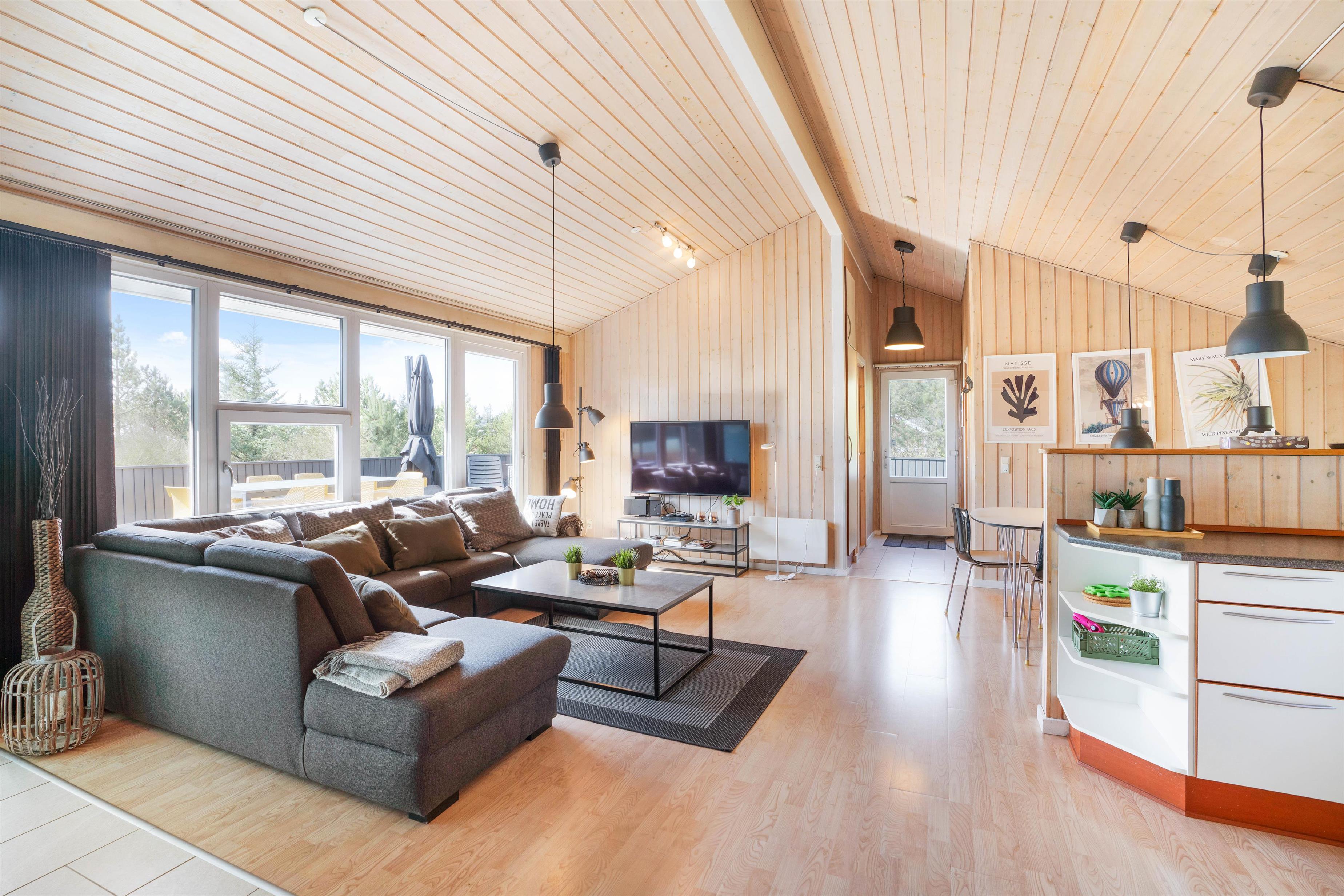 Den store vinduesfront, de høje lofter og trægulvet i stuen skaber en lys og indbydende atmosfære, som gør opholdet ekstra behageligt.
