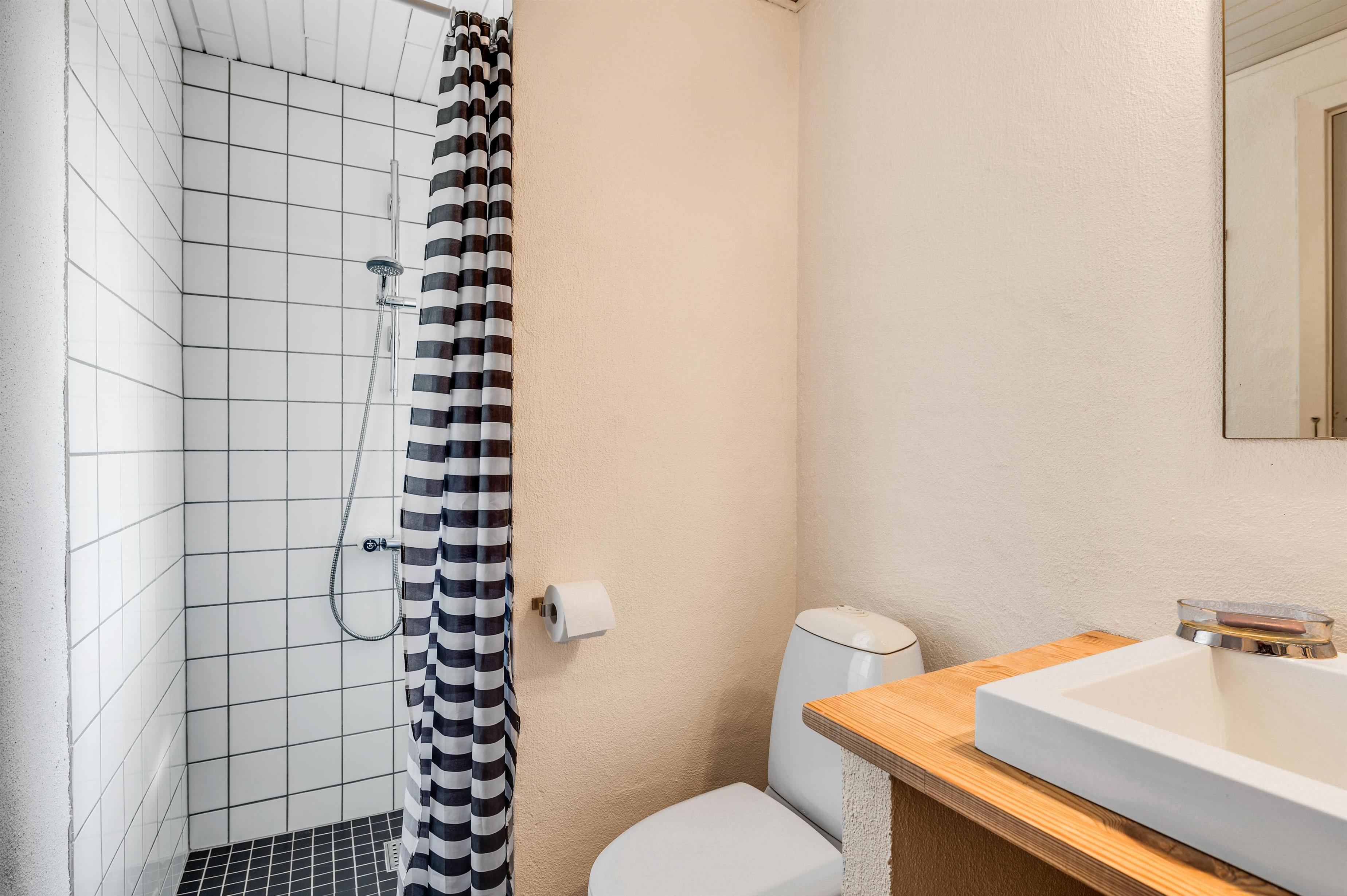 Badeværelset er indrettet i samme smukke stil som resten af feriehuset. Autentisk og fyldt med ro for krop og sjæl. Desuden er der både vaskemaskine samt tørretumbler i sommerhuset.