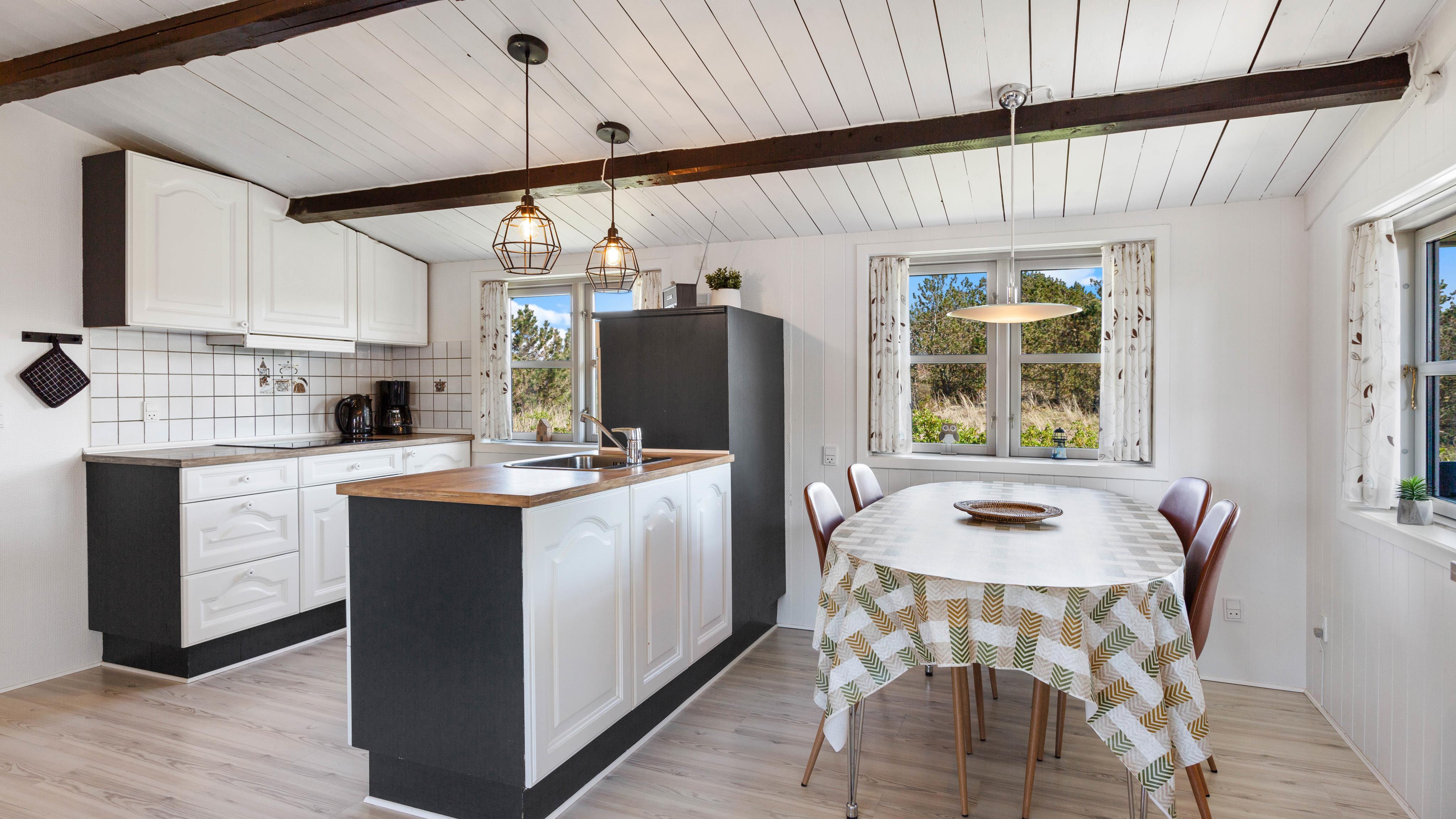 Sommerhuset er opført i klassisk sommerhusstil med træbeklædt facade og fritlagte loftsbjælker. Feriehuset er indrettet med komfortable møbler og i rolige farver – og her er god plads til jeres lille familie. Sommerhusets leverum, stue og køkken i åben forbindelse, gør det nemt at være sammen, selvom børnene spiller i stuen og du laver mad i det funktionelle køkken.