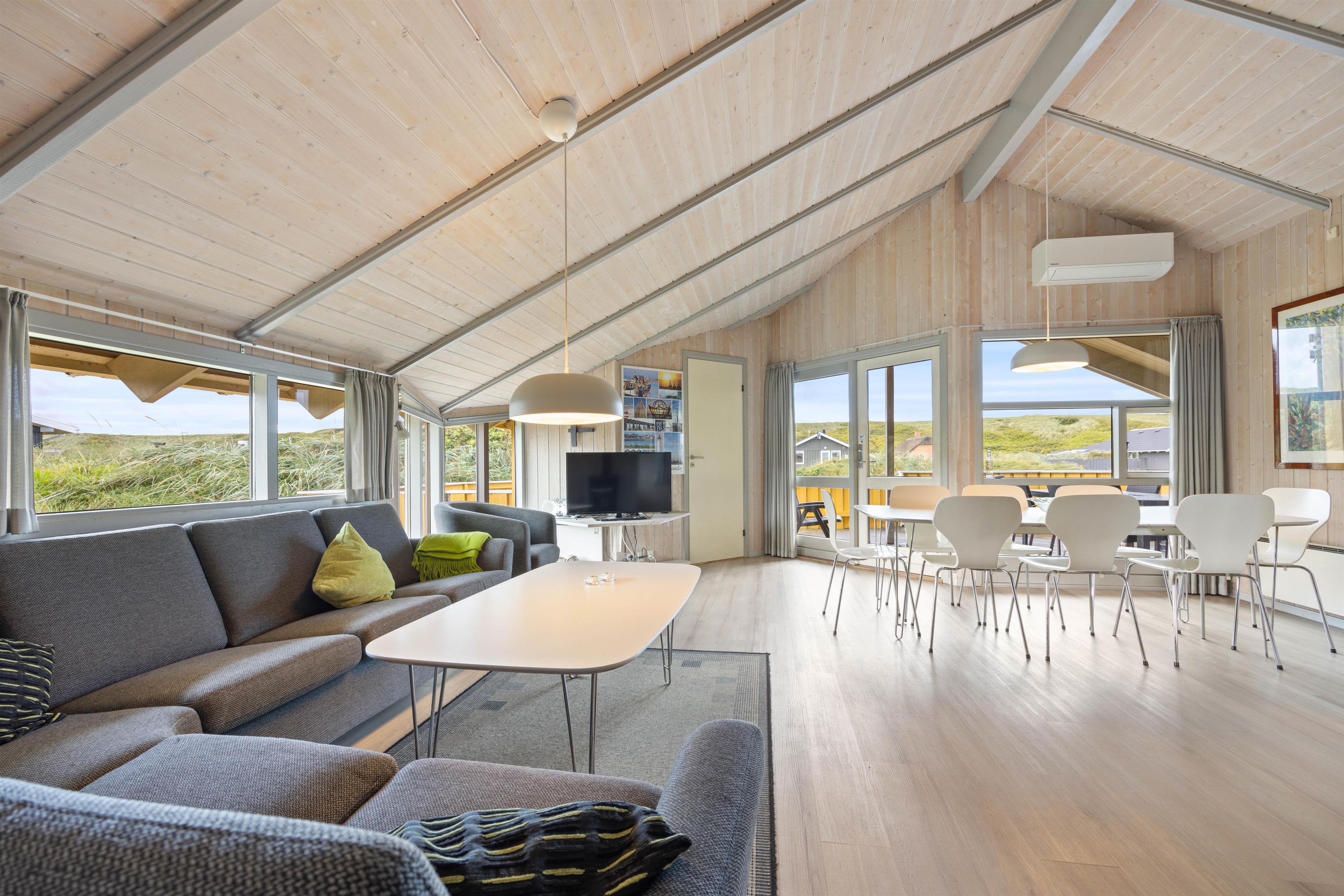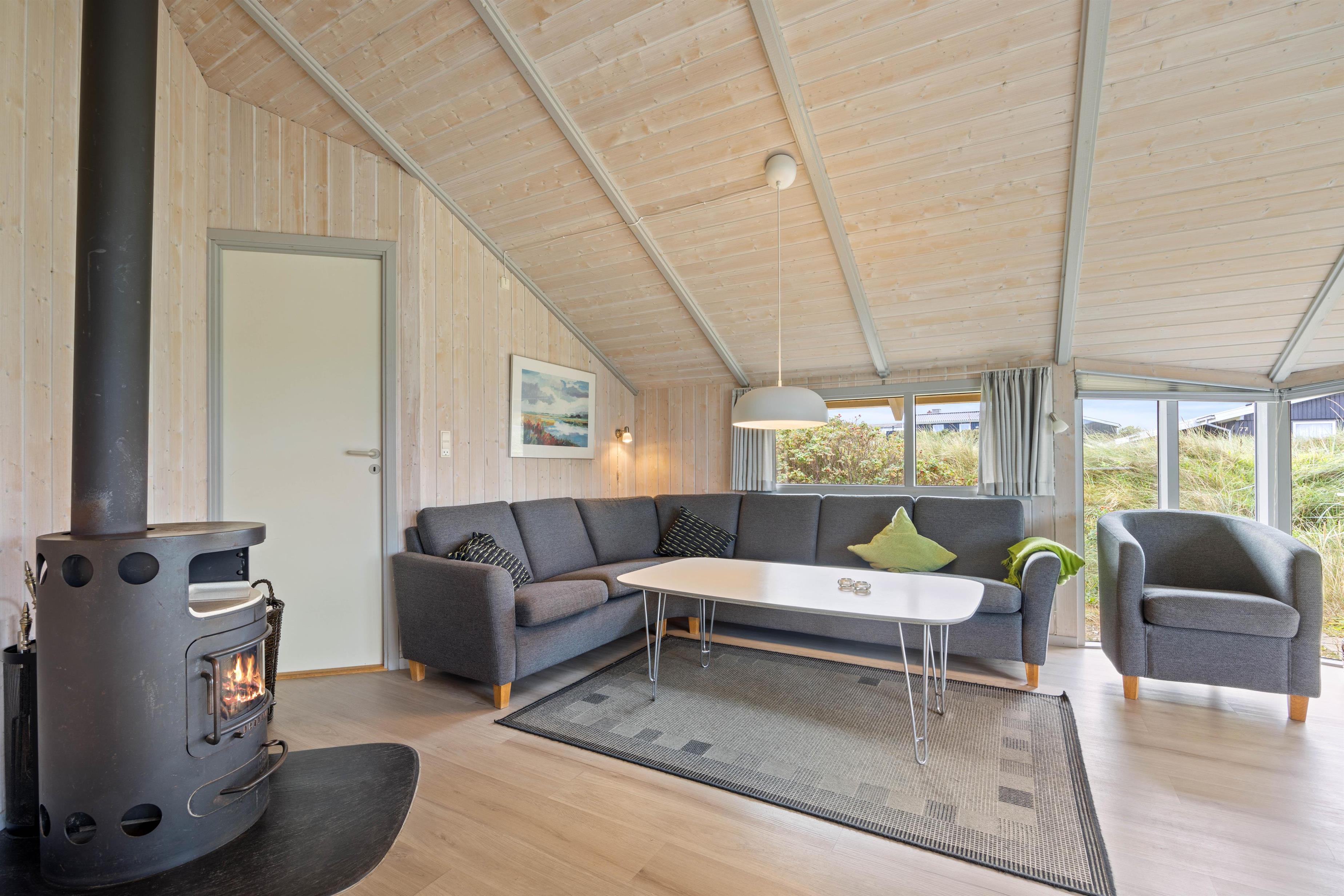Sommerhuset er indrettet med højt til det træbeklædte loft og med et dejligt lysindfald, der skaber en dejlig atmosfære i feriehuset. Fra køkkenet har I overblik over både spise- og opholdsafdeling, hvor den rustikke brændeovn skaber hygge sammen med TV'et. 4 soverum – 2 med dobbeltsenge og 2 med enkeltsenge – giver plads til 8 personer, som kan få en god nats søvn og samle energi til morgendagens ferieaktiviteter.