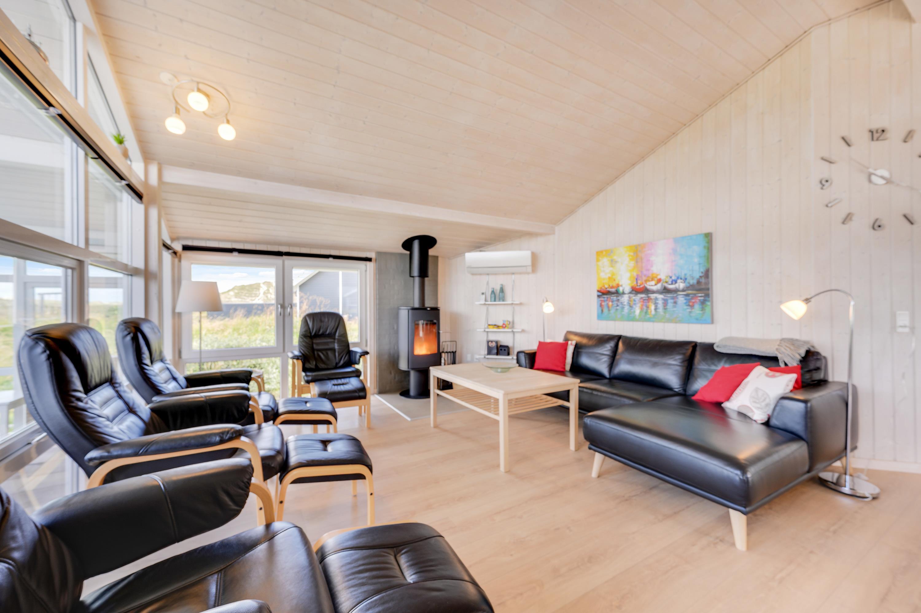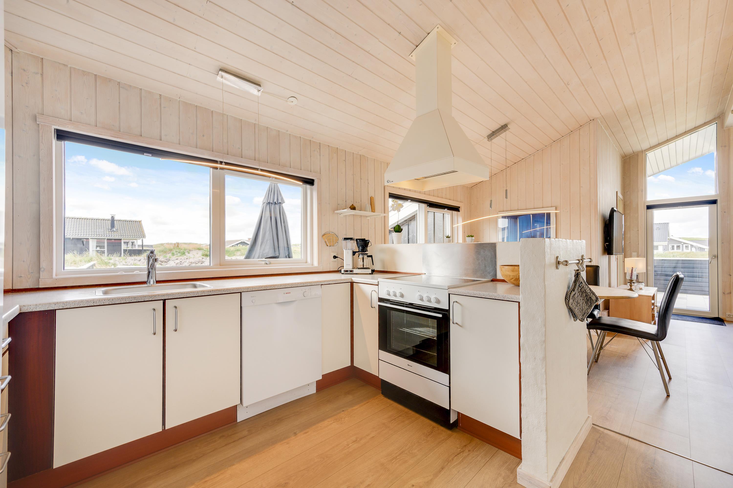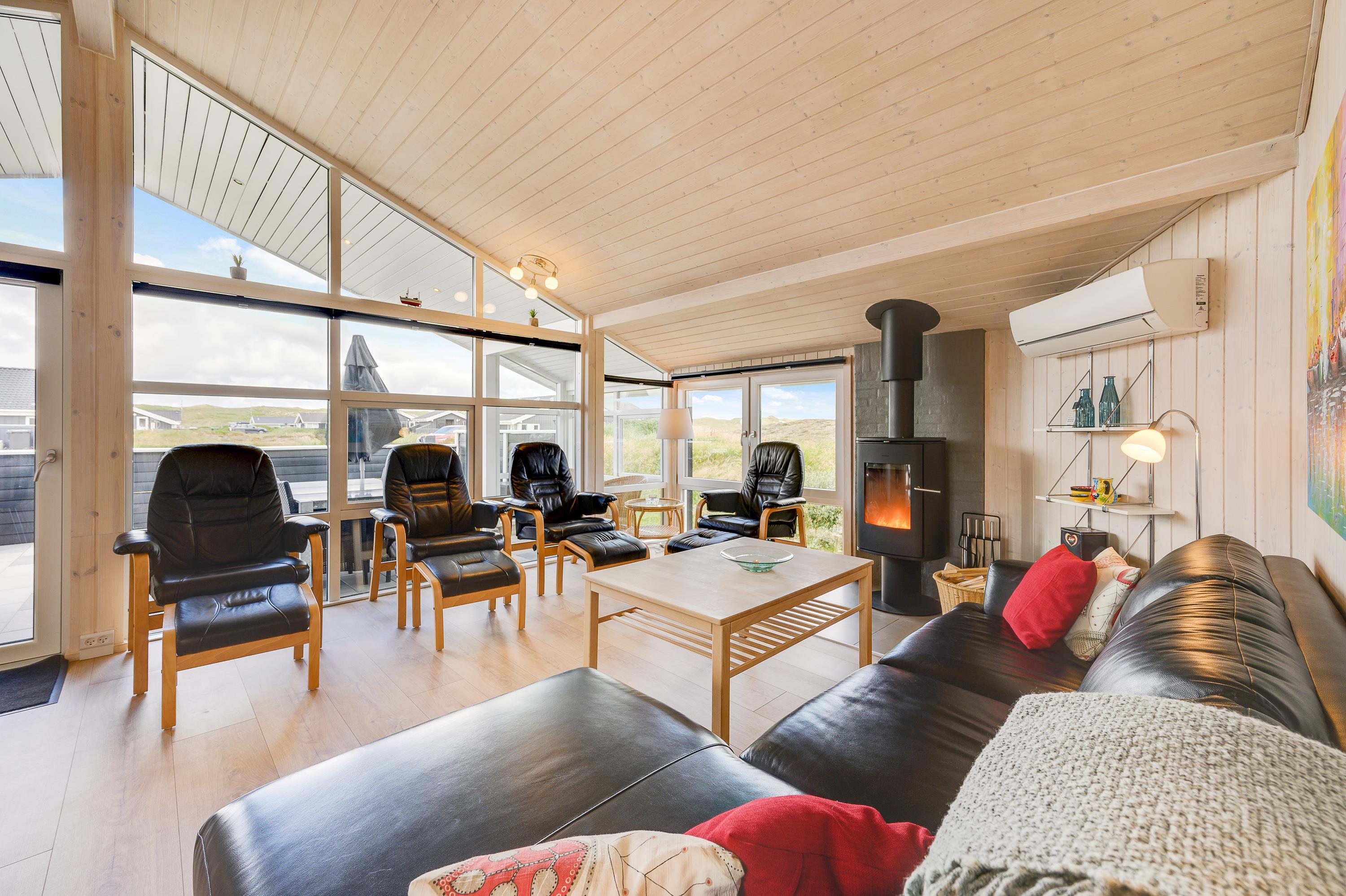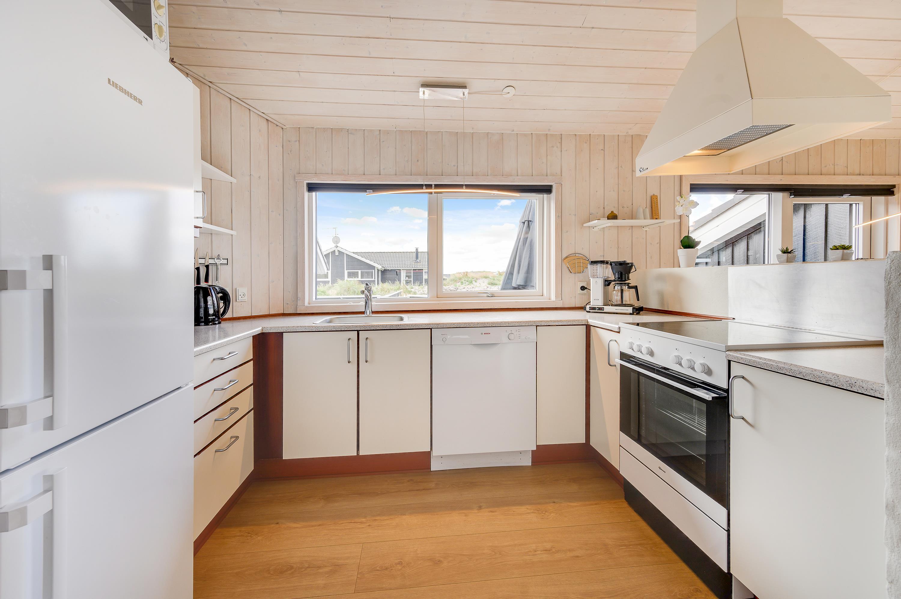 Huset er hyggeligt og indbydende med godt lysindfald fra de store vinduespartier mod syd. Der er flotte trægulve i stue og værelser. Den veludstyrede køkkenafdeling med bl.a. opvaskemaskine og hyggelig spisekrog ligger centralt i huset og herfra har du et godt overblik og kan følge med i samtalen i stuen. Fra stuen kan du virkelig nyde naturen og det flotte klitlandskab – selv i dårligt vejr, med ild i brændeovnen – igennem de store vinduer.