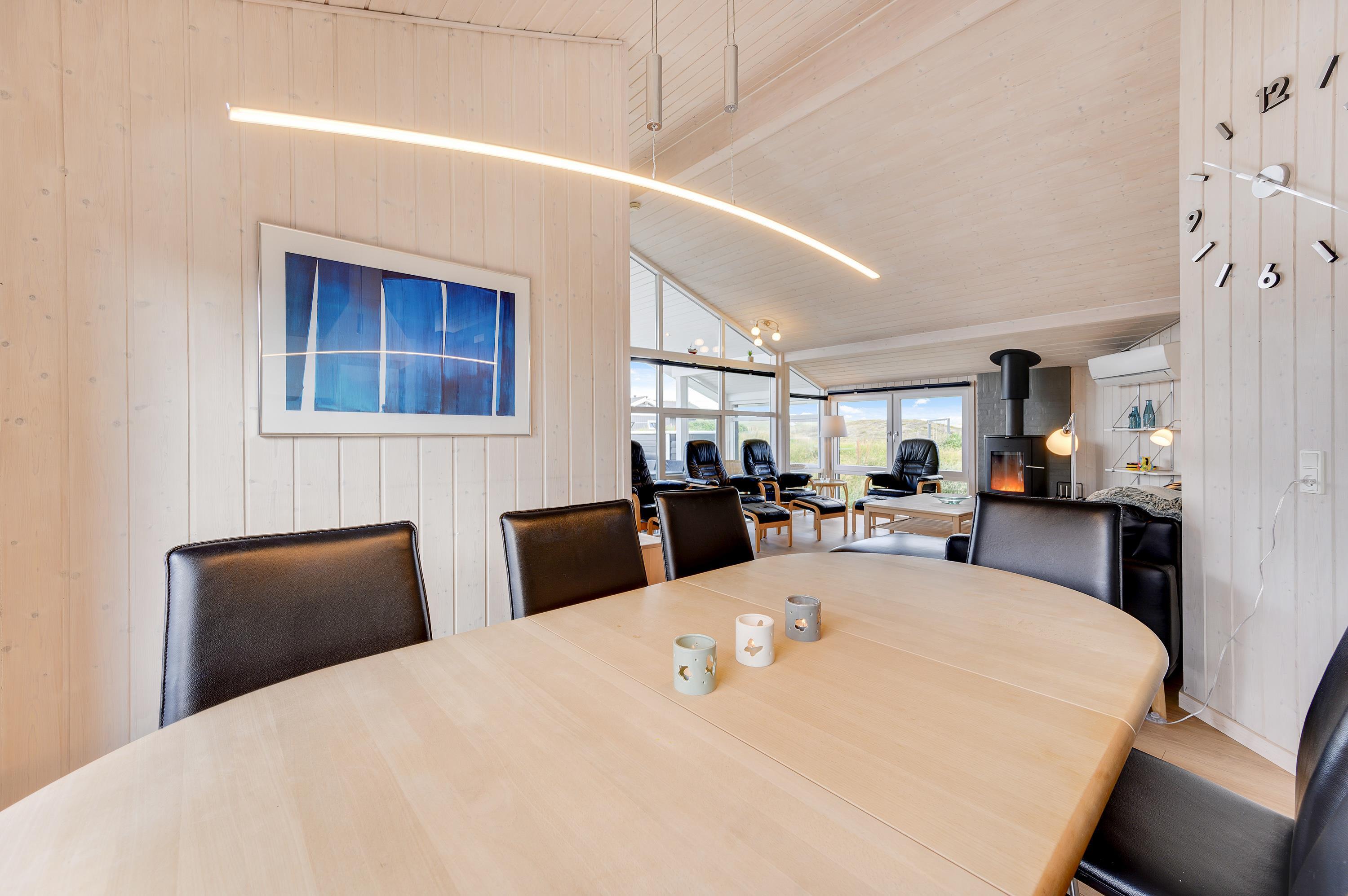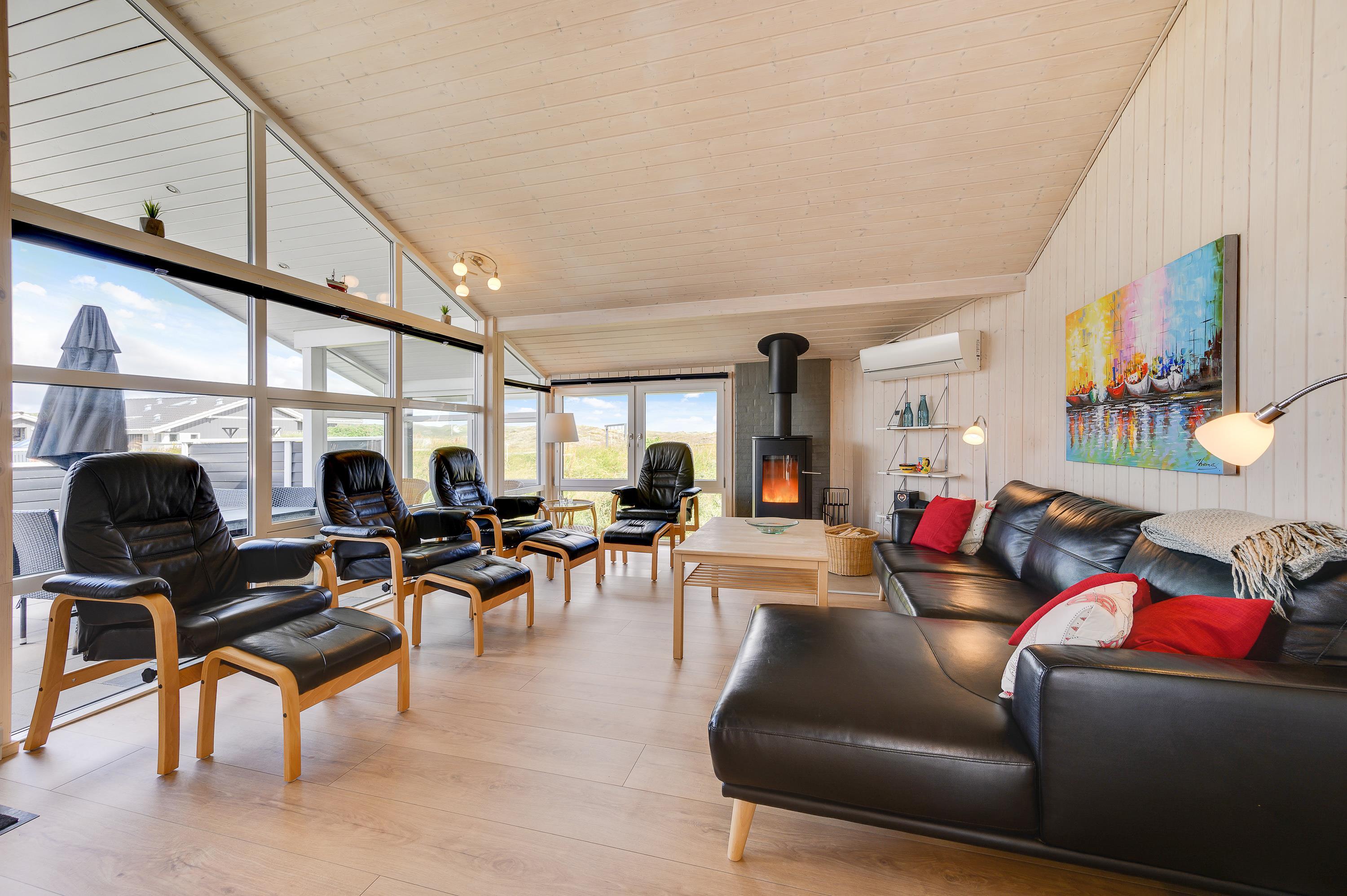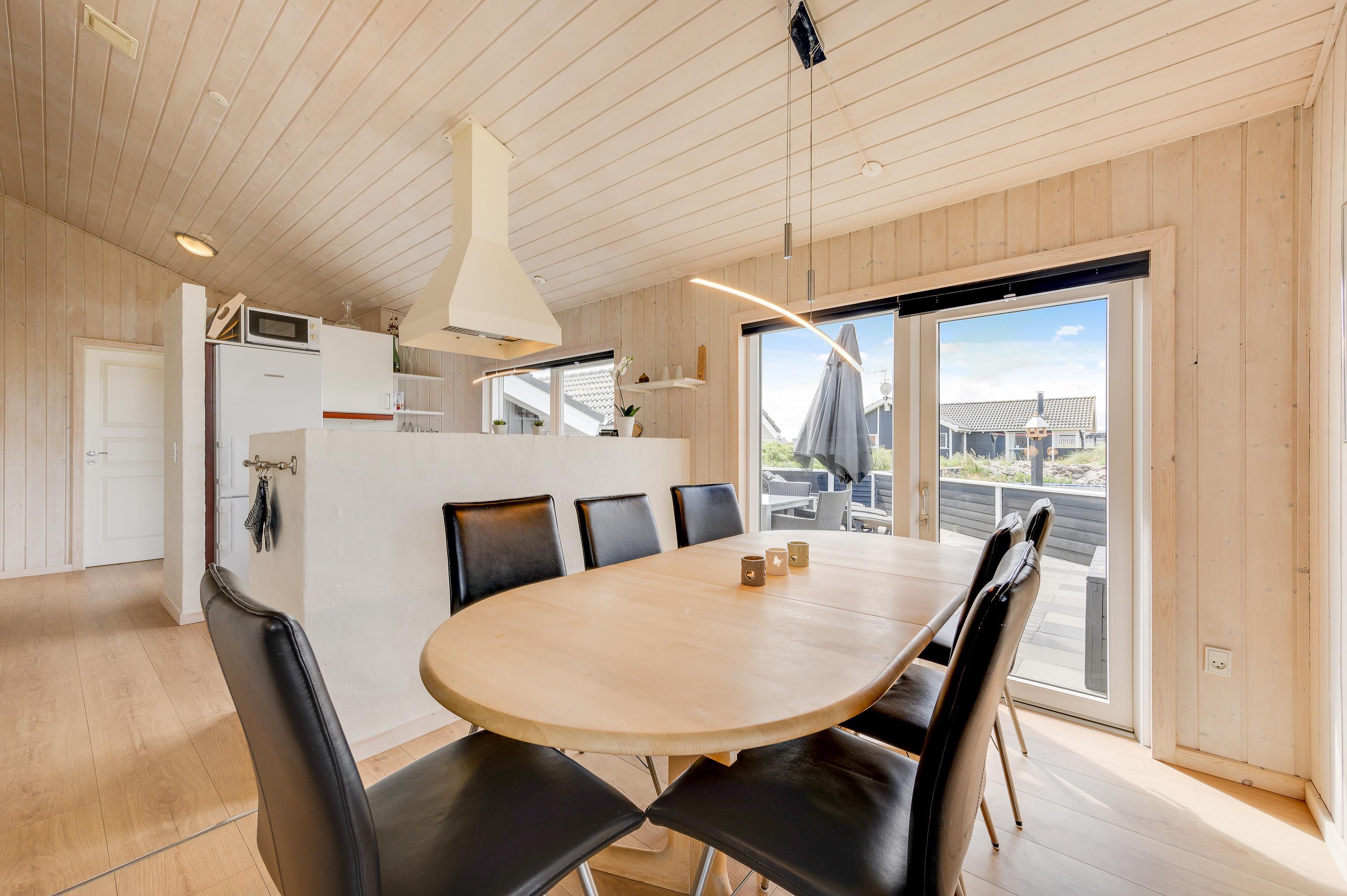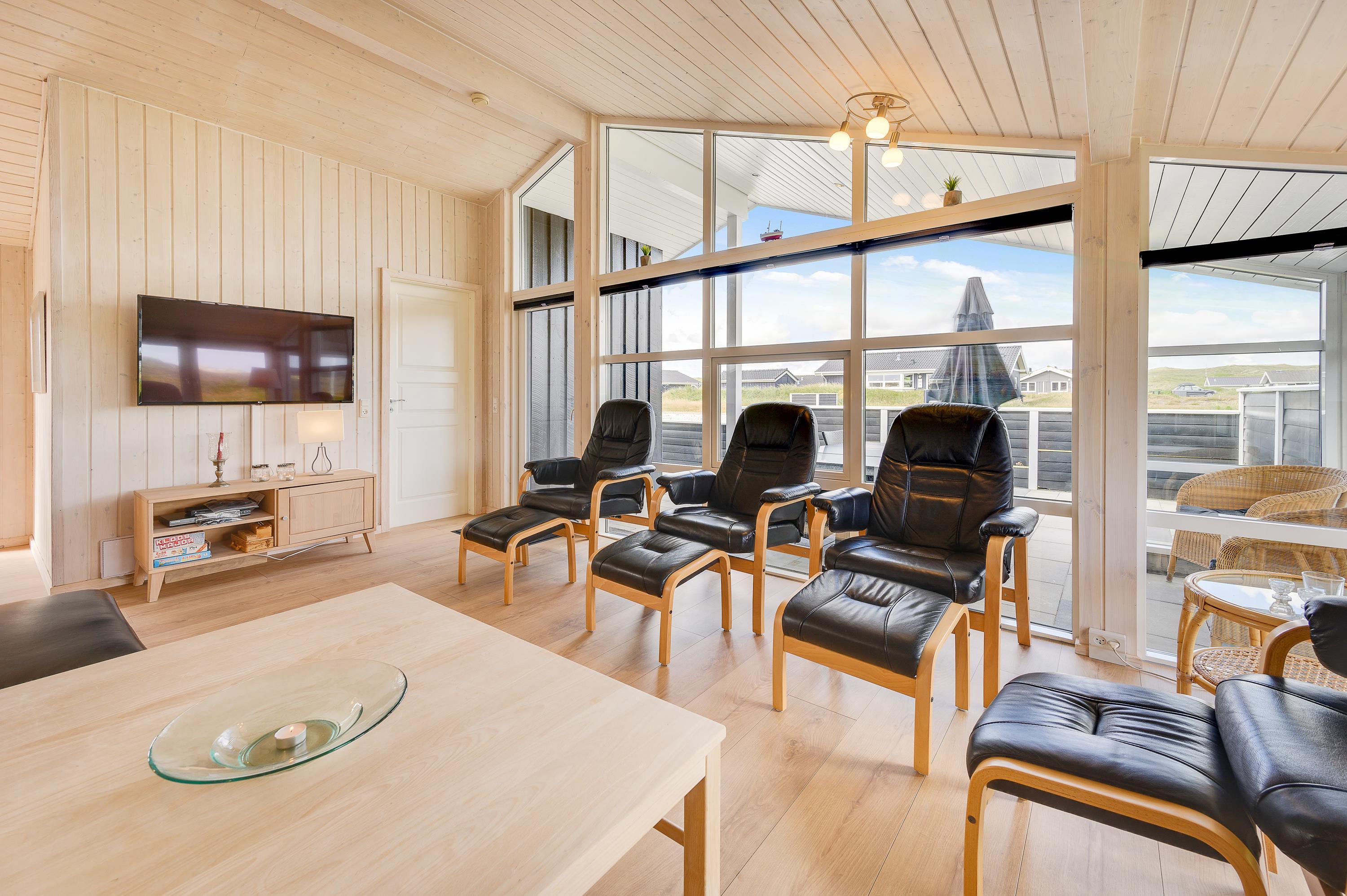 Huset er hyggeligt og indbydende med godt lysindfald fra de store vinduespartier mod syd. Der er flotte trægulve i stue og værelser. Den veludstyrede køkkenafdeling med bl.a. opvaskemaskine og hyggelig spisekrog ligger centralt i huset og herfra har du et godt overblik og kan følge med i samtalen i stuen. Fra stuen kan du virkelig nyde naturen og det flotte klitlandskab – selv i dårligt vejr, med ild i brændeovnen – igennem de store vinduer.