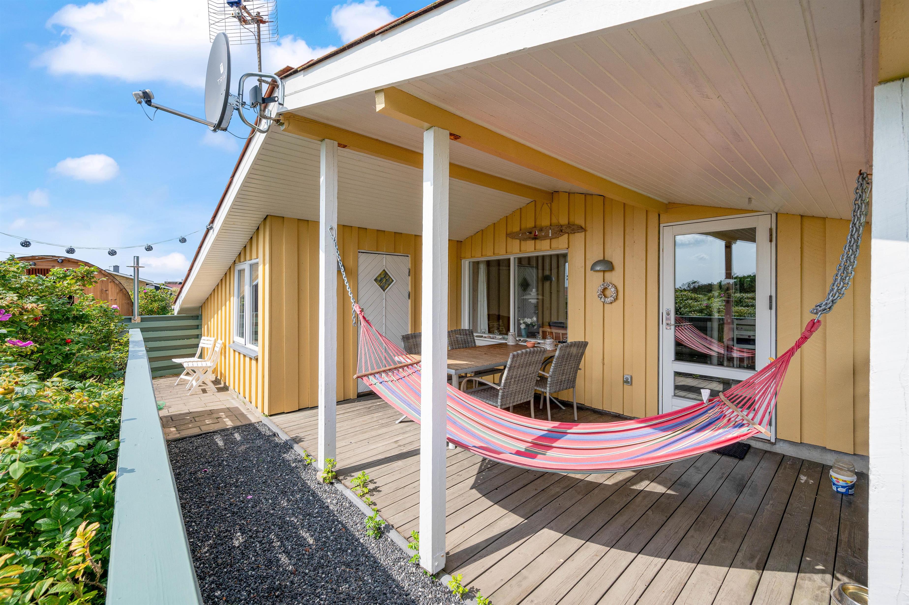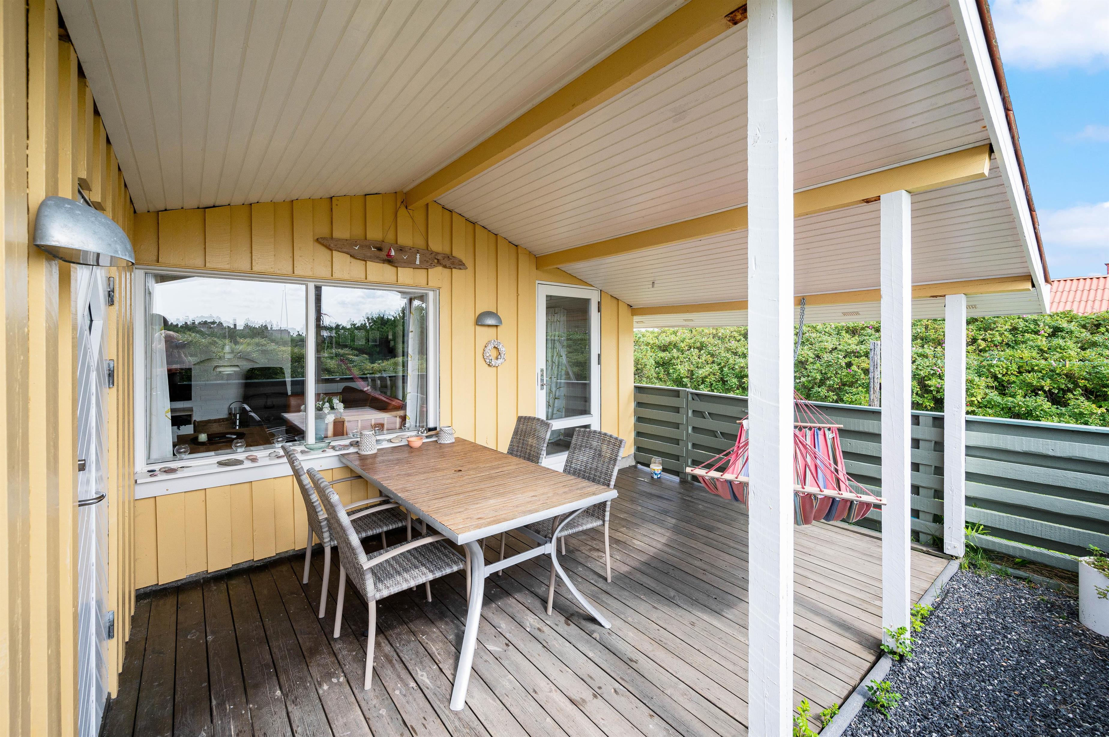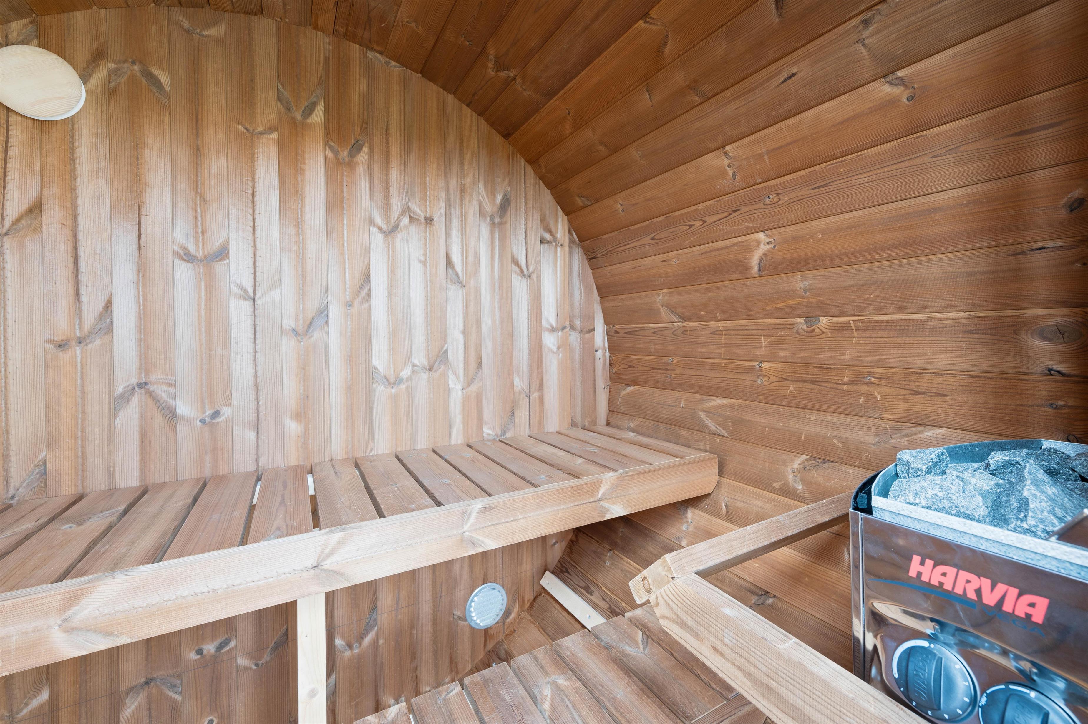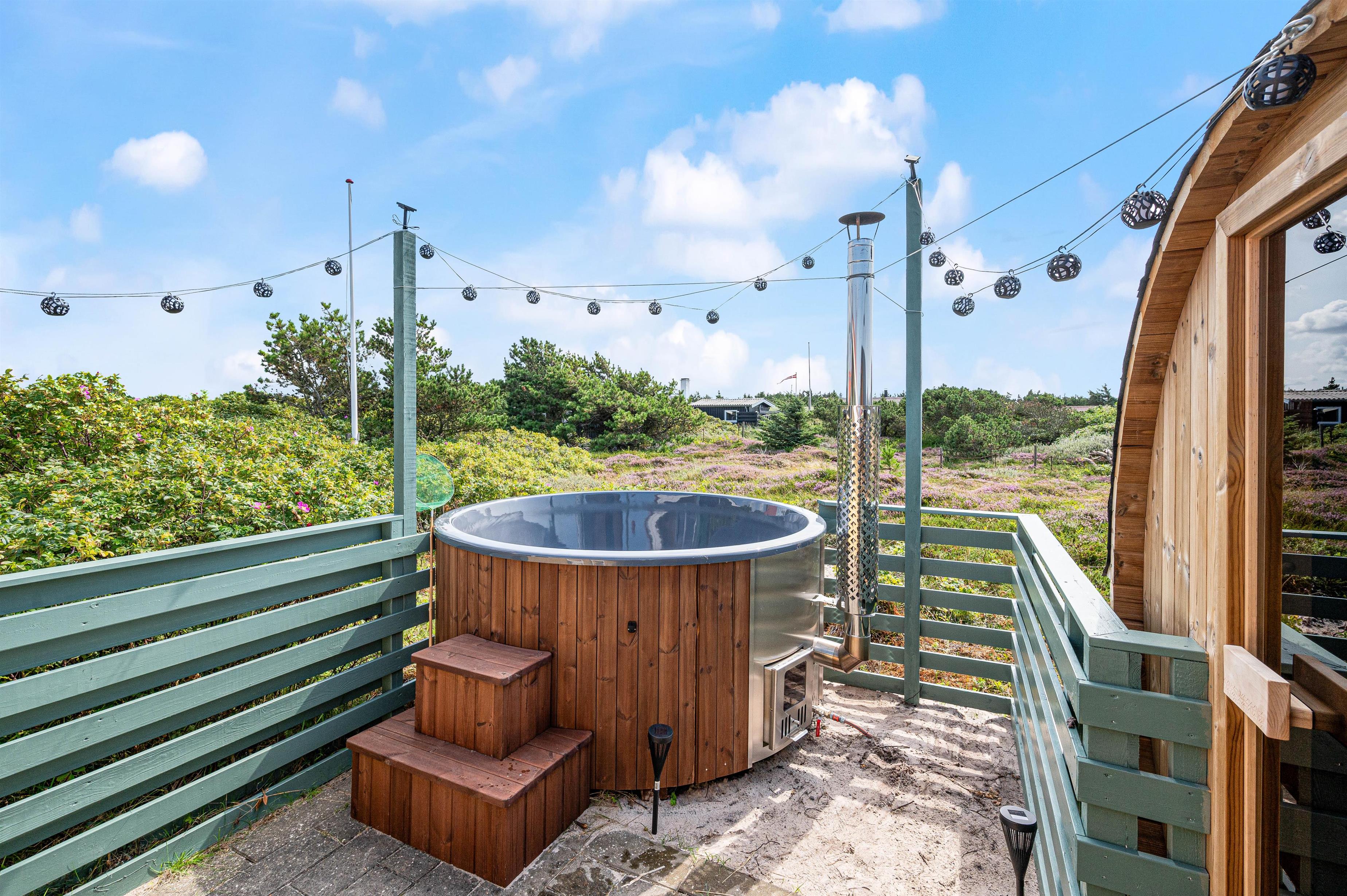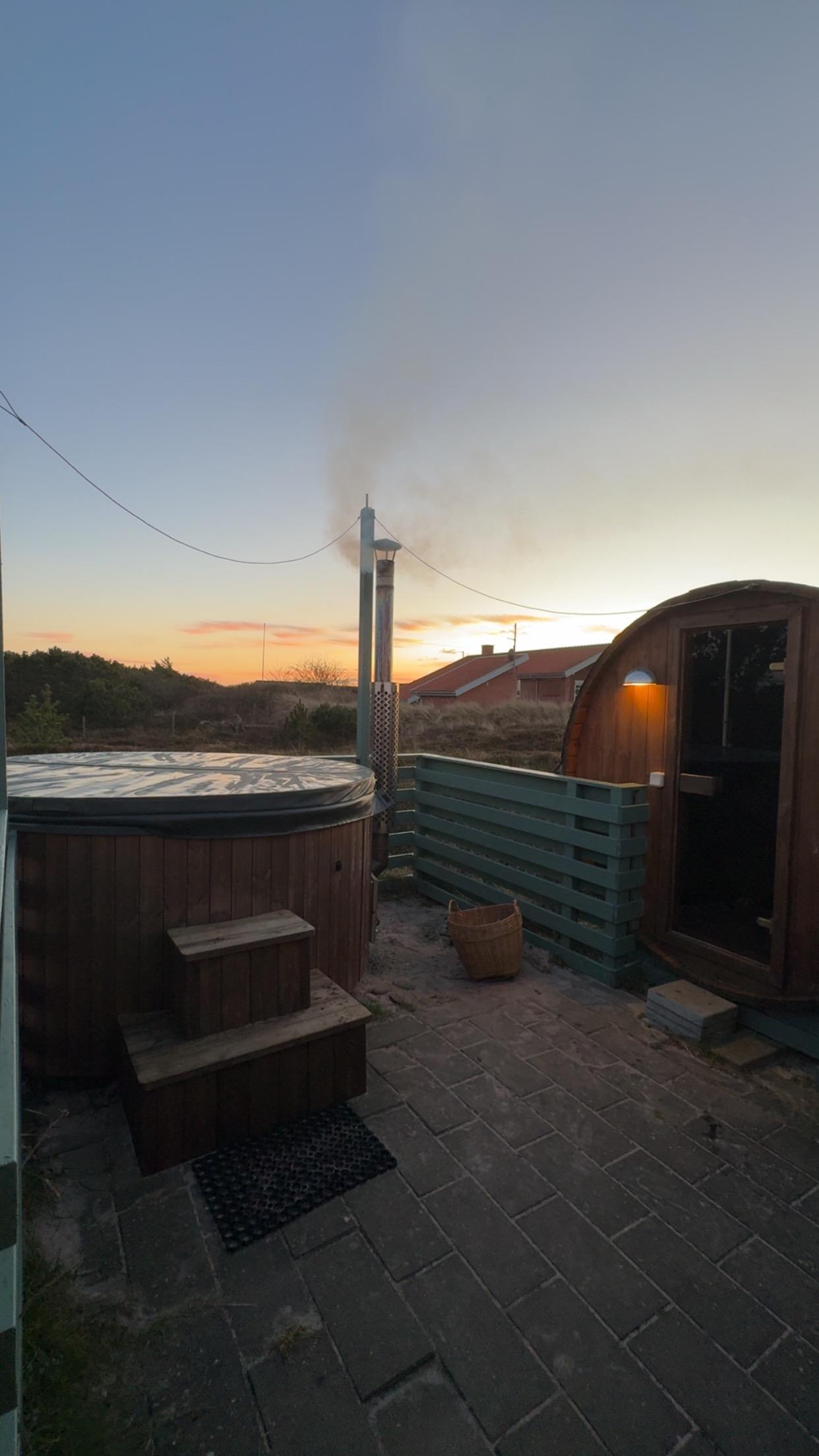 Fra stuen er der direkte adgang til feriehusets fine terrasse med vildmarksbad, sauna og udebruser (udebruseren kan benyttes fra april til november). Her kan hele flokken nyde de solrige sommerdage – uanset om det er i solen eller i skyggen på terrassen overdækkede del. Praktisk er terrassen lukket, så småbørn og hundene kan bevæge sig frit omkring. Til familiens mindste gemmer sig både sandkasse og gynge.