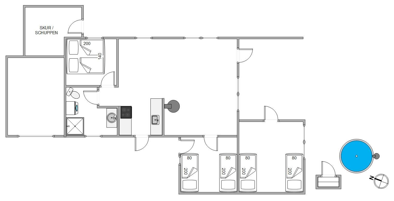 Feriehuset er praktisk udstyret med opvaskemaskine, vaskemaskine og gulvvarme på badeværelset. Soveværelserne med vinyltrægulve er fordelt på 3 soverum, 1 med dobbeltseng og de sidste med 2 enkeltsenge. Bemærk venligst, at 1 af soveværelserne kun kan tilgås fra terrassen.