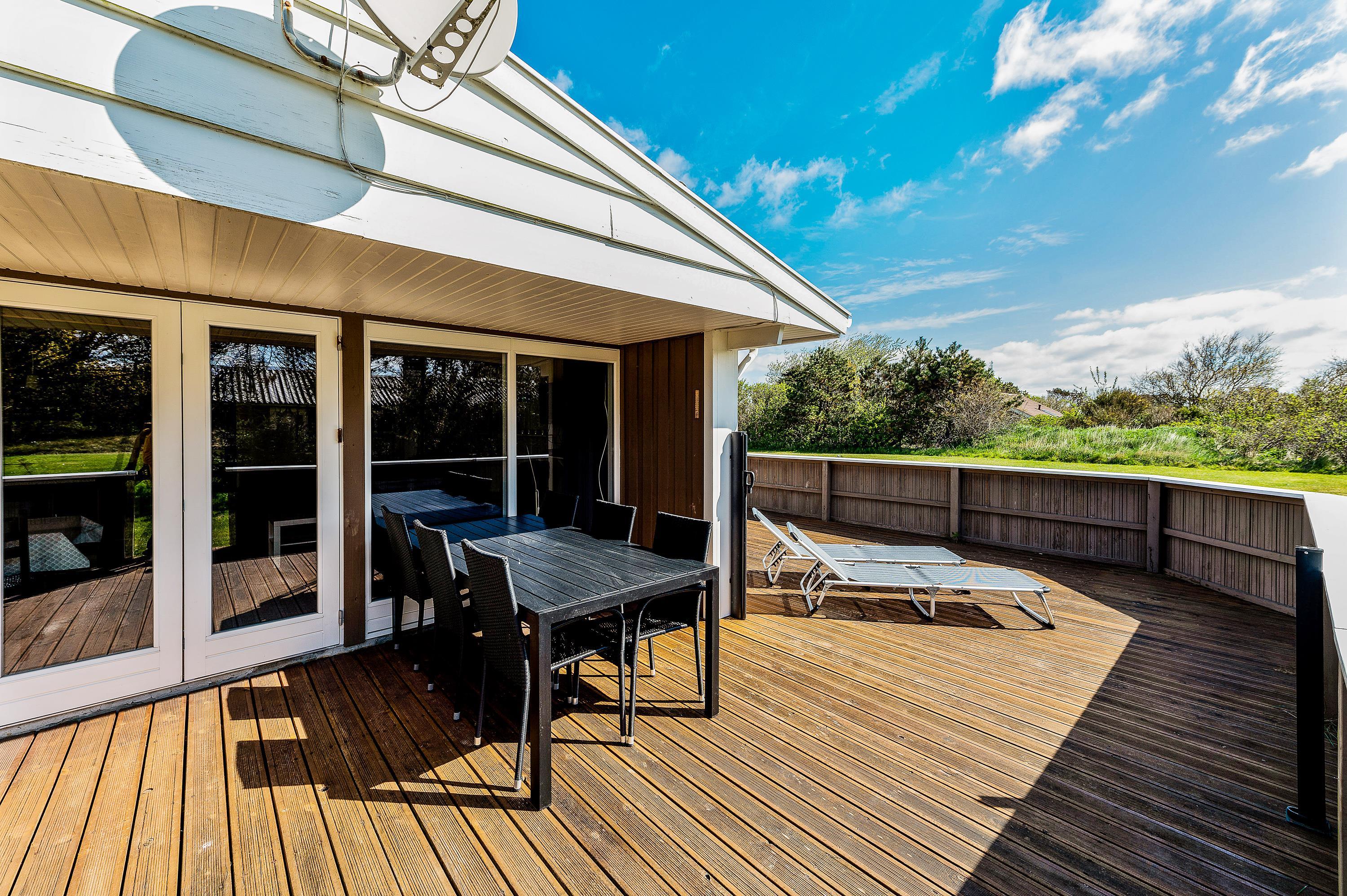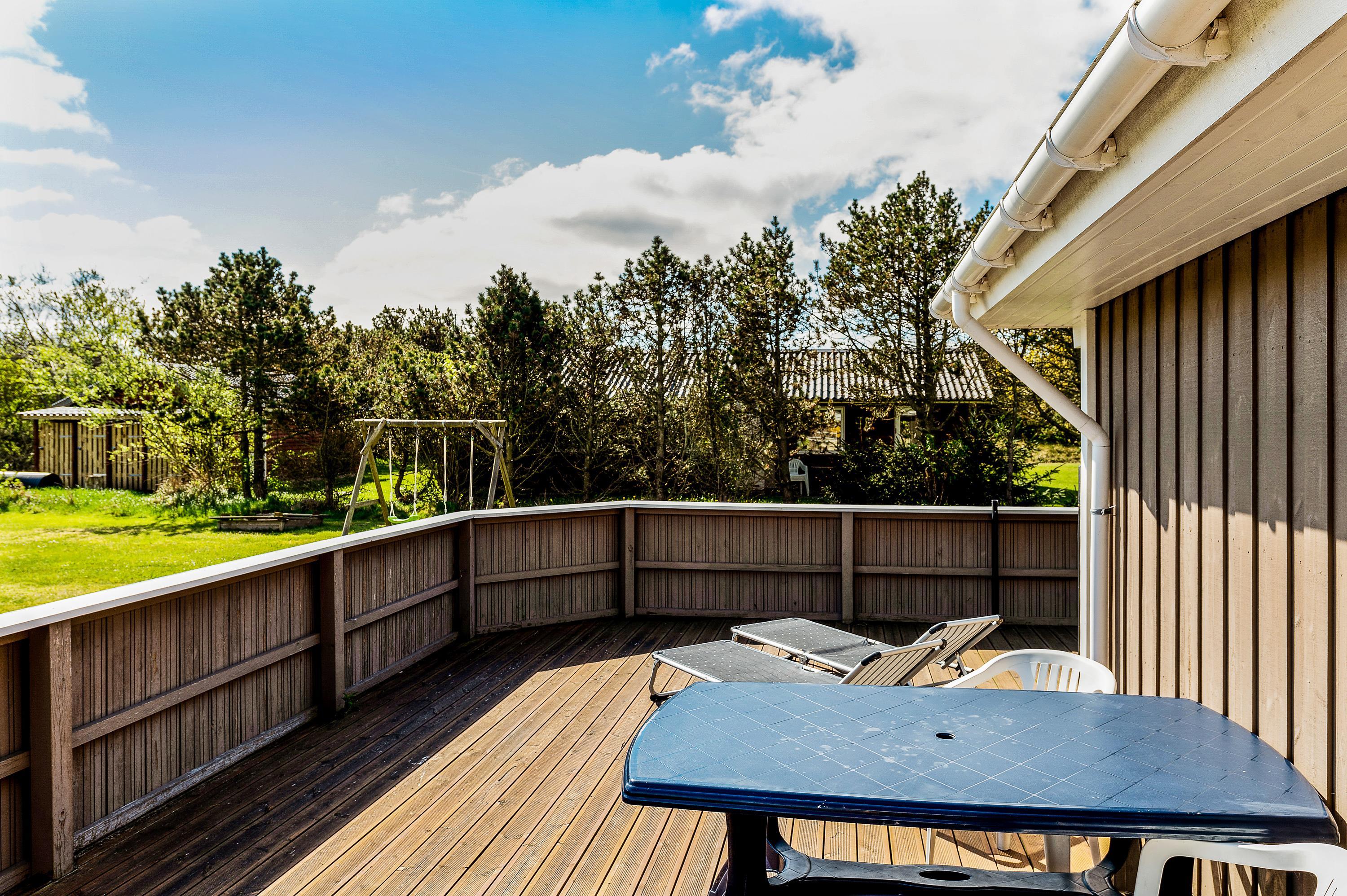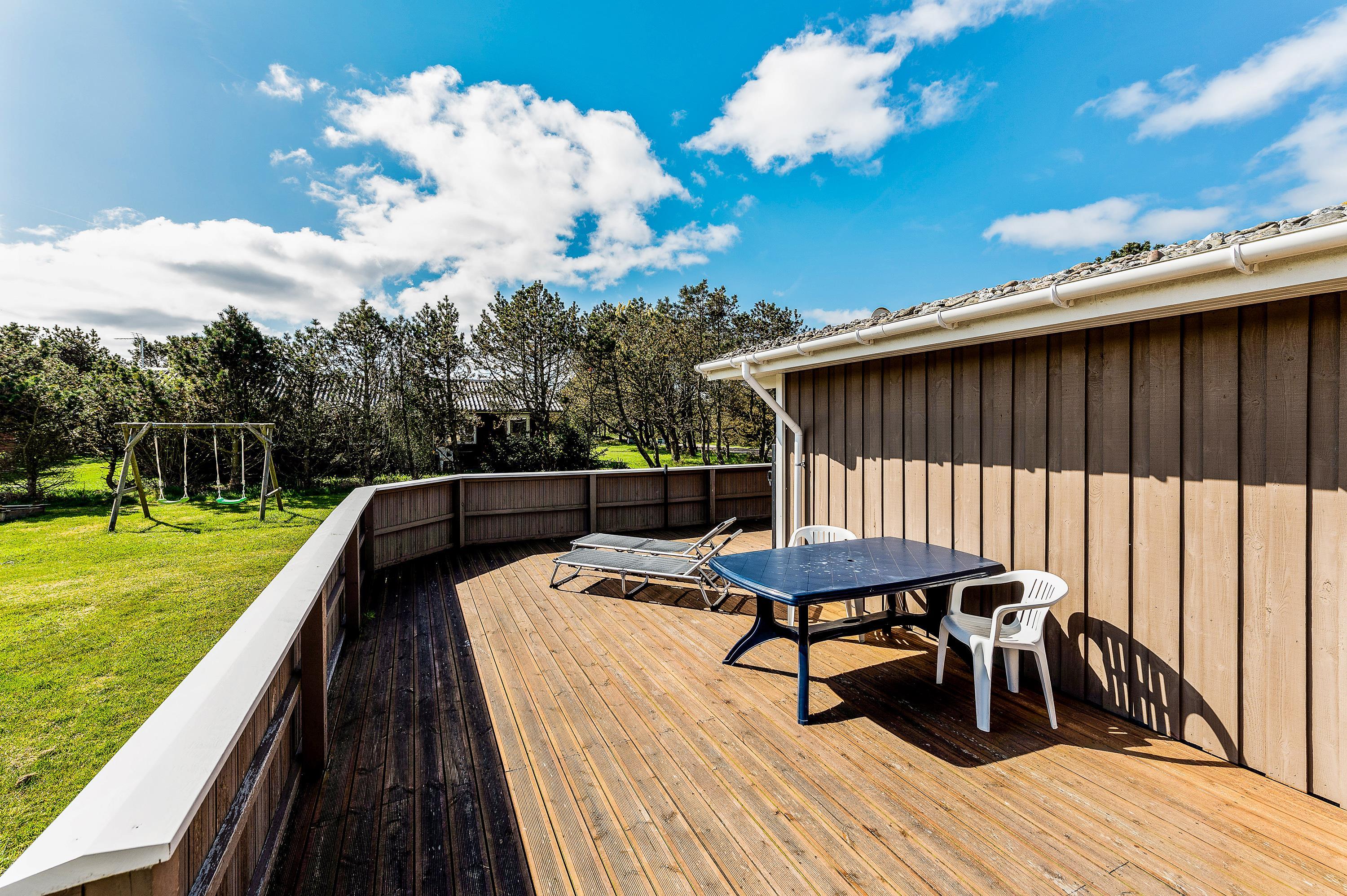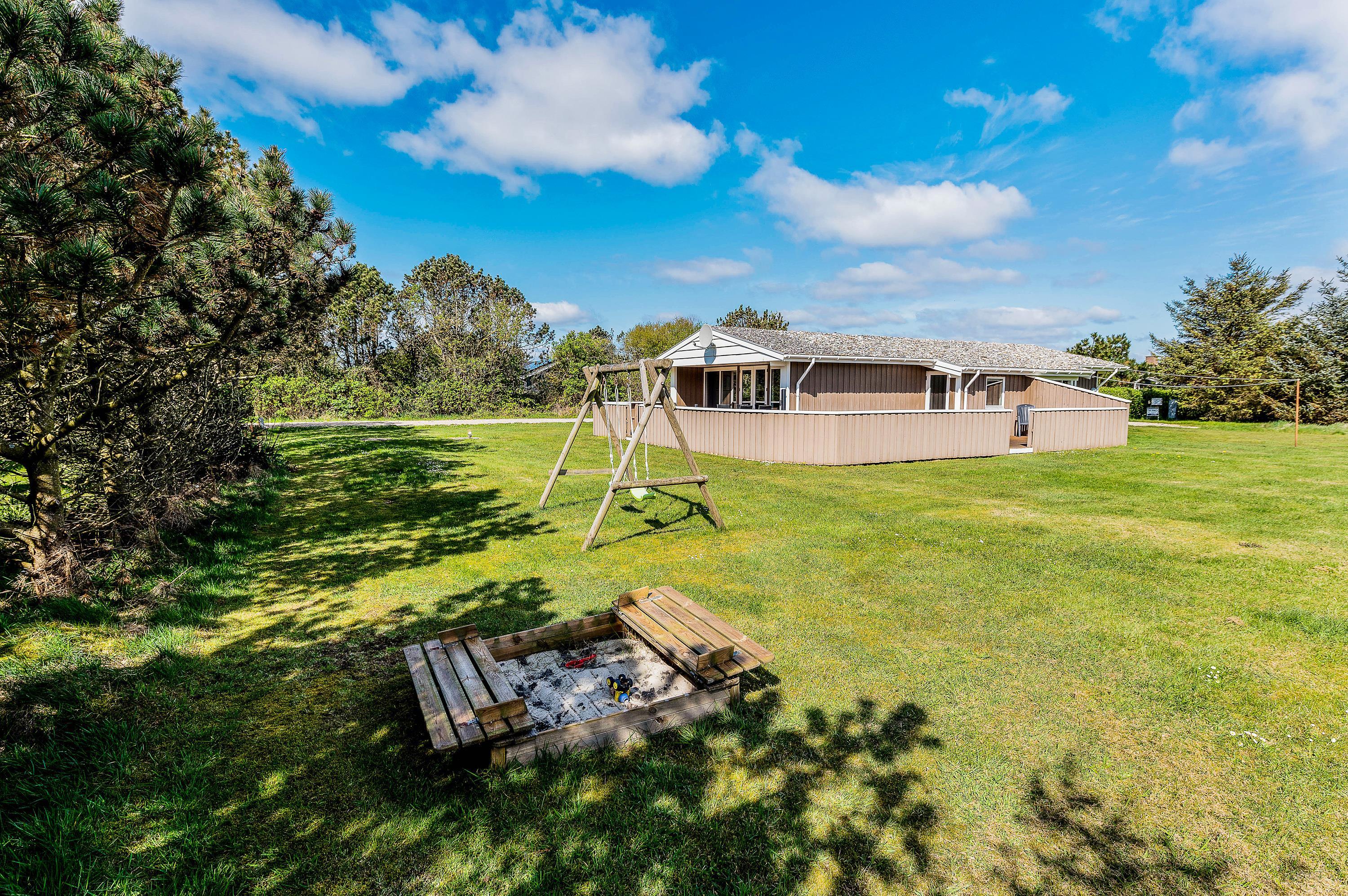 Beliggenheden på den store, let afskærmet grund opfordrer til boldspil og leg i de fine legeredskaber for de mindste og den lukkede terrasse giver rig mulighed for at nyde naturen i fred og ro i liggestole eller de gode havemøbler.