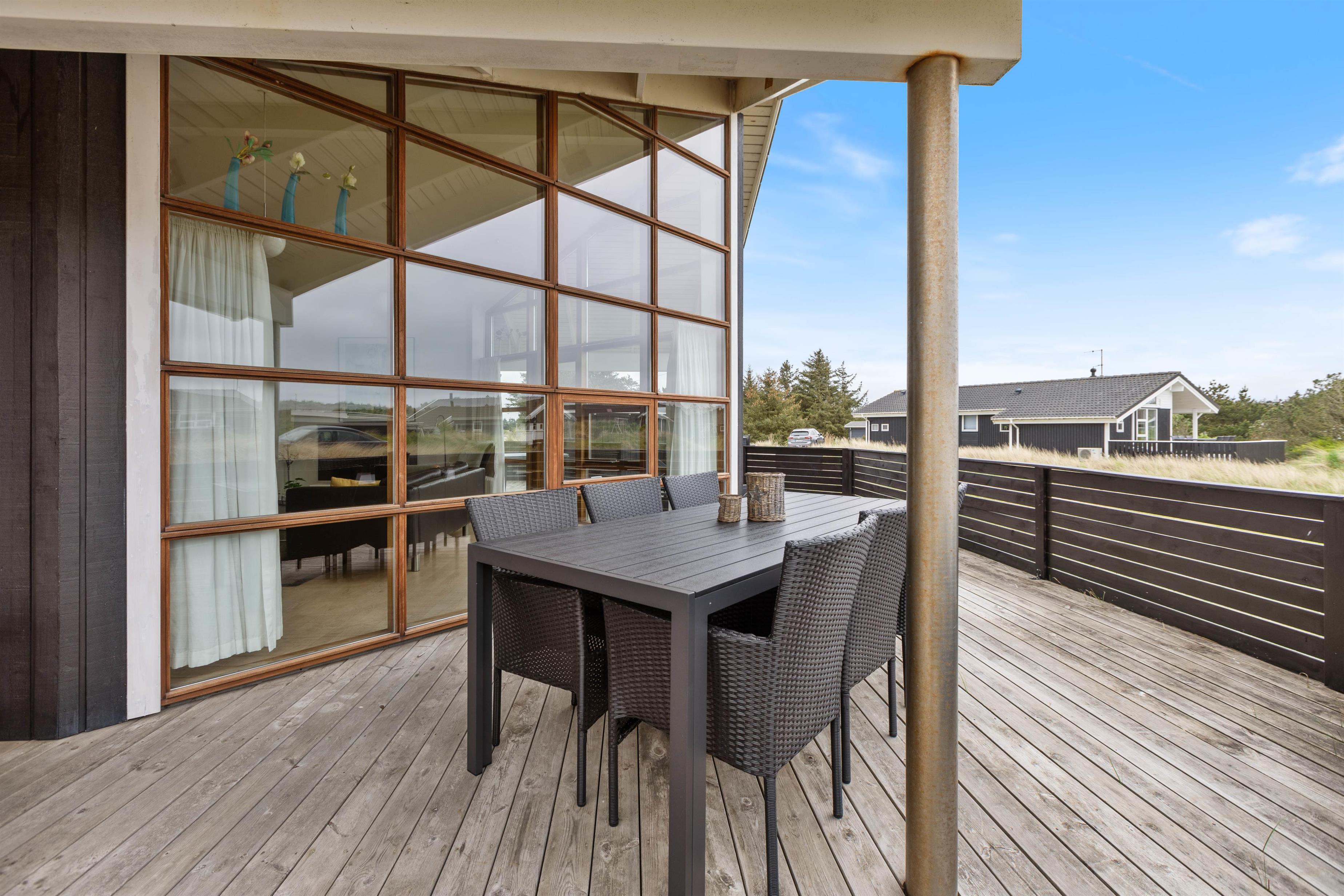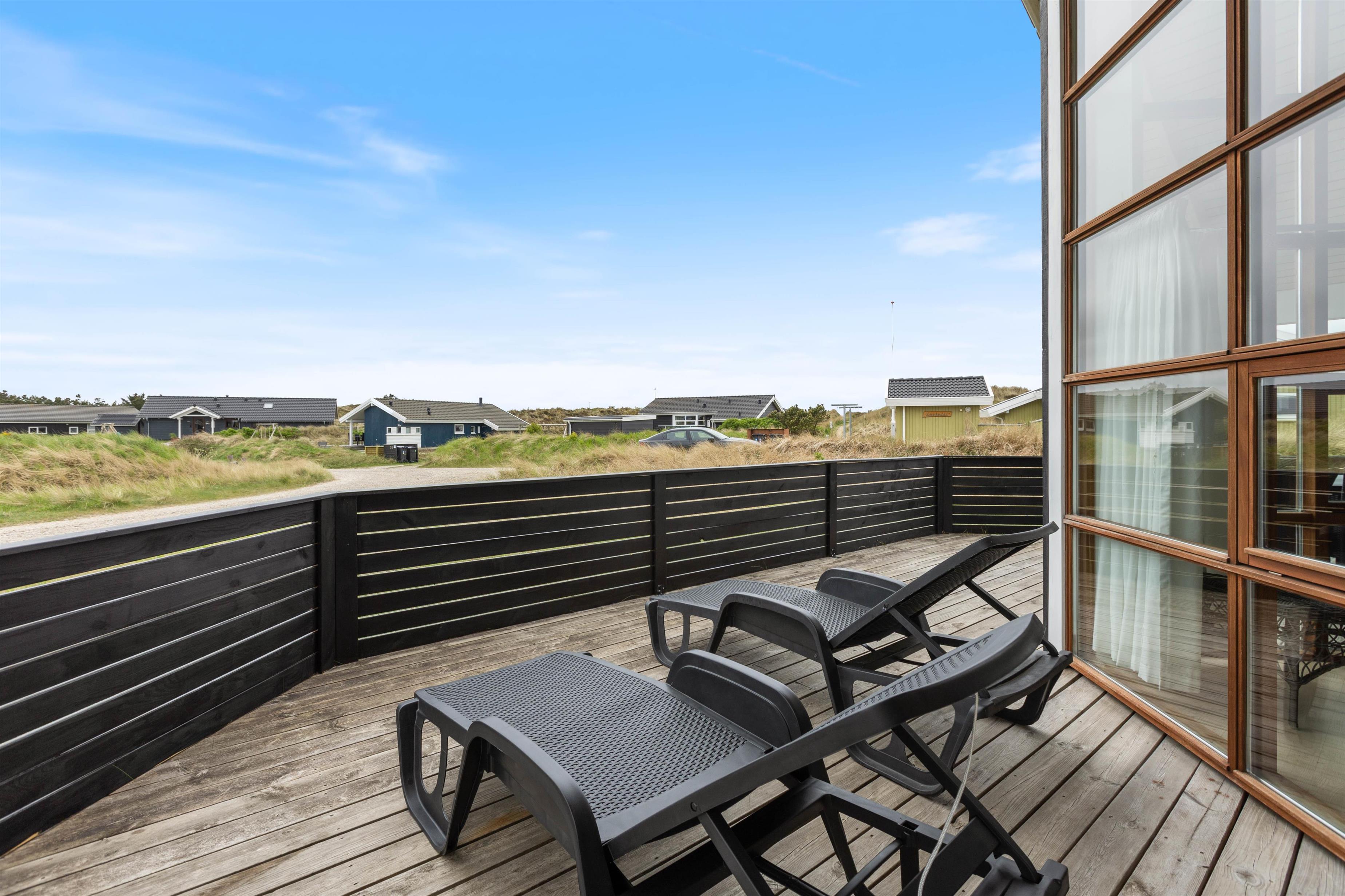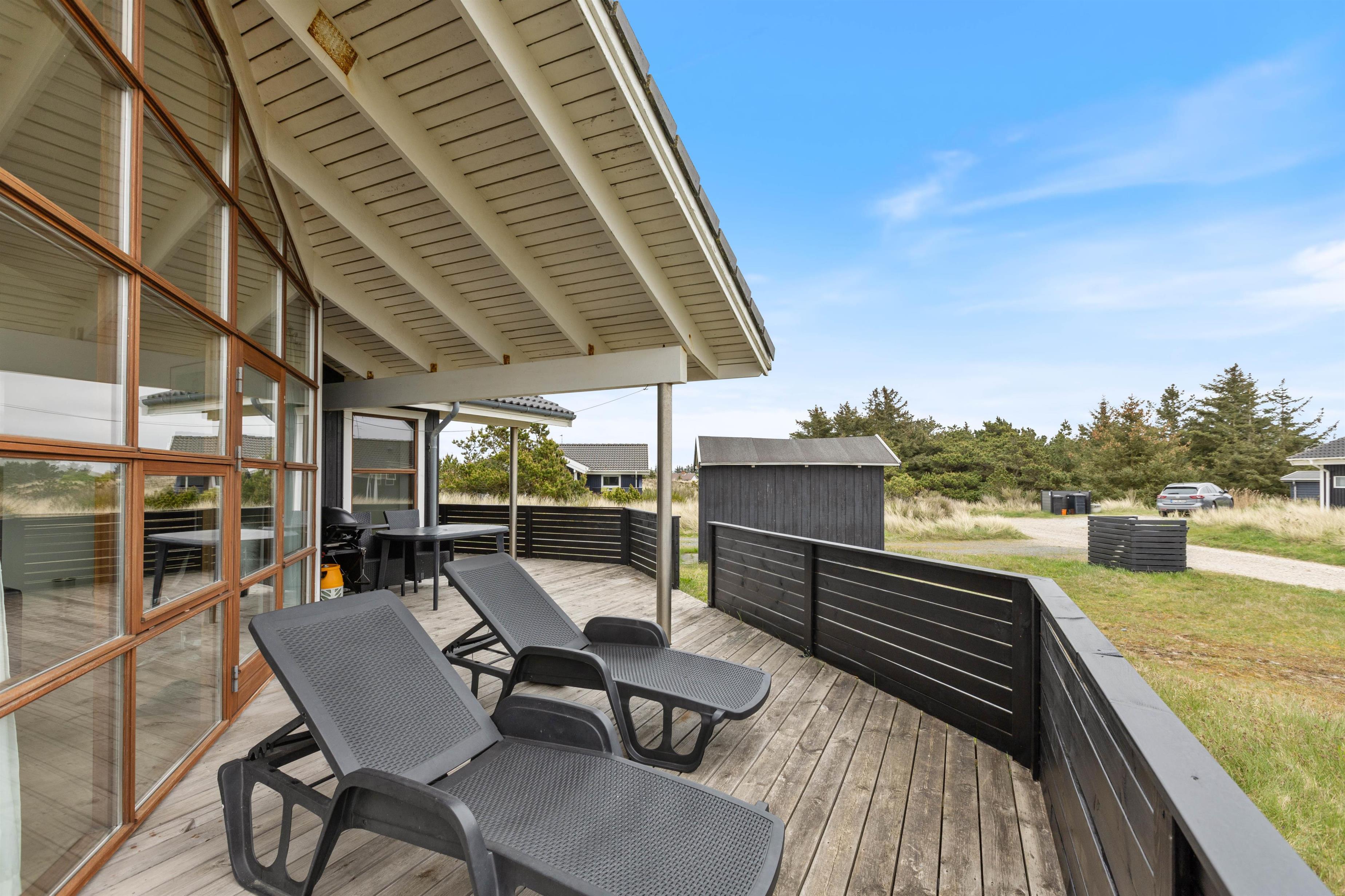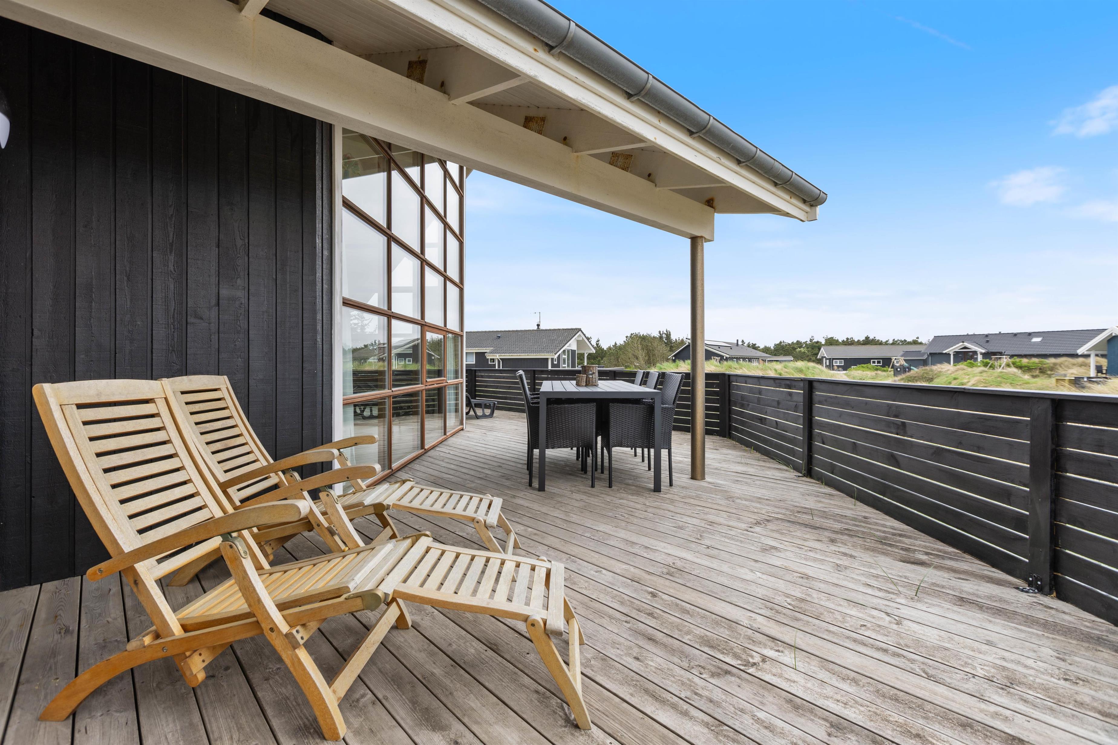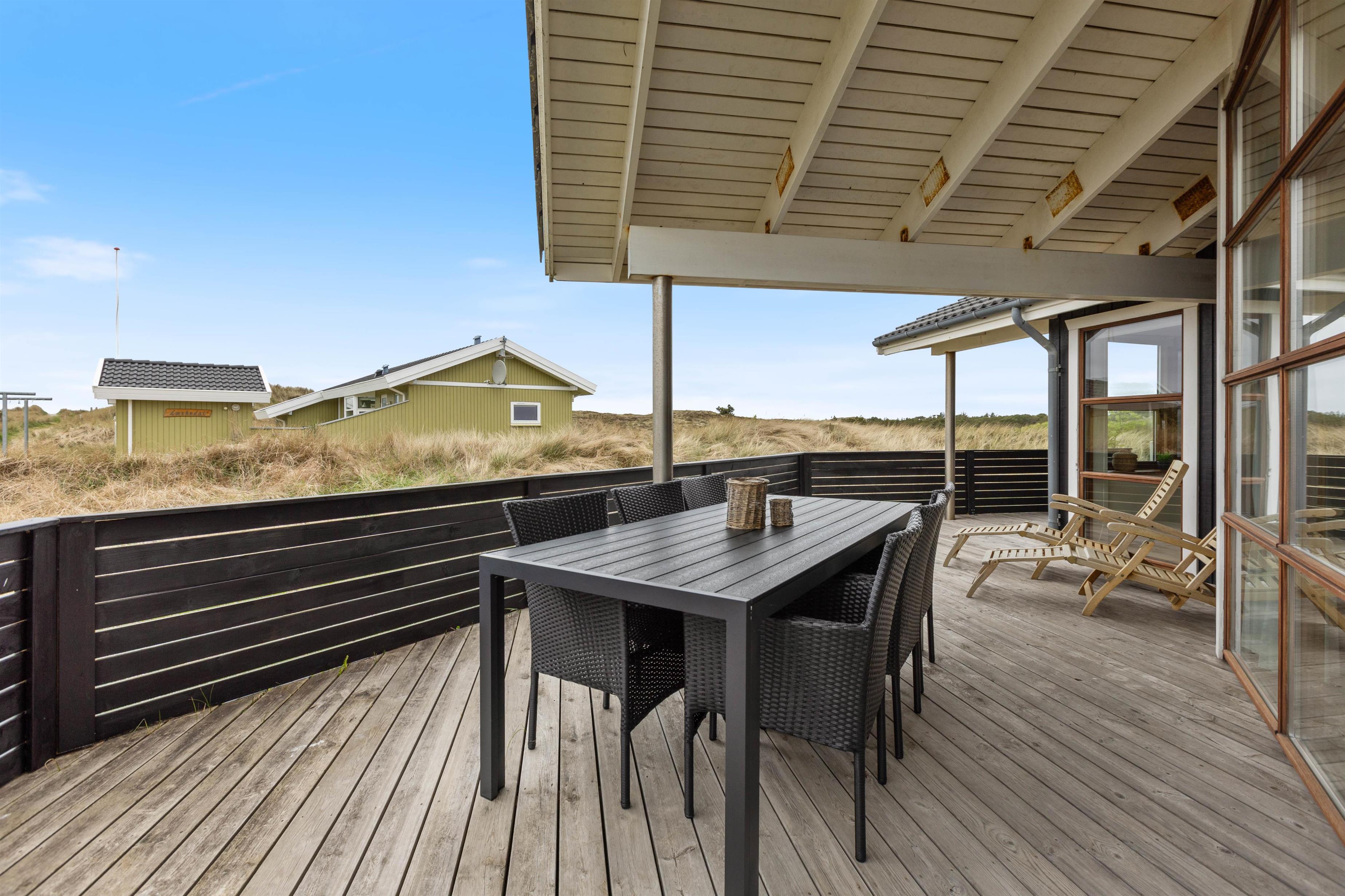 Sommerhuset er omgivet af en delvist overdækket træterrasse. Afhængigt af solens position og vindretningen kan du altid finde en krog, hvor du kan trække dig tilbage med en god bog og en kop te. Eller du kan solbade i liggestolene og trække dig ind i skyggen, når solen bliver for stærk. Imens kan børnene gå på opdagelse på naturgrunden. Hvad med et spil vikingeskak? Når dagen går på hæld, kan I tænde op i grillen og nyde et lækkert grillmåltid, imens solen går ned bag klitterne. Med under 1 kilometer til stranden kan I nå at nyde solnedgangen i Vesterhavet. Det er altid en storslået oplevelse.