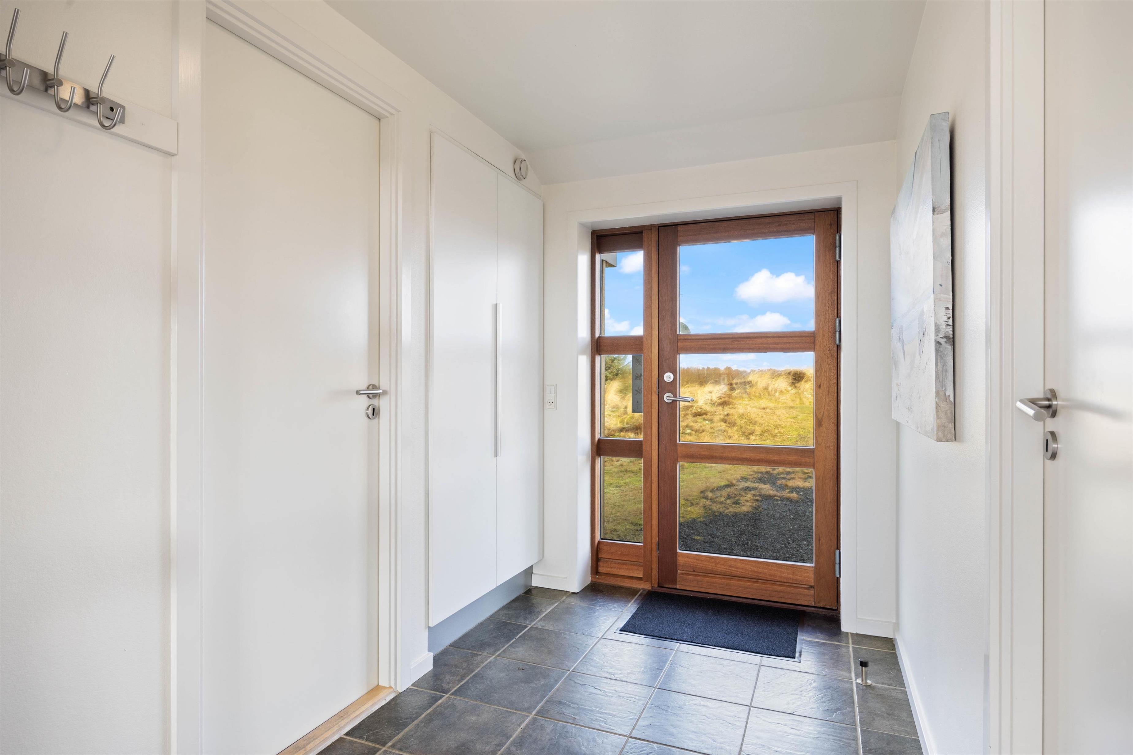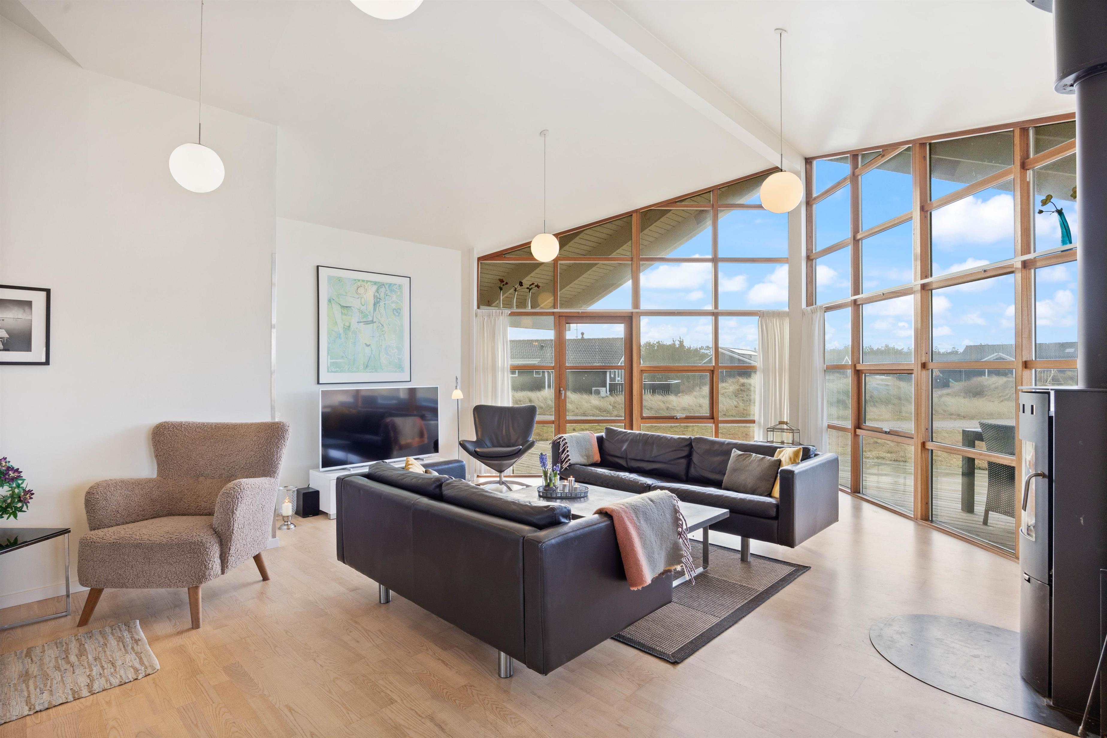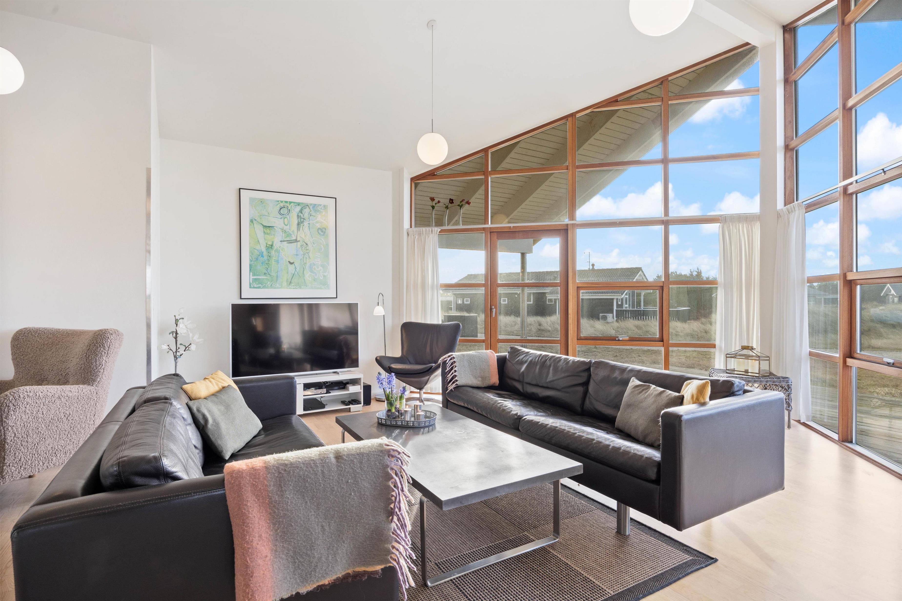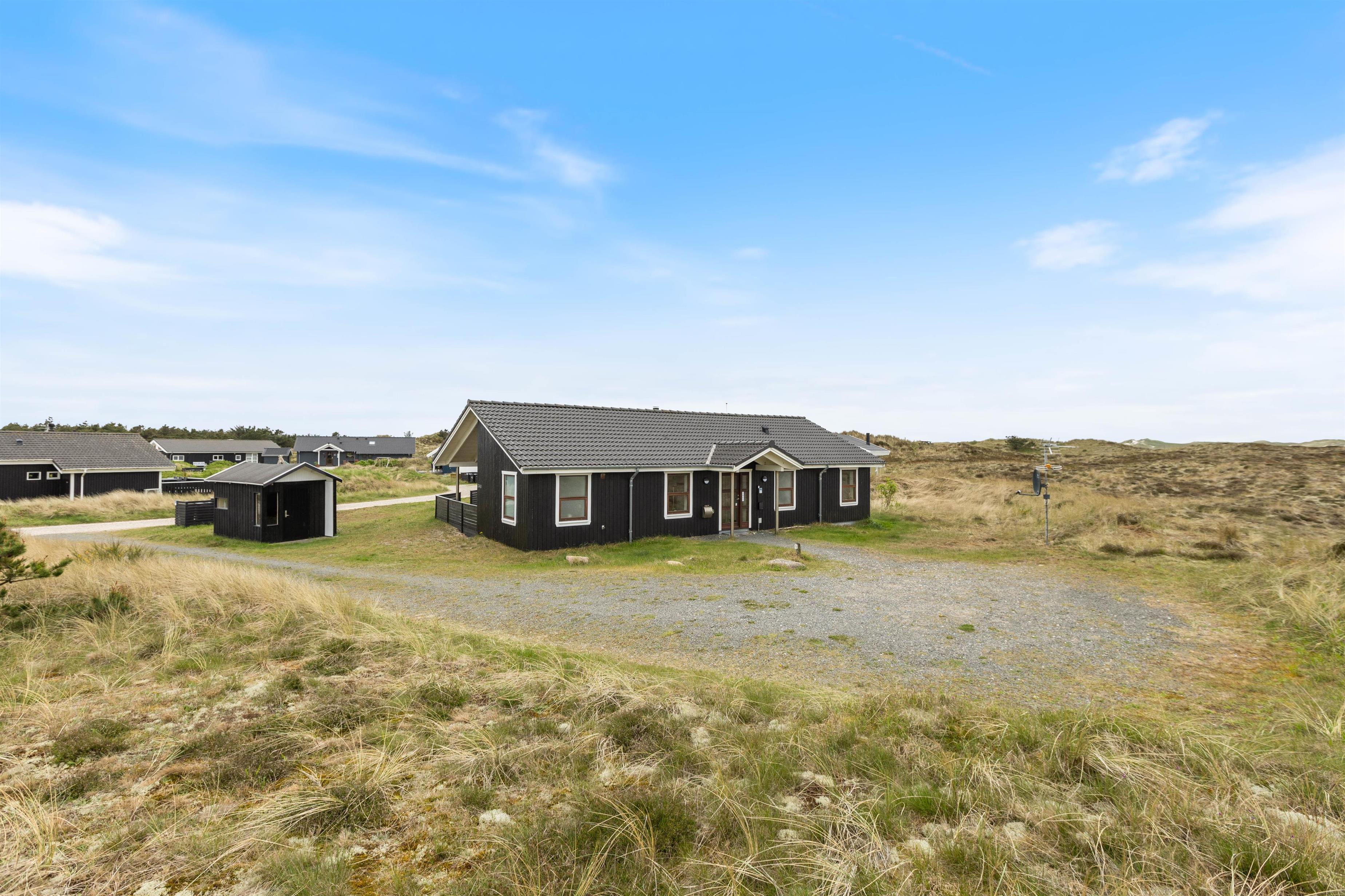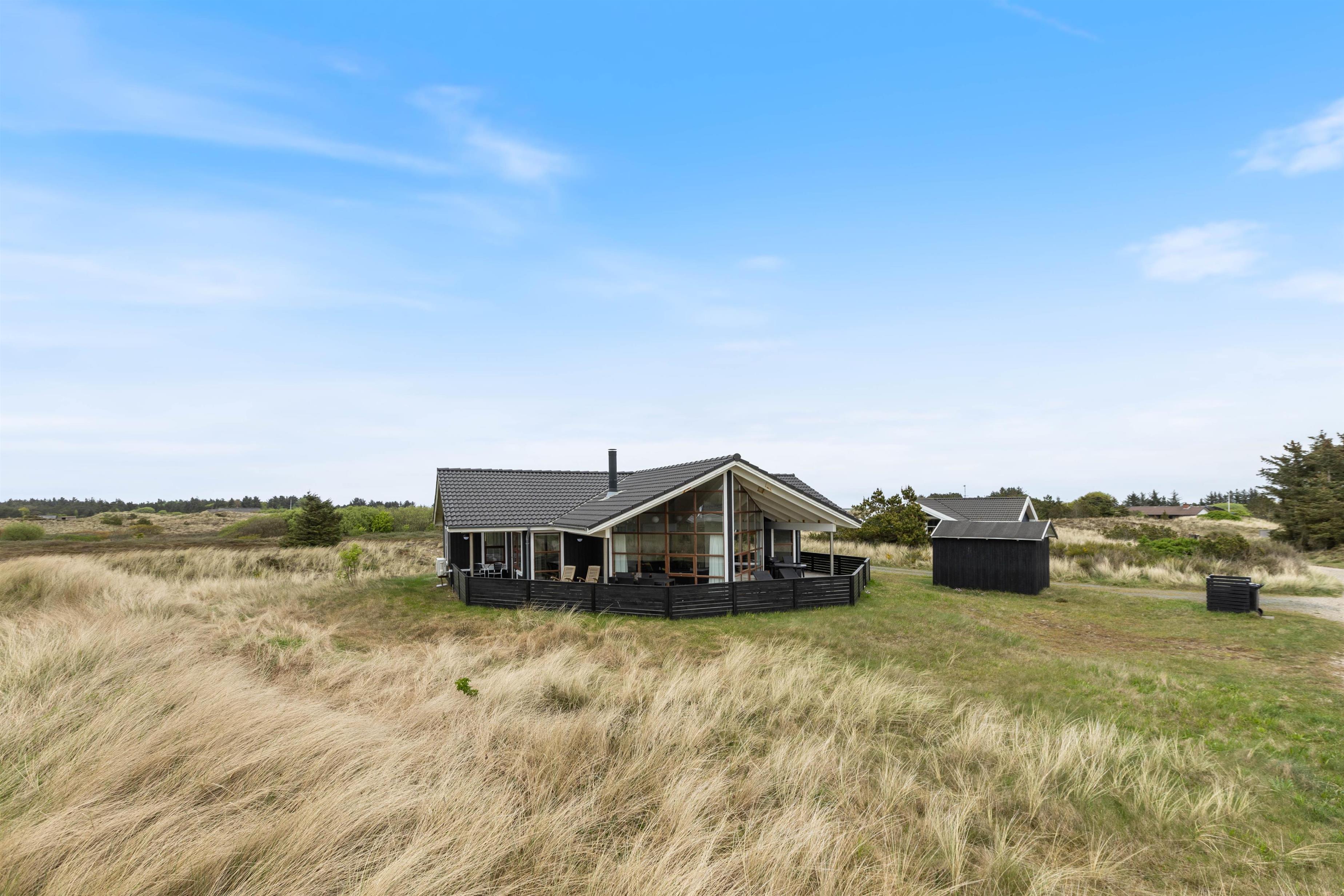 Sommerhuset er omgivet af en delvist overdækket træterrasse. Afhængigt af solens position og vindretningen kan du altid finde en krog, hvor du kan trække dig tilbage med en god bog og en kop te. Eller du kan solbade i liggestolene og trække dig ind i skyggen, når solen bliver for stærk. Imens kan børnene gå på opdagelse på naturgrunden. Hvad med et spil vikingeskak? Når dagen går på hæld, kan I tænde op i grillen og nyde et lækkert grillmåltid, imens solen går ned bag klitterne. Med under 1 kilometer til stranden kan I nå at nyde solnedgangen i Vesterhavet. Det er altid en storslået oplevelse.