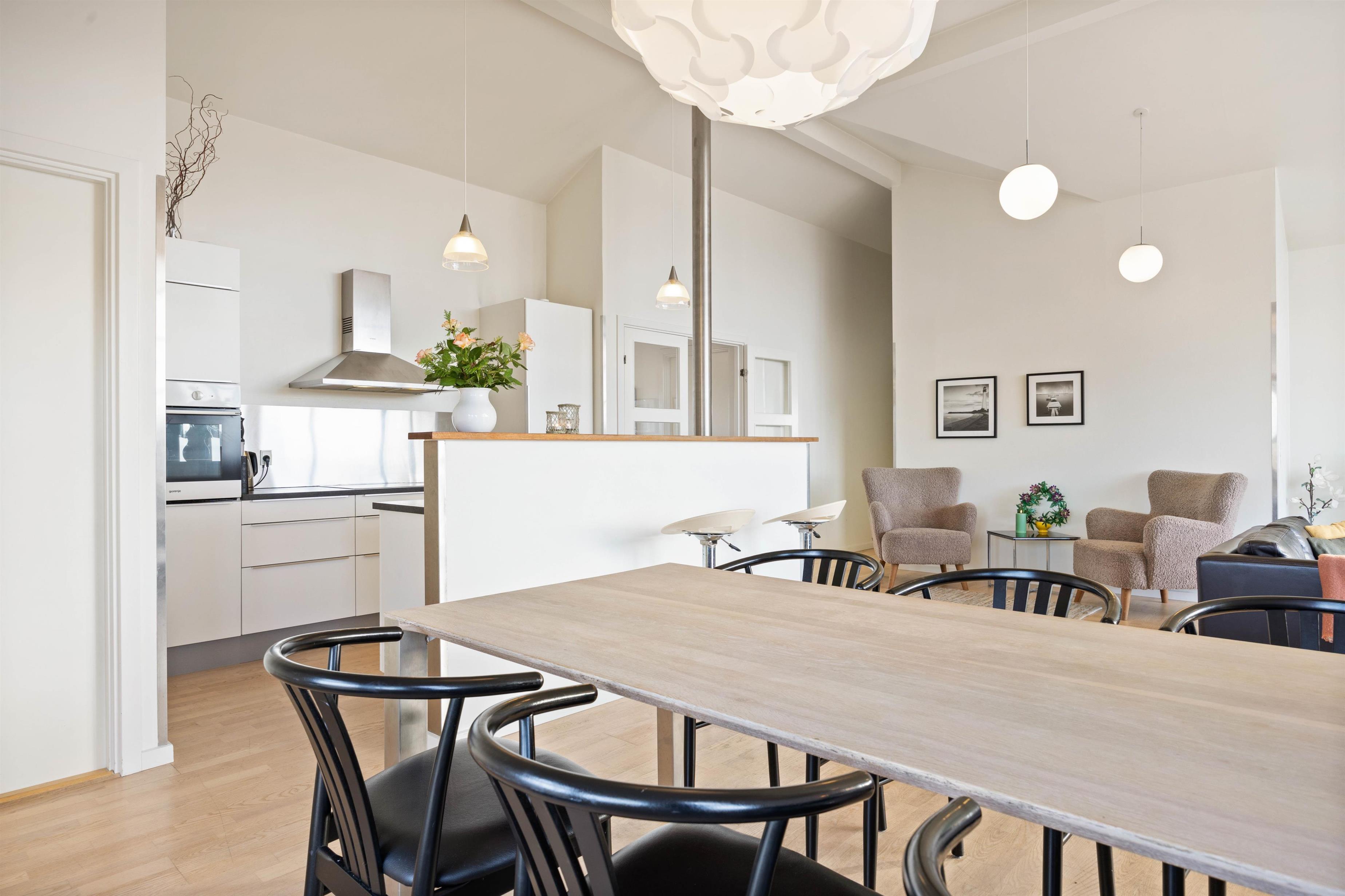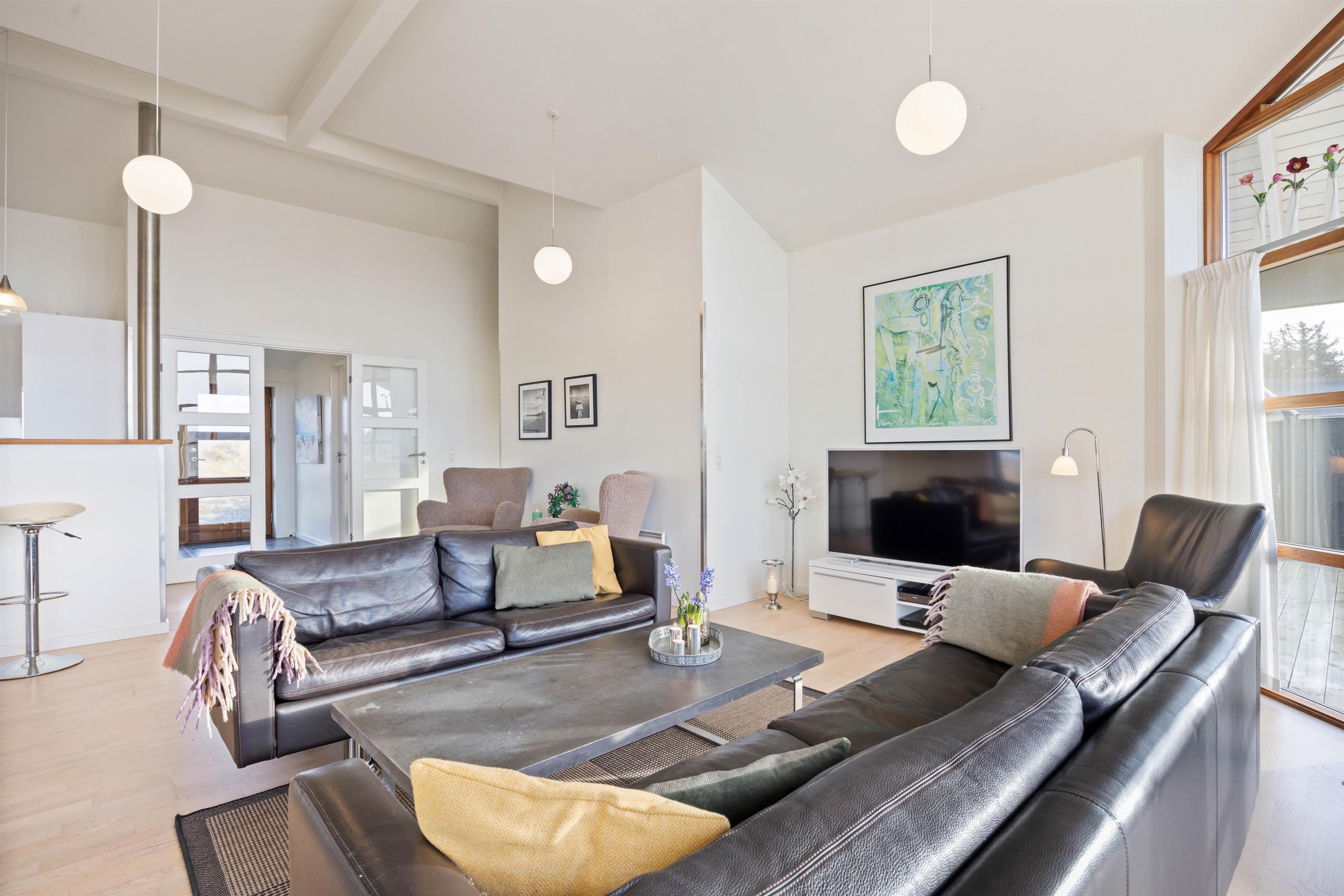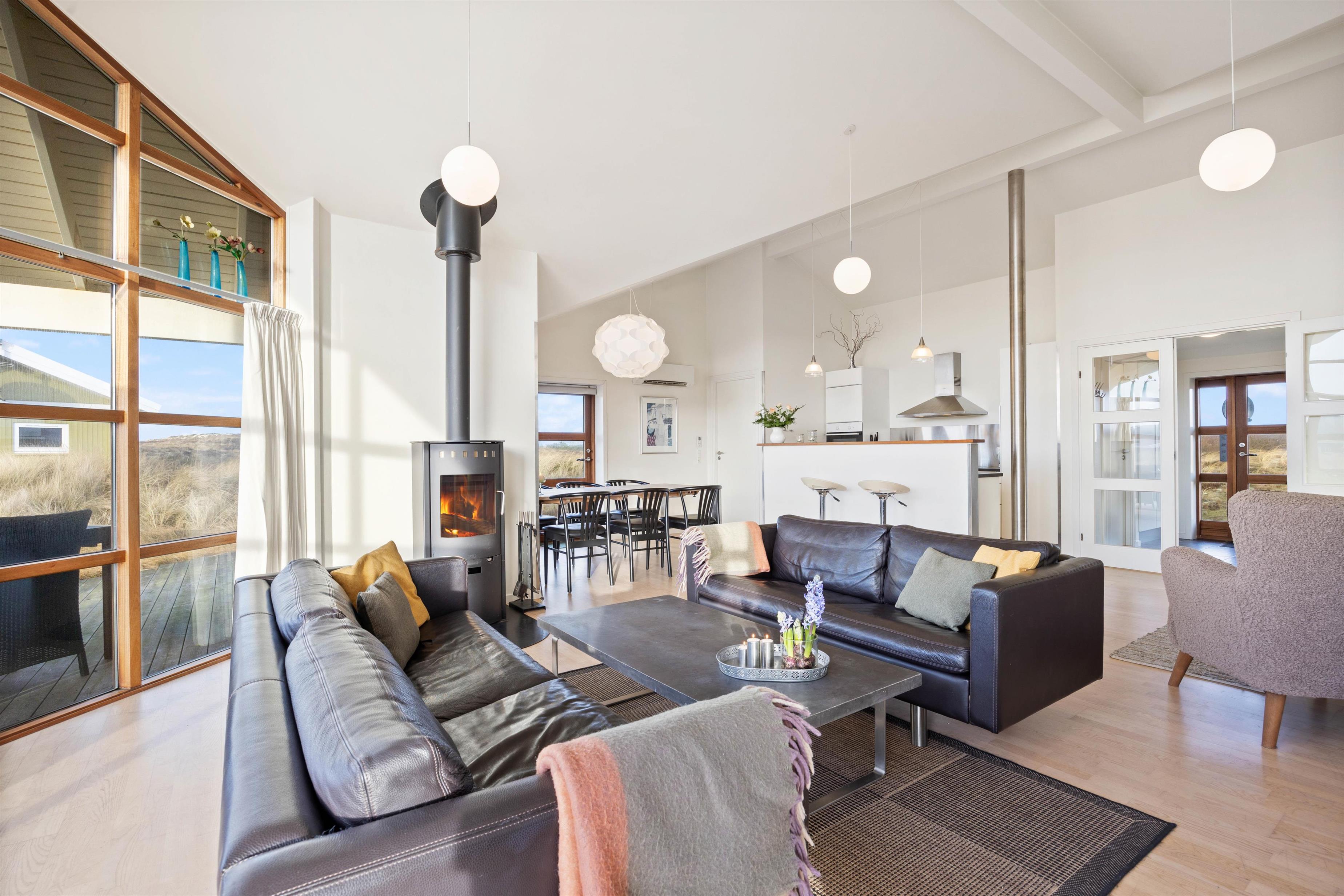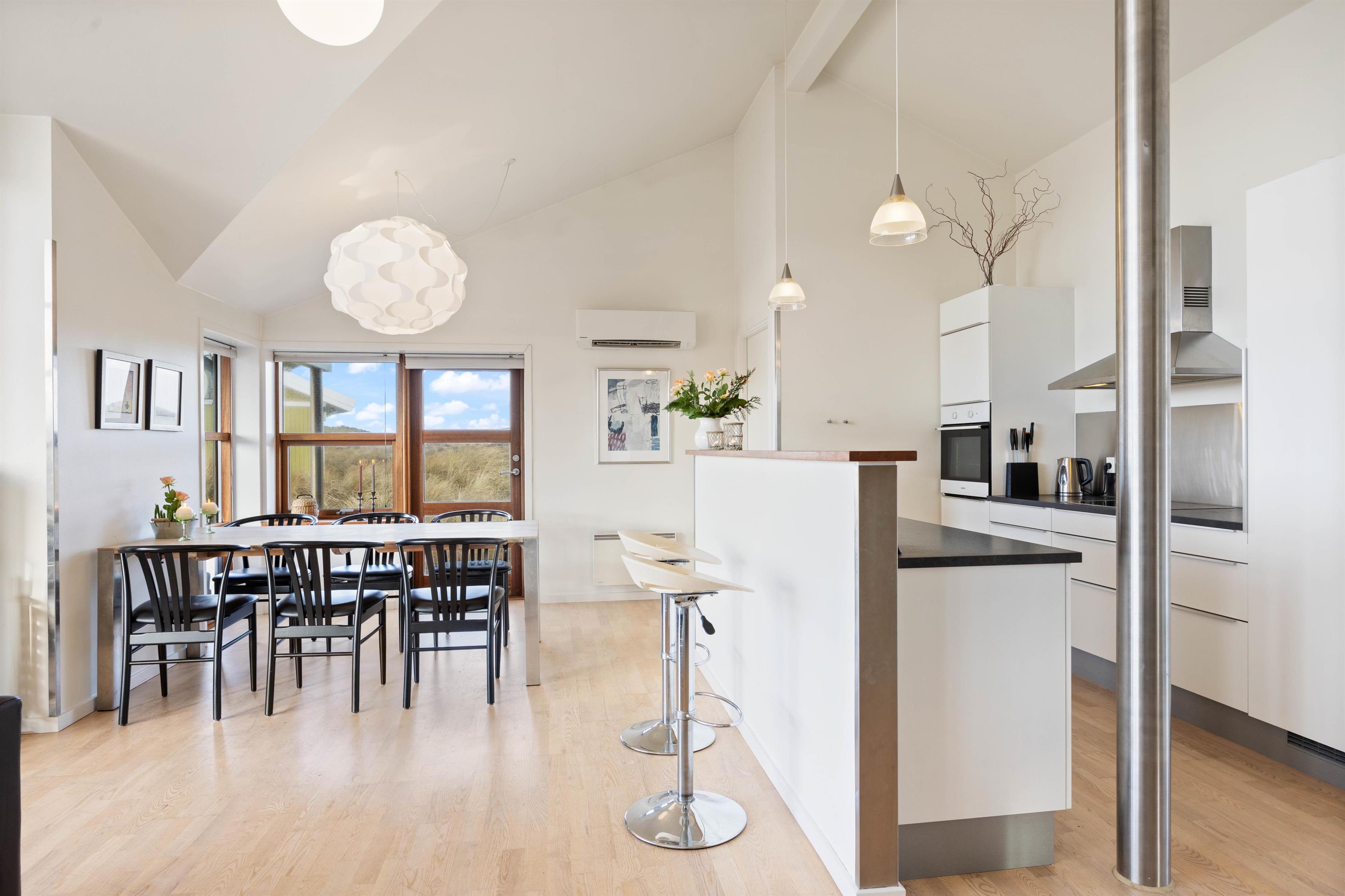 På Bjerregårdsvej 34B føler du dig hjemme, så snart du træder ind ad døren. Centrum er det store opholdsrum med den lyse og åbne indretning. Lysindfaldet gennem de fine vinduespartier og loft op i kip sætter feriestemningen i top. Sæt dig godt til rette i sofaen, og slap af med et glas vin og pejsens knitren i baggrunden. Det åbne køkken indeholder alt, hvad du behøver for at forkæle familien med hjemmelavede måltider eller afprøve et par egnsretter. Køb for eksempel frisk fisk eller bakskuld med hjem fra en af Hvide Sandes mange fiskeforretninger.