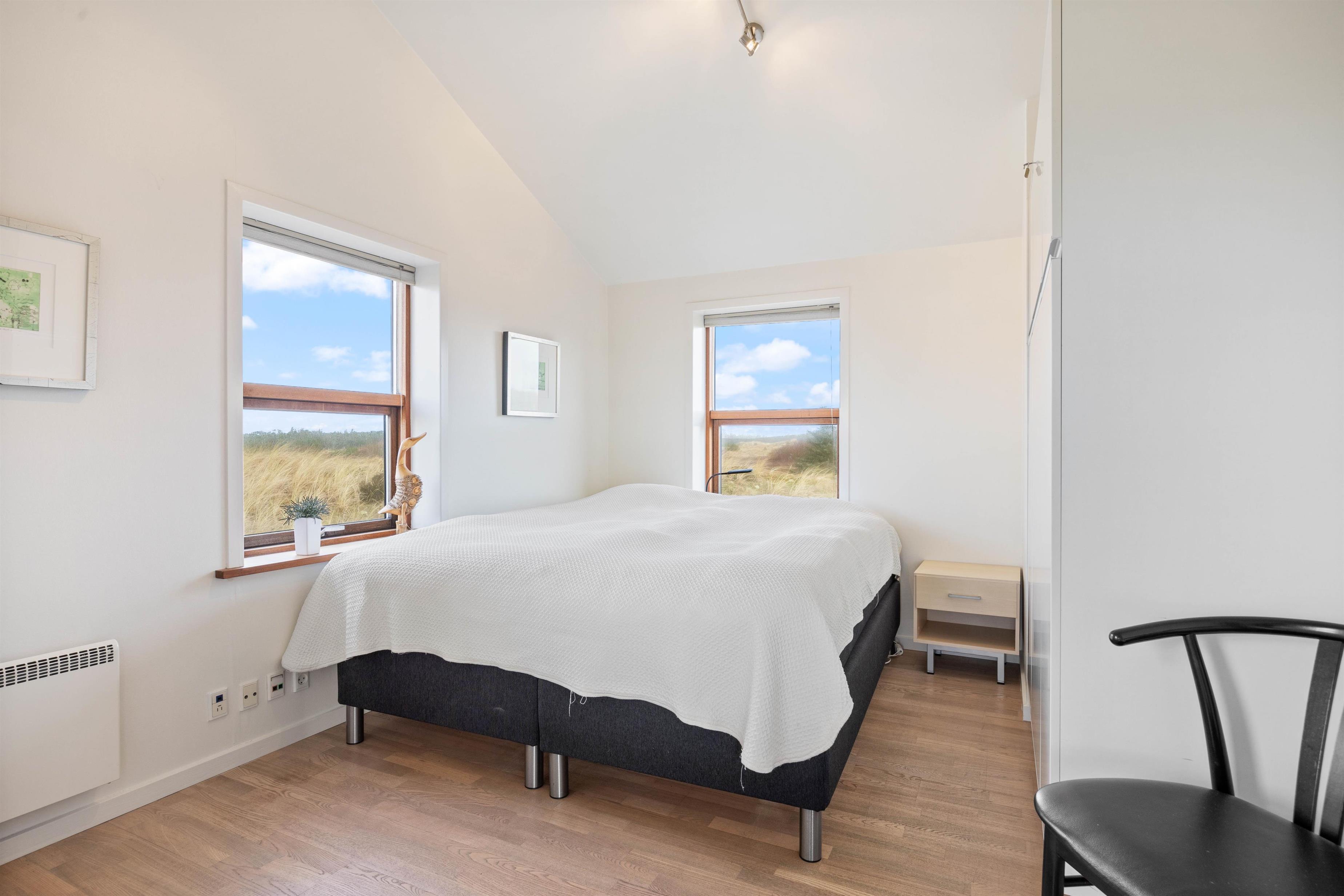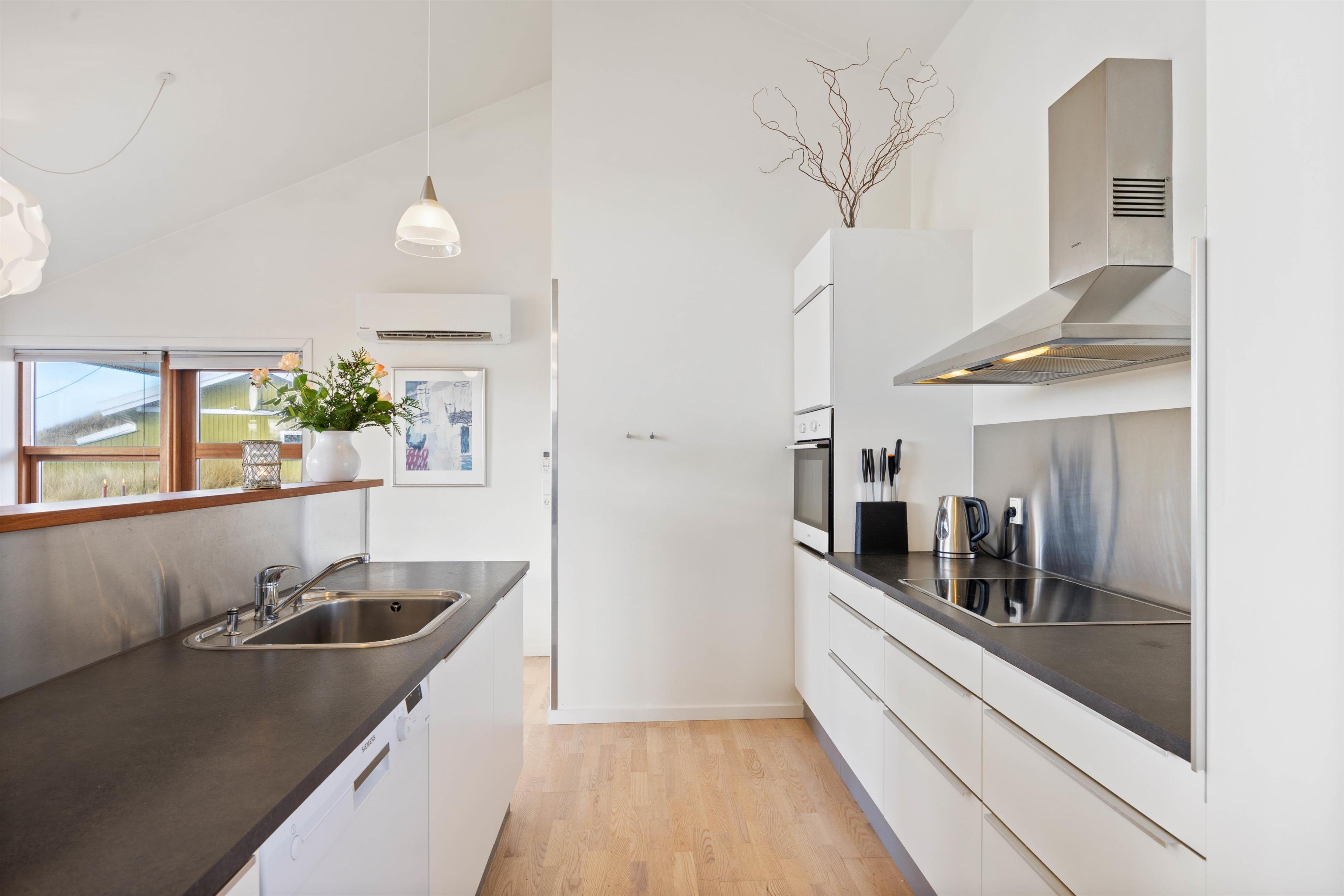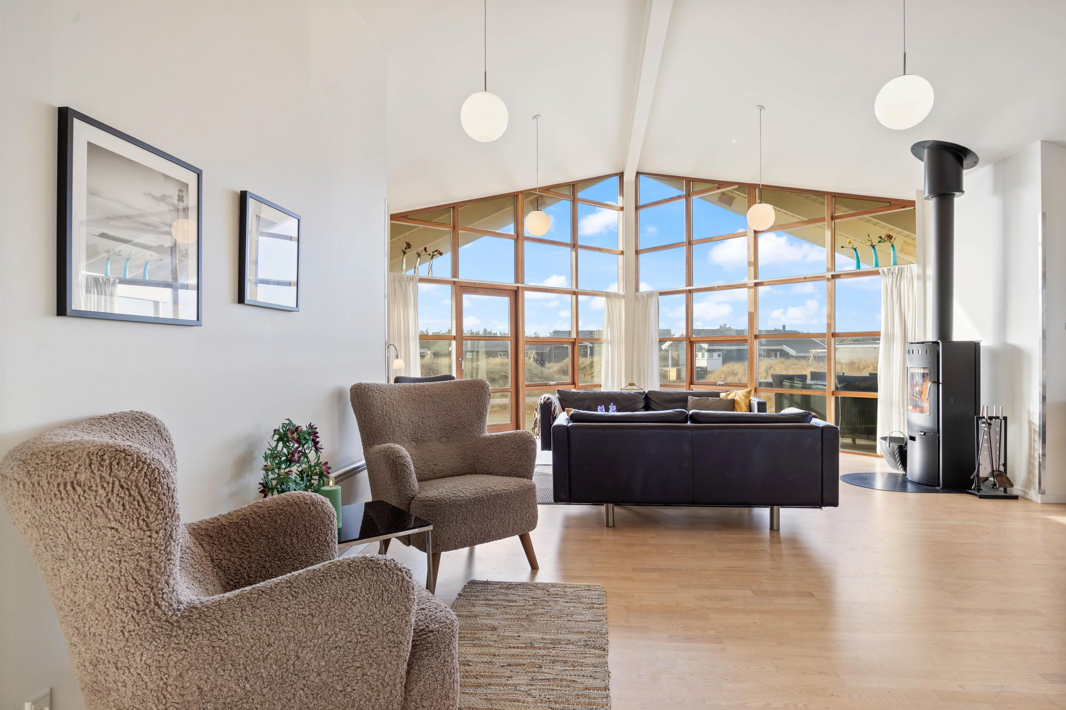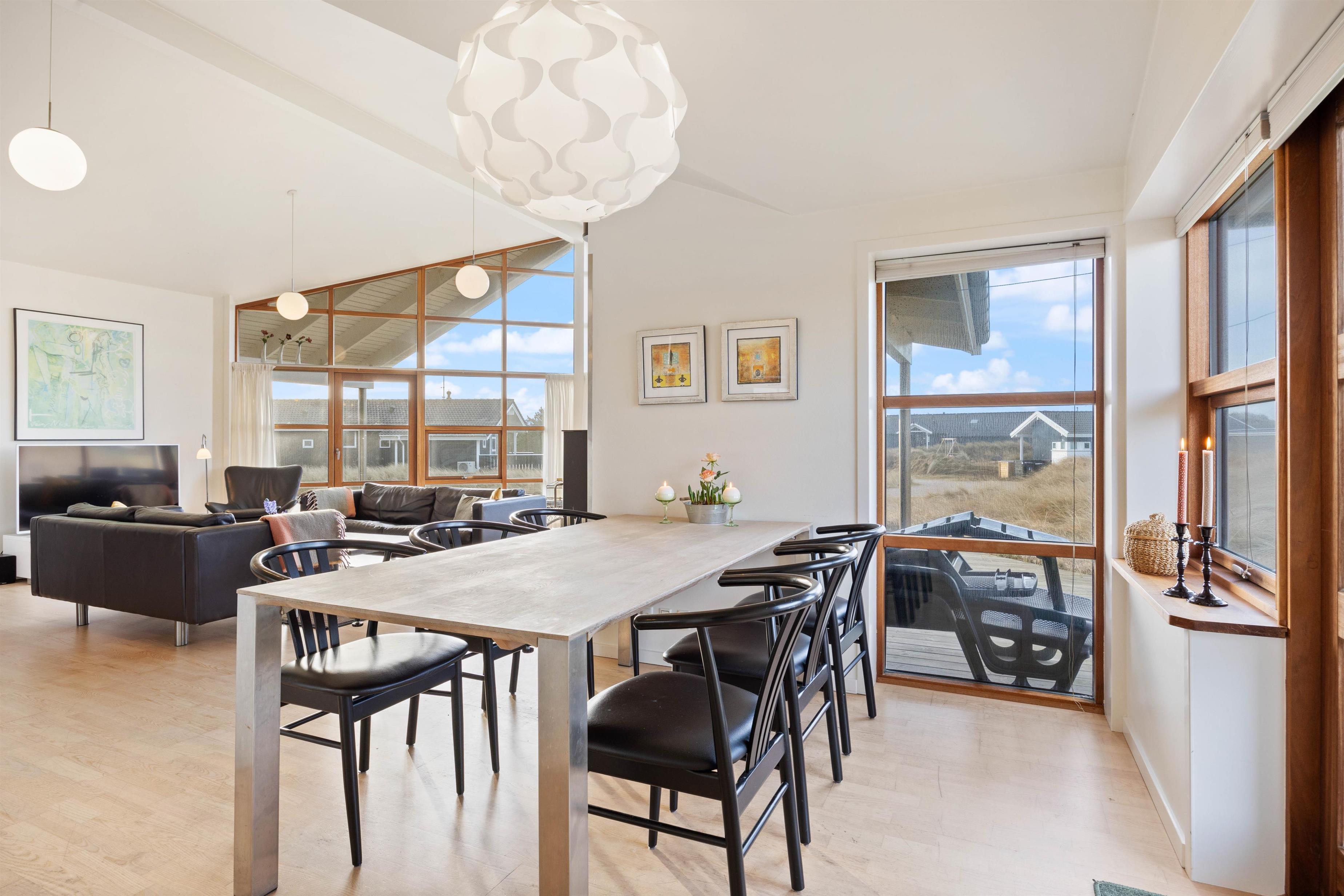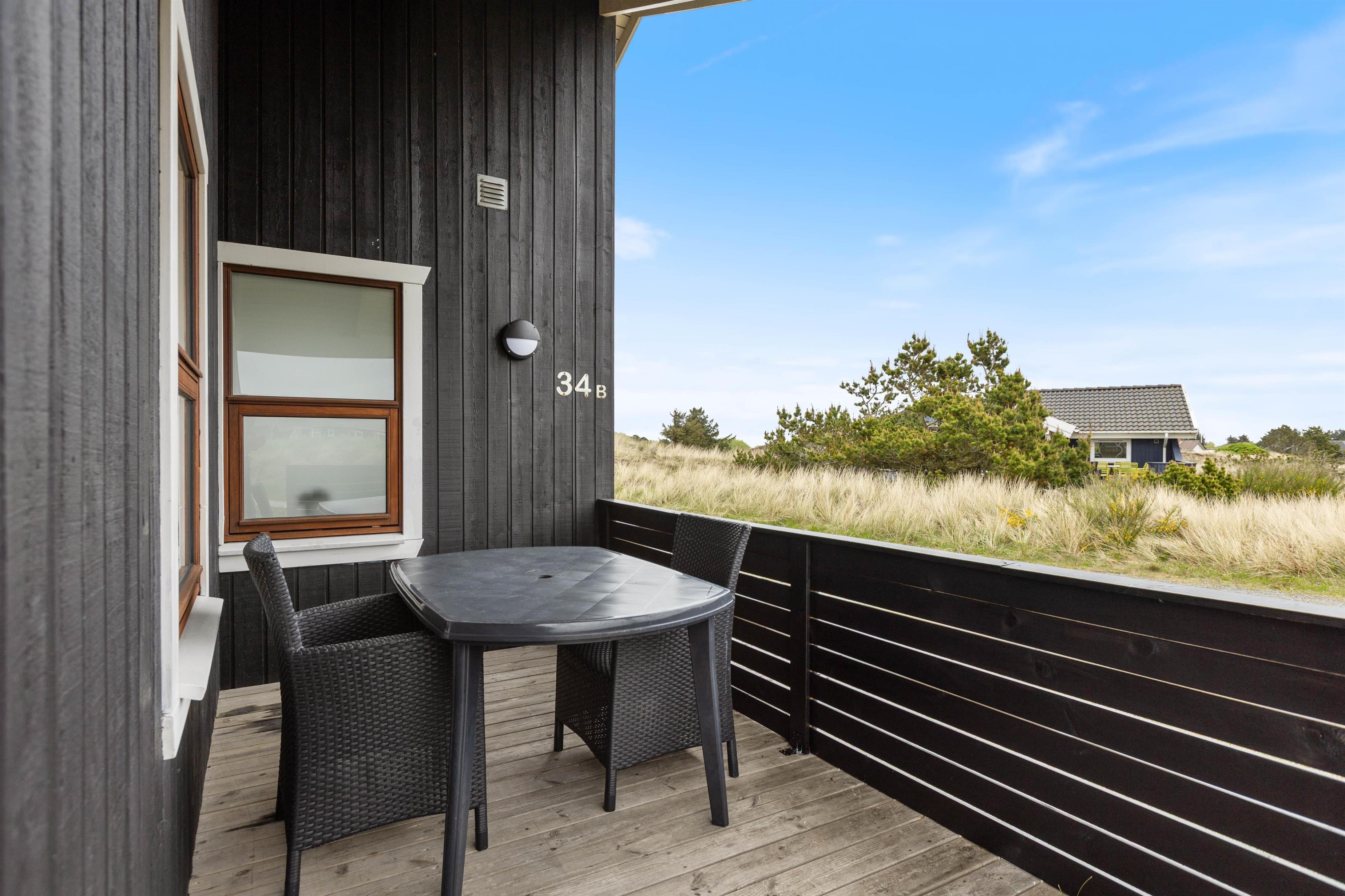 På Bjerregårdsvej 34B føler du dig hjemme, så snart du træder ind ad døren. Centrum er det store opholdsrum med den lyse og åbne indretning. Lysindfaldet gennem de fine vinduespartier og loft op i kip sætter feriestemningen i top. Sæt dig godt til rette i sofaen, og slap af med et glas vin og pejsens knitren i baggrunden. Det åbne køkken indeholder alt, hvad du behøver for at forkæle familien med hjemmelavede måltider eller afprøve et par egnsretter. Køb for eksempel frisk fisk eller bakskuld med hjem fra en af Hvide Sandes mange fiskeforretninger.