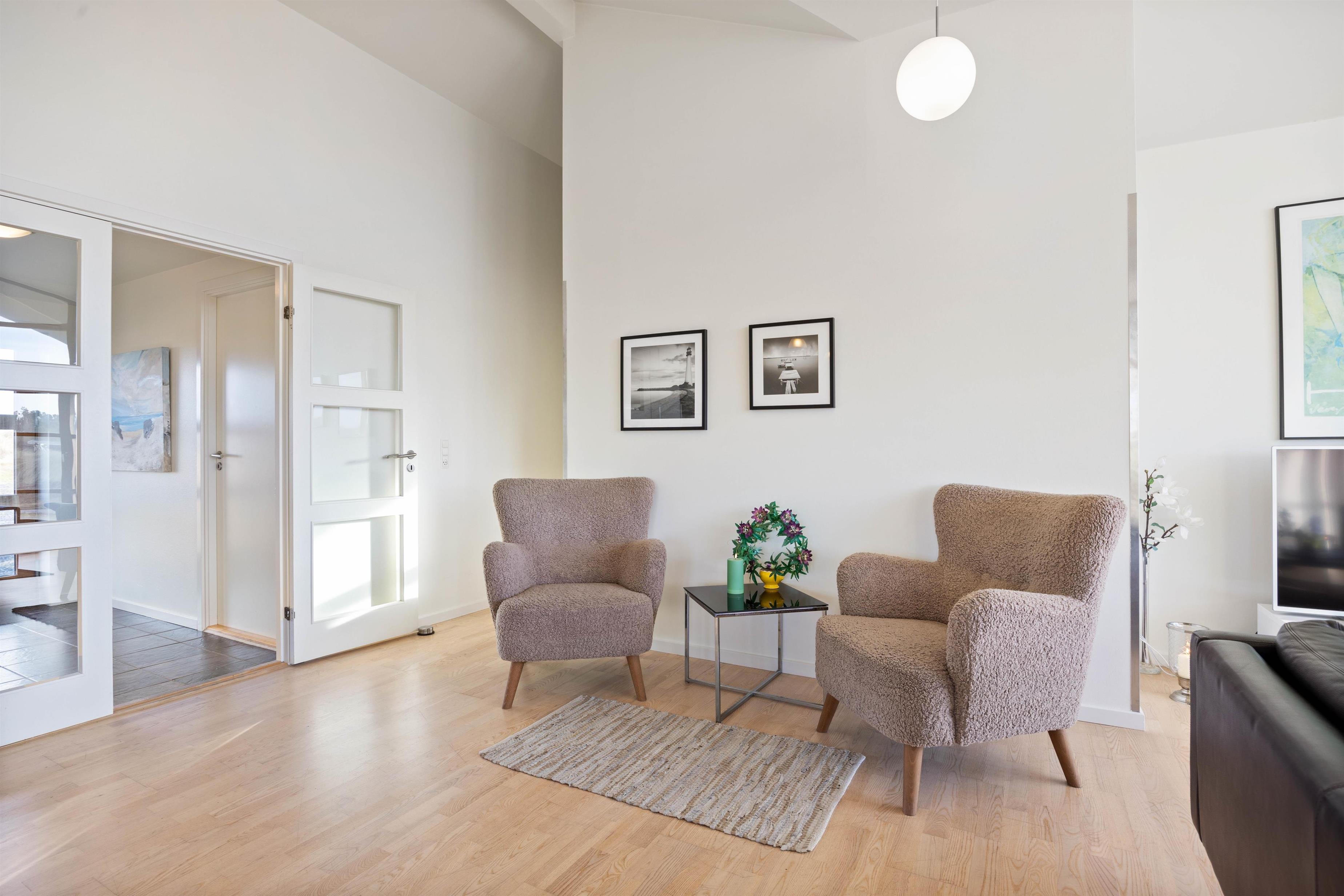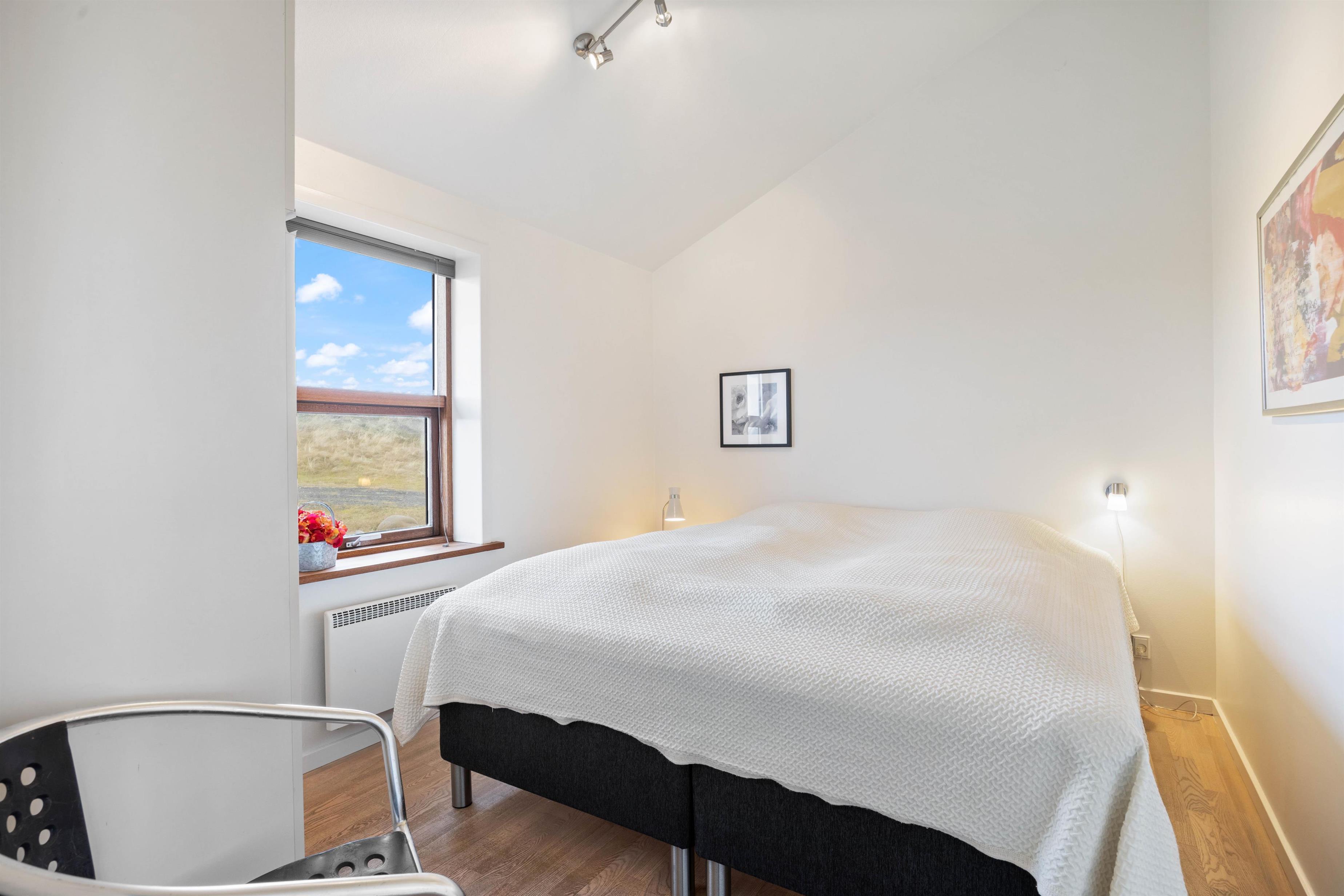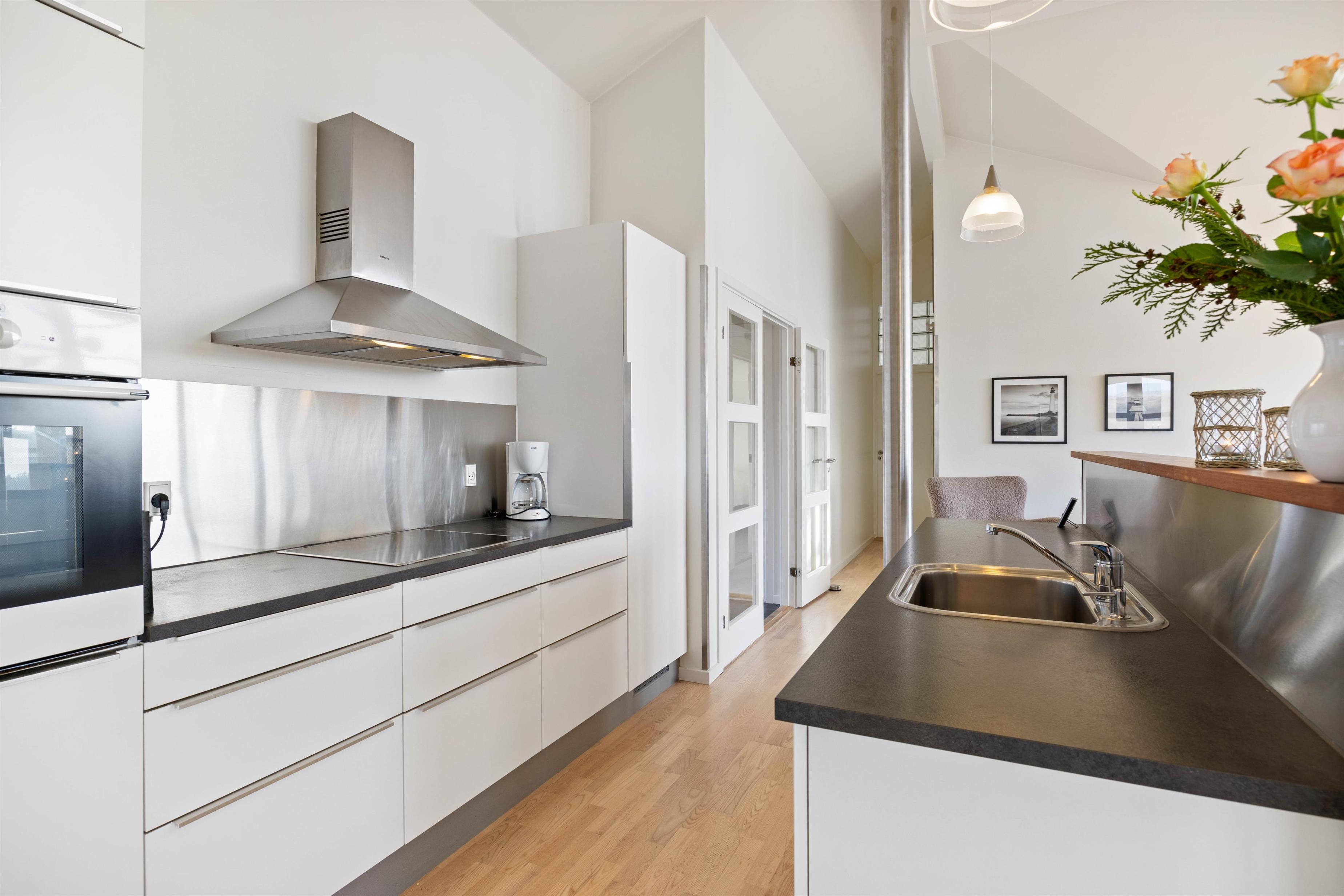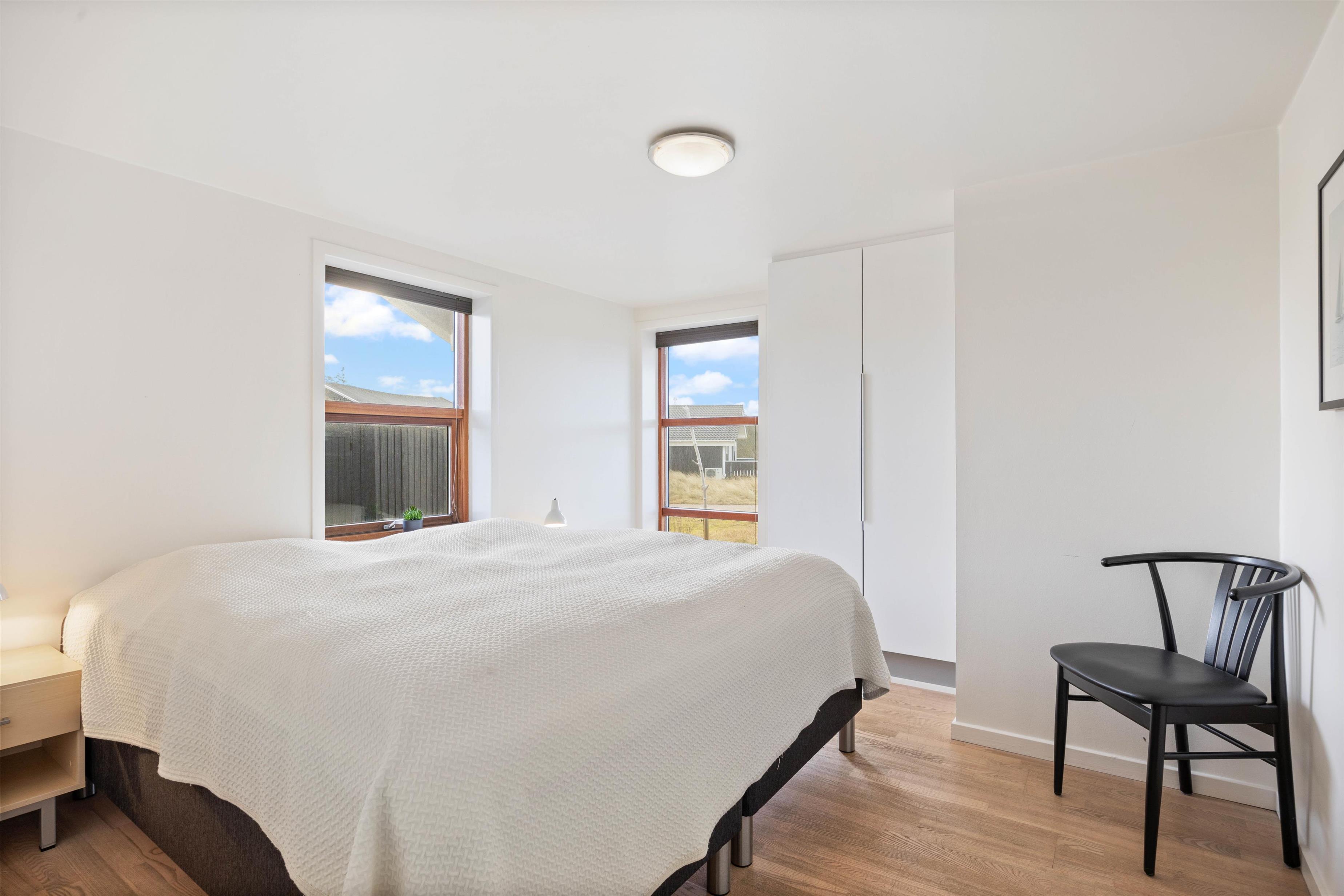 På Bjerregårdsvej 34B føler du dig hjemme, så snart du træder ind ad døren. Centrum er det store opholdsrum med den lyse og åbne indretning. Lysindfaldet gennem de fine vinduespartier og loft op i kip sætter feriestemningen i top. Sæt dig godt til rette i sofaen, og slap af med et glas vin og pejsens knitren i baggrunden. Det åbne køkken indeholder alt, hvad du behøver for at forkæle familien med hjemmelavede måltider eller afprøve et par egnsretter. Køb for eksempel frisk fisk eller bakskuld med hjem fra en af Hvide Sandes mange fiskeforretninger.