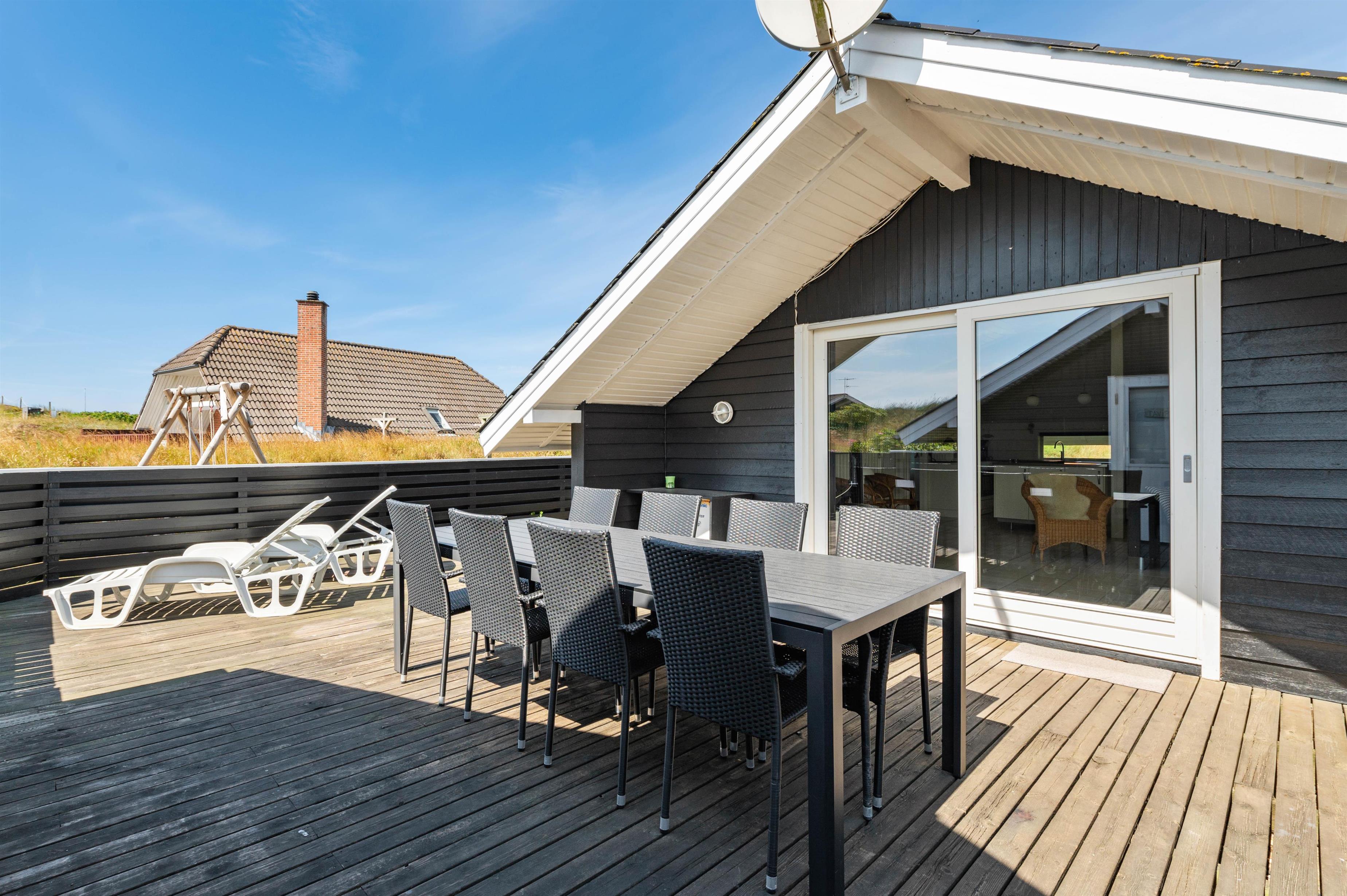 På den rummelige terrasse kan I ikke kun nyde de skønne, solrige dage i liggestolene, men også de mere blæsende dage, da terrassen er delvist lukket med god læ. Her kan I også nyde et dejligt morgenmåltid i solens stråler med friskt, nybagt brød fra købmandens bagerafdeling – eller måske en kop eftermiddagskaffe med et lille stykke kage til.