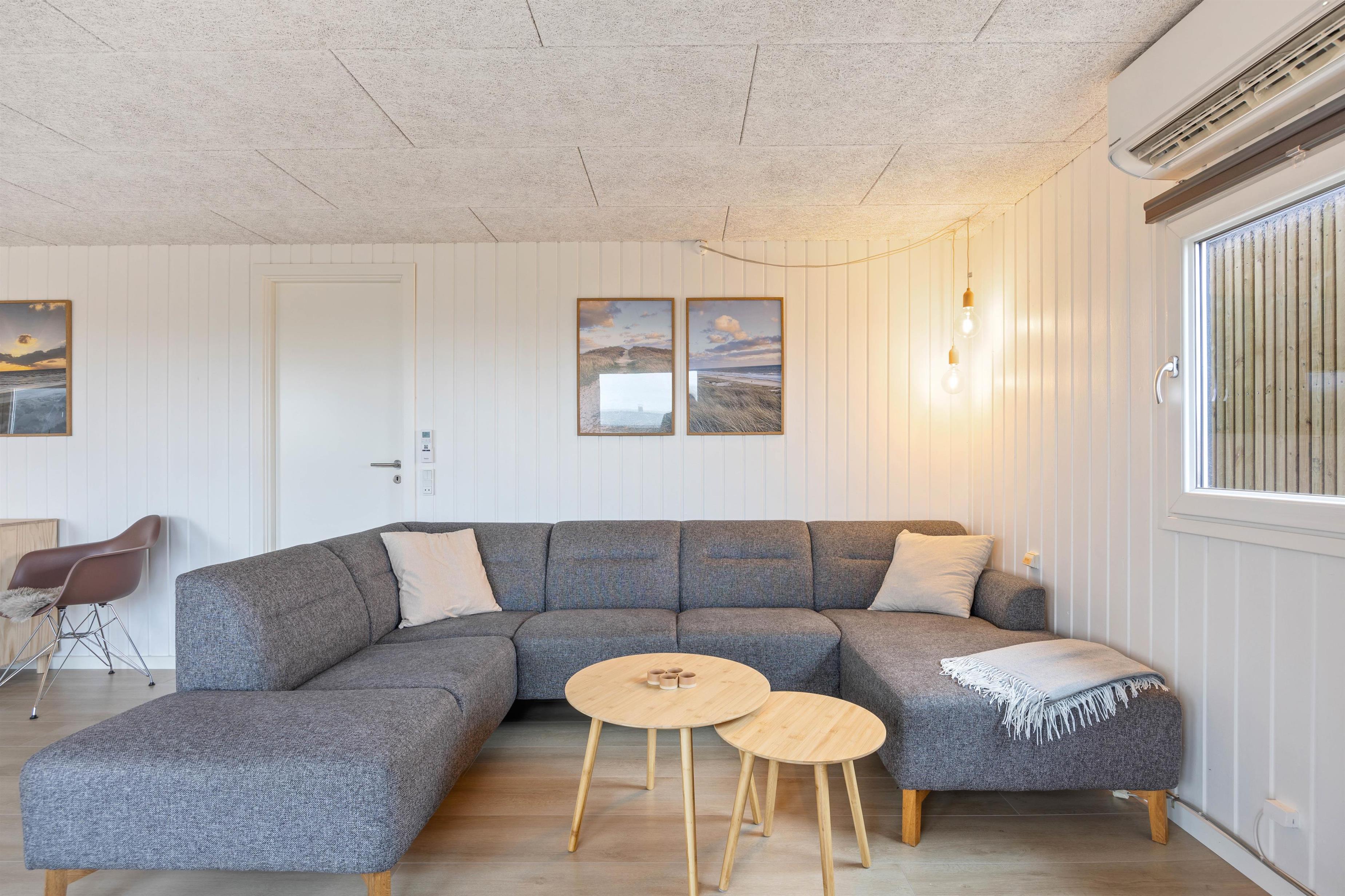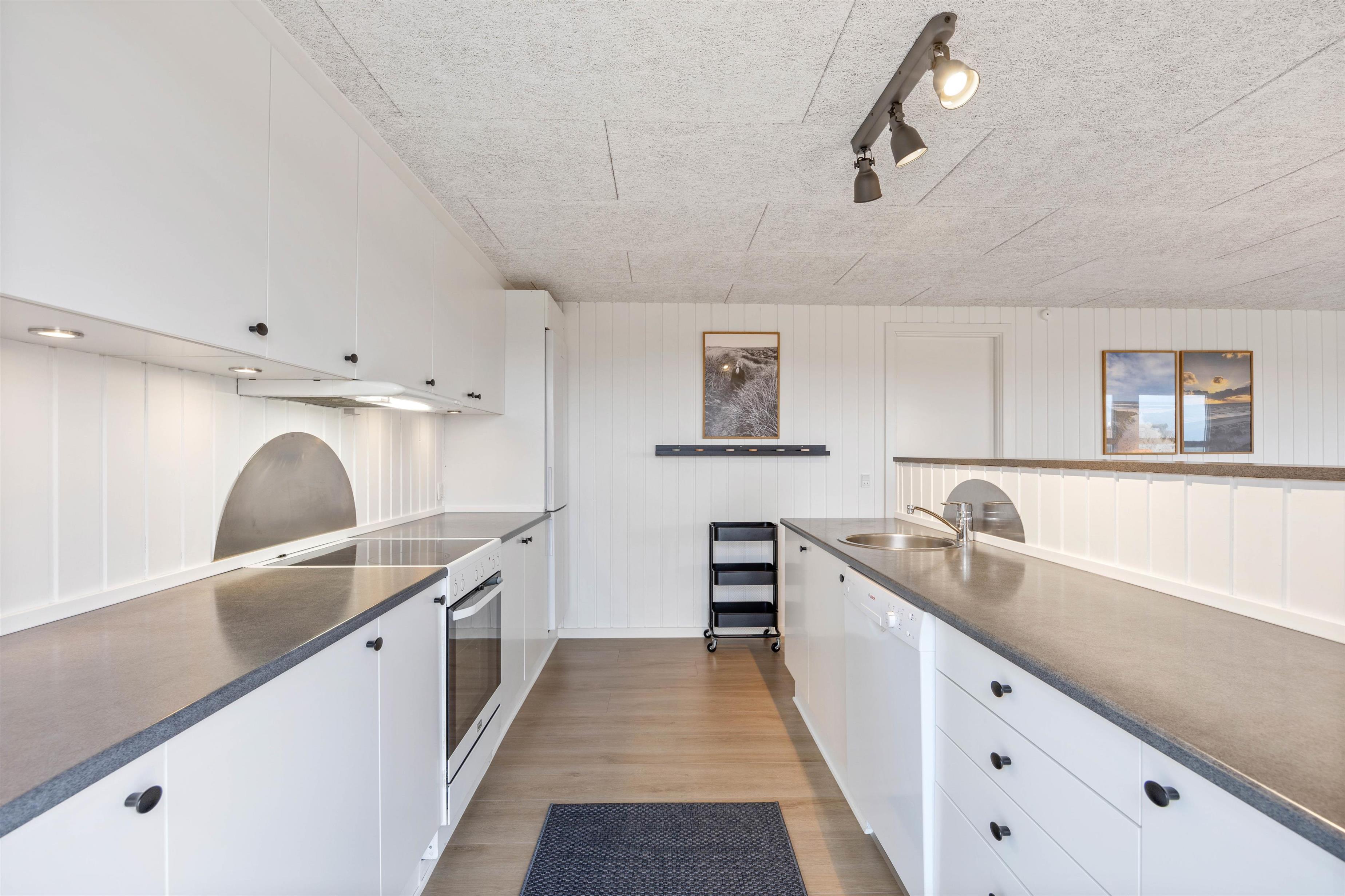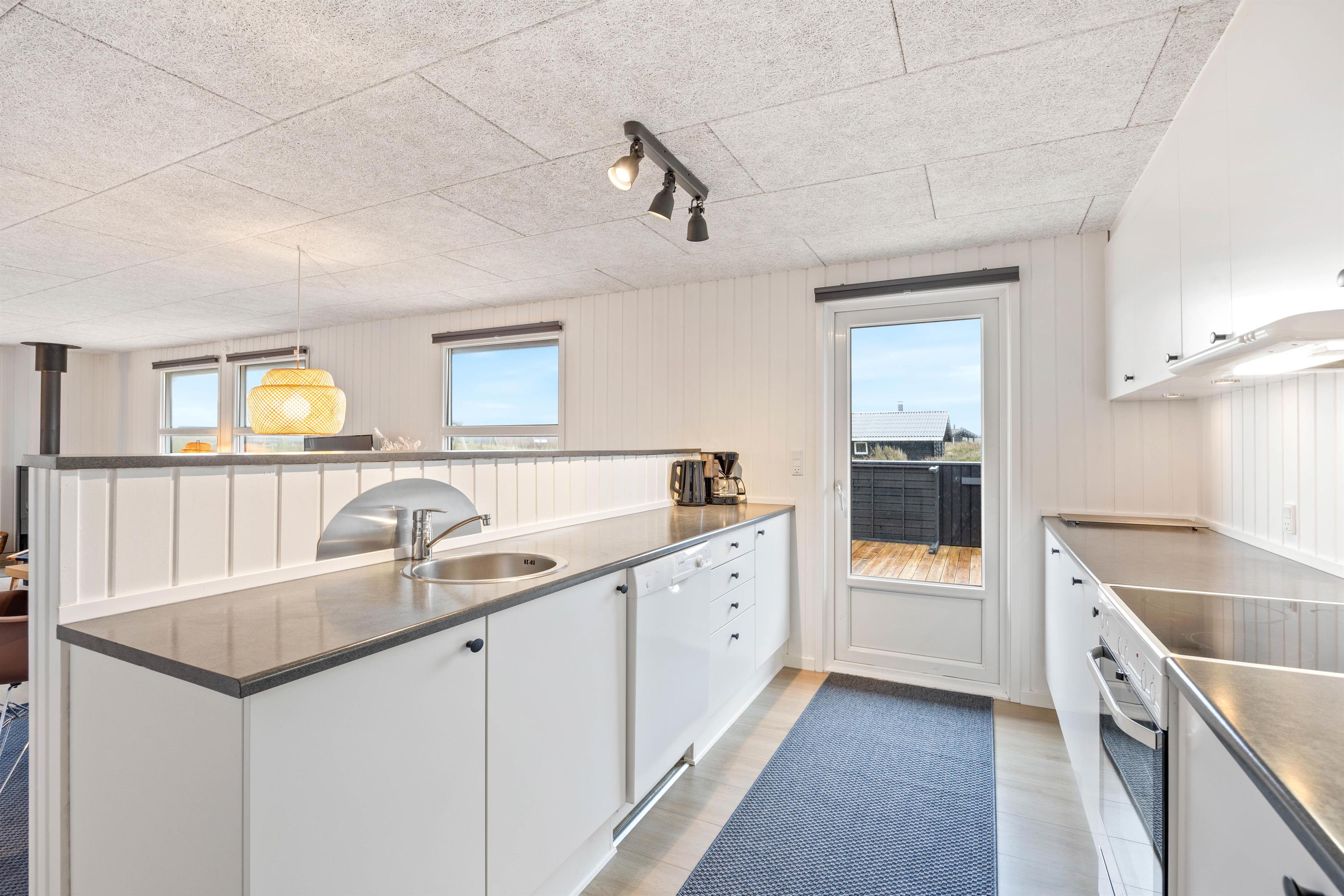 De brede vinduespartier giver et fint lysindfald i den hyggelige opholdsstue med komfortable møbler. Her kan I slappe af ved den knitrende ild i brændeovnen eller følge med i, hvad der sker på den lukkede terrasse udenfor. Det åbne køkken indeholder alt, hvad I har brug for til at forkæle hinanden med lækre måltider – og masser af opbevaringsplads. Desuden er der udgang til terrassen fra køkkenet. I badeværelset er der gulvvarme, så I behøver ikke at frygte kolde fødder. De 2 soveværelser indeholder henholdsvis en dobbeltseng og 2 enkeltsenge, hvor I kan blive rigtig godt udhvilede. Læg mærke til, at den friske vesterhavsluft gør noget godt for nattesøvnen.