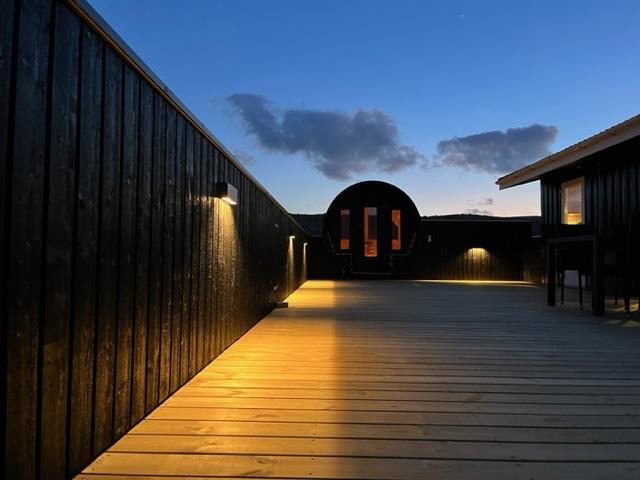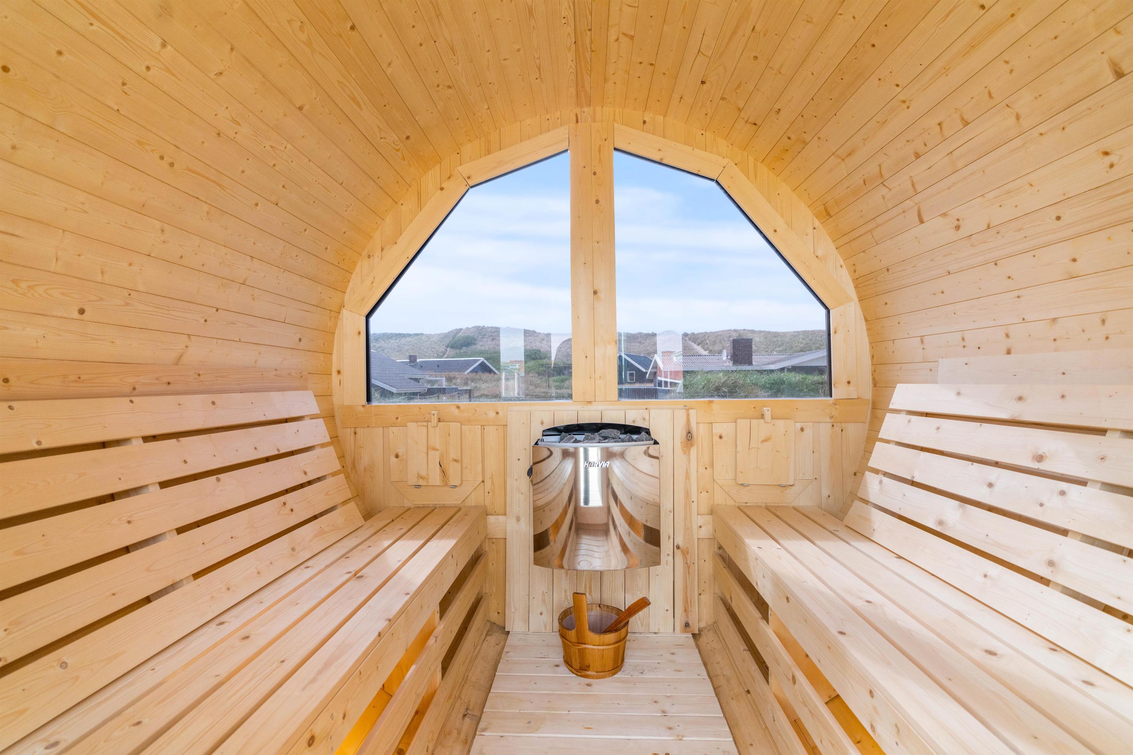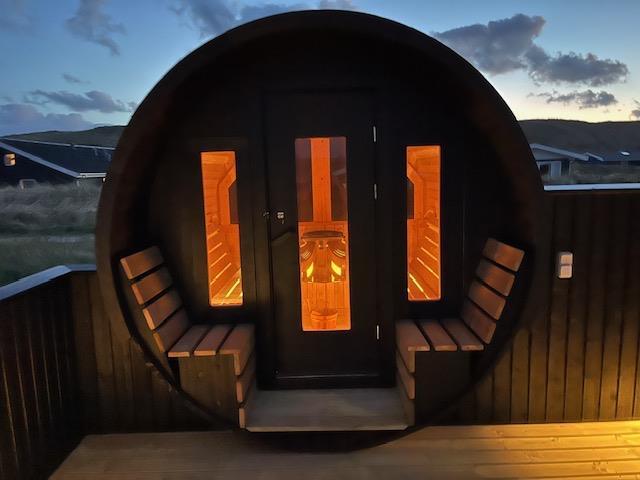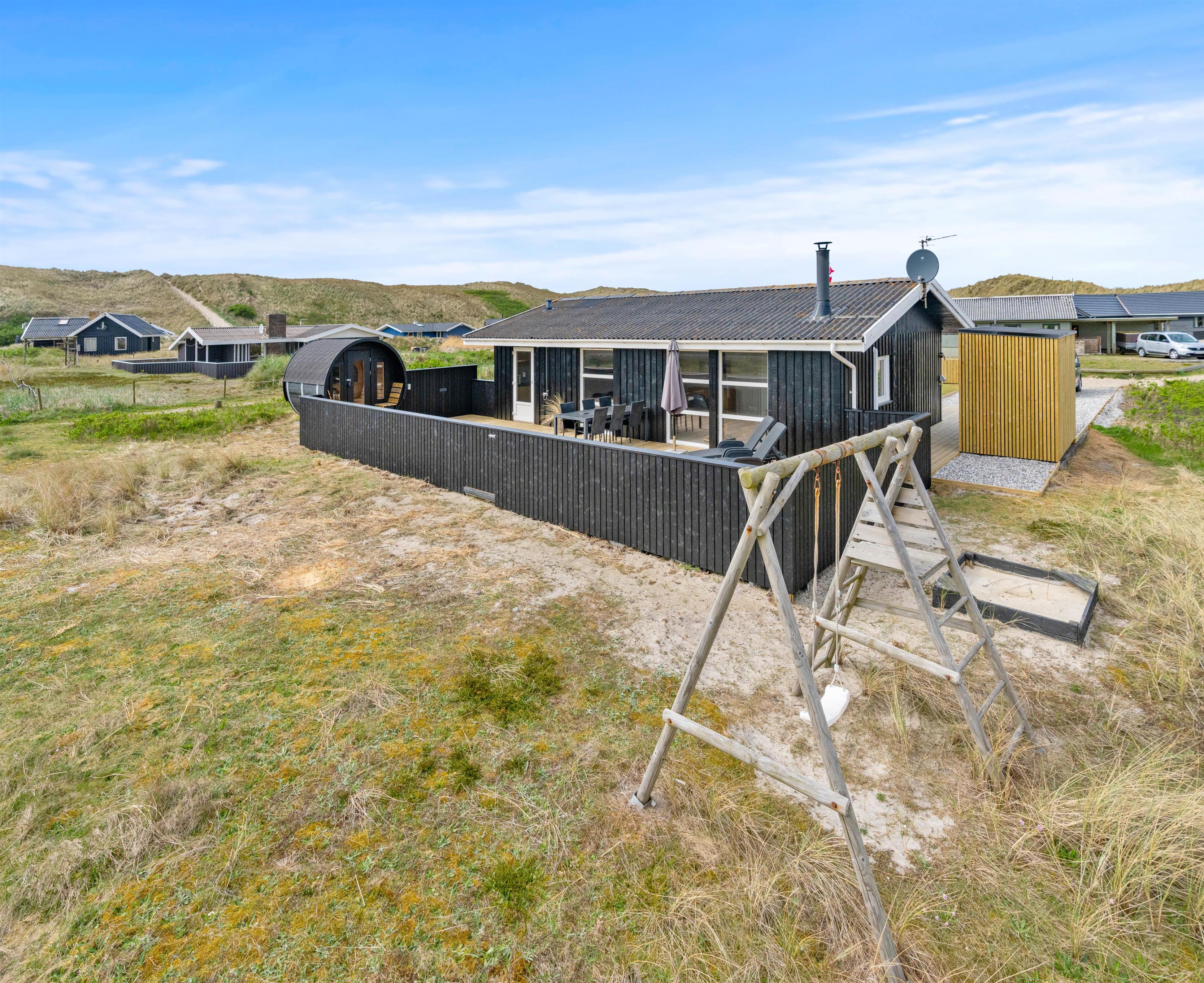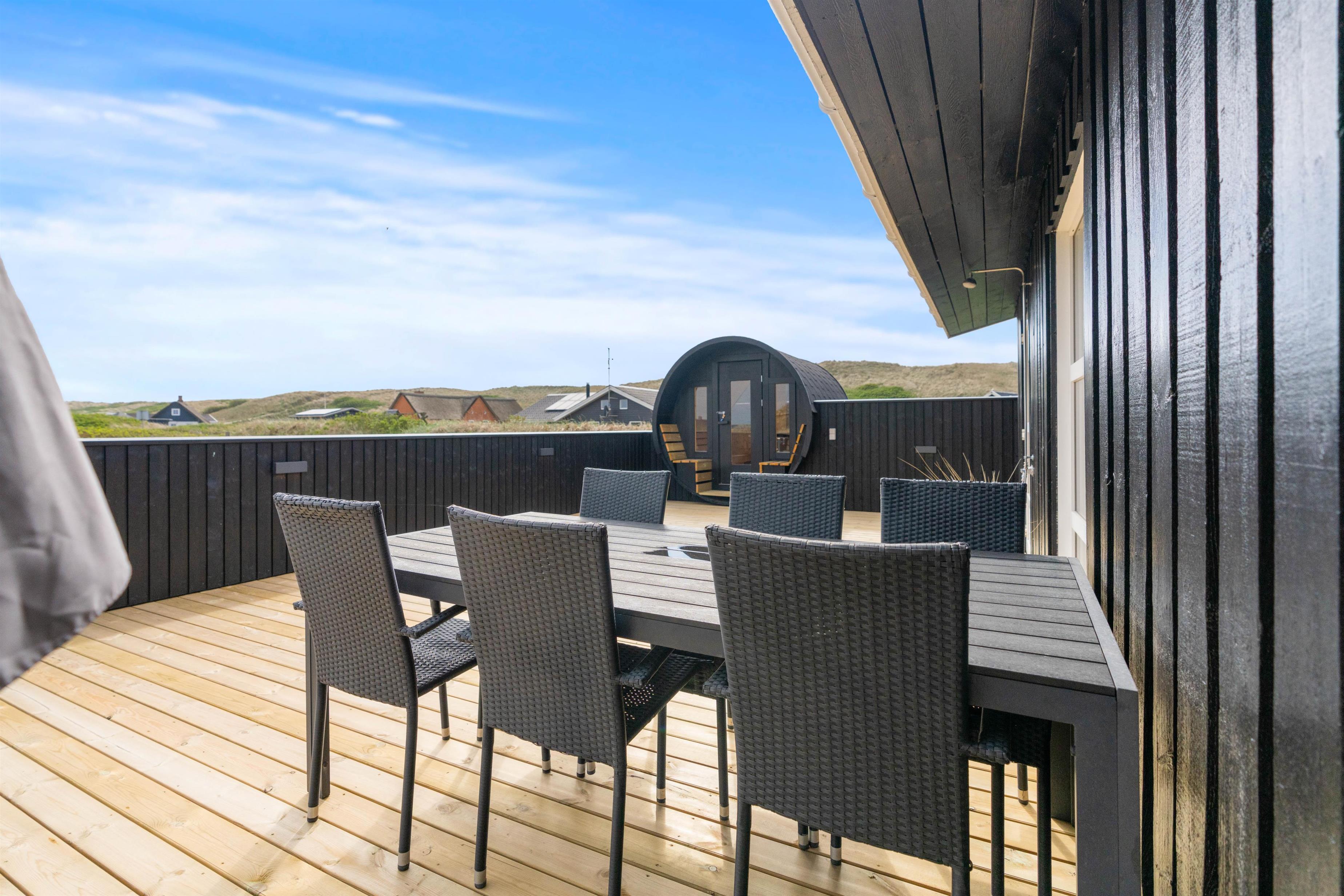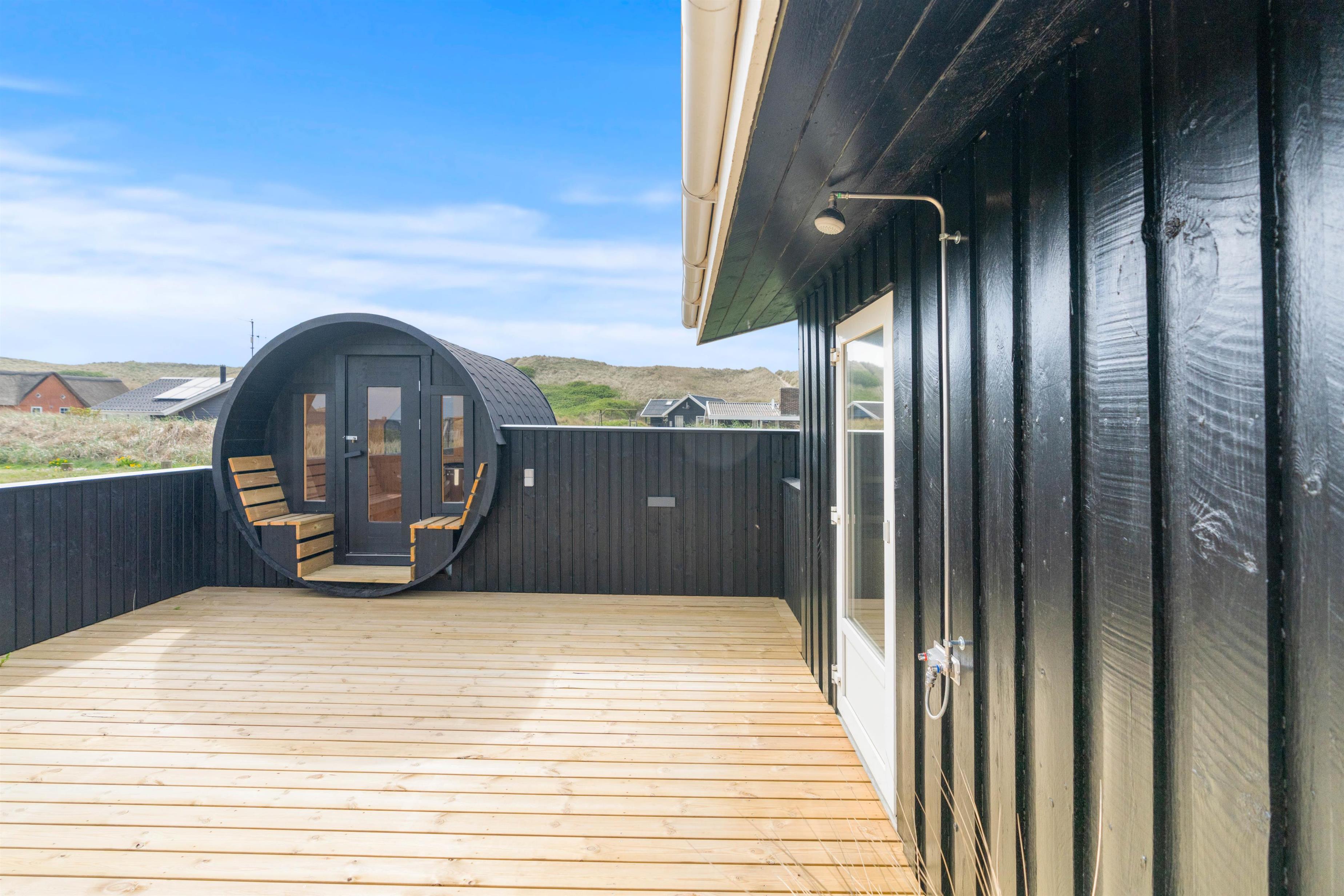 Den lukkede terrasse er ideel til småbørn, eller hvis I har hund med. Her kan I slappe af i de komfortable liggestole og havemøbler uden at frygte, at de løber væk. Til børnene er der gynger og sandkasse på naturgrunden. På en varm dag vil en kold duche under udebruseren gøre underværker, og på kolde dage eller om aftenen vil et muskelafslappende ophold i saunaen også være med til at øge velværet. Udebruseren kan benyttes fra april til november. Tænd op i grillen, og slut dagen af med et lækkert grillmåltid, imens skyggerne bliver lange. En kort gåtur på 150 meter til stranden vil føre jer til en af Danmarks smukkeste solnedgange.