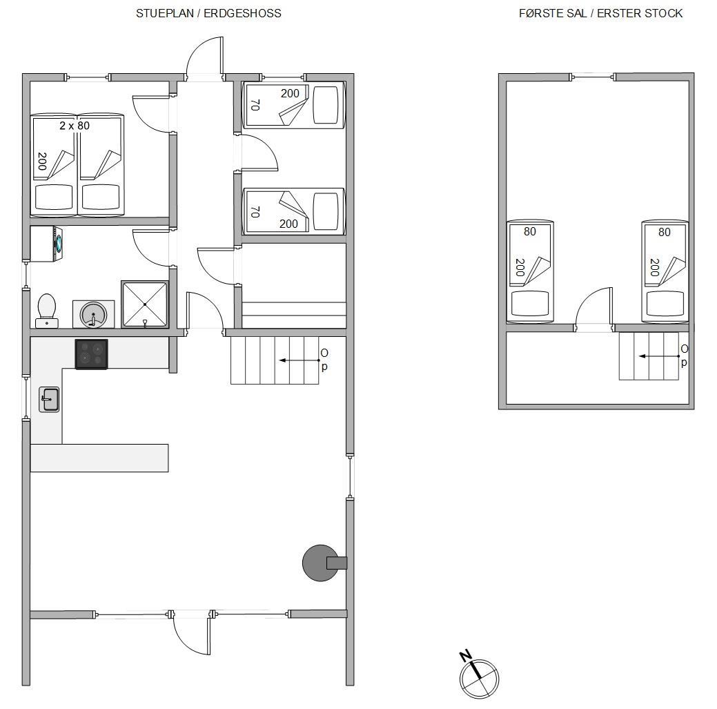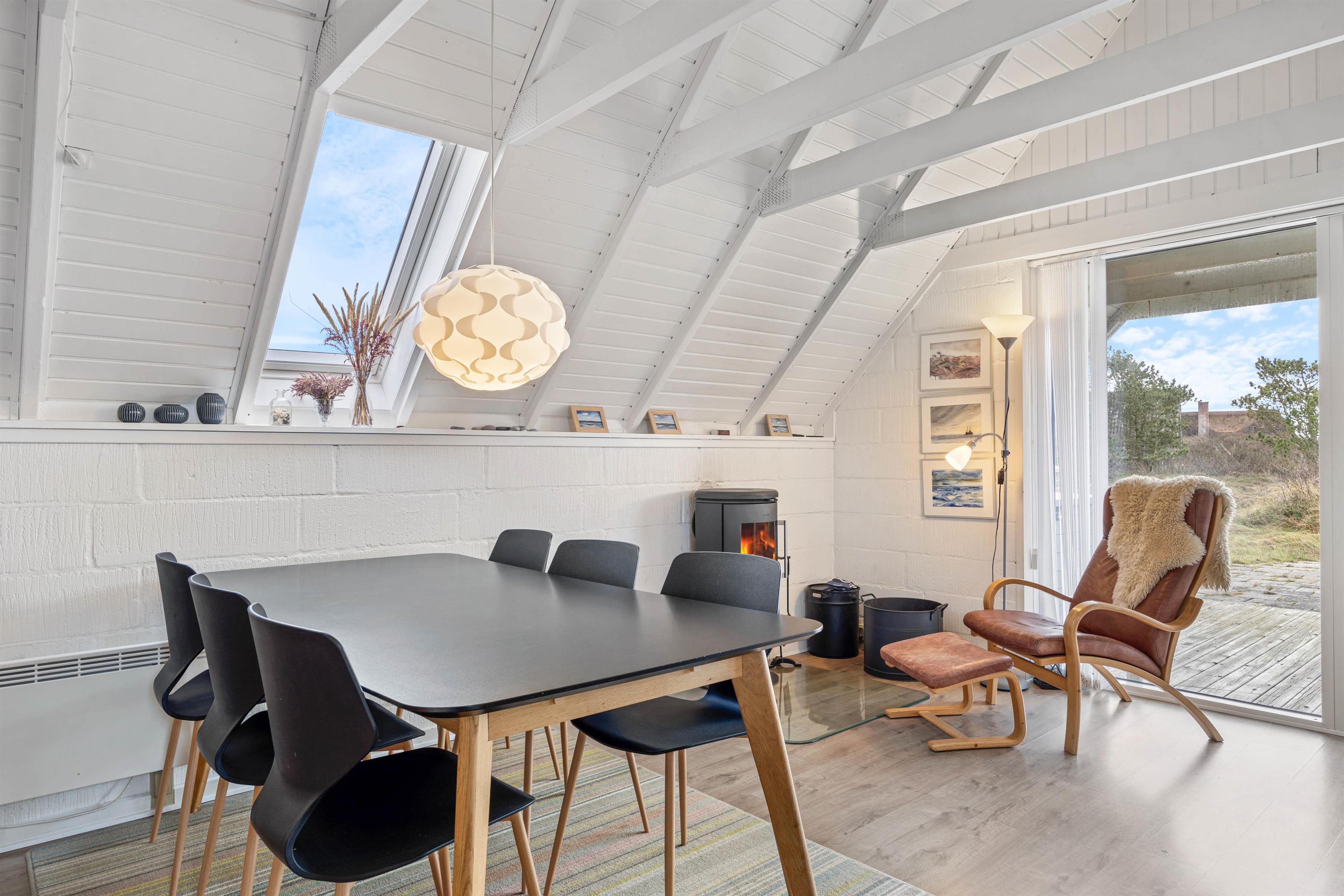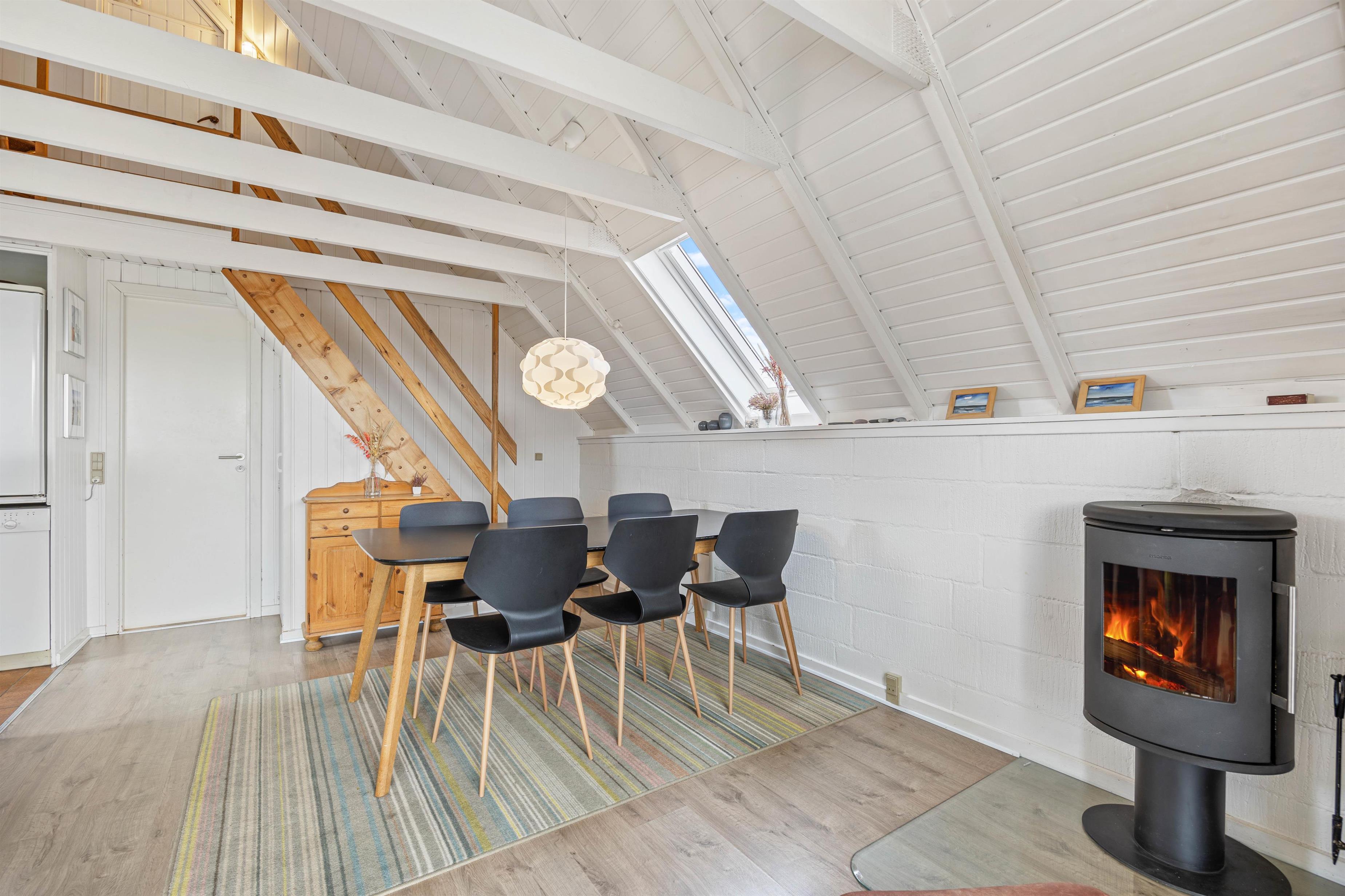 Både vægge og lofter er malet hvide, hvilket skaber en dejlig lys og indbydende stemning i sommerhuset. Samtidig går loftet i det store køkken-alrum til kip. Det skaber en dejlig rumfornemmelse i indretningen. Sommerhusets køkken ligger i åben forbindelse til stue- og spiseområdet med brændeovn. Det betyder, at uanset hvad I laver i feriehuset, så har I en altid en følelse af at være samlet – som familie. Og det er lige præcis det, ferie handler om. At være sammen og slappe af i gode omgivelser.