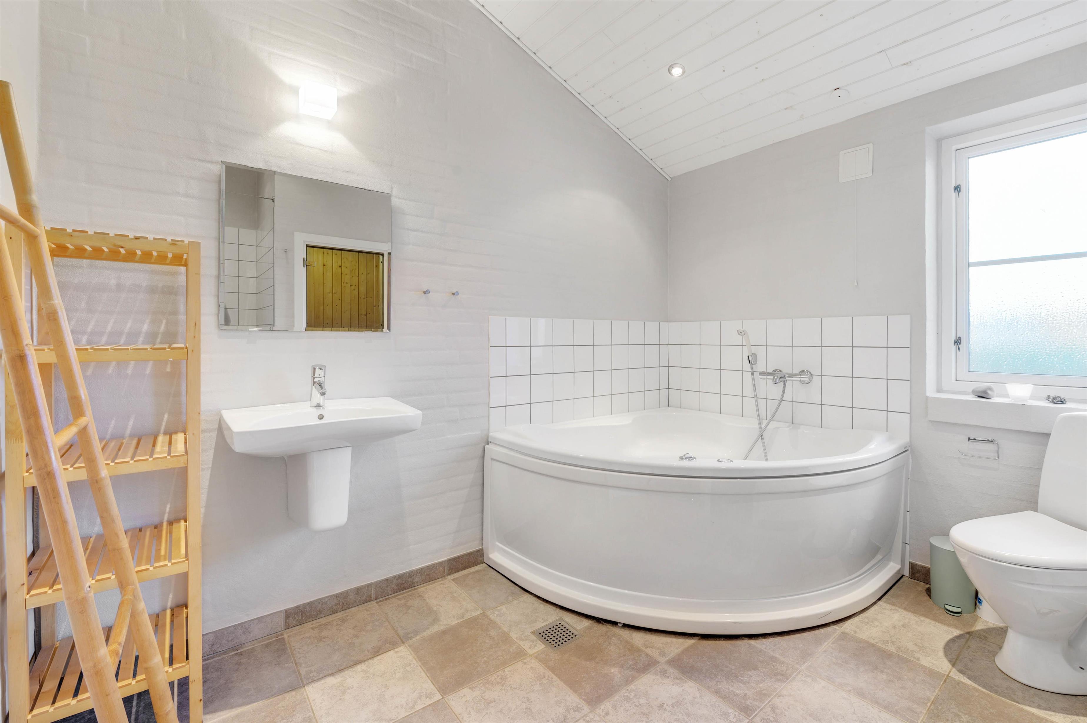 Når I træder ind i feriehuset, kommer I først ind i entréen – perfekt til sko og jakker. Her står også vaskemaskinen og tørretumbleren klar. Herfra er der adgang til de 2 soveværelser med komfortable dobbeltsenge (180x200), samt de 2 badeværelser med bruser og gulvvarme. På det største badeværelse finder I desuden en lille wellness-oase med både spabad og sauna – helt perfekt efter en lang dag på stranden.